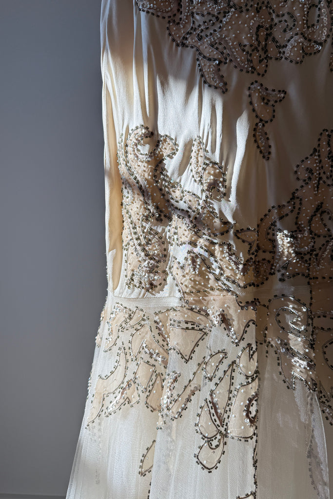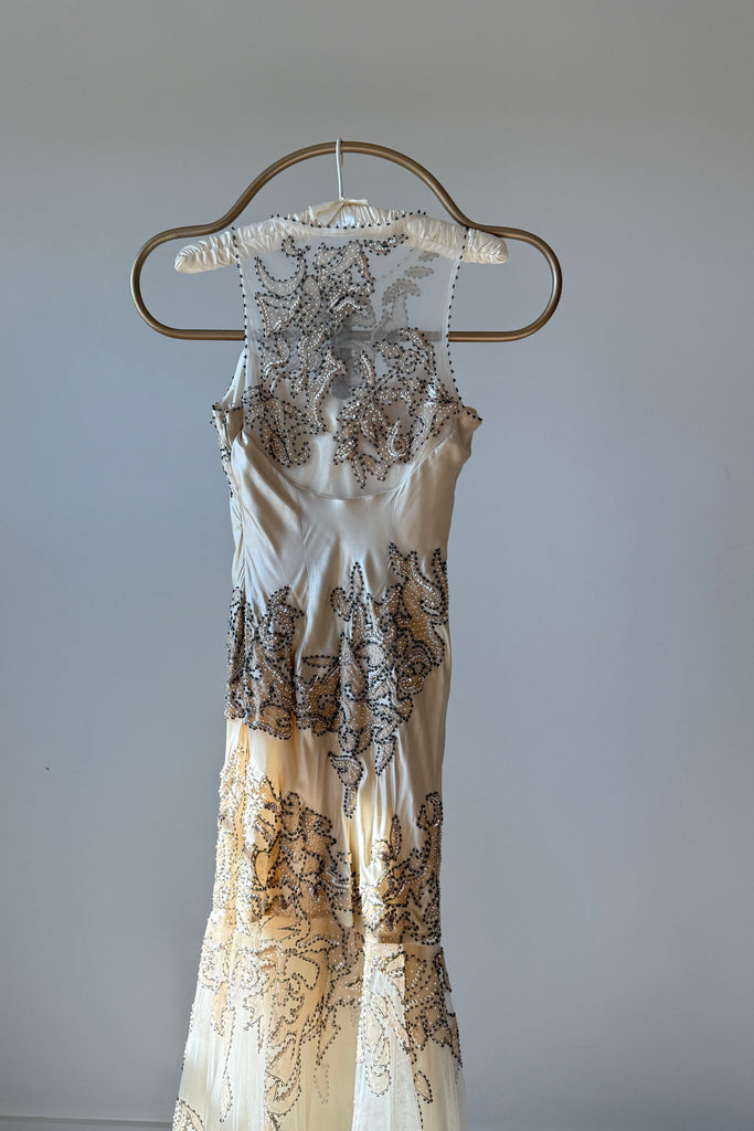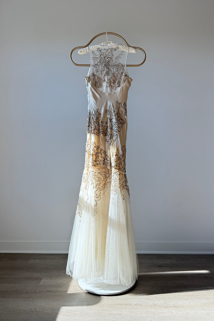 d e t a i l s : absolutely stunning champagne silk dress with original tags still attached, mesh mermaid hem, beaded trapunto stitching throughout, illusion bodice, would make a beautiful wedding gown