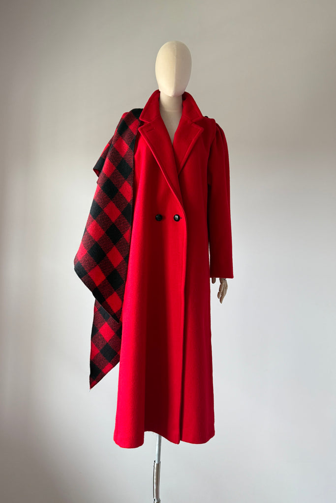 Vintage Red Wool Coat Plaid Scarf MEDIUM