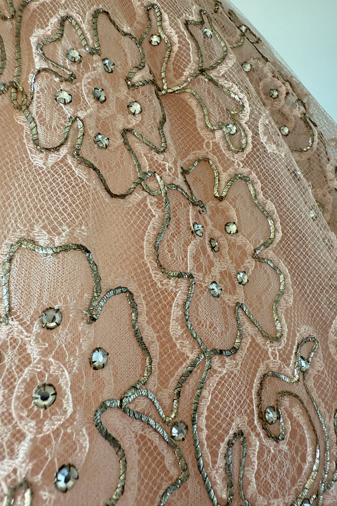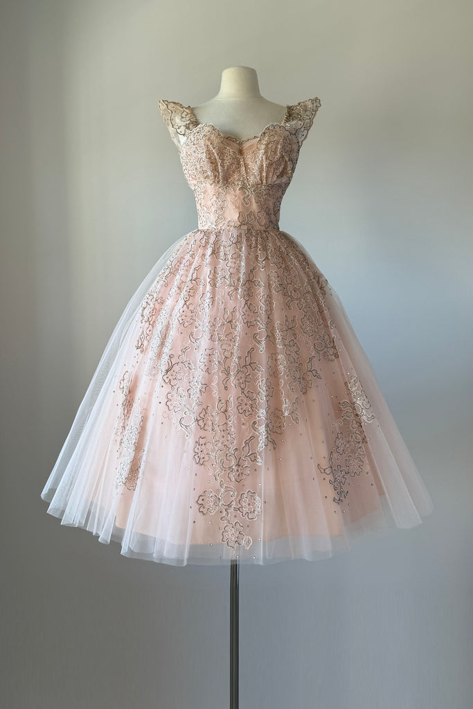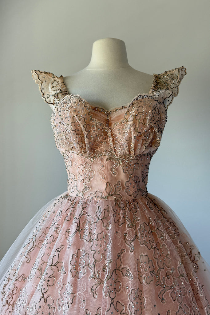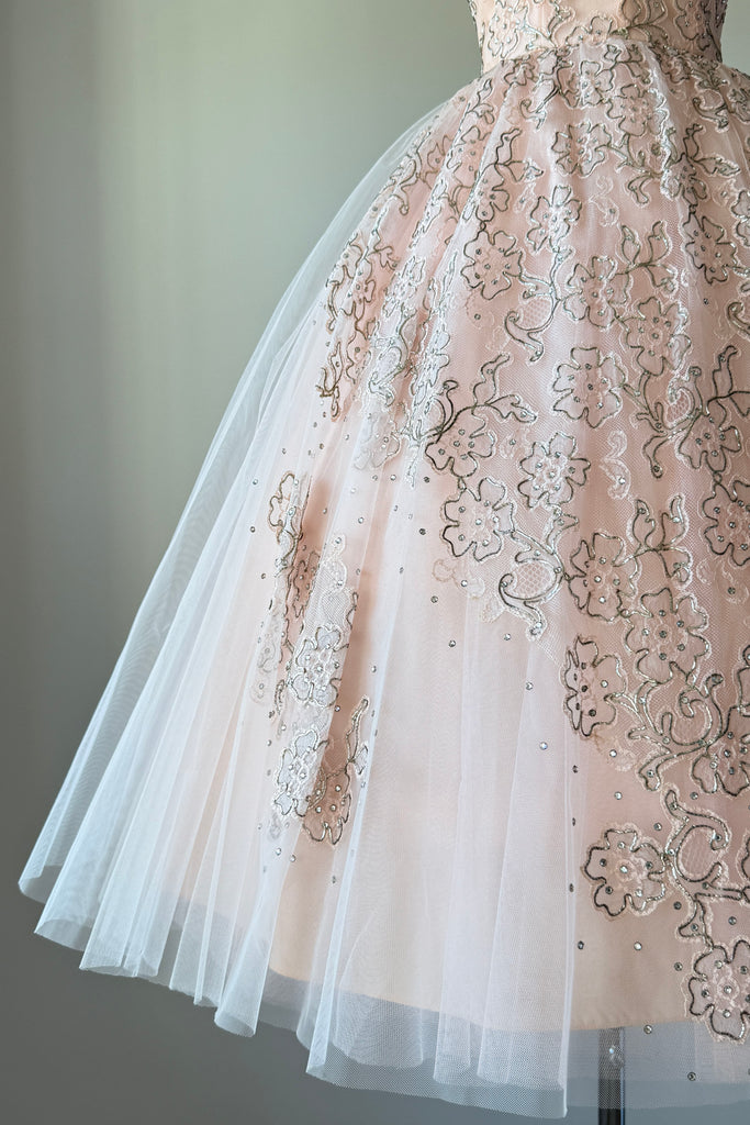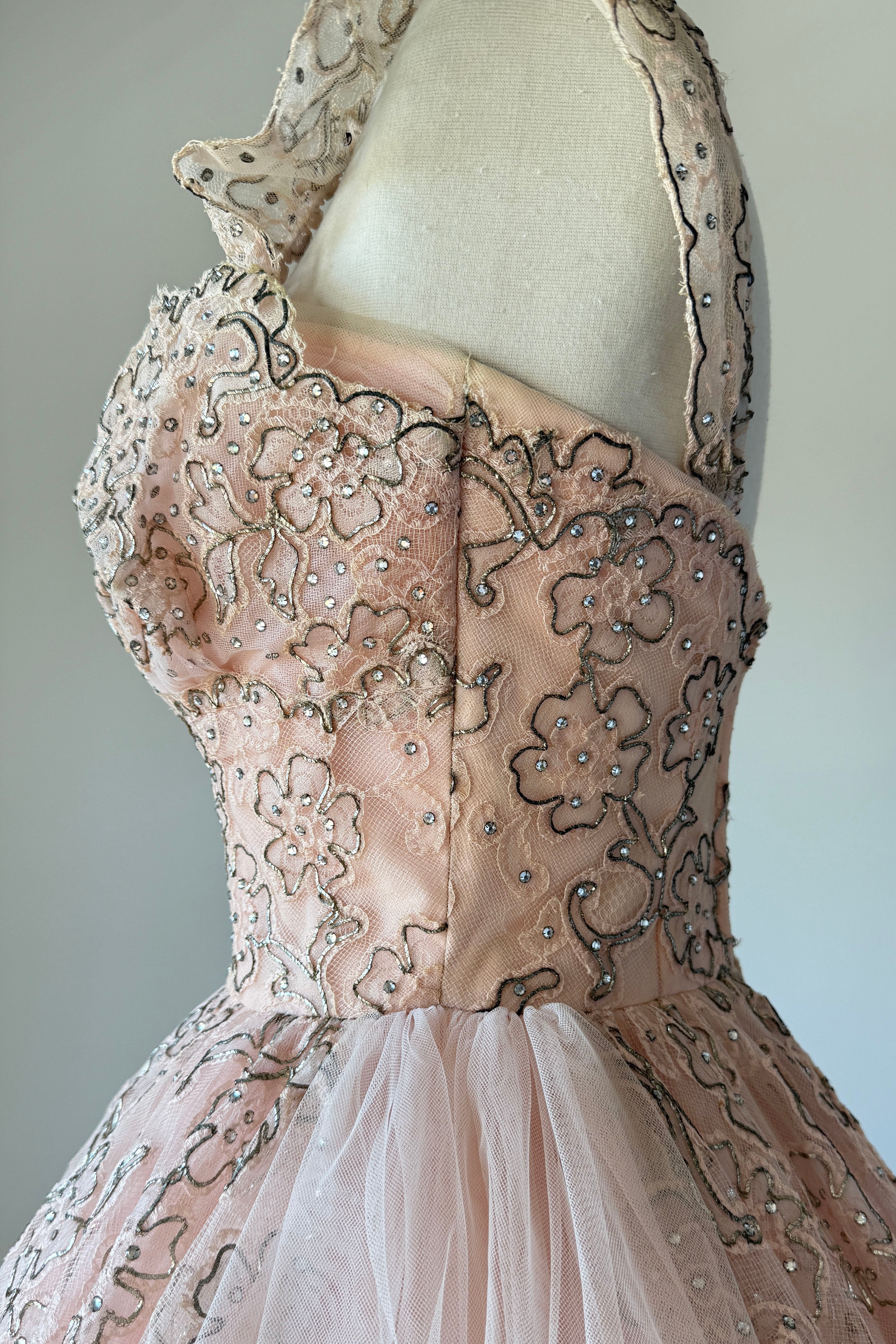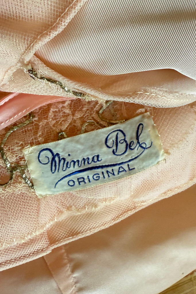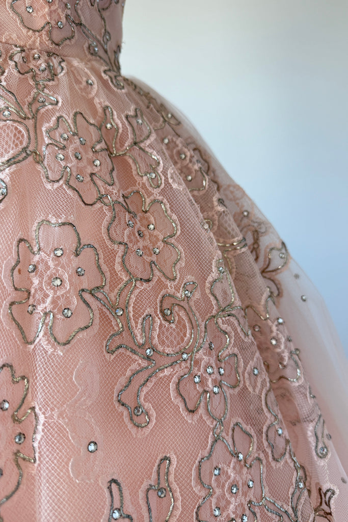 Vintage 1950s Blush Pink Rhinestone Lace Dress by Minna Bel | XS