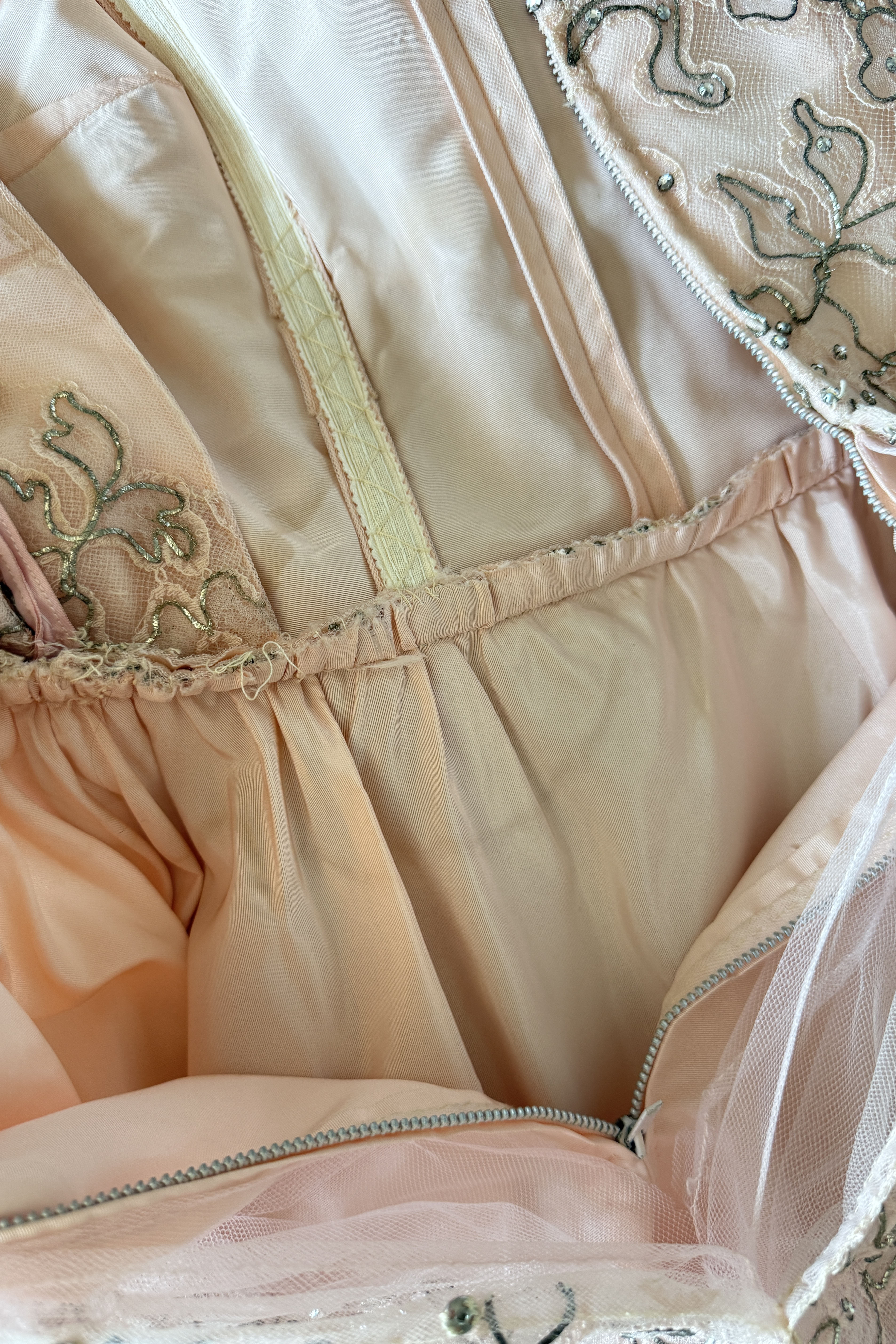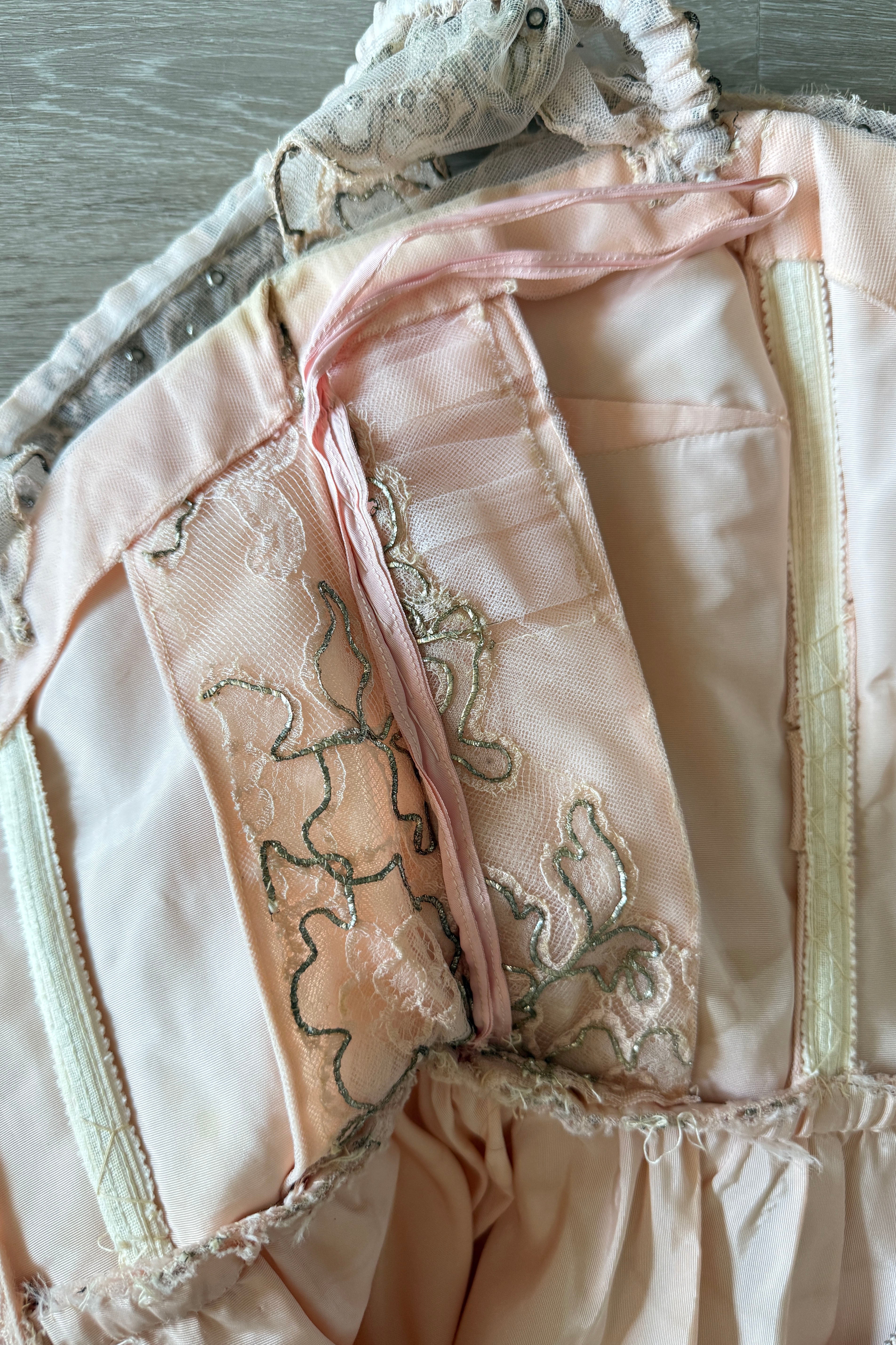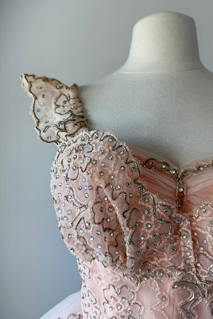 Three frothy layers of blush-pink tulle float over crisp taffeta, with lace layer adorned in metallic silver soutache and shimmering rhinestones. Elastic ruffled straps can be worn off-shoulder or removed entirely for a sleek strapless silhouette. Metal back zipper, bodice stays. She’s crisp, clean, and ready for her next ball.