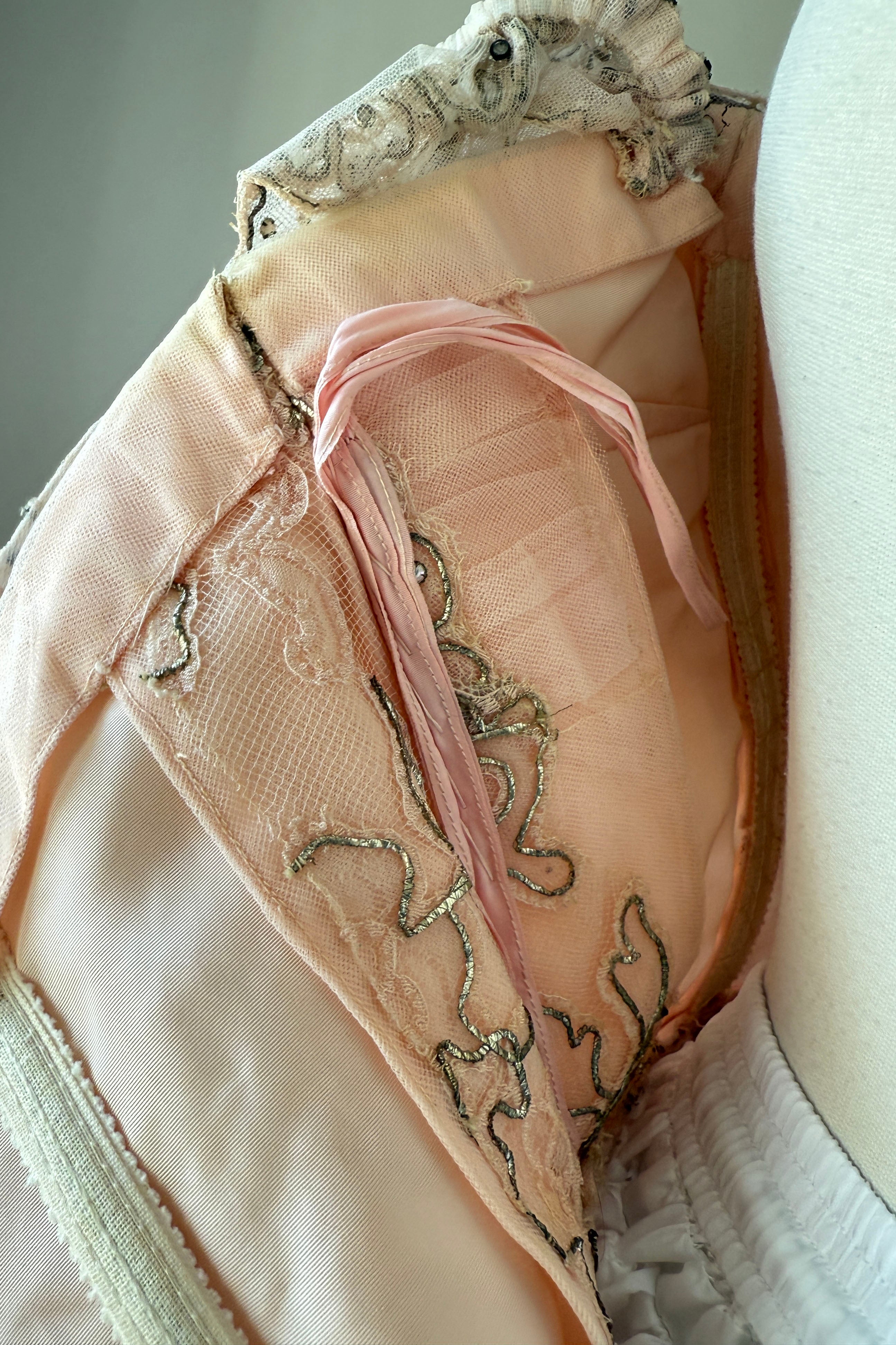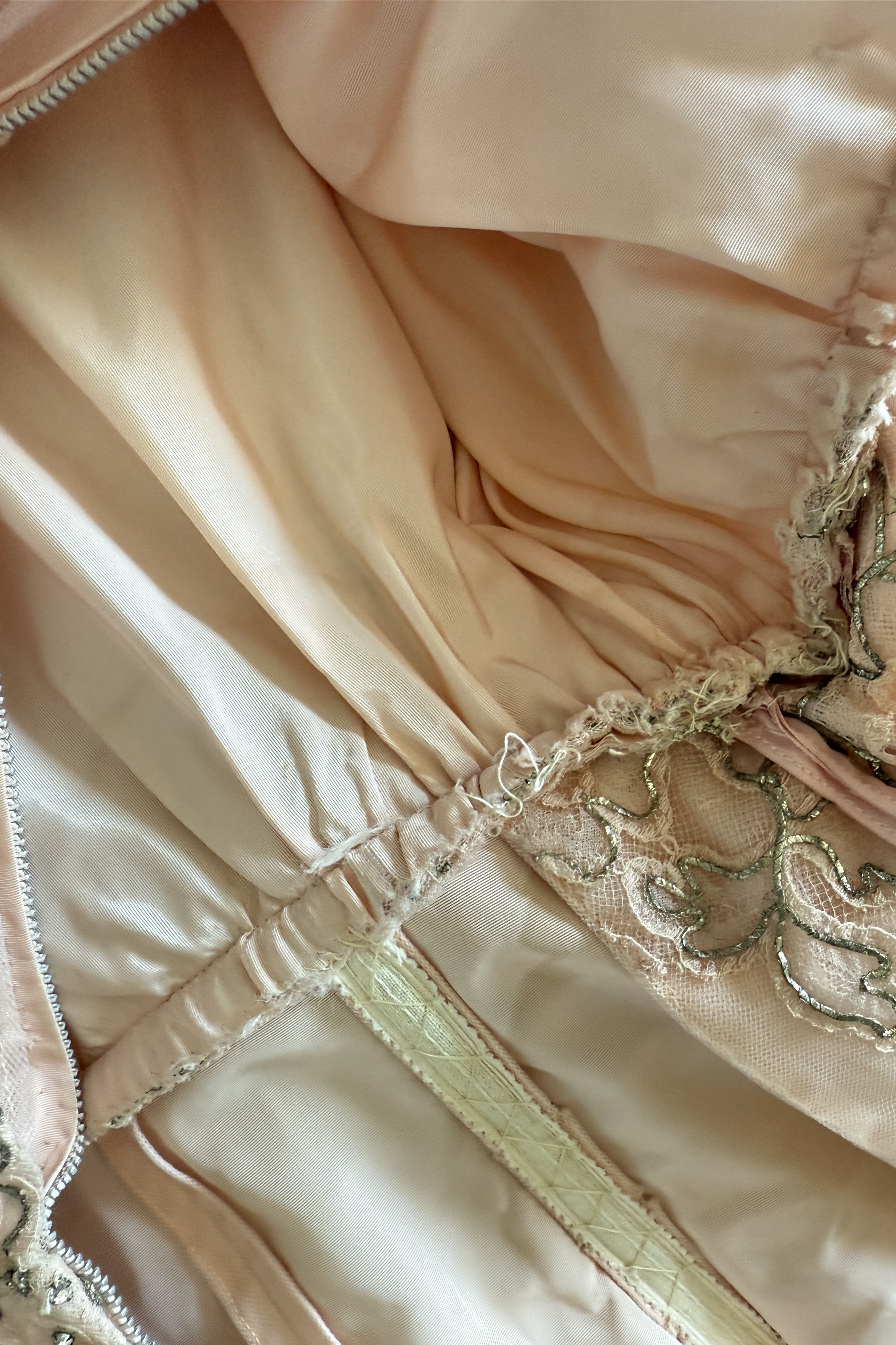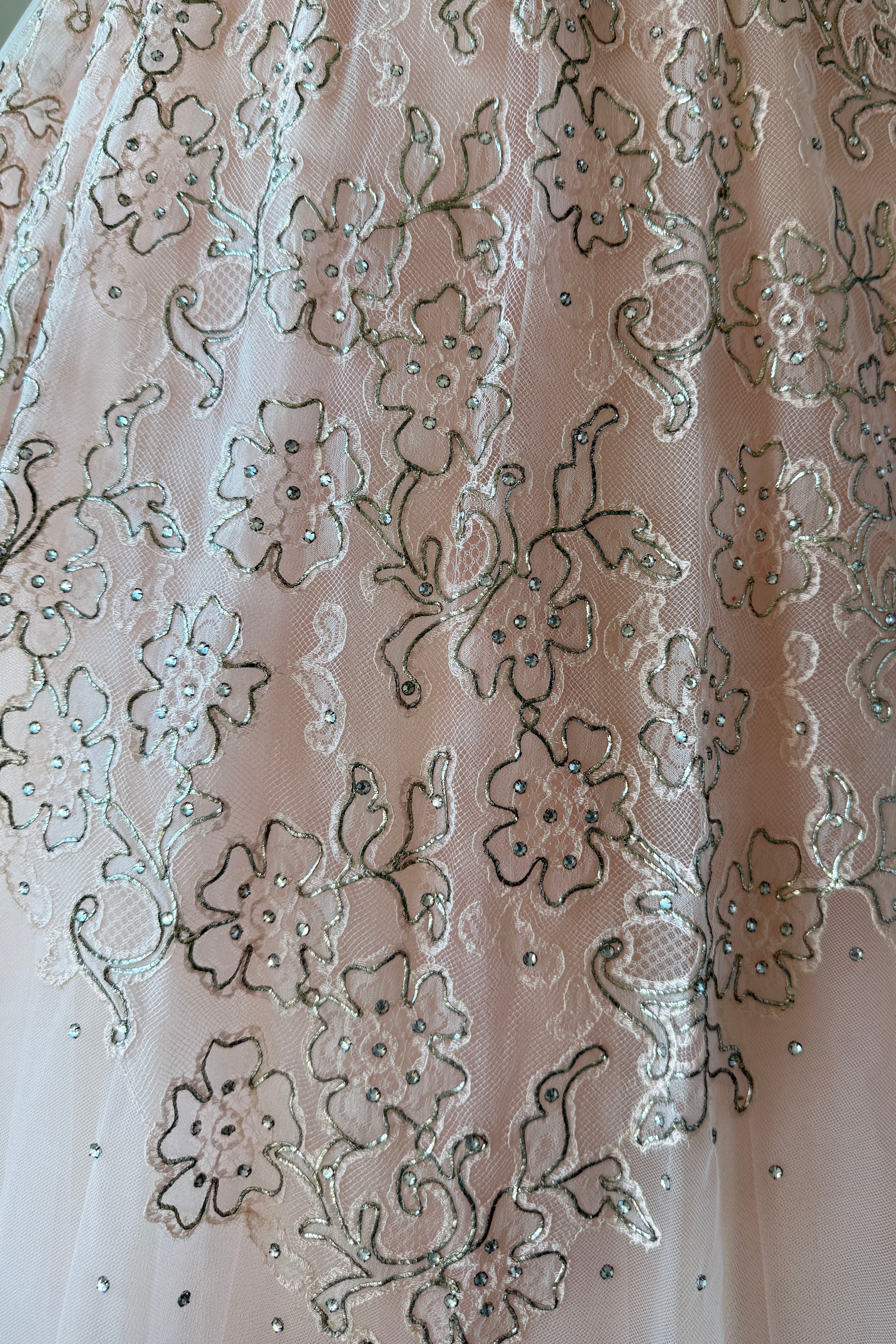 Three frothy layers of blush-pink tulle float over crisp taffeta, with lace layer adorned in metallic silver soutache and shimmering rhinestones. Elastic ruffled straps can be worn off-shoulder or removed entirely for a sleek strapless silhouette. Metal back zipper, bodice stays. She’s crisp, clean, and ready for her next ball.