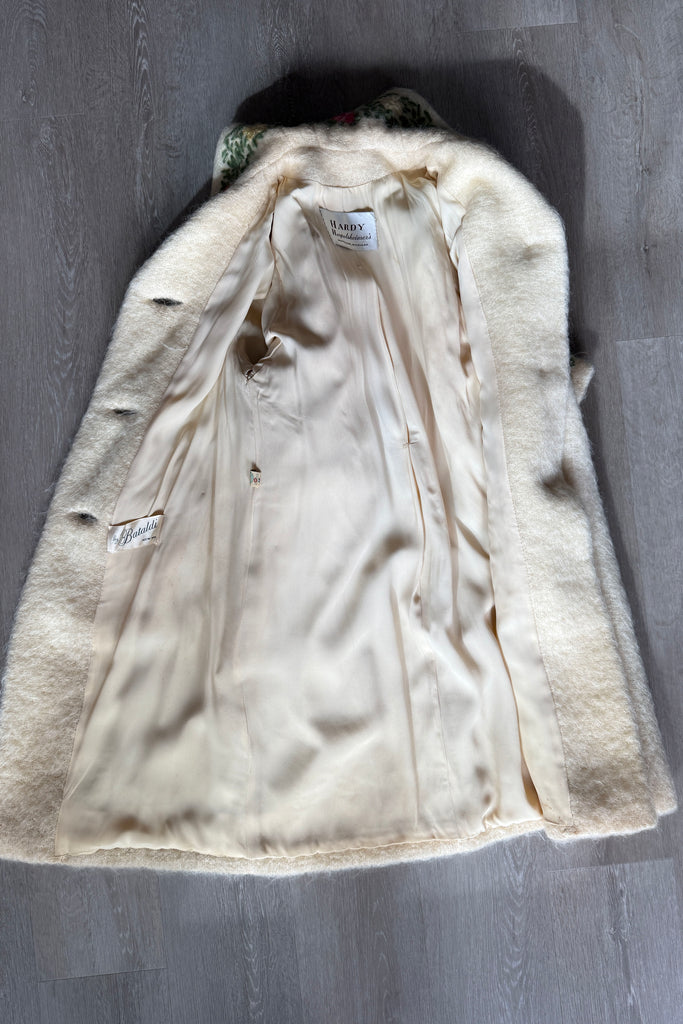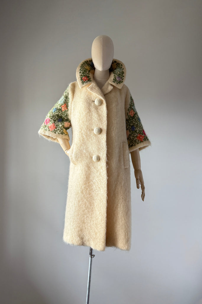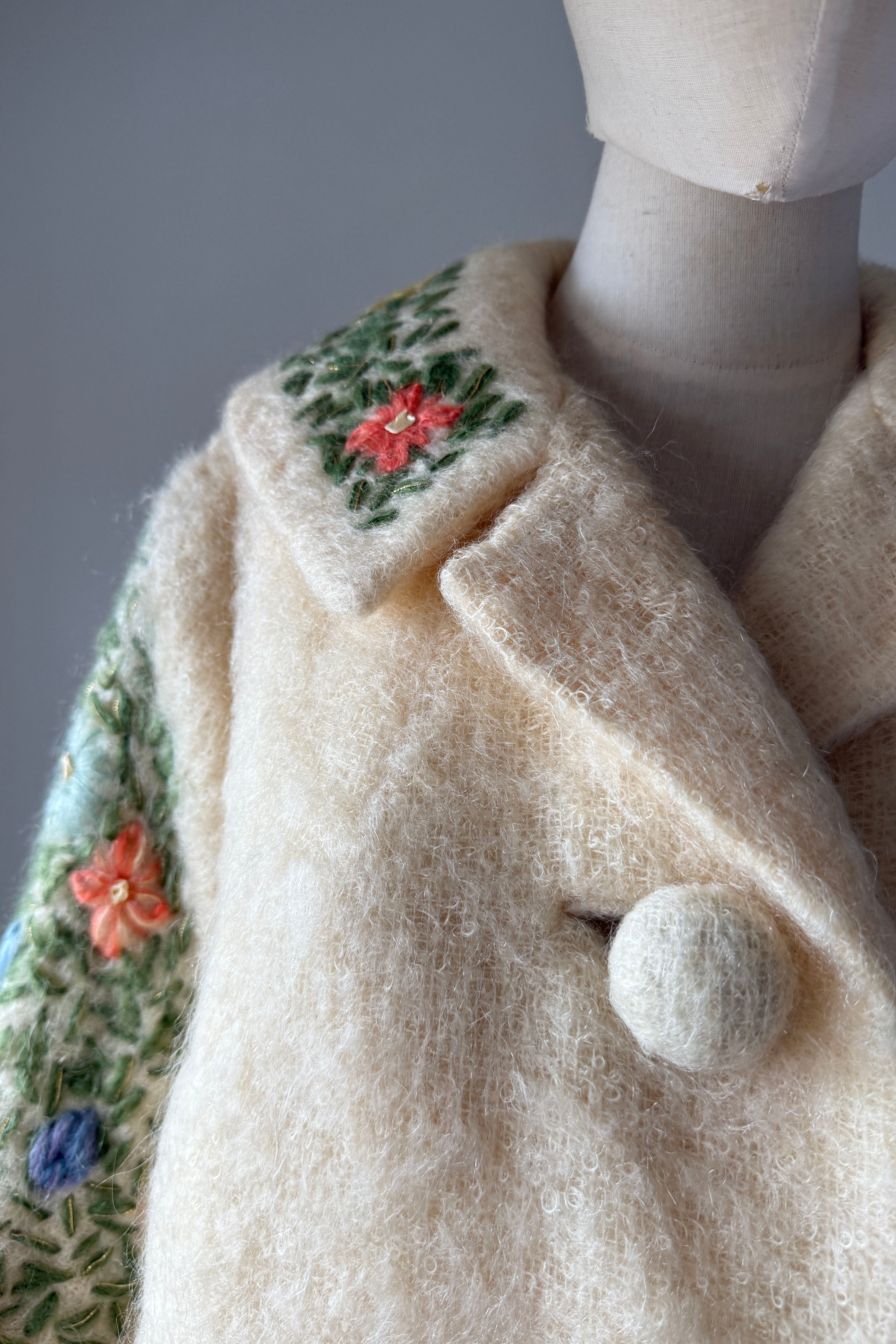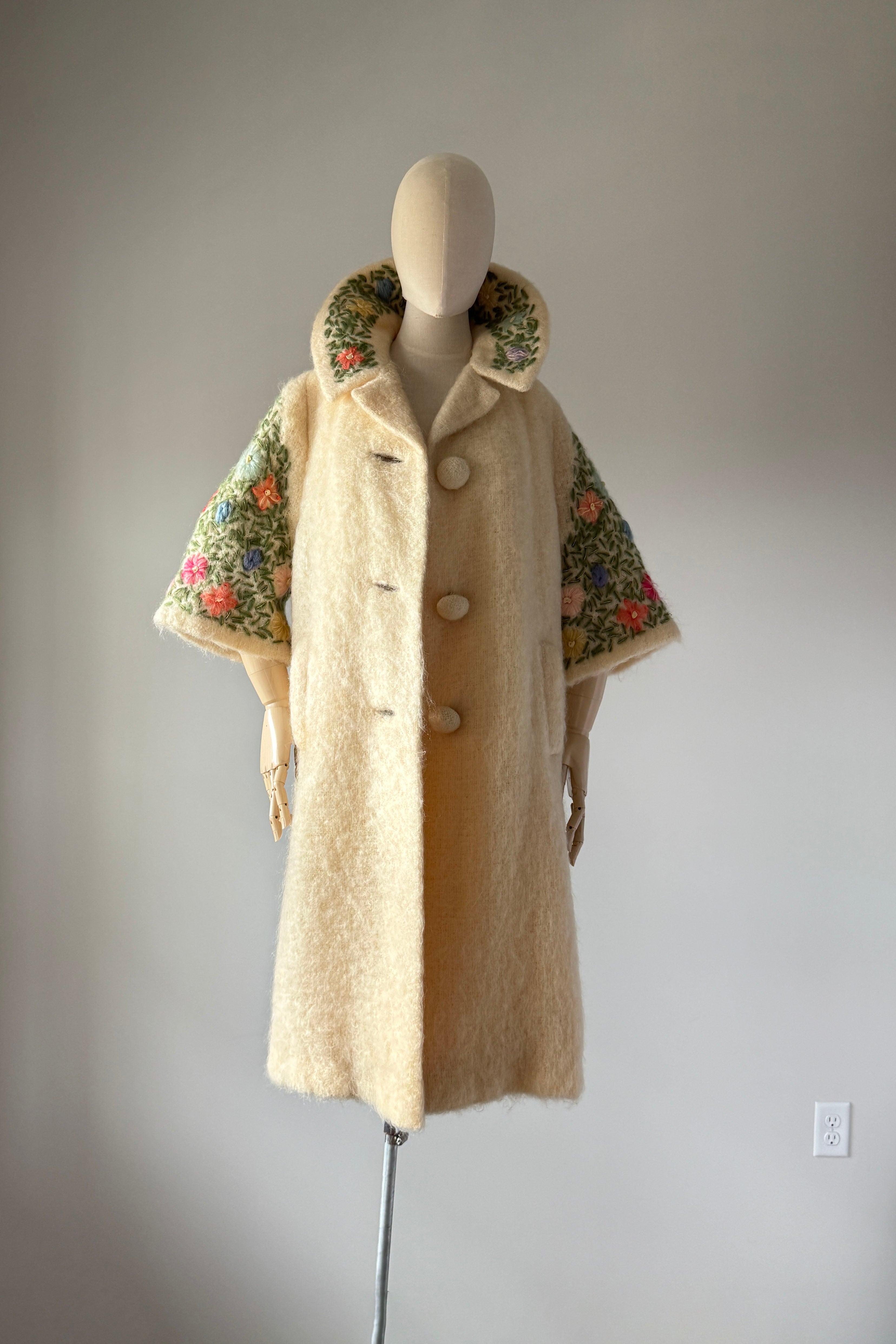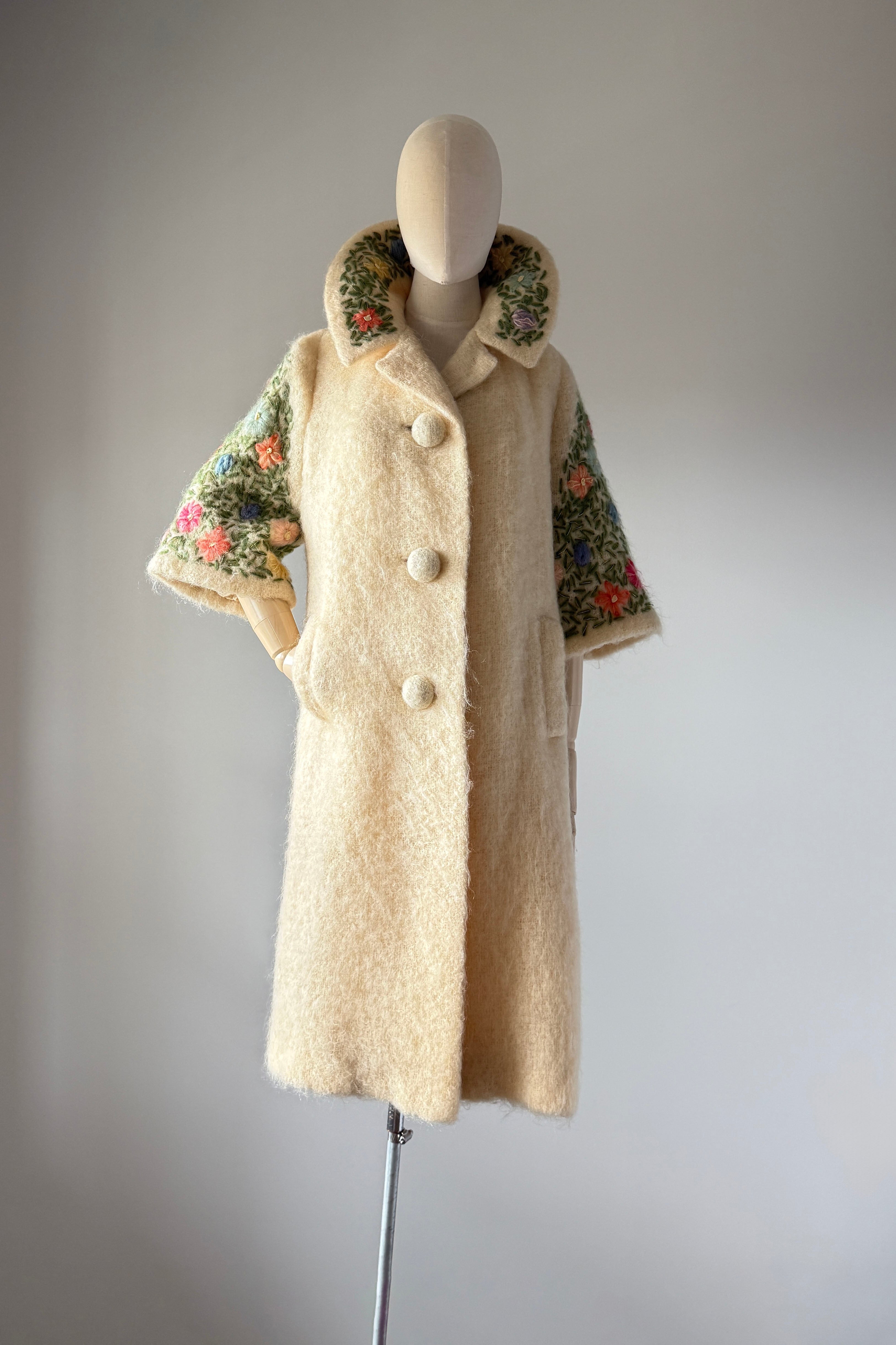 VINTAGE MOHAIR COATVintage Cinematic style.This 1960s coat is the exact style worn by Jessica Biel in the 2016 film A Kind of Murder. 1960s ivory mohair coat by Bataldi. Crewel yarn stitched floral details with shimmery gold rope thread, covered buttons, pockets, silk crepe lining. Some patina on lining otherwise, excellent condition. Fits like S/MLength 40Bust 40Shoulders 14Sleeves 16Waist 42 *As with all vintage, please expect wear consistent with age. All sales are final. No order cancellations.0427 | 2546