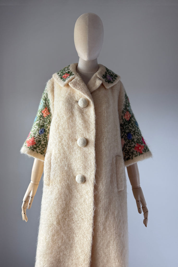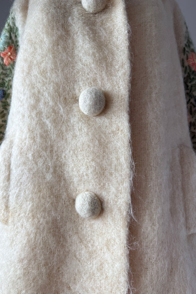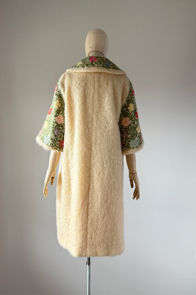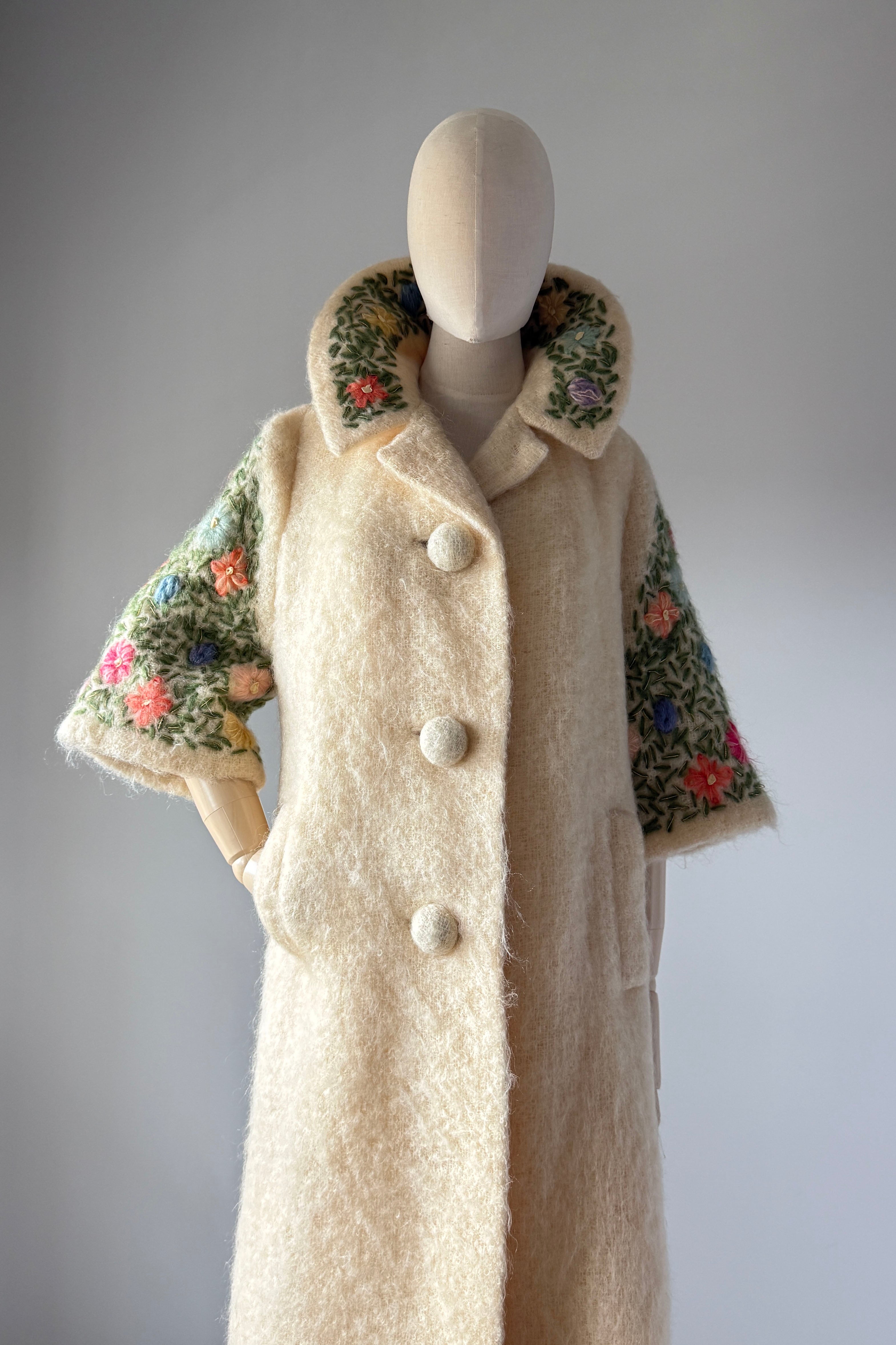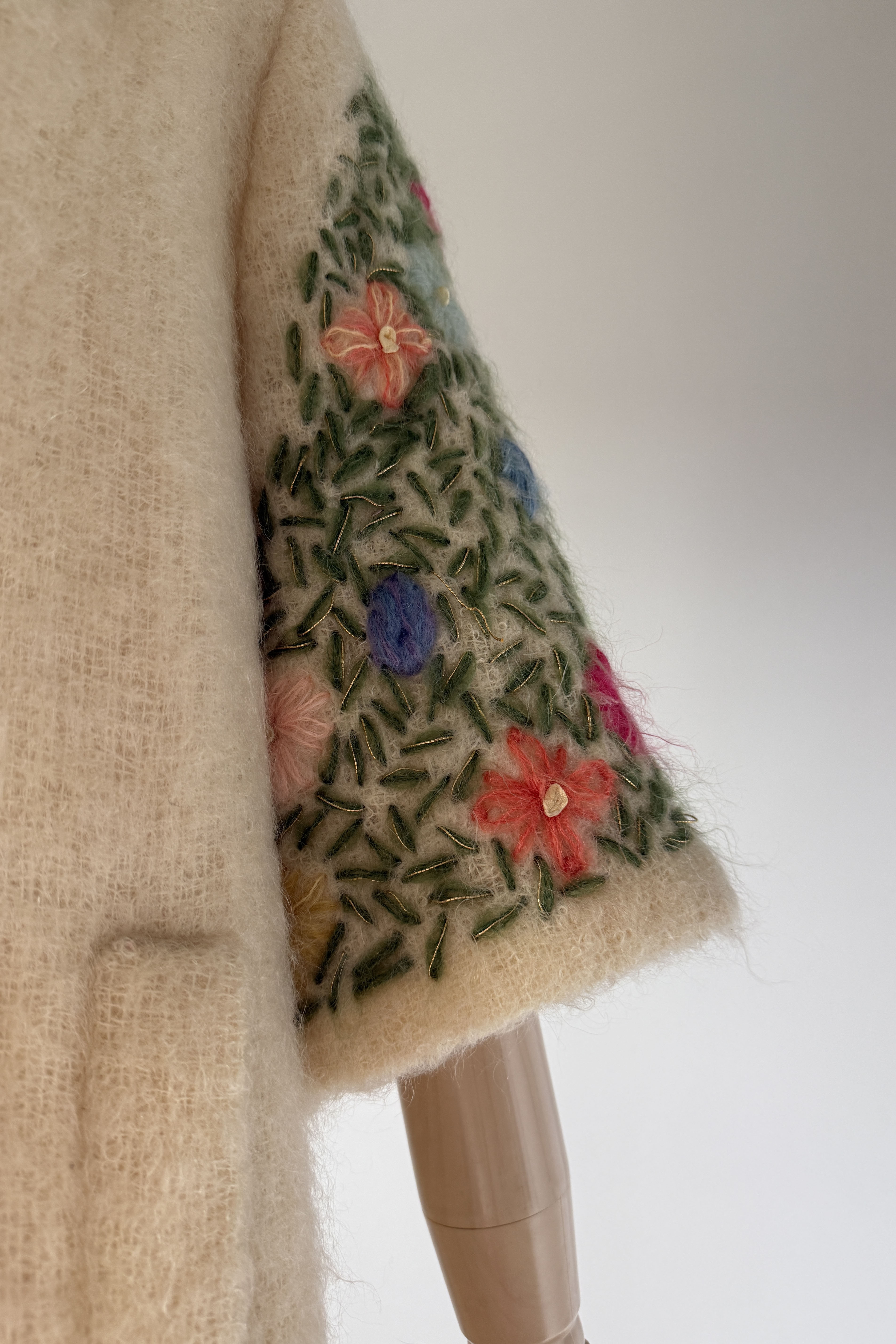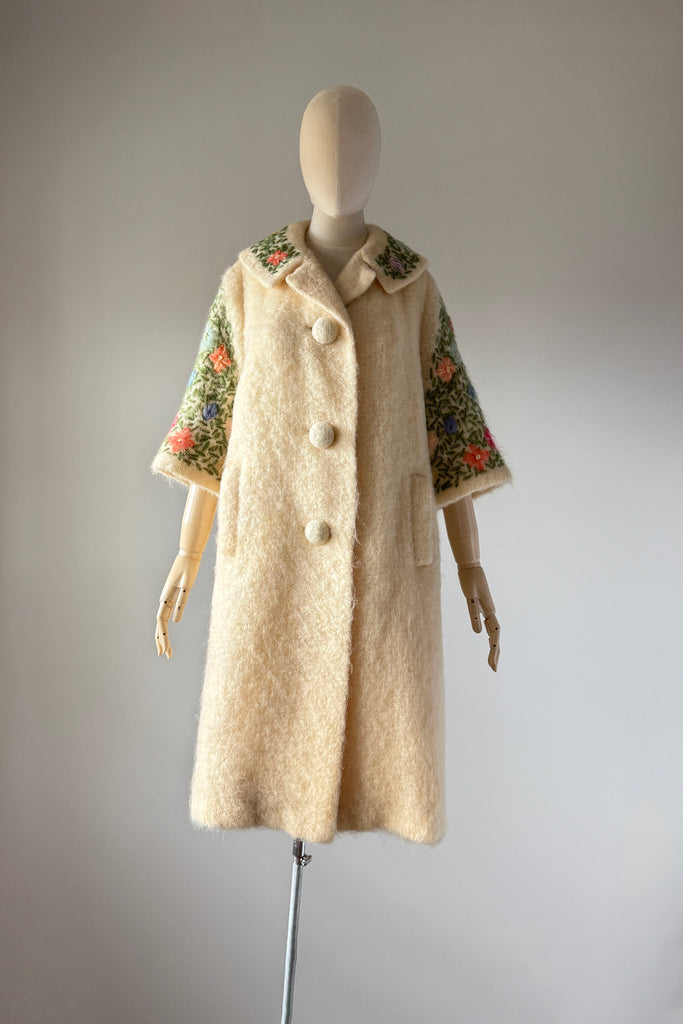VINTAGE MOHAIR COATVintage Cinematic style.This 1960s coat is the exact style worn by Jessica Biel in the 2016 film A Kind of Murder. 1960s ivory mohair coat by Bataldi. Crewel yarn stitched floral details with shimmery gold rope thread, covered buttons, pockets, silk crepe lining. Some patina on lining otherwise, excellent condition. Fits like S/MLength 40Bust 40Shoulders 14Sleeves 16Waist 42 *As with all vintage, please expect wear consistent with age. All sales are final. No order cancellations.0427 | 2546