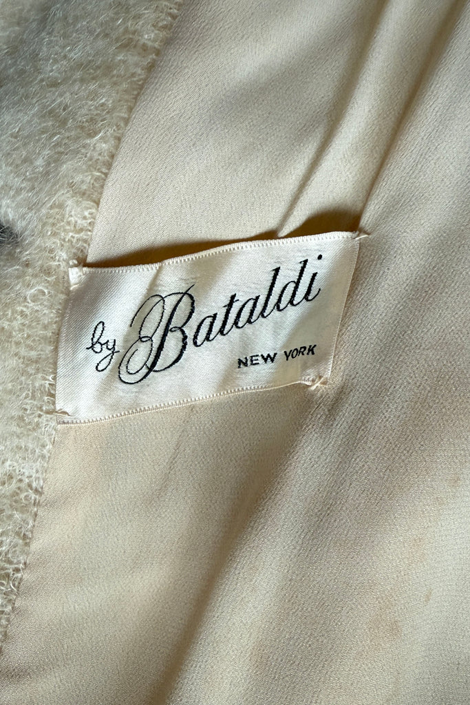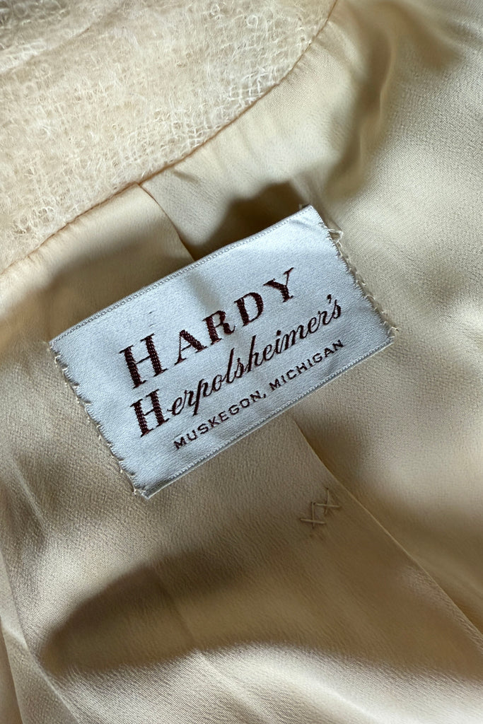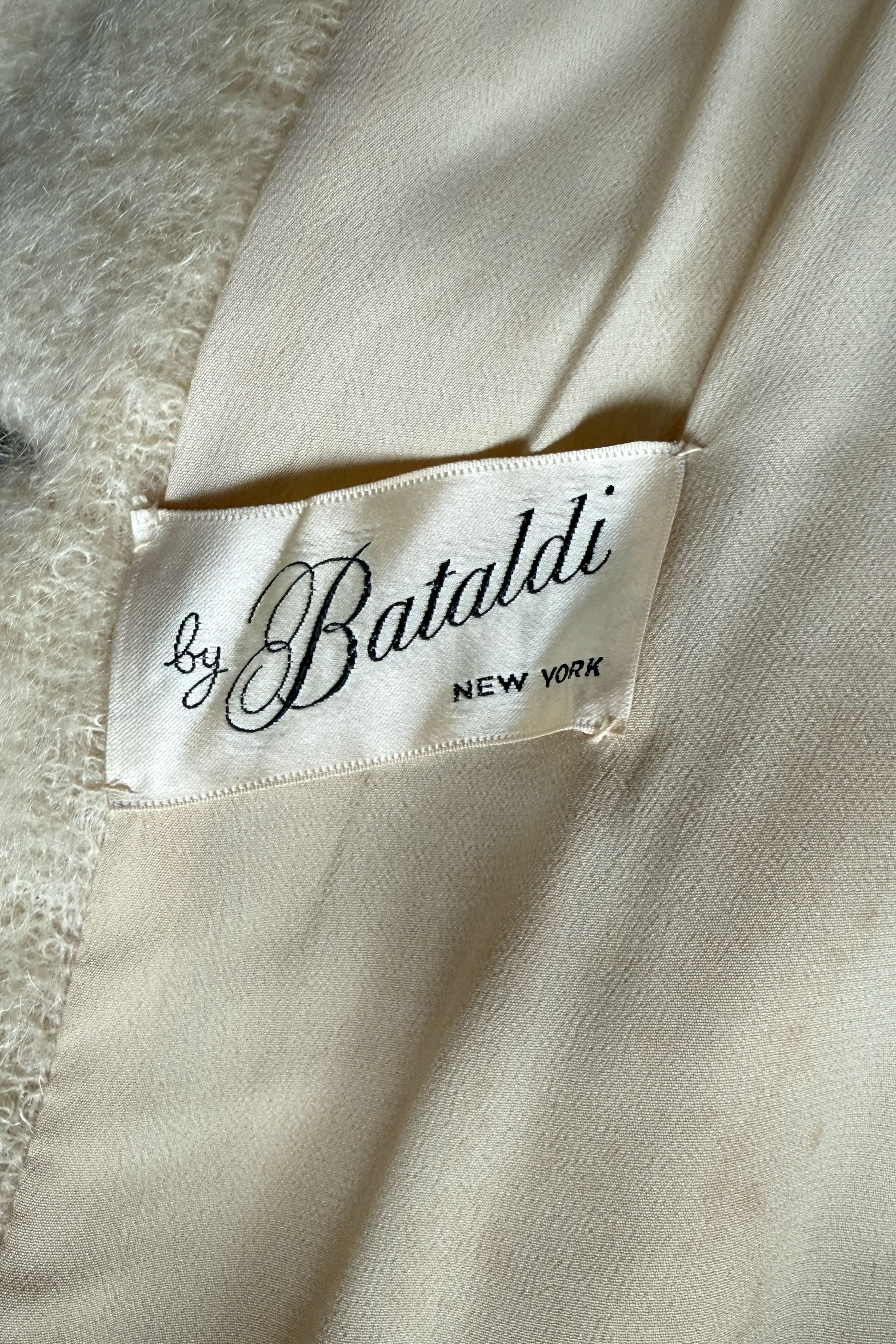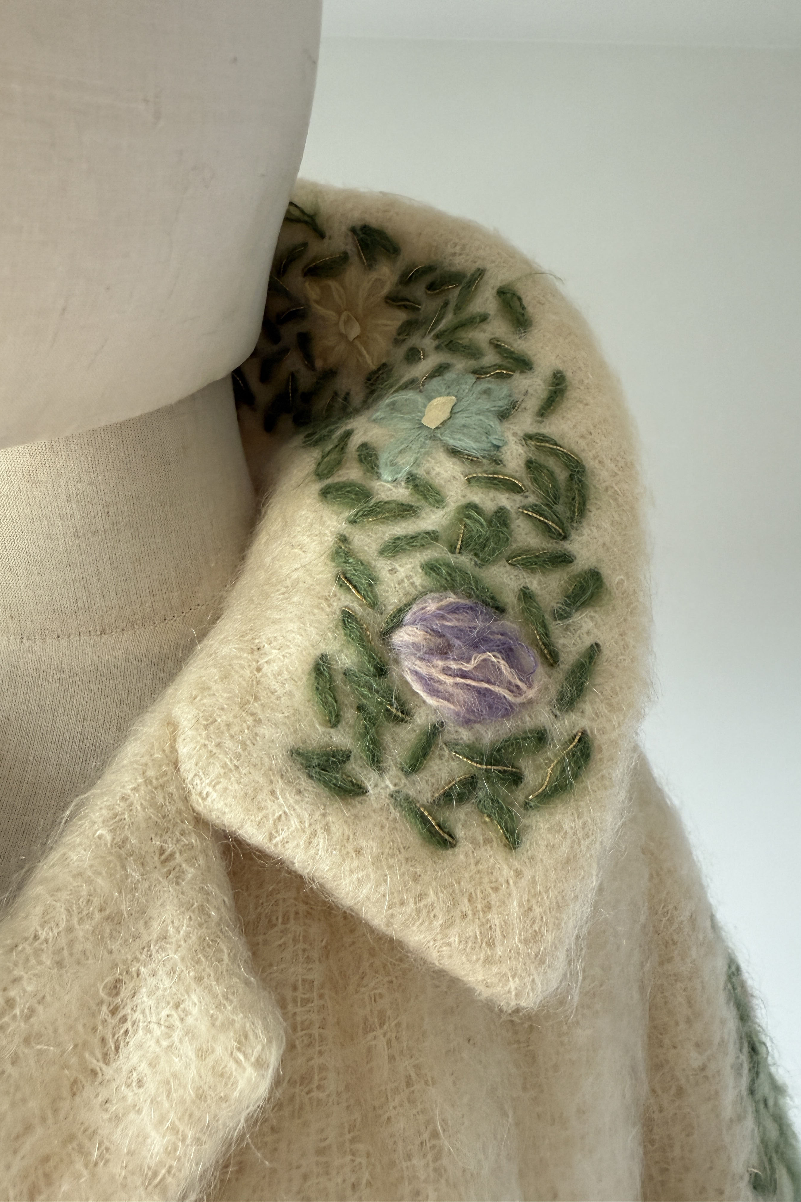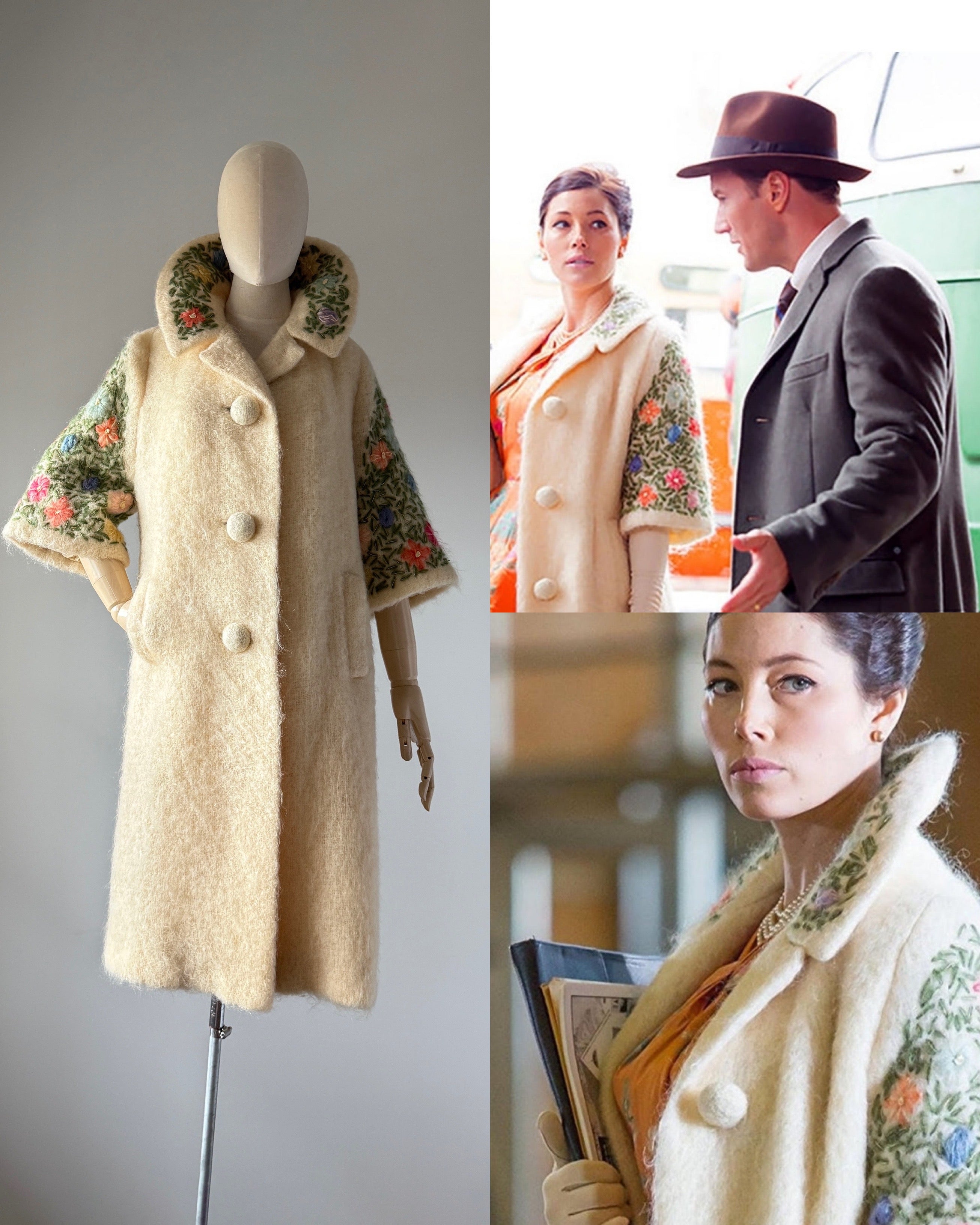 VINTAGE MOHAIR COATVintage Cinematic style.This 1960s coat is the exact style worn by Jessica Biel in the 2016 film A Kind of Murder. 1960s ivory mohair coat by Bataldi. Crewel yarn stitched floral details with shimmery gold rope thread, covered buttons, pockets, silk crepe lining. Some patina on lining otherwise, excellent condition. Fits like S/MLength 40Bust 40Shoulders 14Sleeves 16Waist 42 *As with all vintage, please expect wear consistent with age. All sales are final. No order cancellations.0427 | 2546