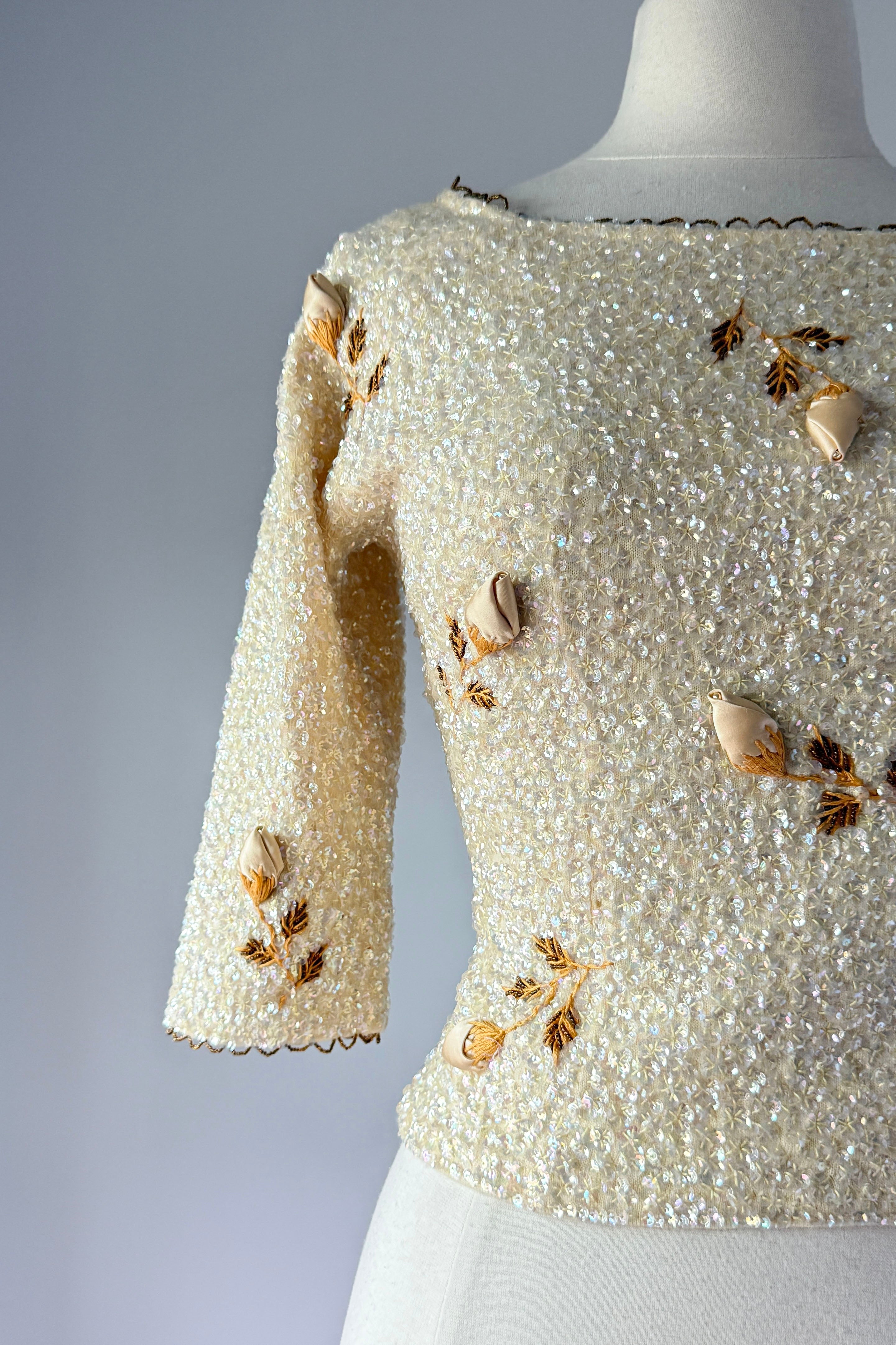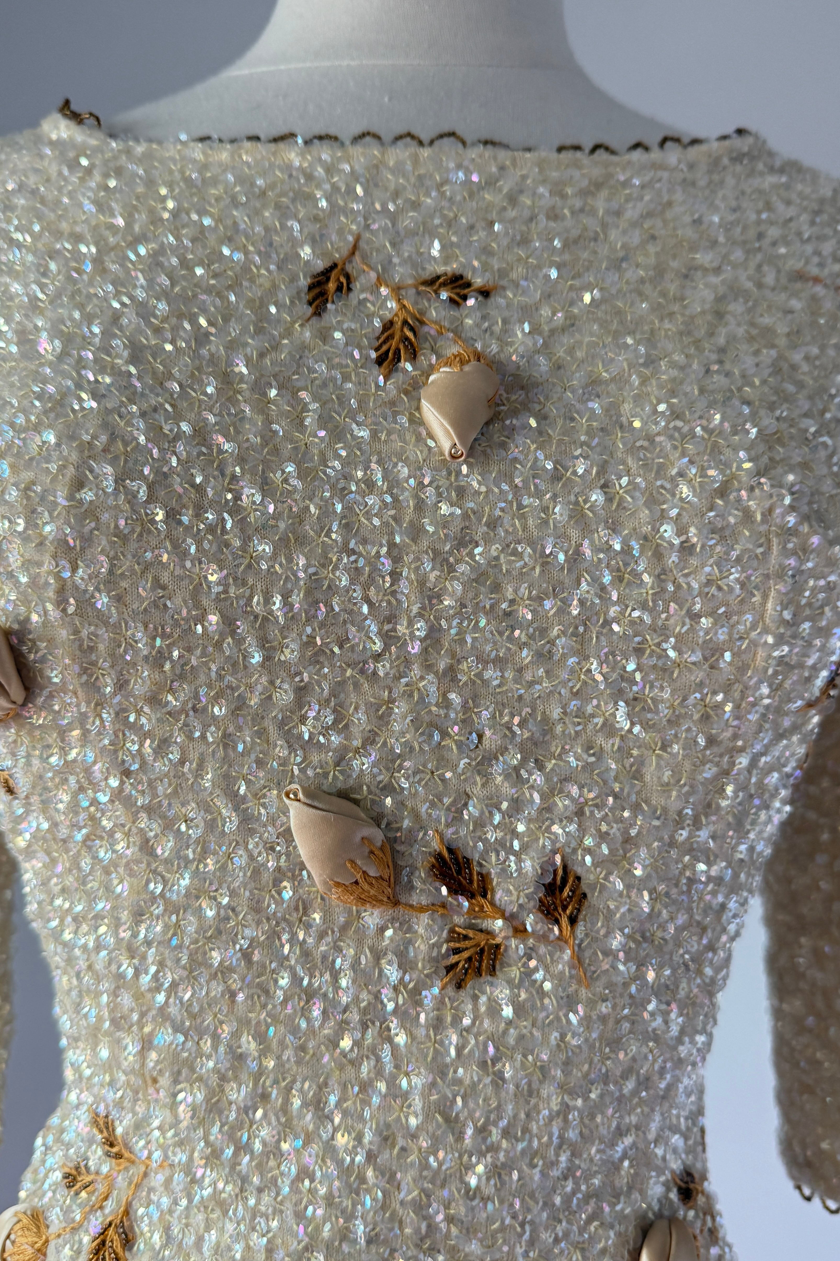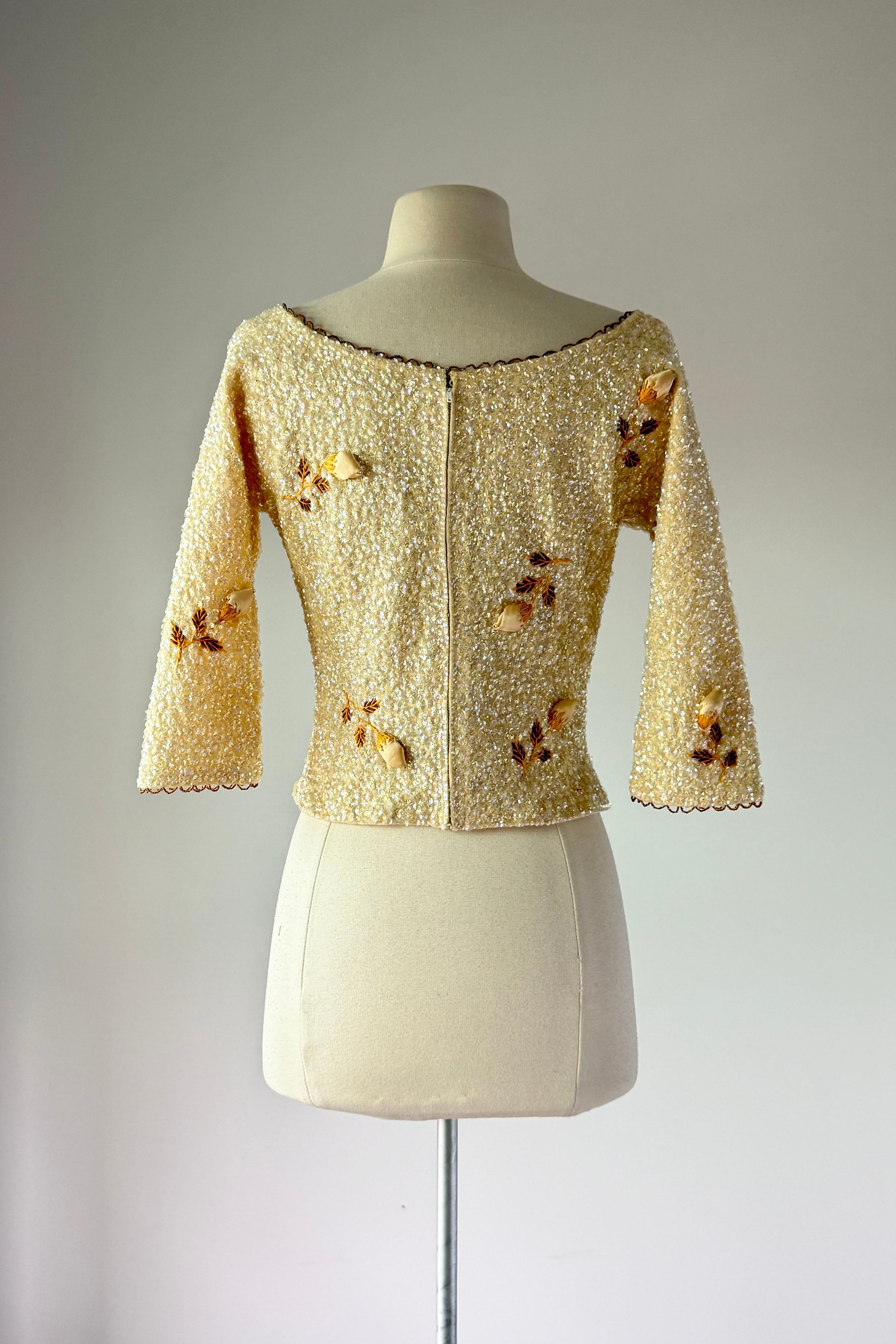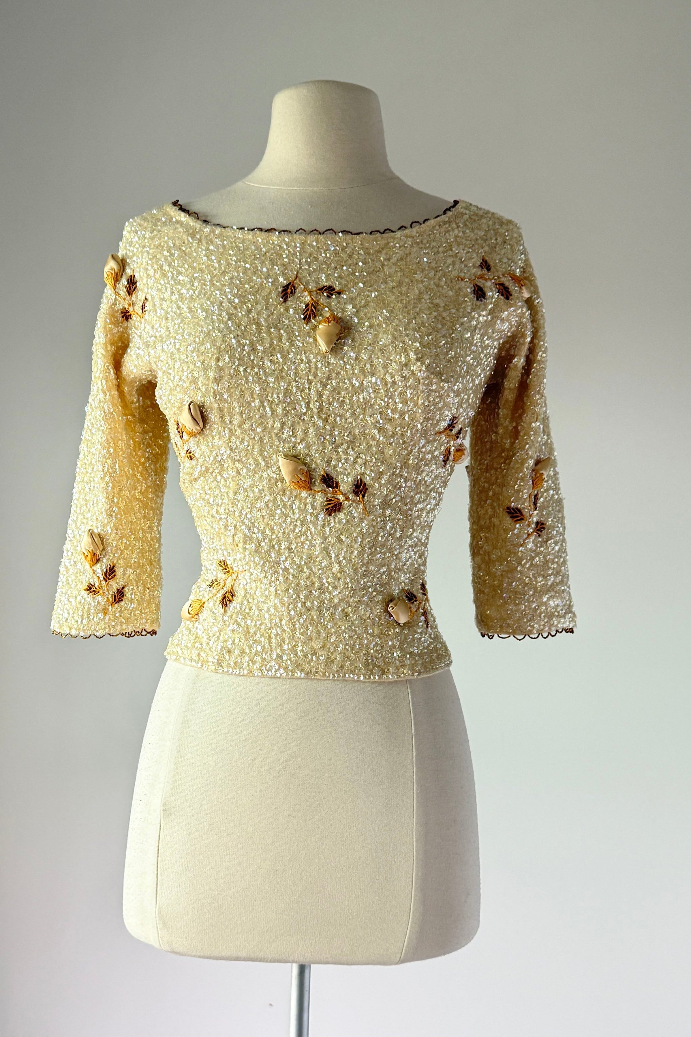 VINTAGE SWEATER Vintage 1960s sweater. Features iridescent sequins on wool, satin rosebuds wit metal centers, lined in nylon with metal back zipper. By House of Gold. Excellent condition. The faintest smudges with some pinhead sized holes on lining only.Fits like S/M. Marked size "36".Length 18Bust 36-38Waist 28-32As with all vintage, please expect wear consistent with age. All sales are final. No order cancellations.0941 | 2613
