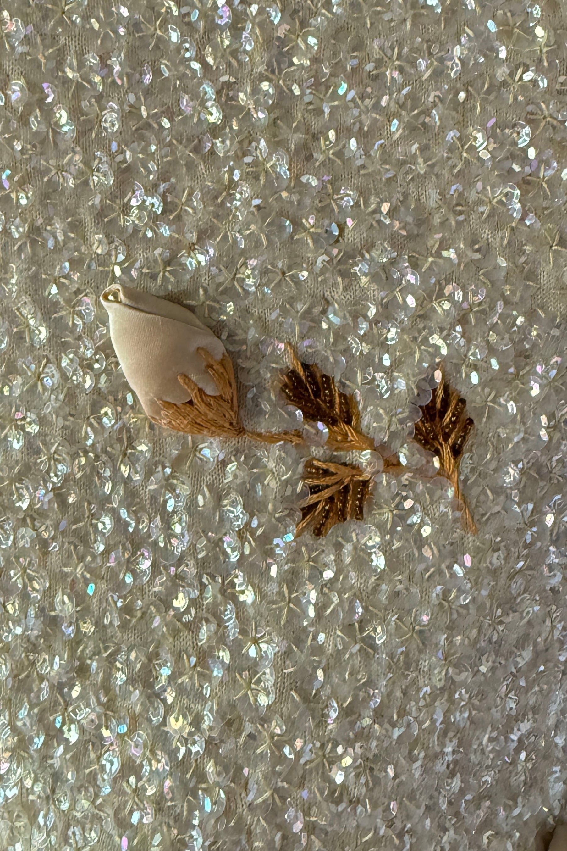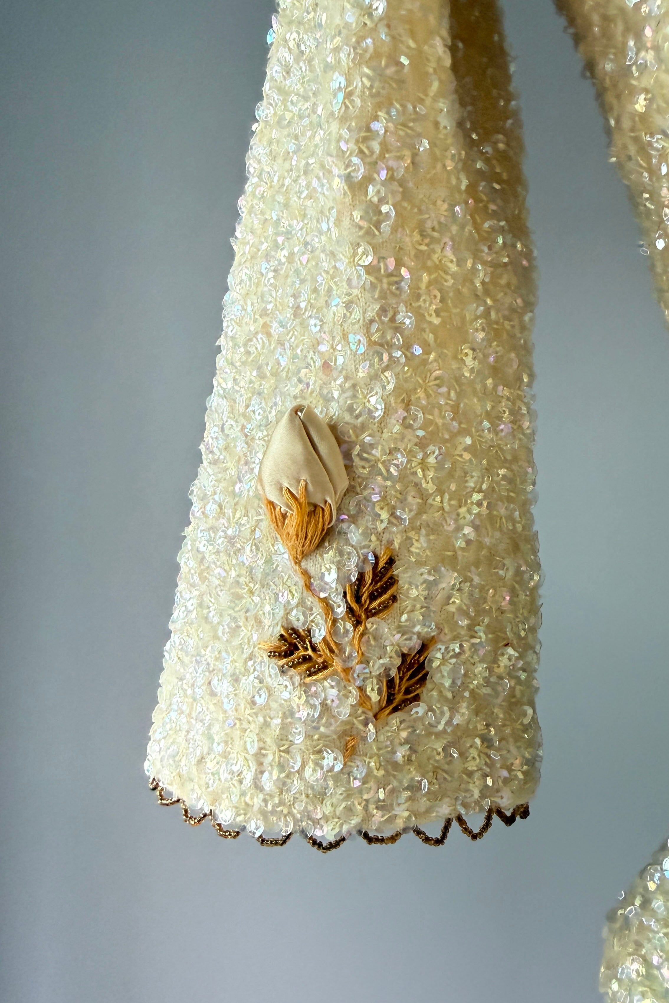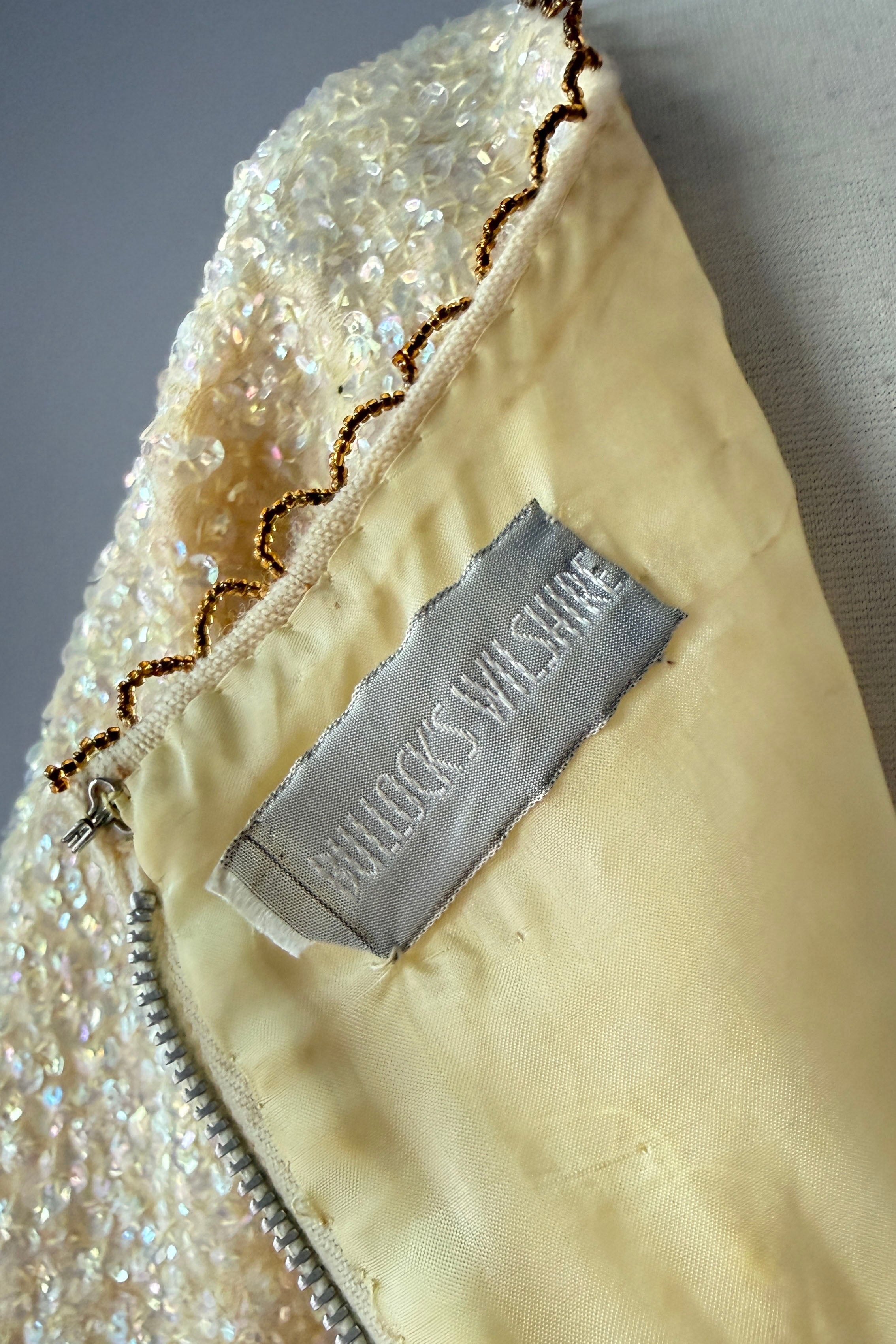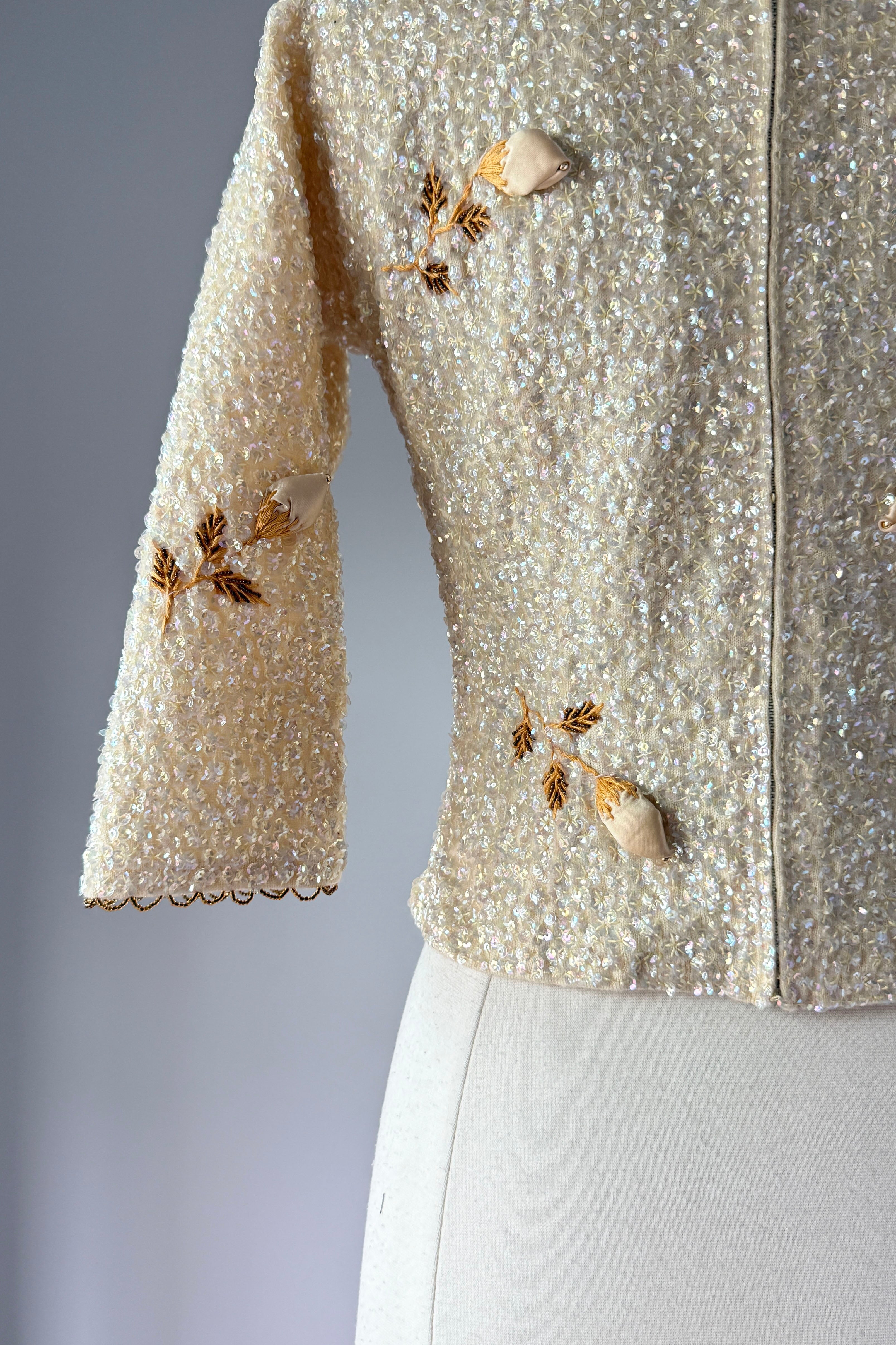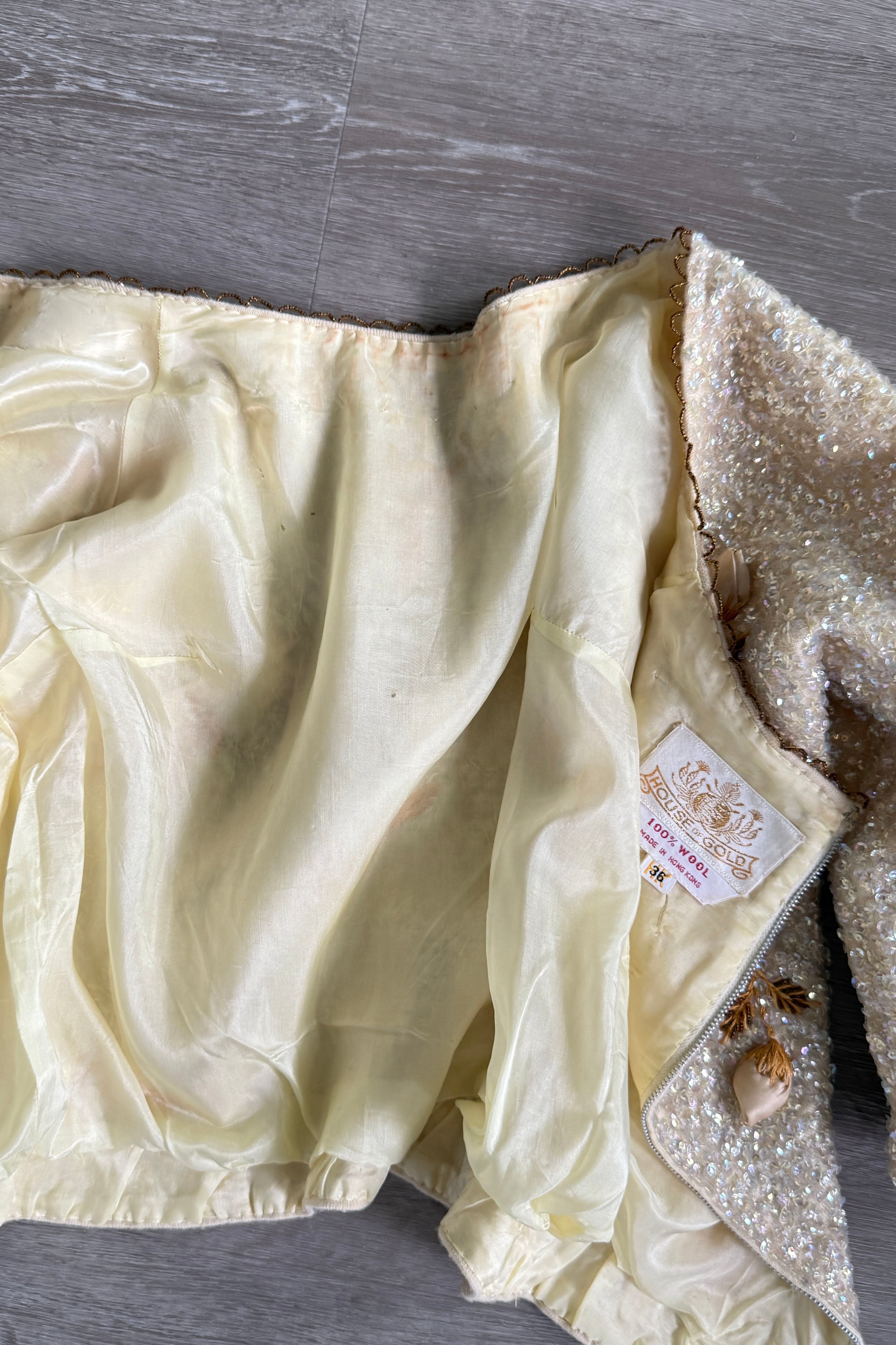 VINTAGE SWEATER Vintage 1960s sweater. Features iridescent sequins on wool, satin rosebuds wit metal centers, lined in nylon with metal back zipper. By House of Gold. Excellent condition. The faintest smudges with some pinhead sized holes on lining only.Fits like S/M. Marked size "36".Length 18Bust 36-38Waist 28-32As with all vintage, please expect wear consistent with age. All sales are final. No order cancellations.0941 | 2613