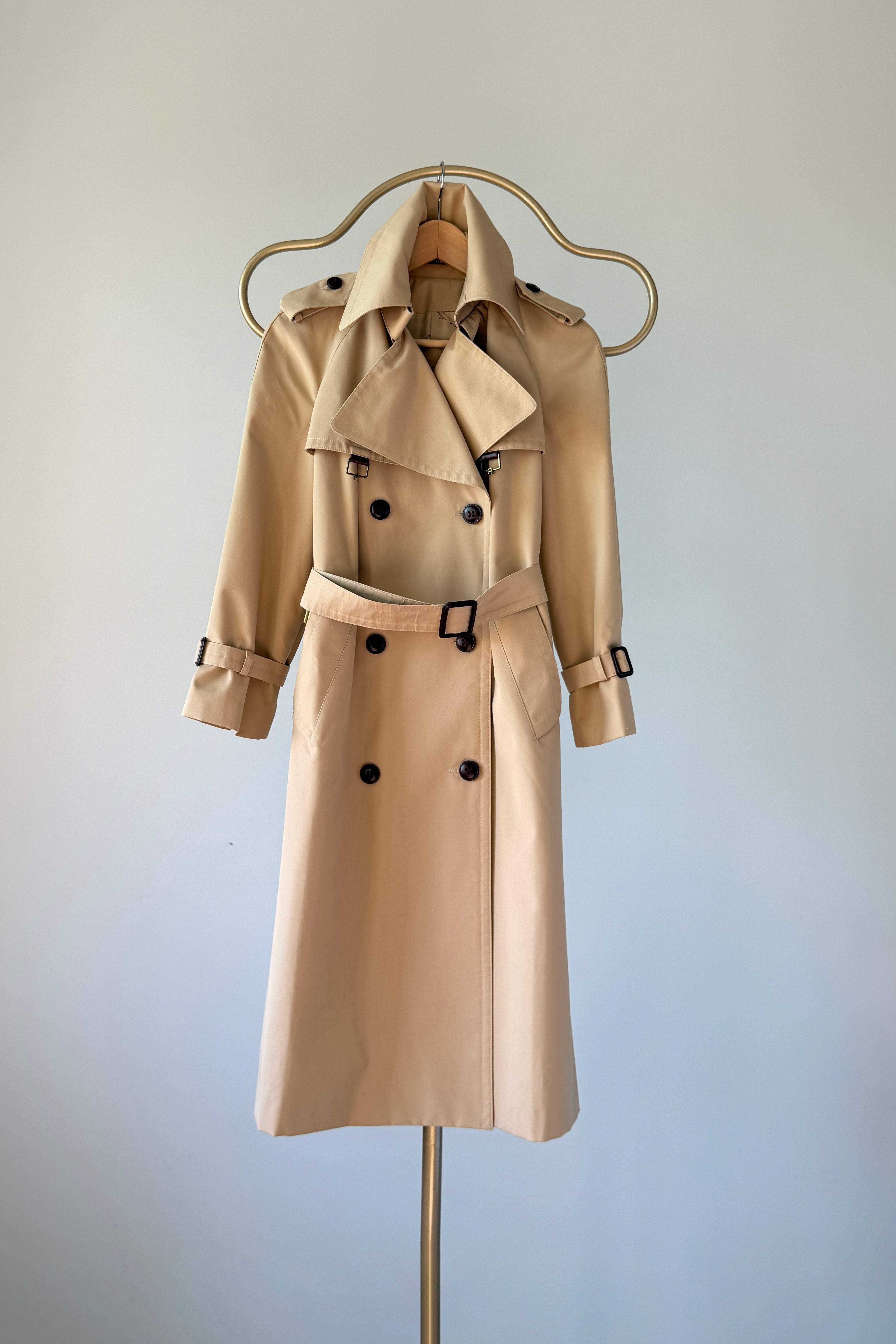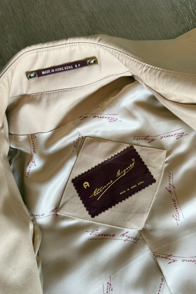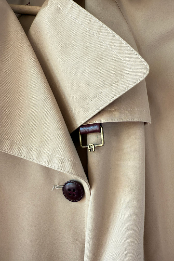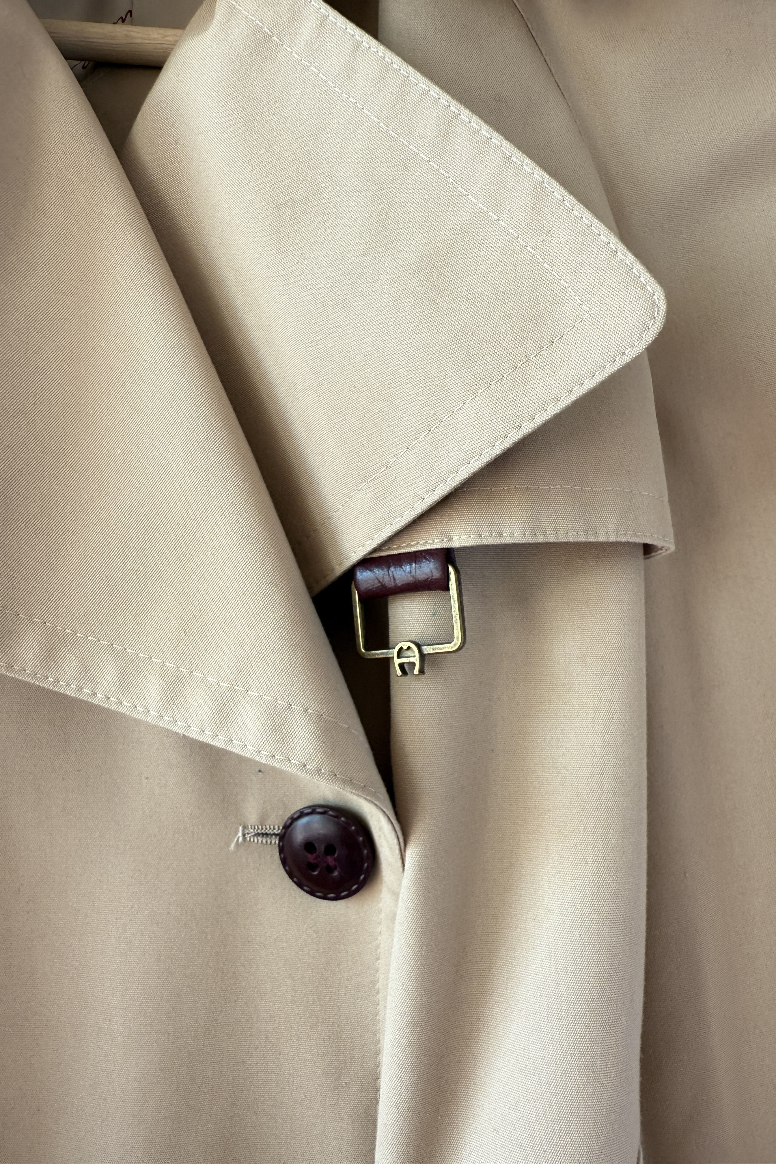 VINTAGE ETIENNE AIGNER TRENCH1980s trench coat by Etienne Aigner. Poly/cotton, signature acetate lining, pockets, double breasted, leather buckle at wrists, adjustable belt, metal logo hooks. Perfect condition appears to have never been worn. Marked 6P, fits like SMAL length 41shoulders 16sleeves 21bust 38Waist 28 ref: 0642 | 2542