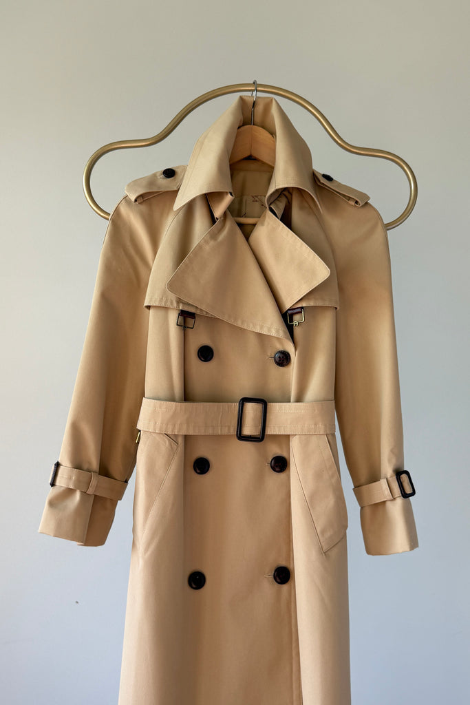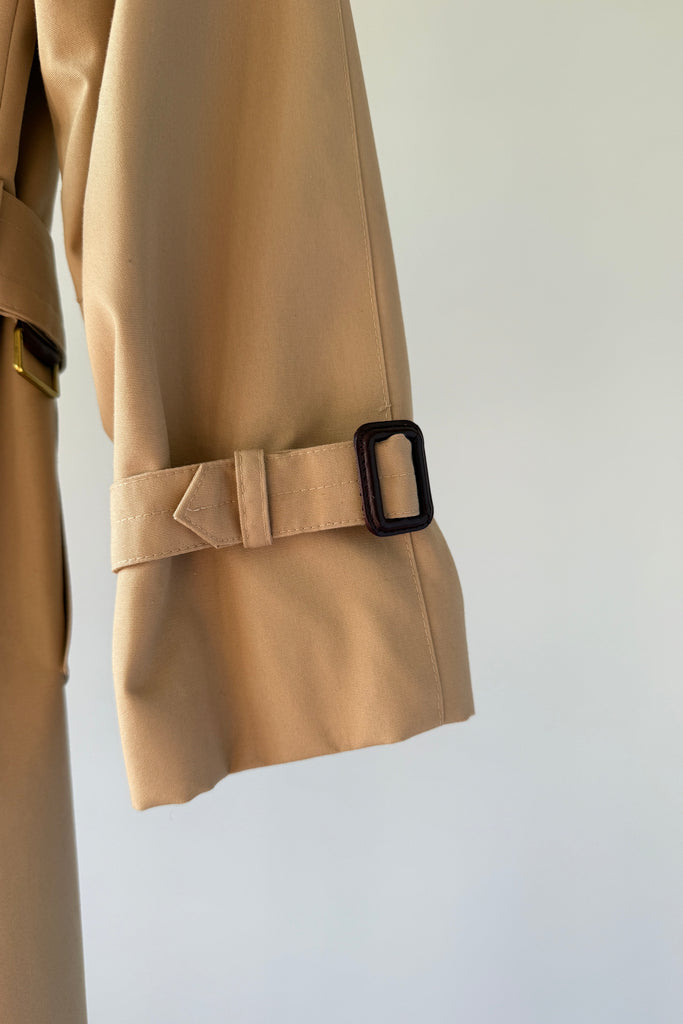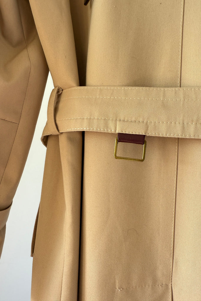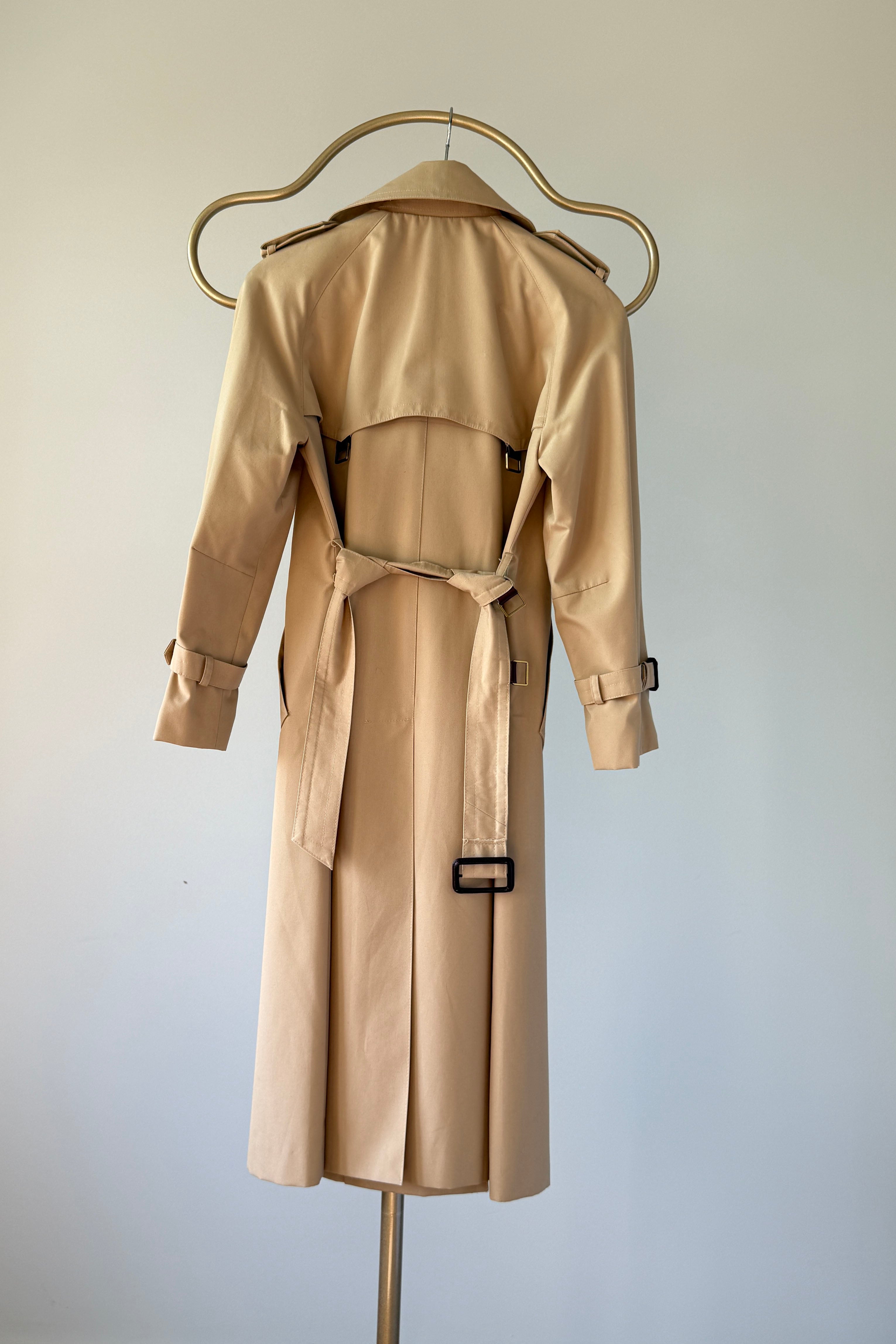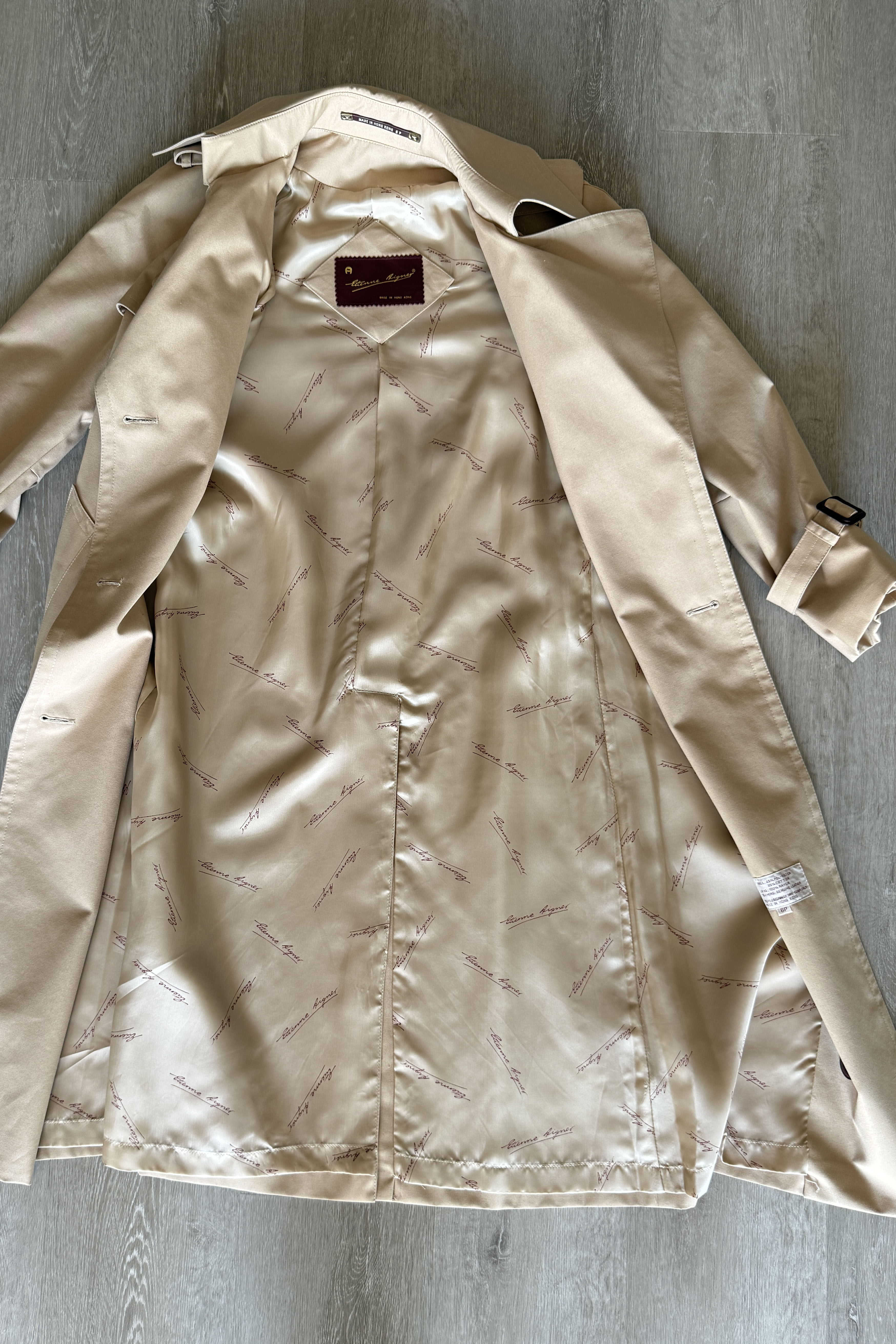 VINTAGE ETIENNE AIGNER TRENCH1980s trench coat by Etienne Aigner. Poly/cotton, signature acetate lining, pockets, double breasted, leather buckle at wrists, adjustable belt, metal logo hooks. Perfect condition appears to have never been worn. Marked 6P, fits like SMAL length 41shoulders 16sleeves 21bust 38Waist 28 ref: 0642 | 2542