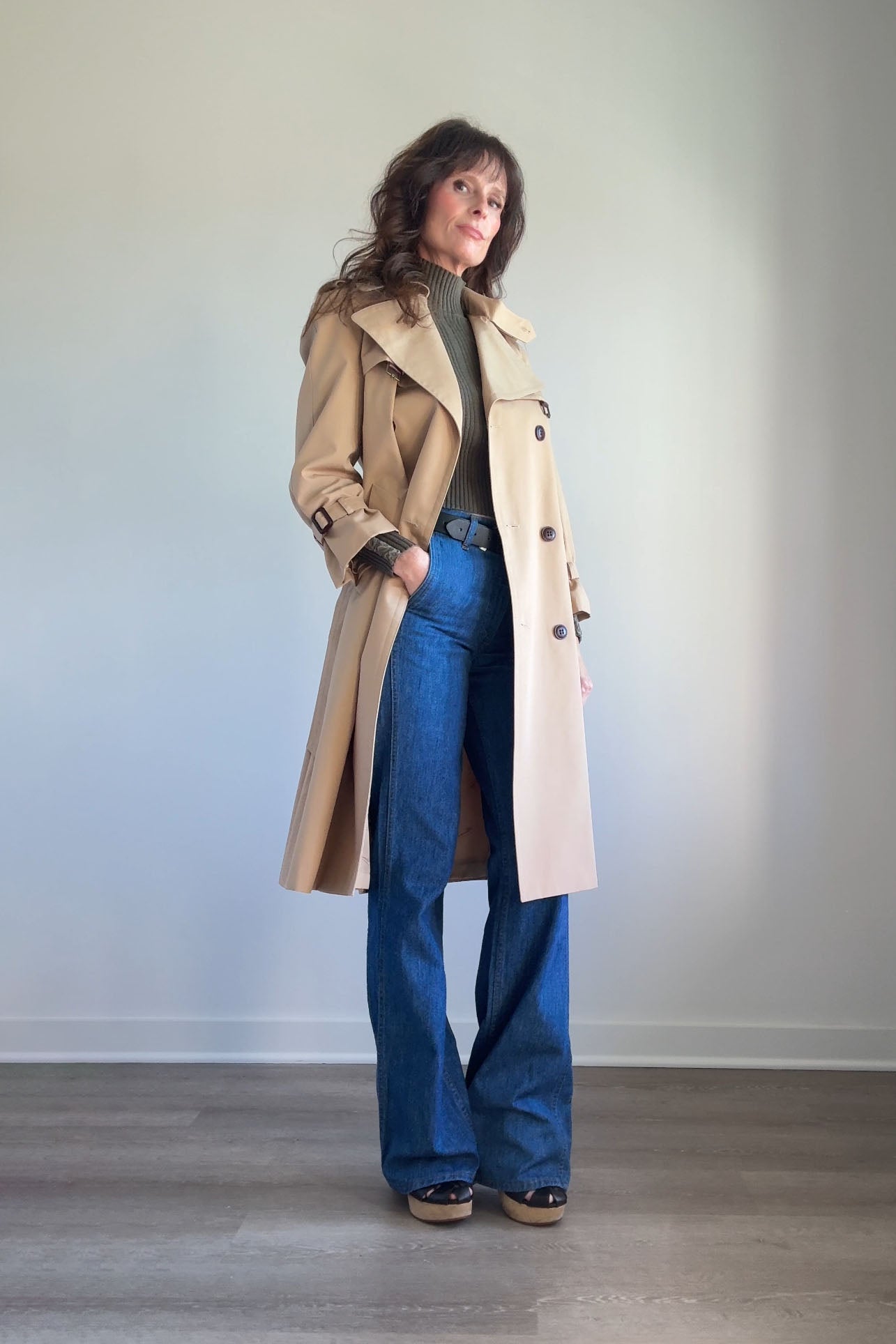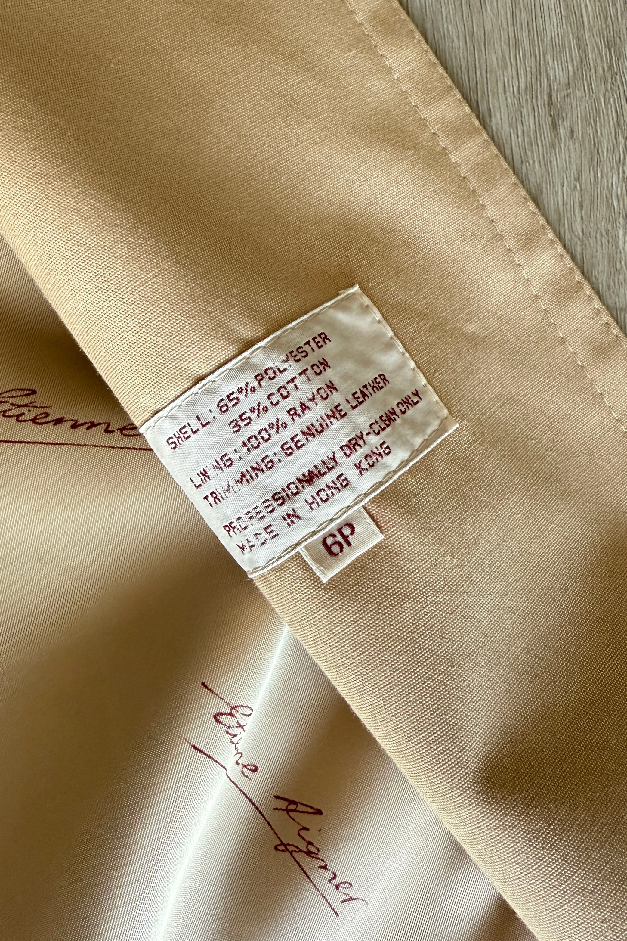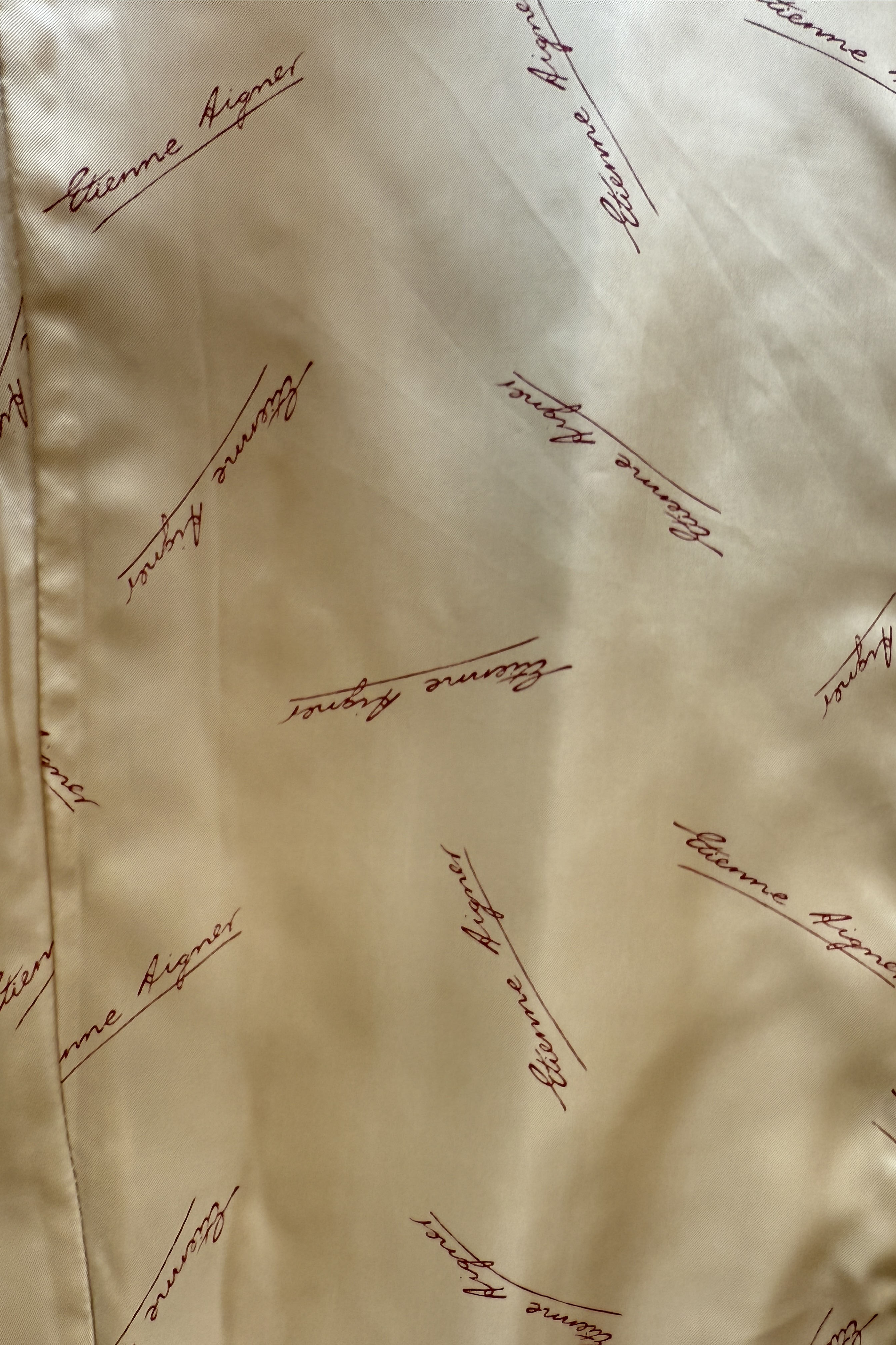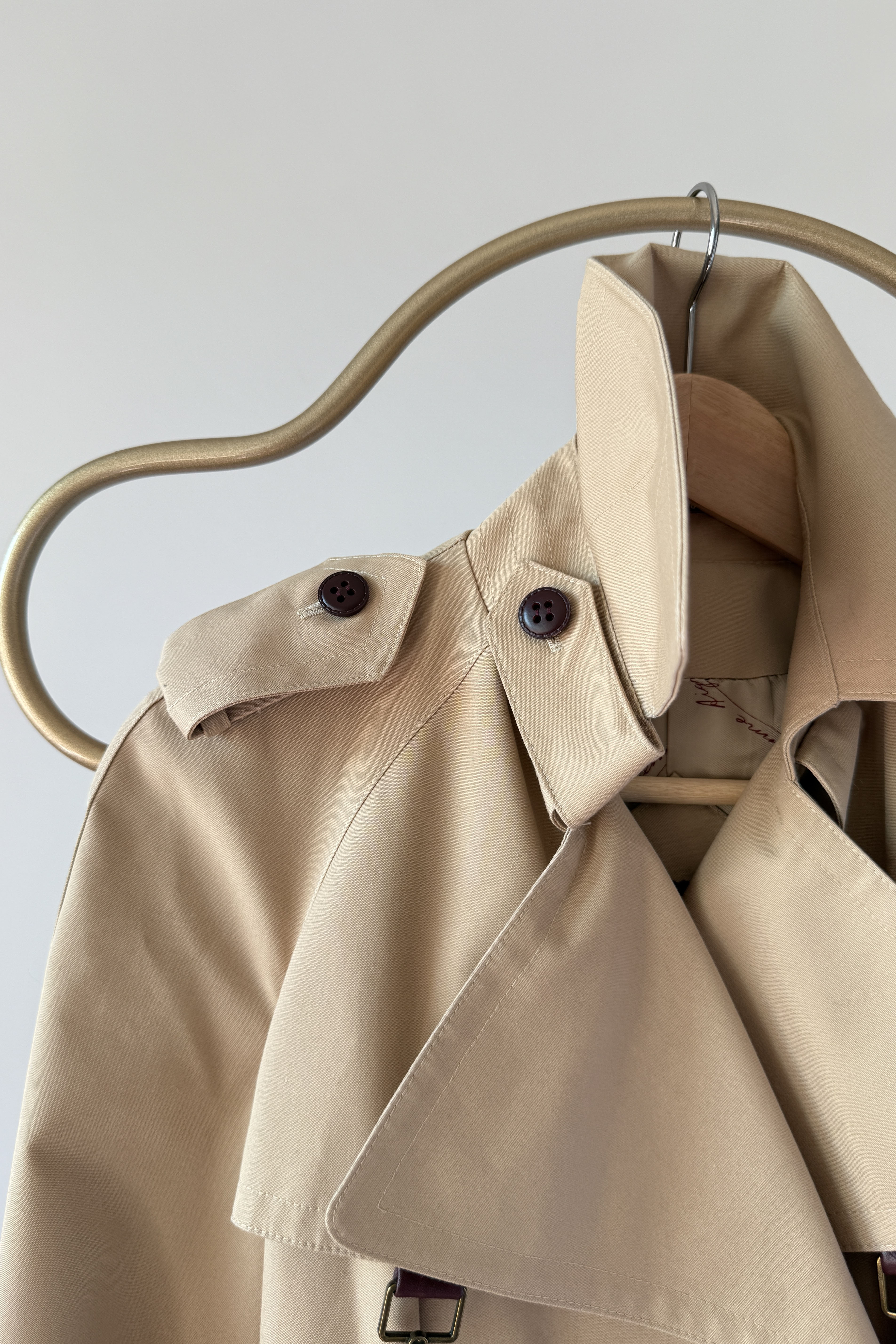 VINTAGE ETIENNE AIGNER TRENCH1980s trench coat by Etienne Aigner. Poly/cotton, signature acetate lining, pockets, double breasted, leather buckle at wrists, adjustable belt, metal logo hooks. Perfect condition appears to have never been worn. Marked 6P, fits like SMAL length 41shoulders 16sleeves 21bust 38Waist 28 ref: 0642 | 2542