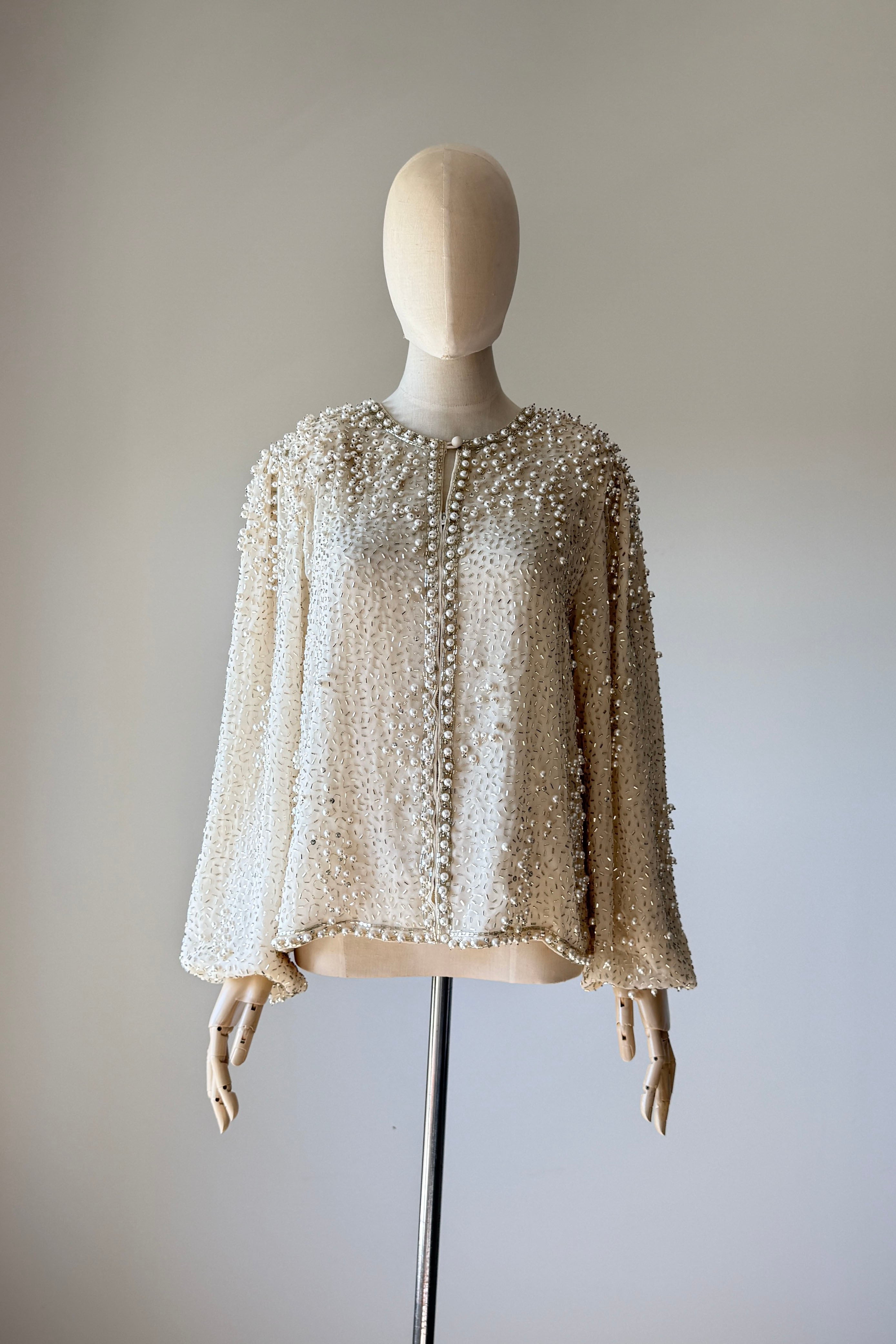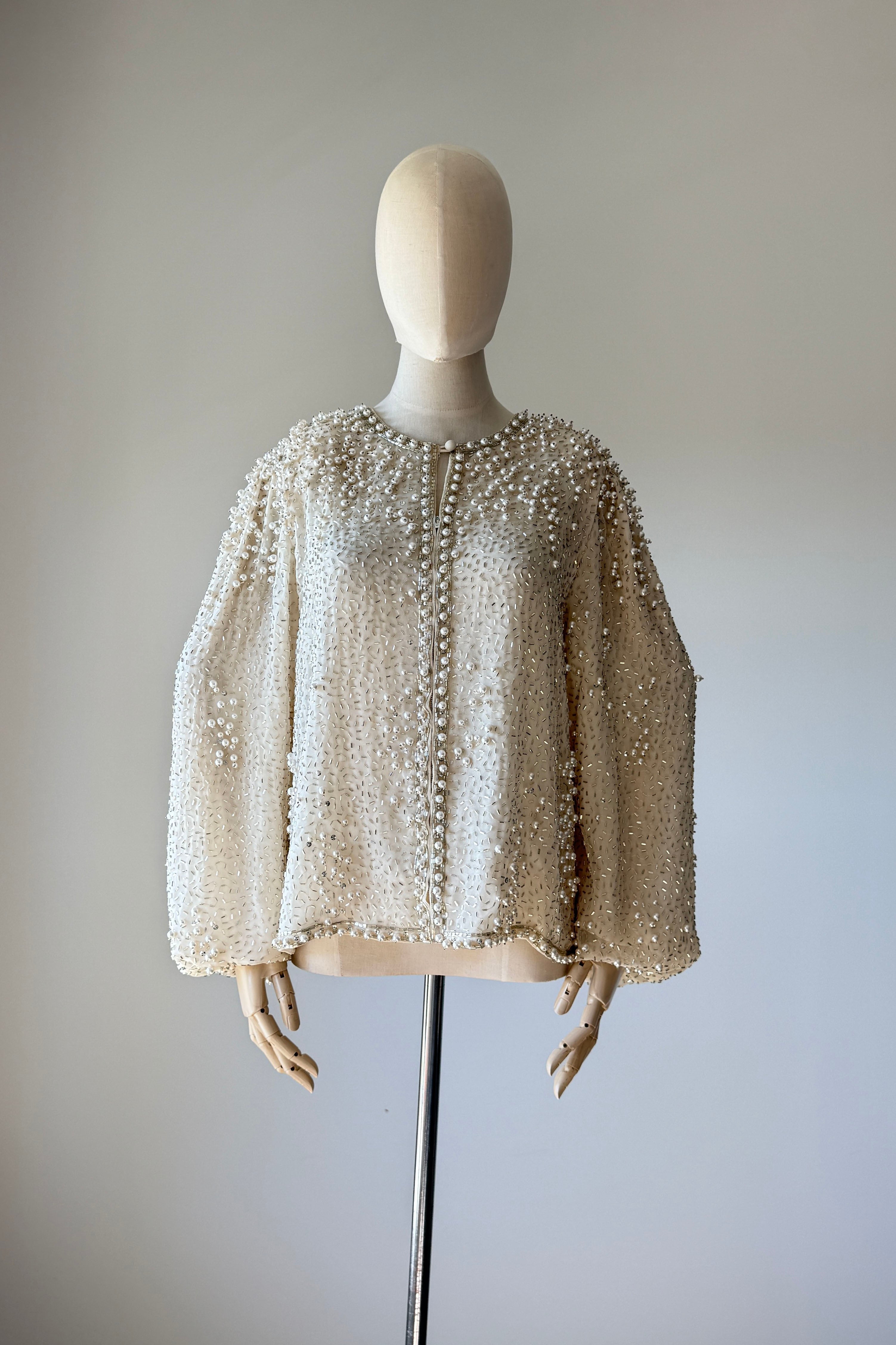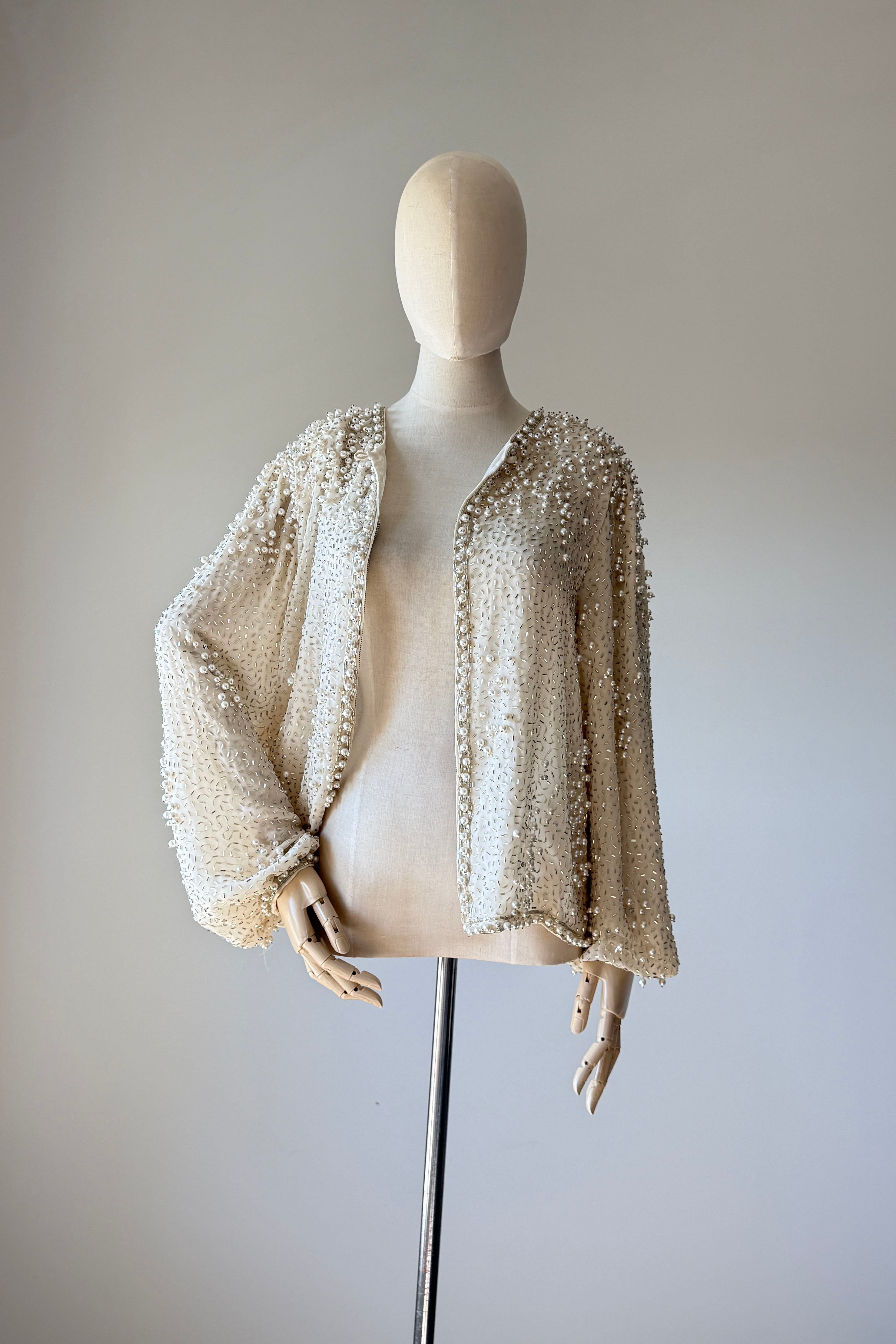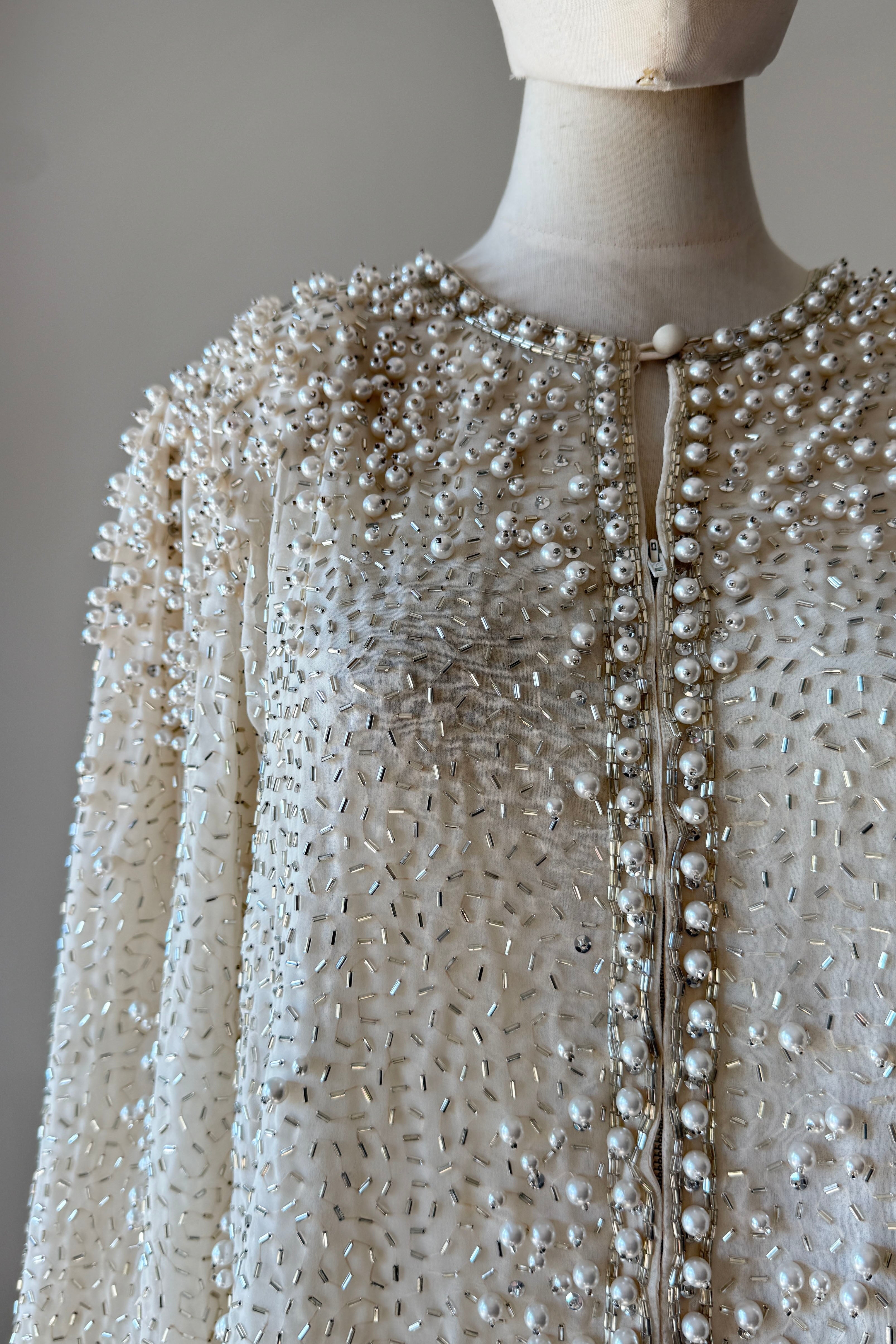 VINTAGE JACKET Vintage 1960s jacket. Features pearlized and bugle beads, sequins, chiffon with crepe lining, snaps at wrist, metal zipper up front. Heavily beaded weighing over 2.5 lbs. Absolutely incredible piece. By Jack Bryan for Neiman Marcus. Excellent condition. Fits like XS to MED.Length 22Shoulder 16Sleeve 23Bust 40As with all vintage, please expect wear consistent with age. All sales are final. No order cancellations.0926 | 2613
