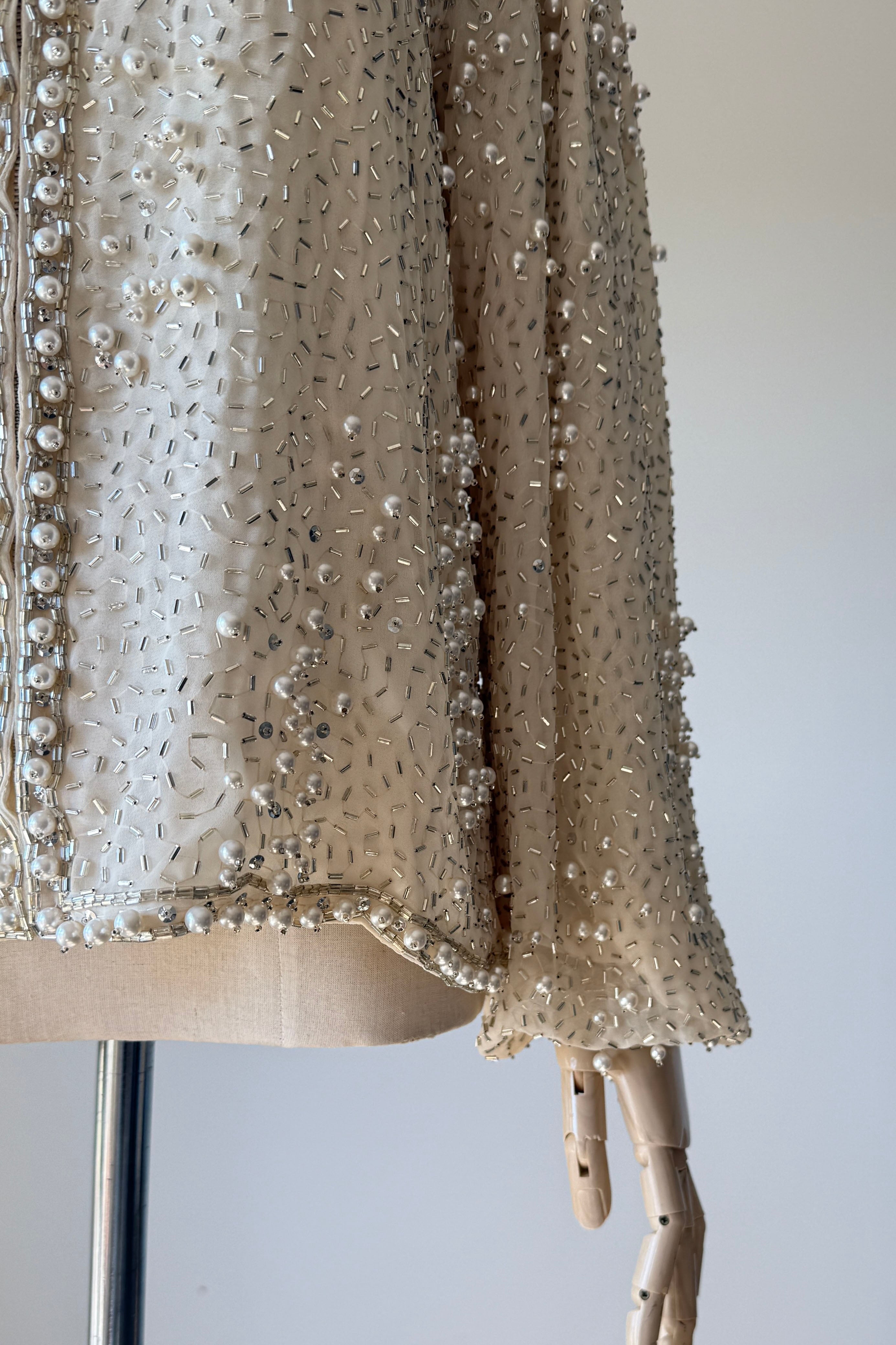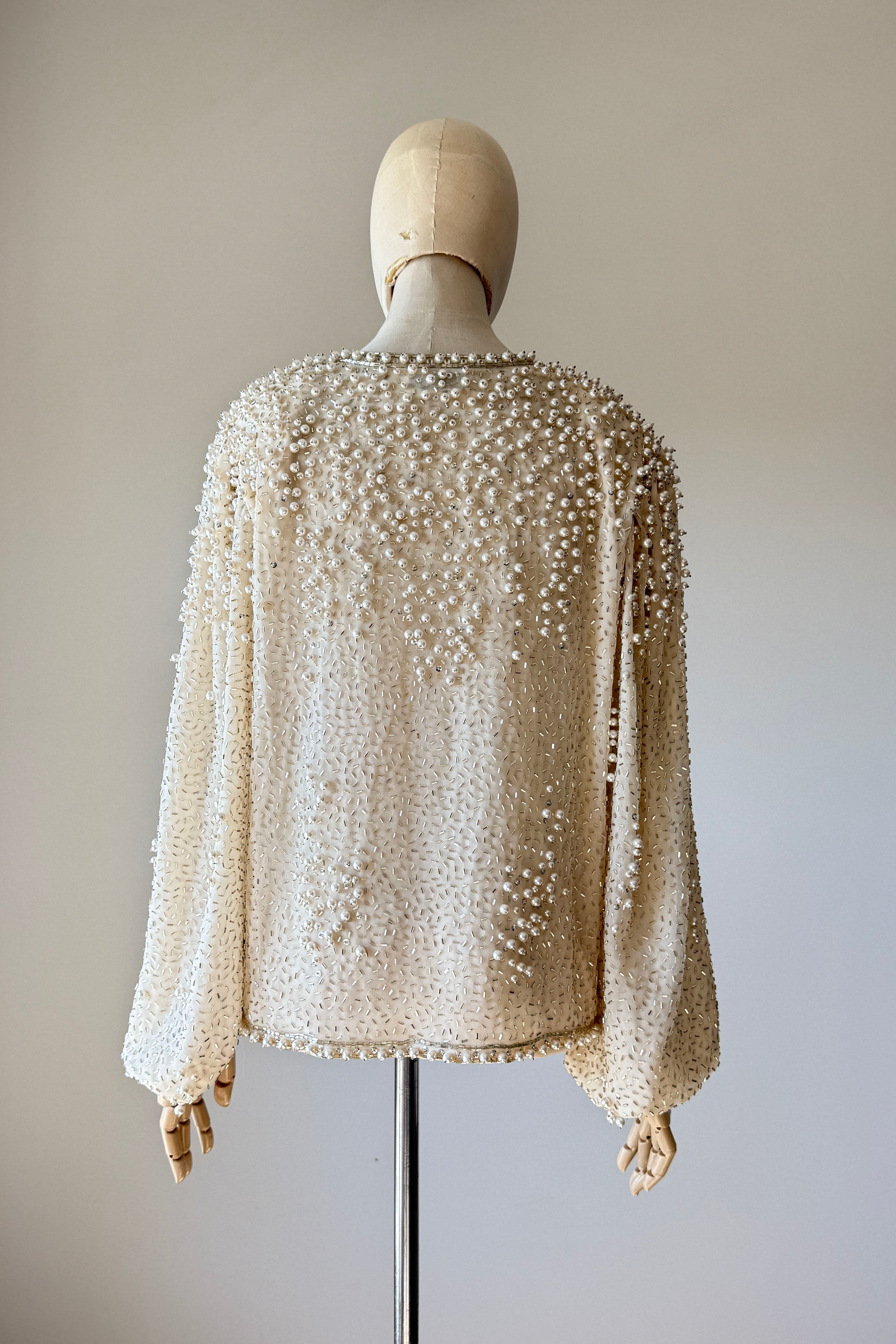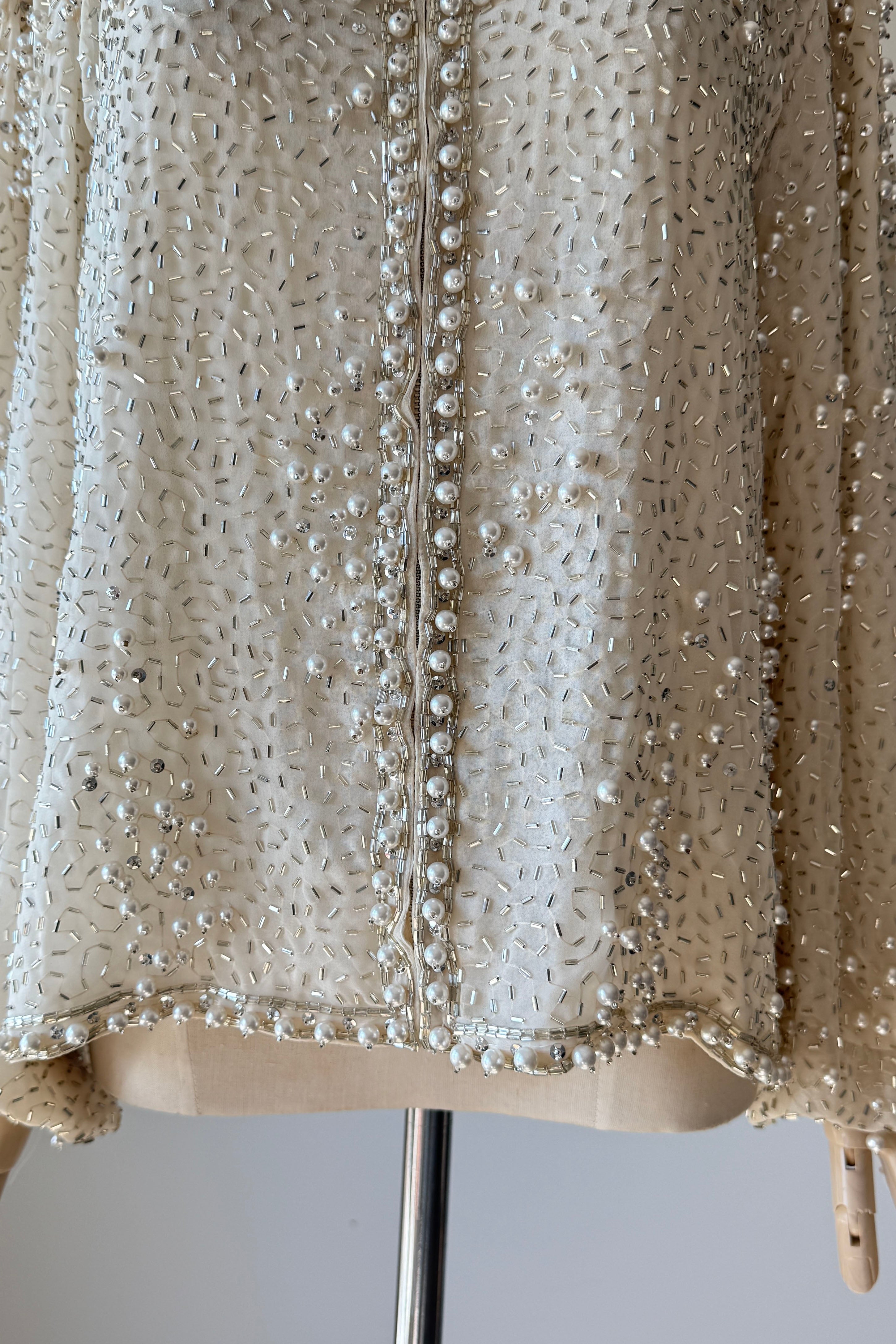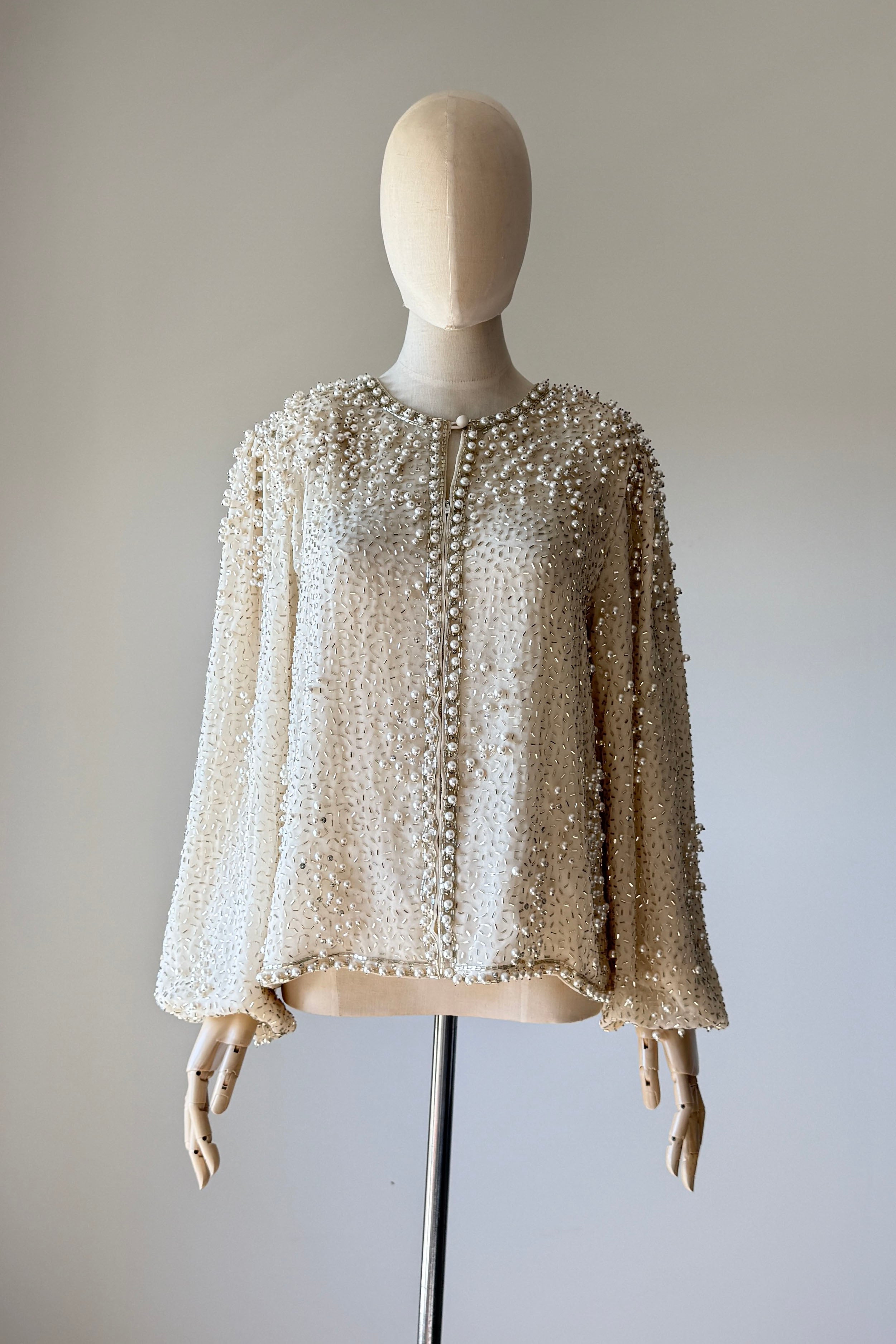 VINTAGE JACKET Vintage 1960s jacket. Features pearlized and bugle beads, sequins, chiffon with crepe lining, snaps at wrist, metal zipper up front. Heavily beaded weighing over 2.5 lbs. Absolutely incredible piece. By Jack Bryan for Neiman Marcus. Excellent condition. Fits like XS to MED.Length 22Shoulder 16Sleeve 23Bust 40As with all vintage, please expect wear consistent with age. All sales are final. No order cancellations.0926 | 2613
