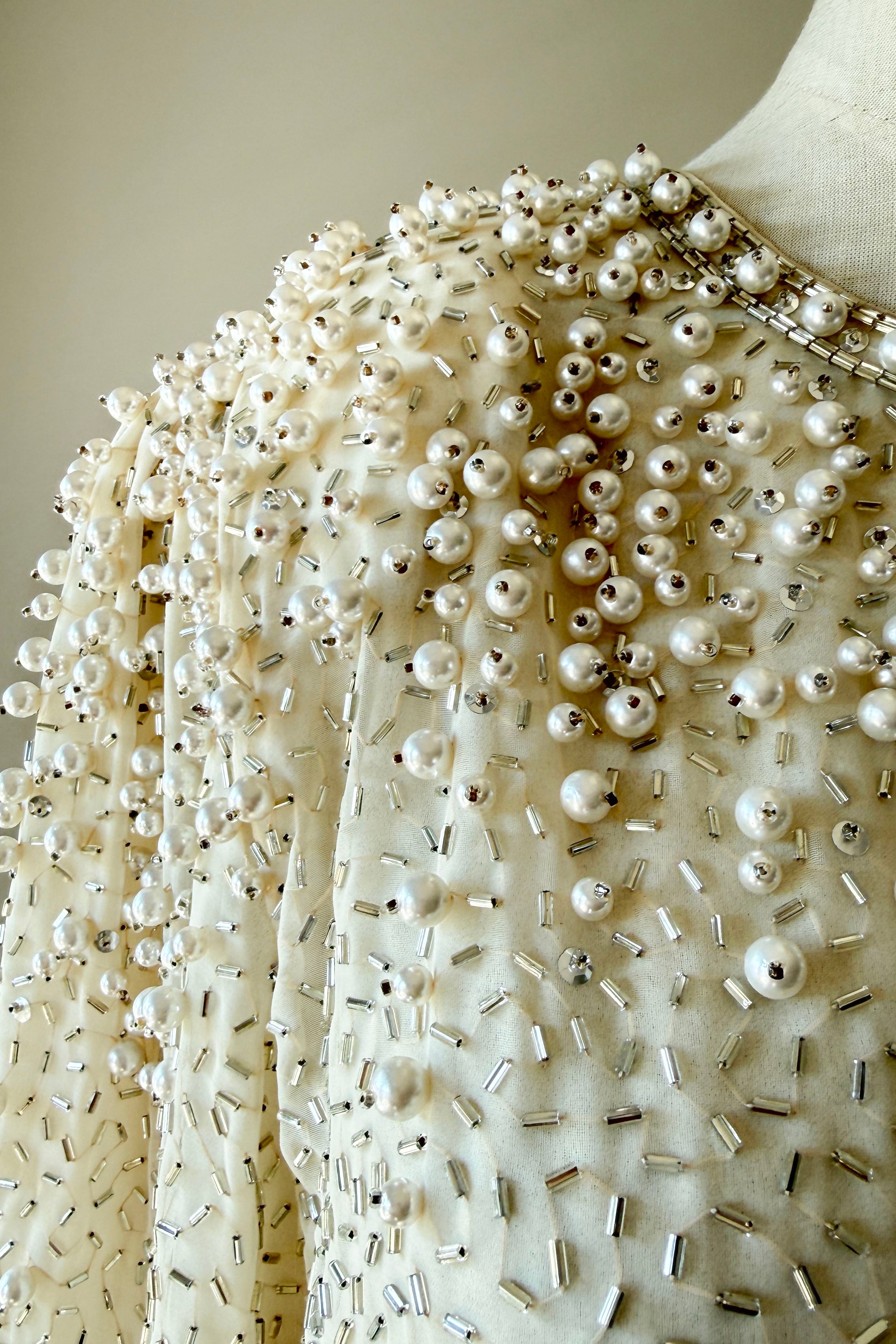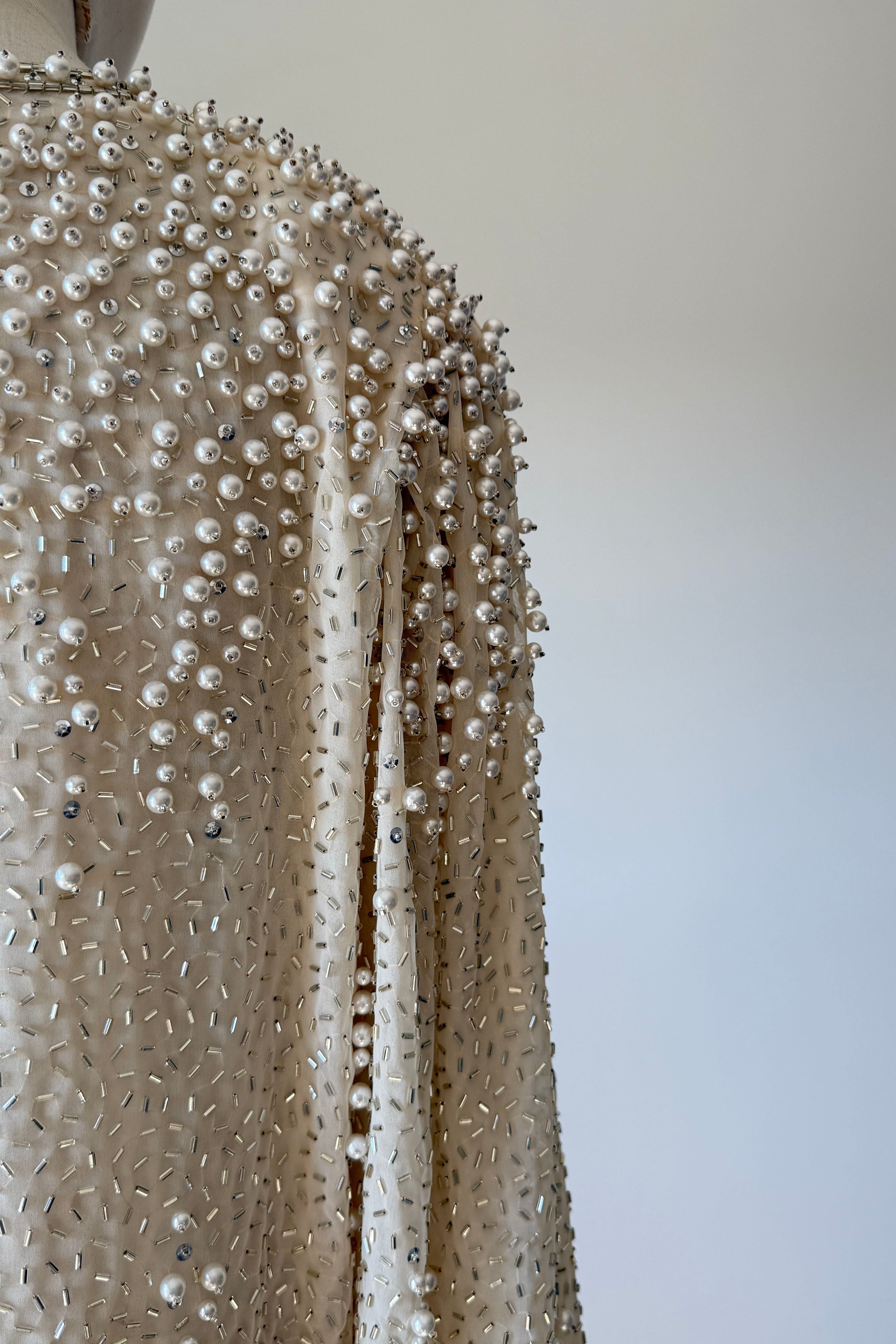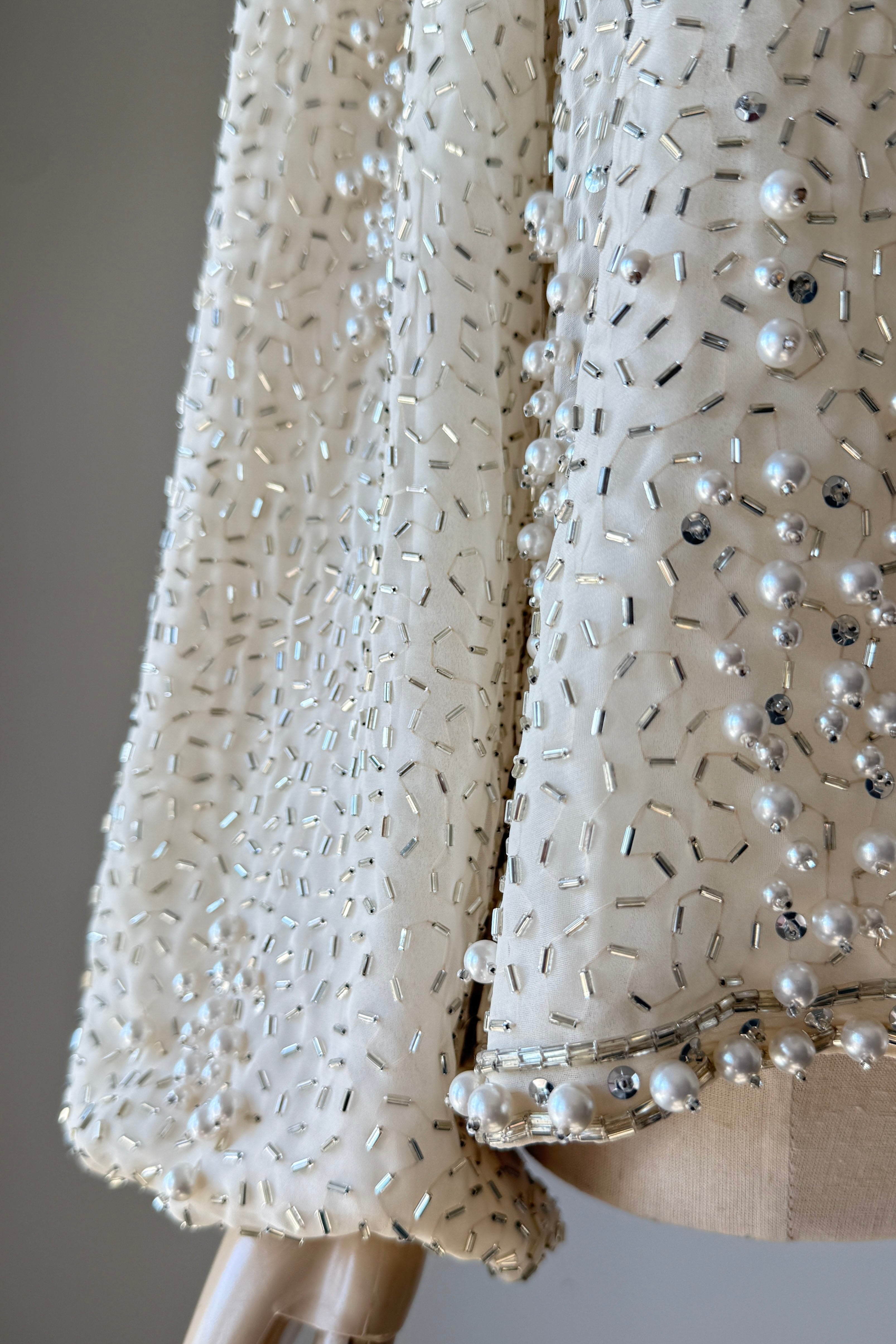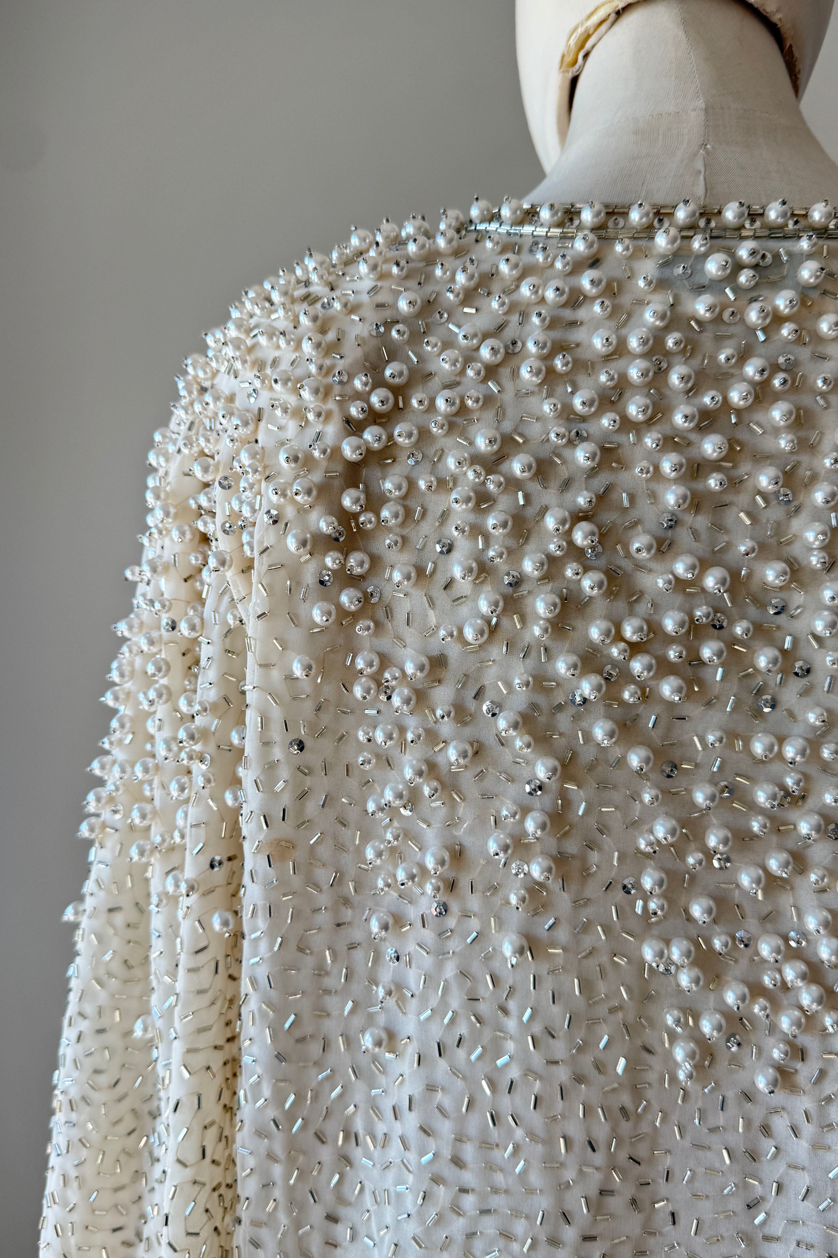VINTAGE JACKET Vintage 1960s jacket. Features pearlized and bugle beads, sequins, chiffon with crepe lining, snaps at wrist, metal zipper up front. Heavily beaded weighing over 2.5 lbs. Absolutely incredible piece. By Jack Bryan for Neiman Marcus. Excellent condition. Fits like XS to MED.Length 22Shoulder 16Sleeve 23Bust 40As with all vintage, please expect wear consistent with age. All sales are final. No order cancellations.0926 | 2613