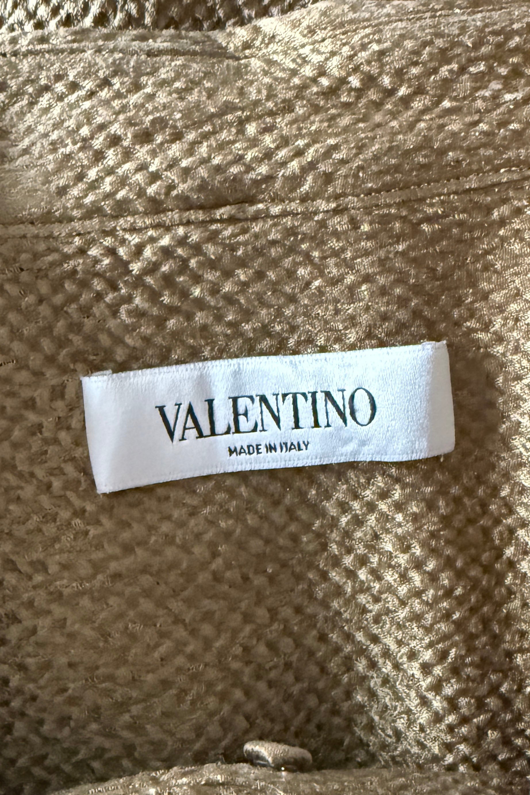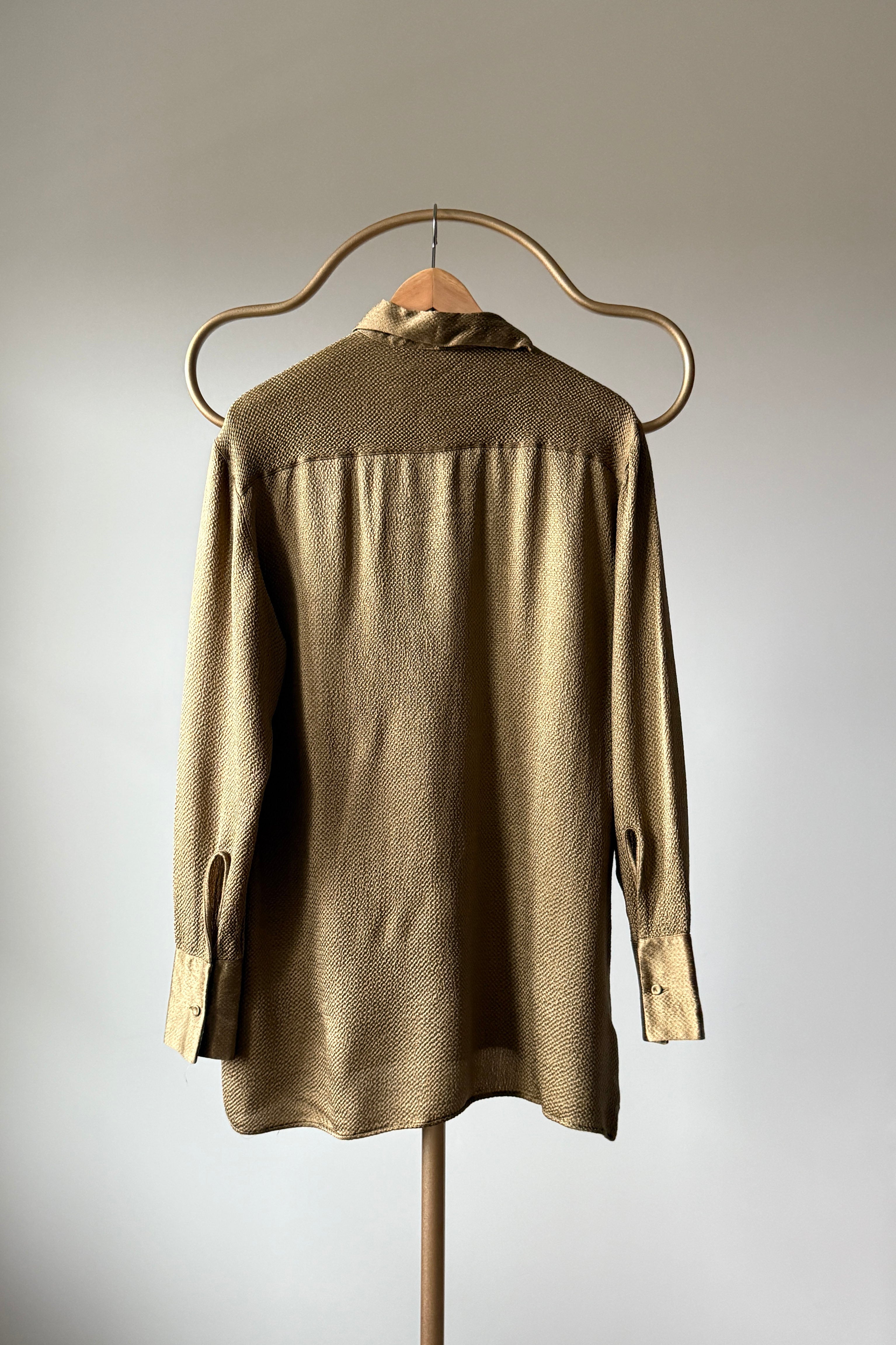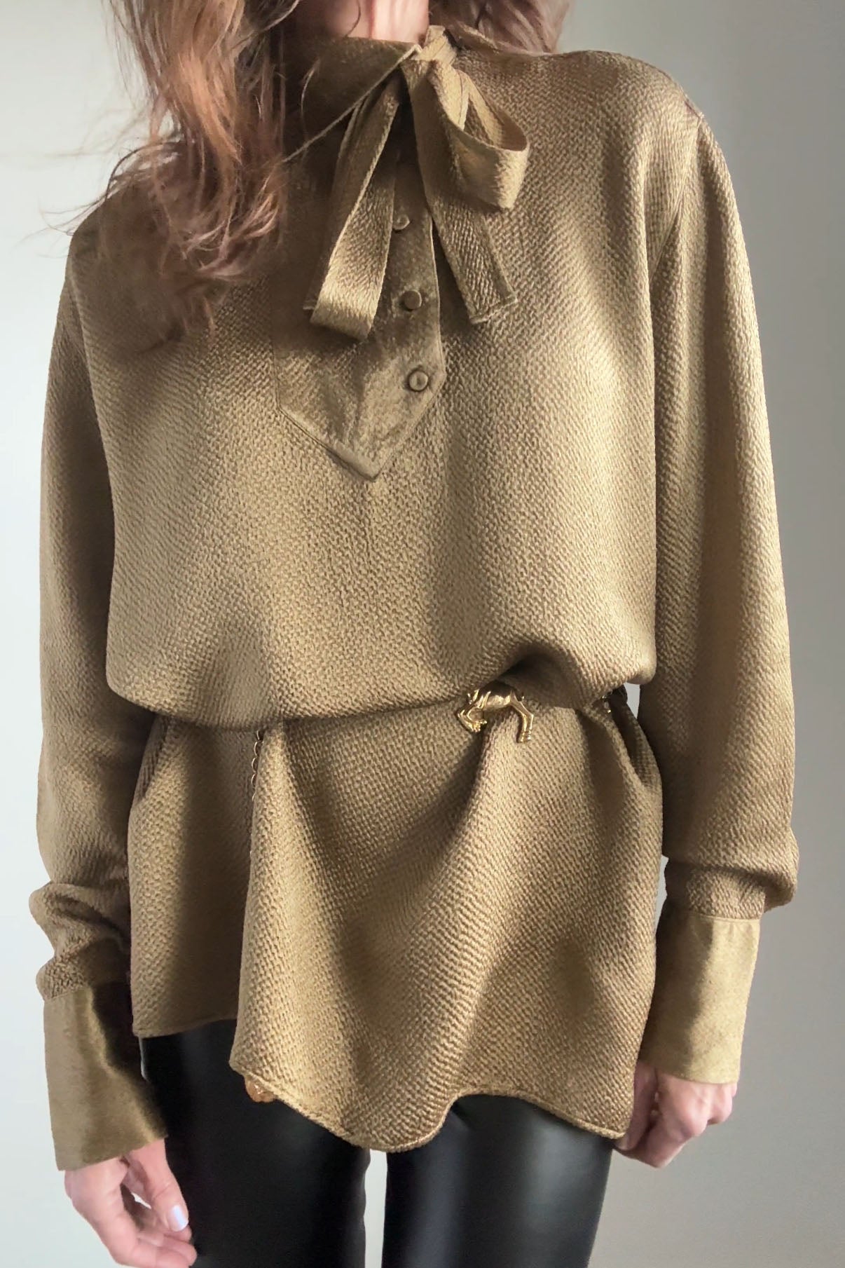 VINTAGE BLOUSE BY VALENTINOVintage silk + viscose blouse. Covered buttons at wrists and neck, offset neck tie, tunic length. By Valentino. {belt not included}Excellent condition. Fits like M/LLength 29Shoulder 18Sleeve 24Bust 44-46Waist 42As with all vintage, please expect wear consistent with age. All sales are final. No order cancellations.0733 | 2549