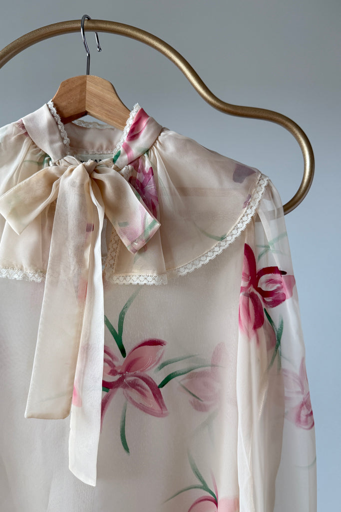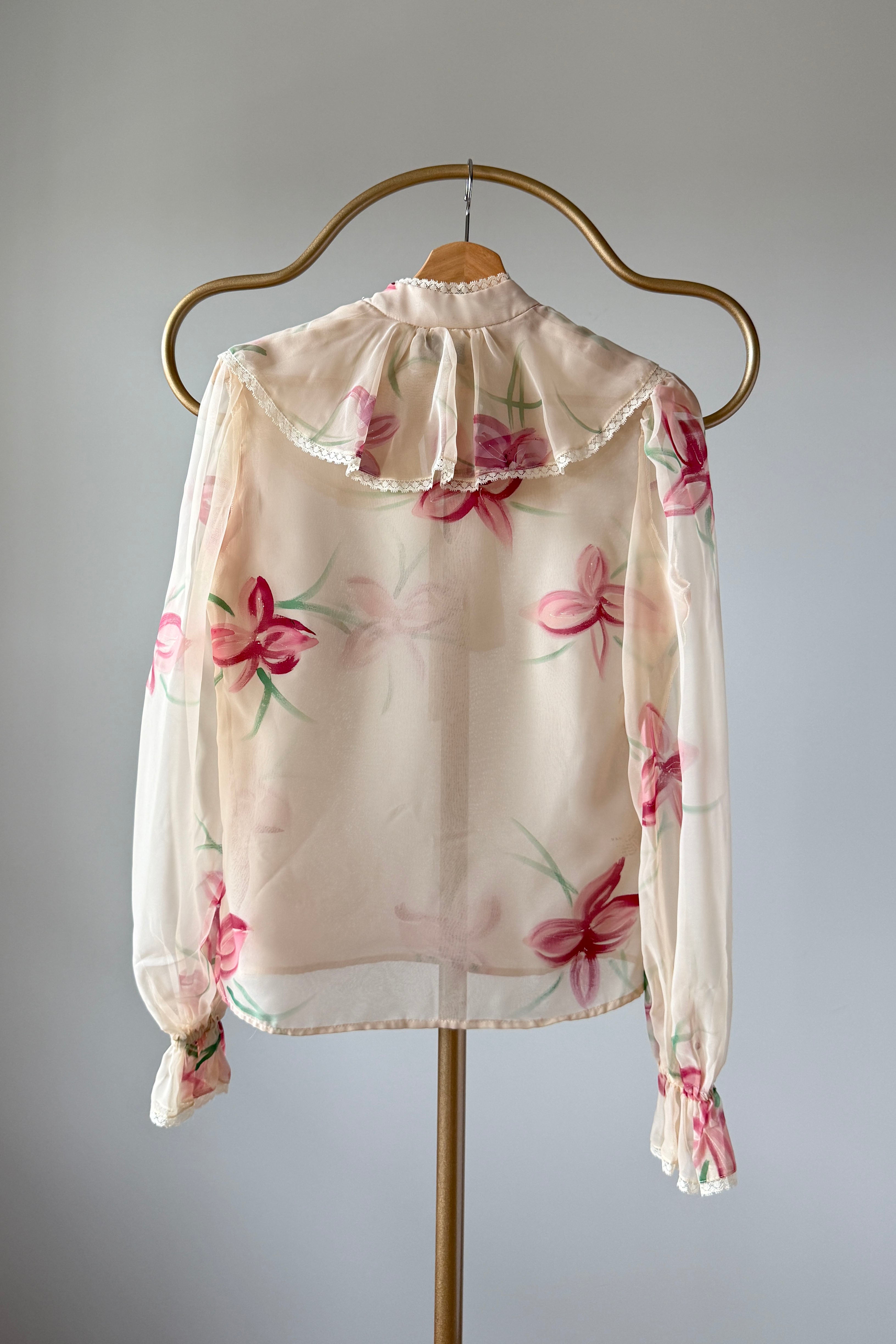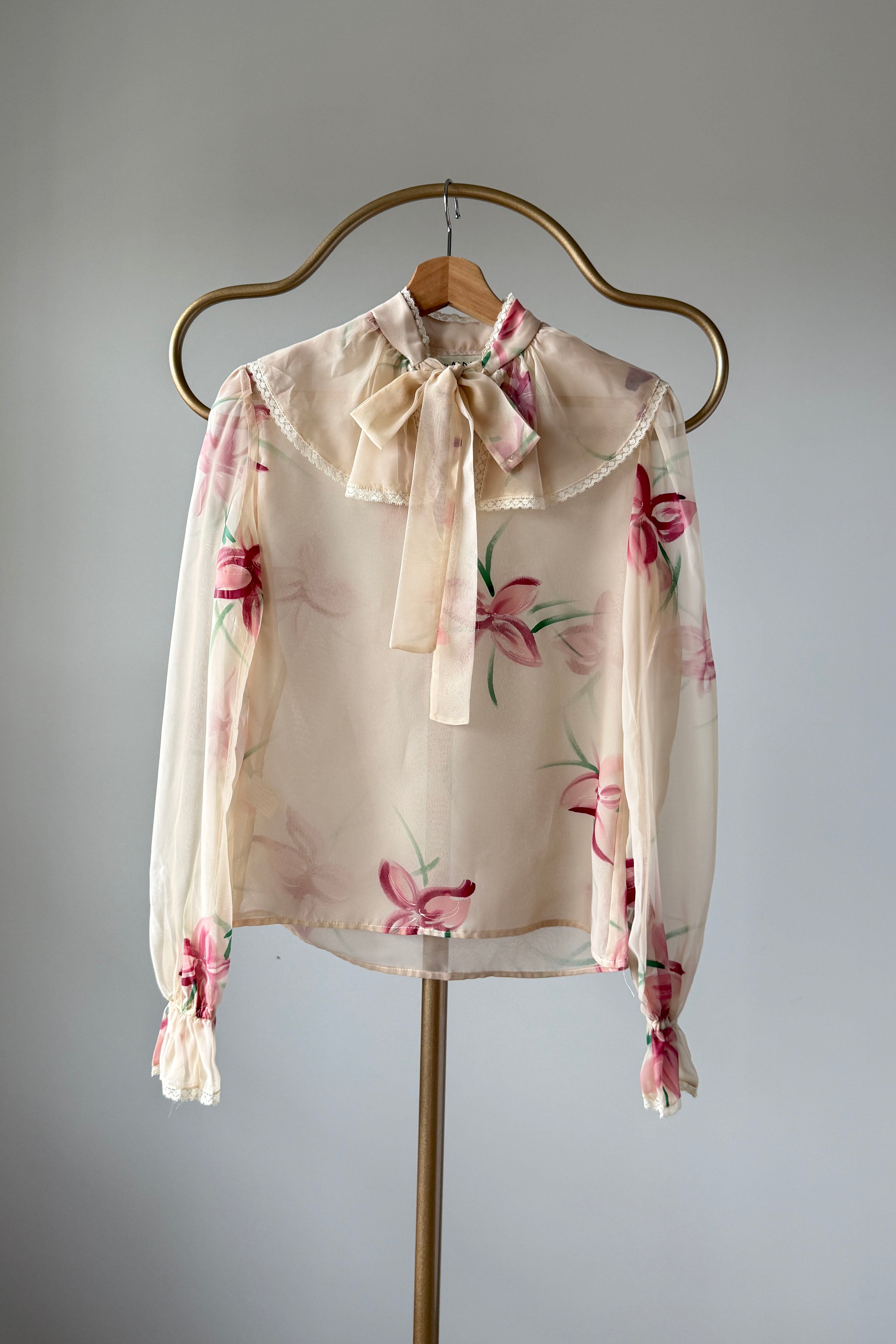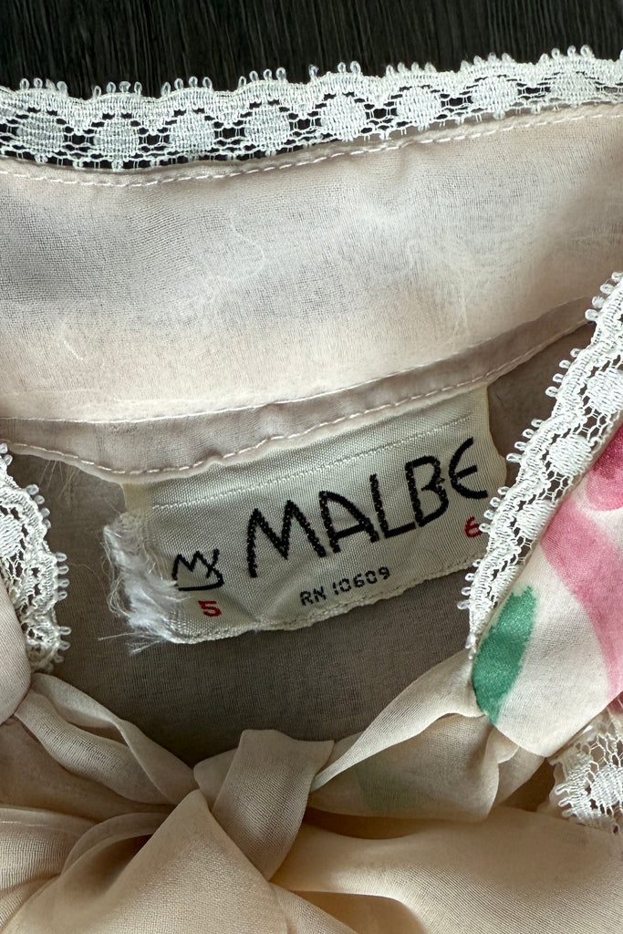 VINTAGE BLOUSE BY MALBEVintage 1980s sheer chiffon blouse with neck time, elastic cuff, painted floral print. By Malbe.Excellent condition. Fits like SMALLLength 23Bust 38Shoulders 15Sleeves 23*As with all vintage, please expect wear consistent with age. All sales are final. No order cancellations.0698 | 2546