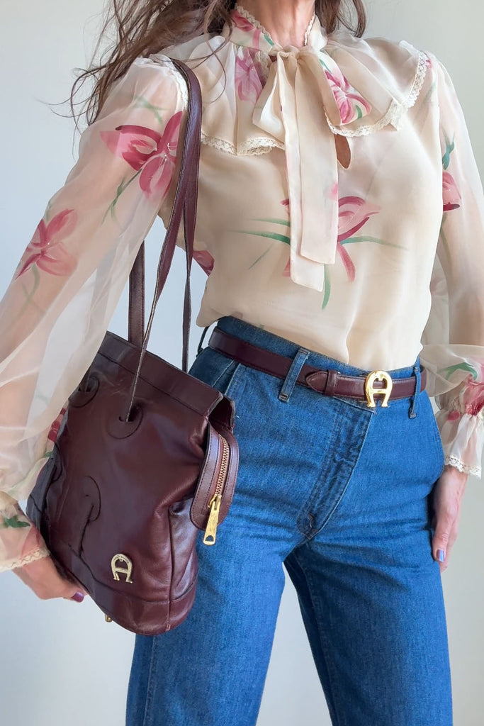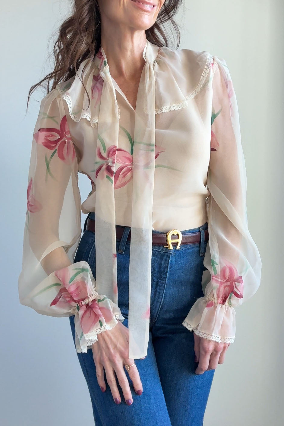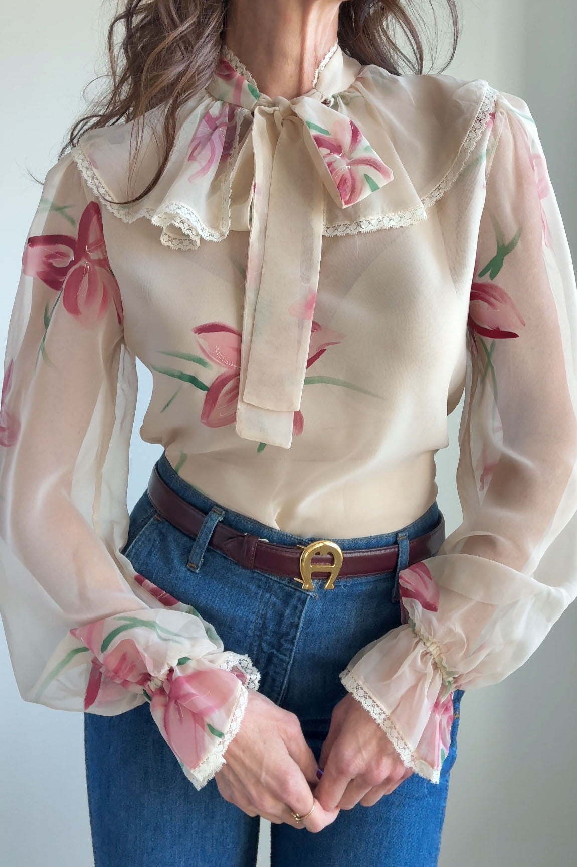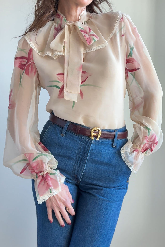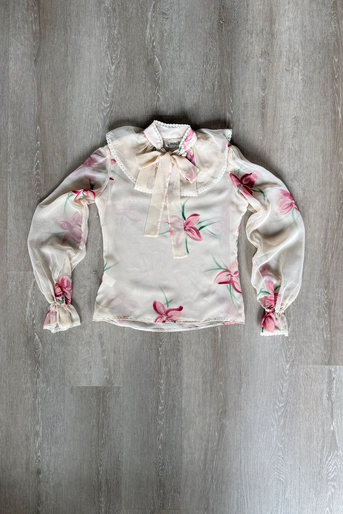 VINTAGE BLOUSE BY MALBEVintage 1980s sheer chiffon blouse with neck time, elastic cuff, painted floral print. By Malbe.Excellent condition. Fits like SMALLLength 23Bust 38Shoulders 15Sleeves 23*As with all vintage, please expect wear consistent with age. All sales are final. No order cancellations.0698 | 2546