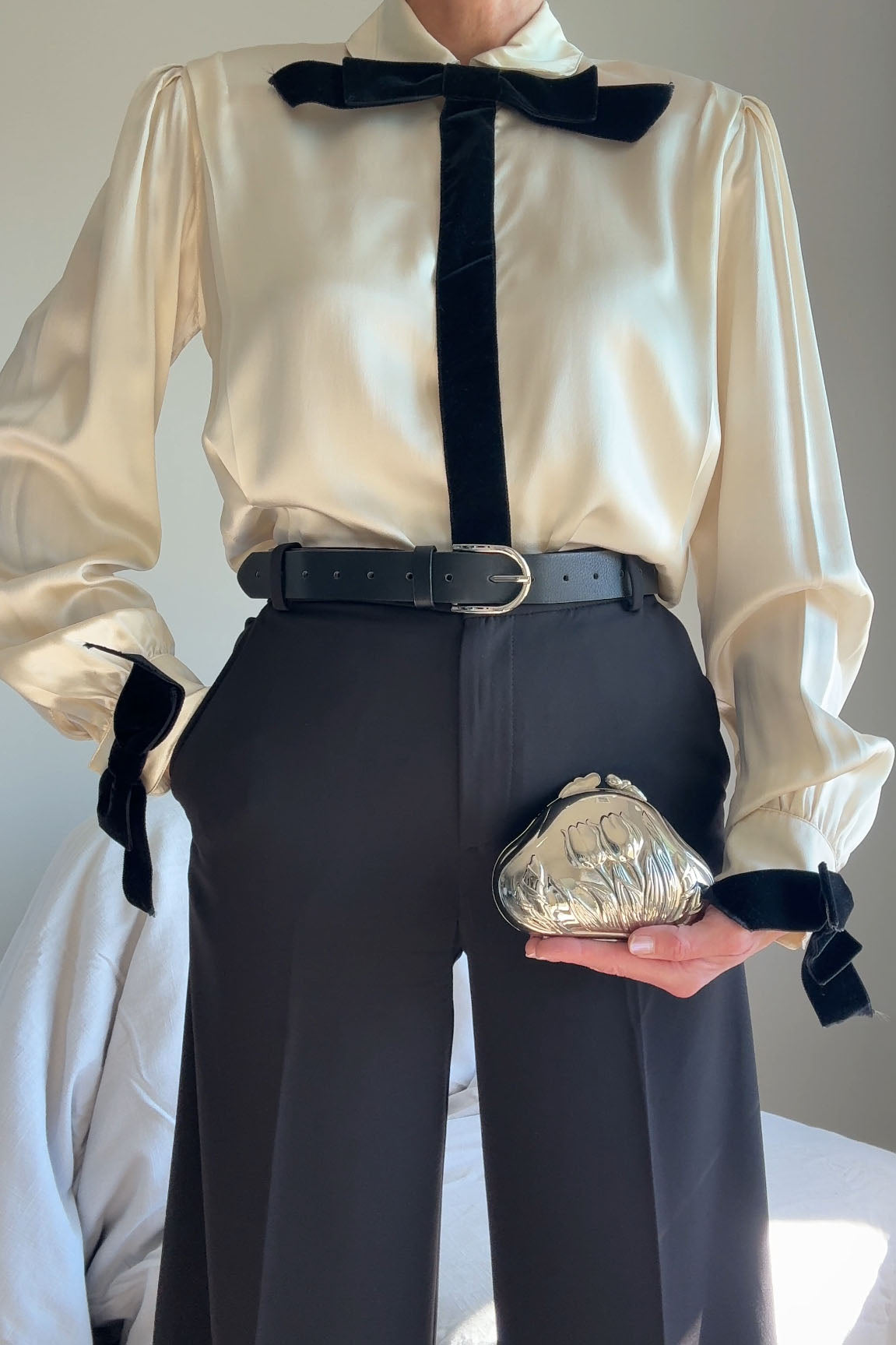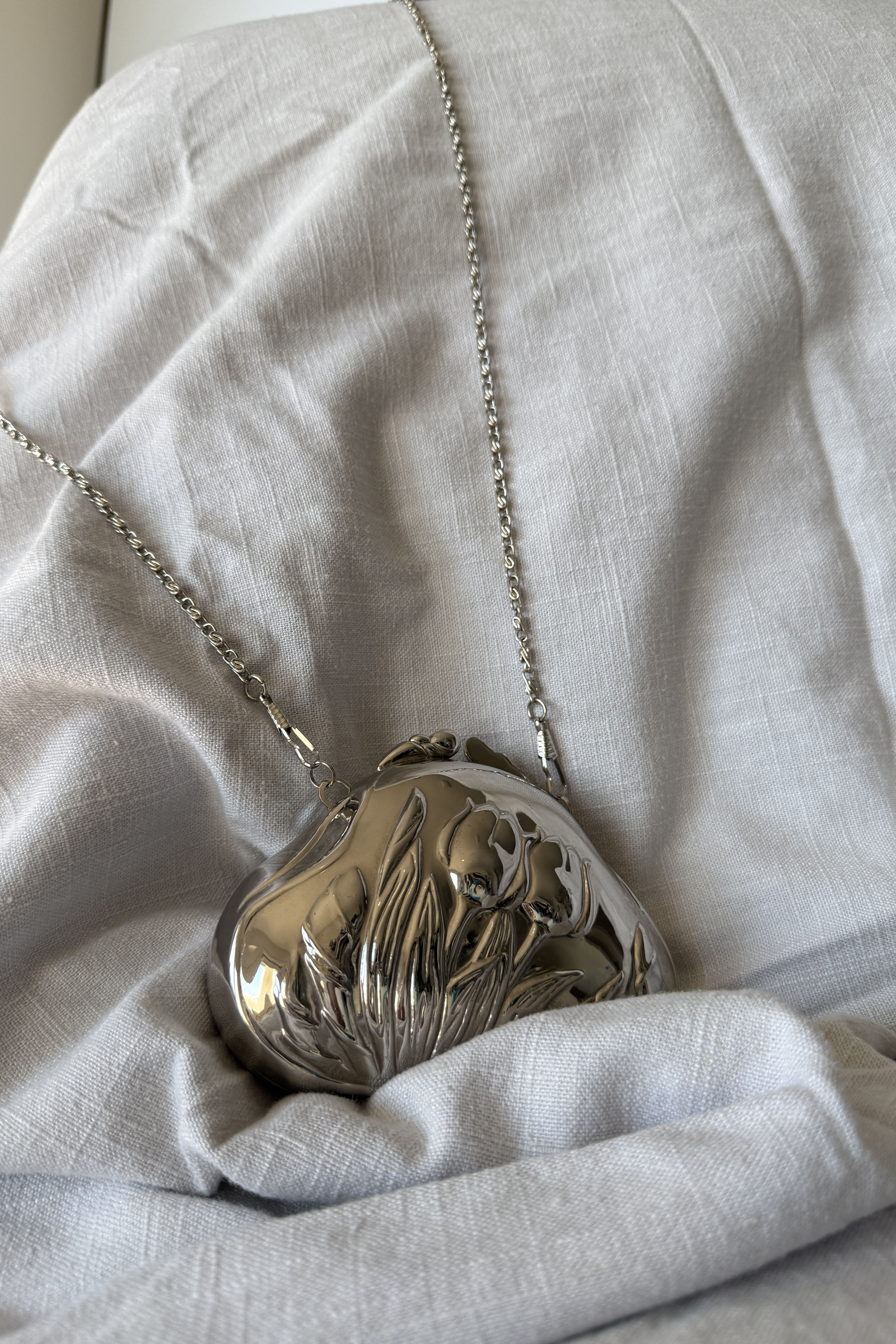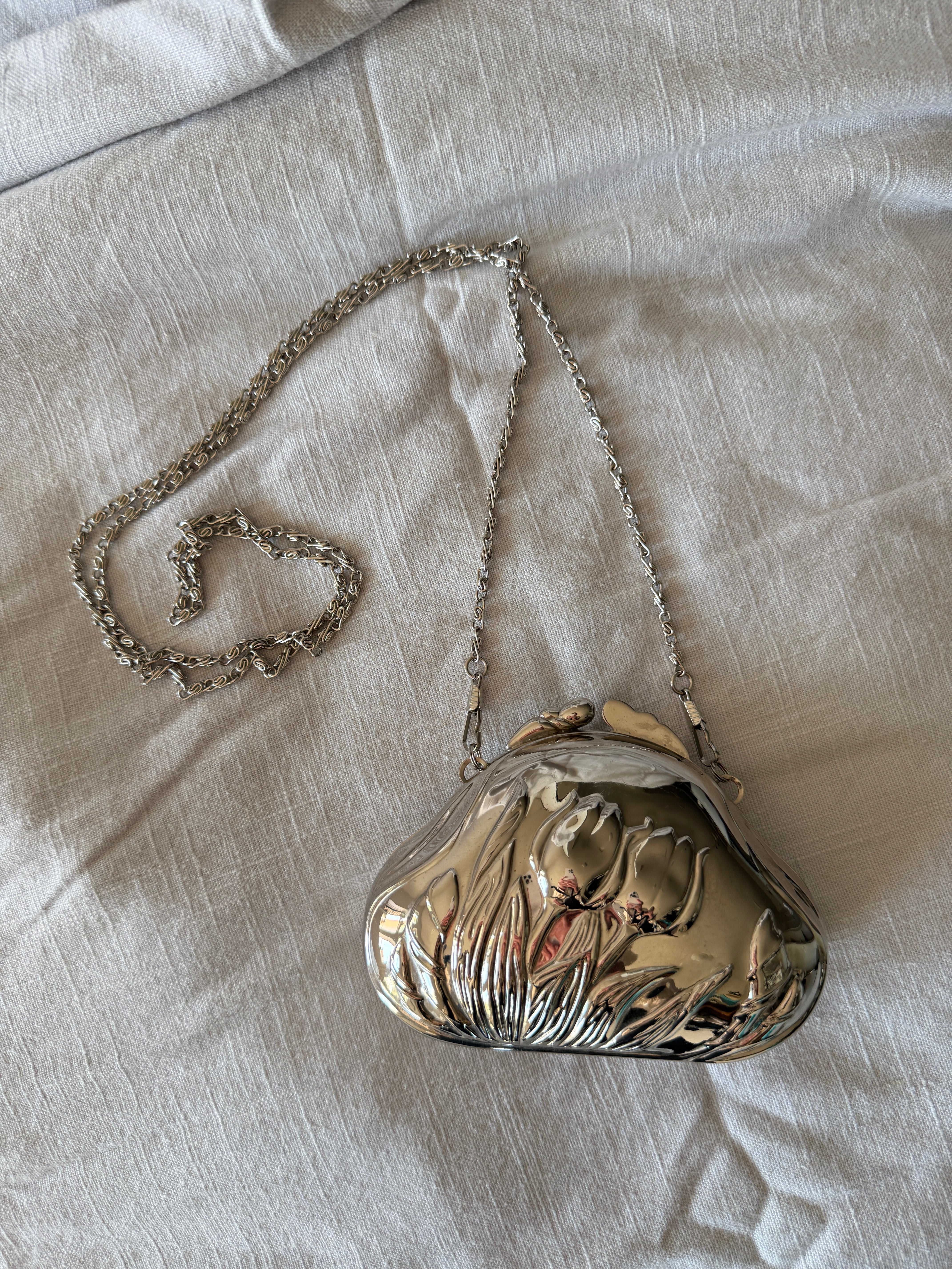 VINTAGE METAL TULIPS BAGVintage silver metal tulips bag. Detachable metal chain, kiss opening, lined. Excellent condition 5.5" x 4"24" dropref: 0650 | 2542