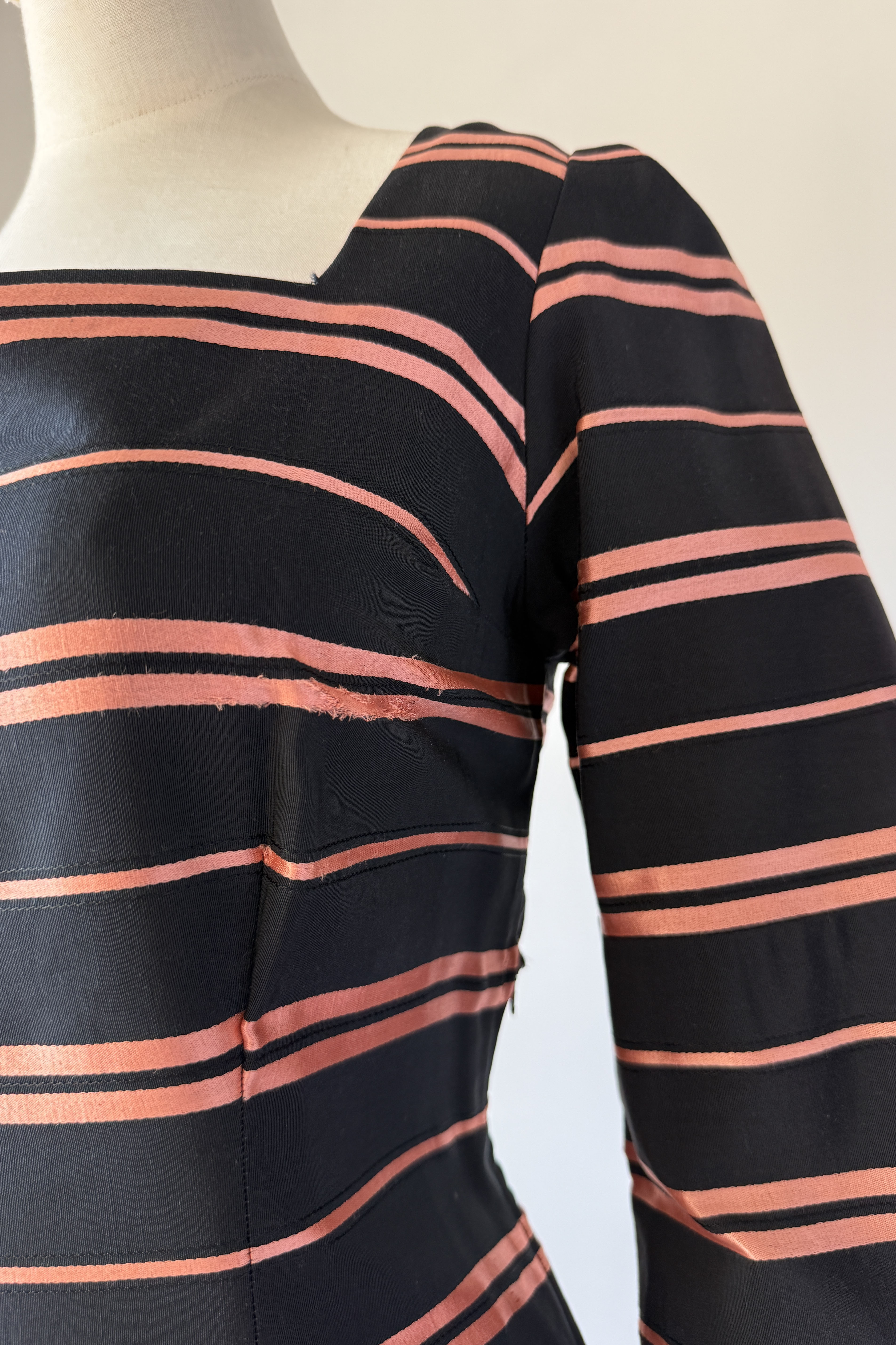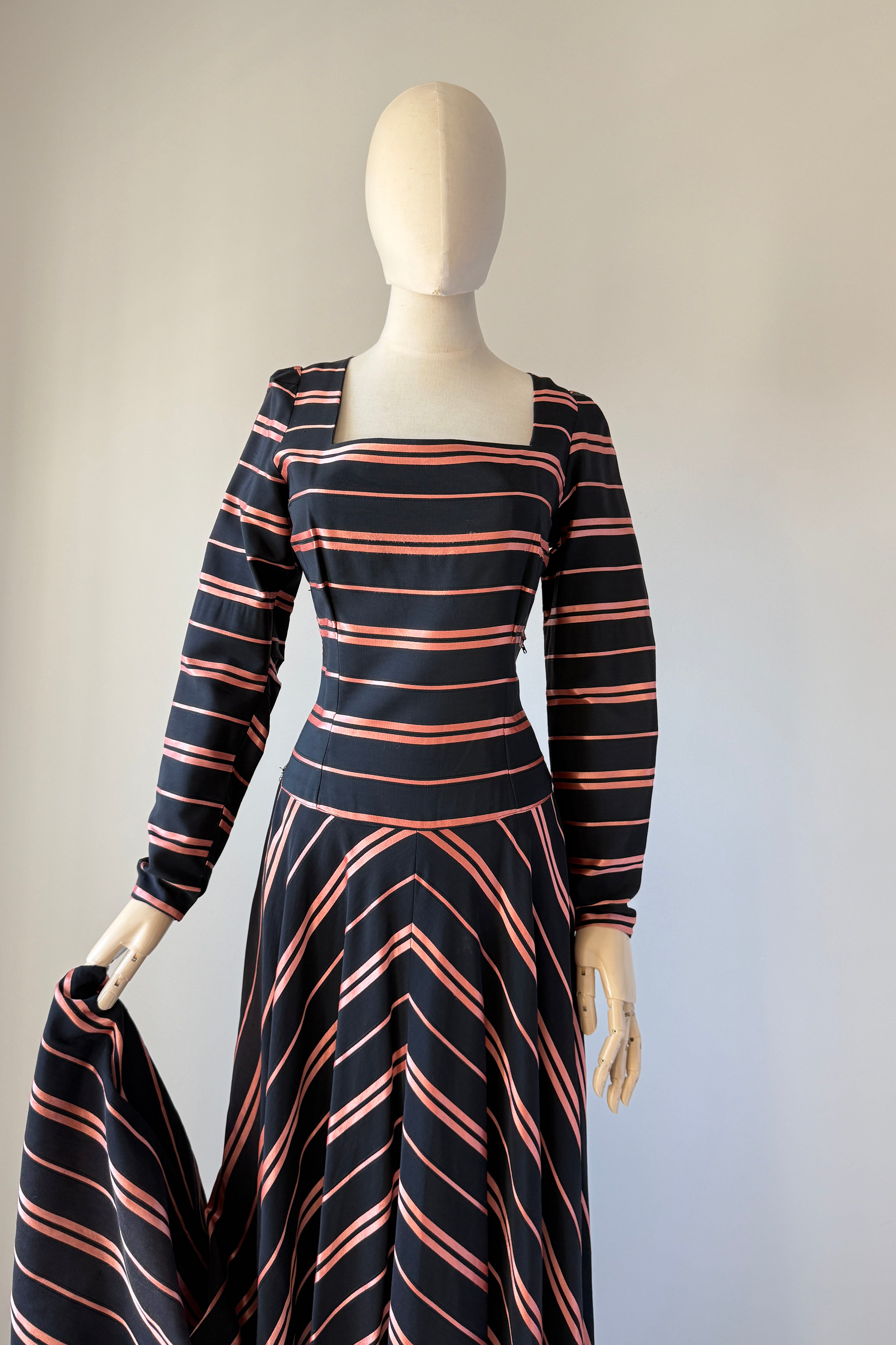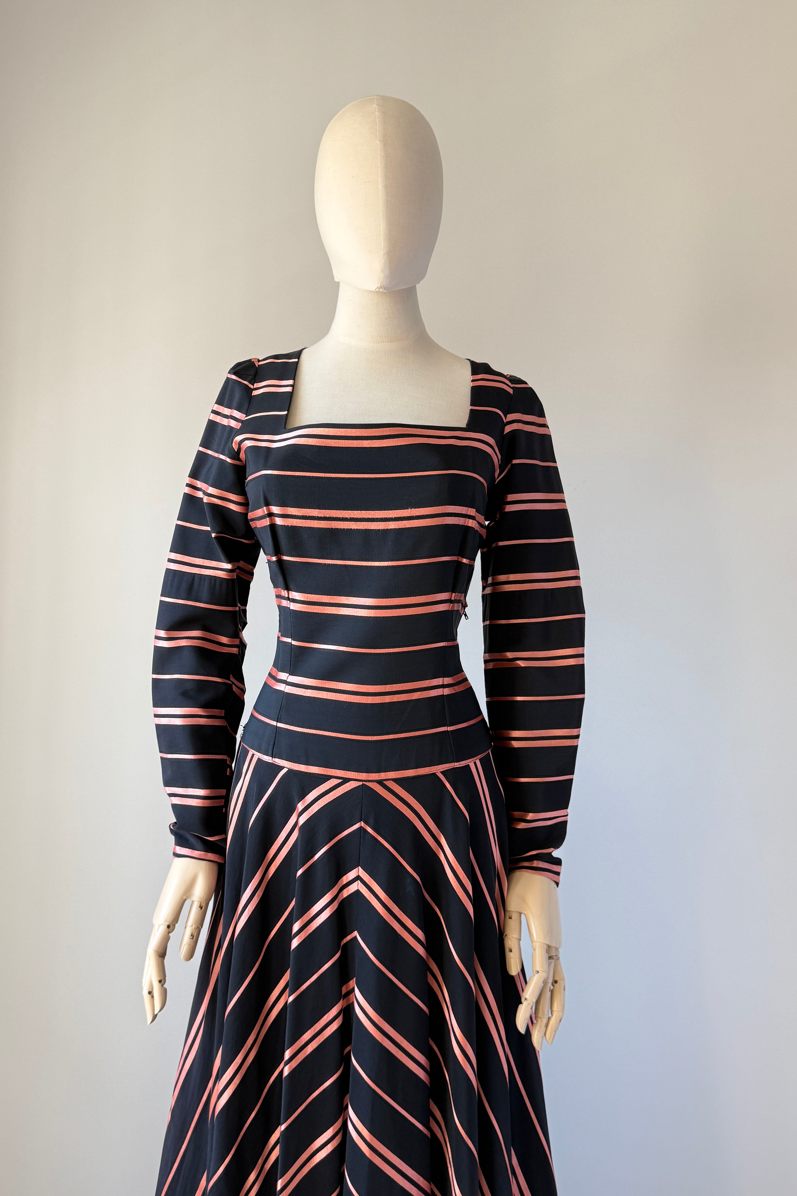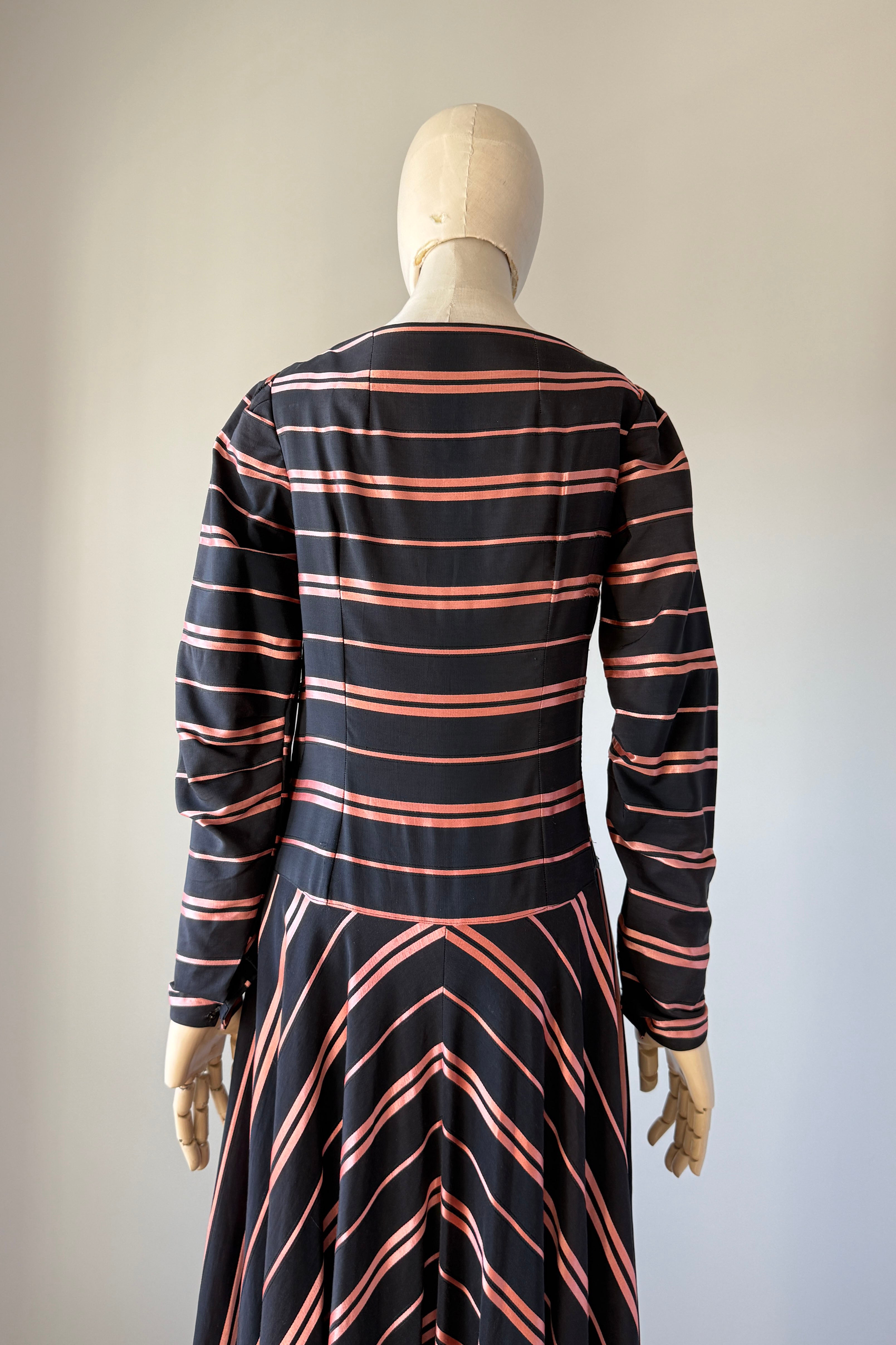 VINTAGE DRESSVintage 1940s black cotton faille dress. Features long sleeves with snaps, metal side zipper, full sweep skirt, long sleeves, square neckline, satin ribbon in striped pattern. Good condition. Satin ribbon is shattering in some places. Ghost stitching at right bodice where an alteration has been let out.Fits like xs/s.Length 57 Bodice 16Bust 36Waist 28Shoulder 15Sleeve 24As with all vintage, please expect wear consistent with age. All sales are final. No order cancellations.6576 | 2606
