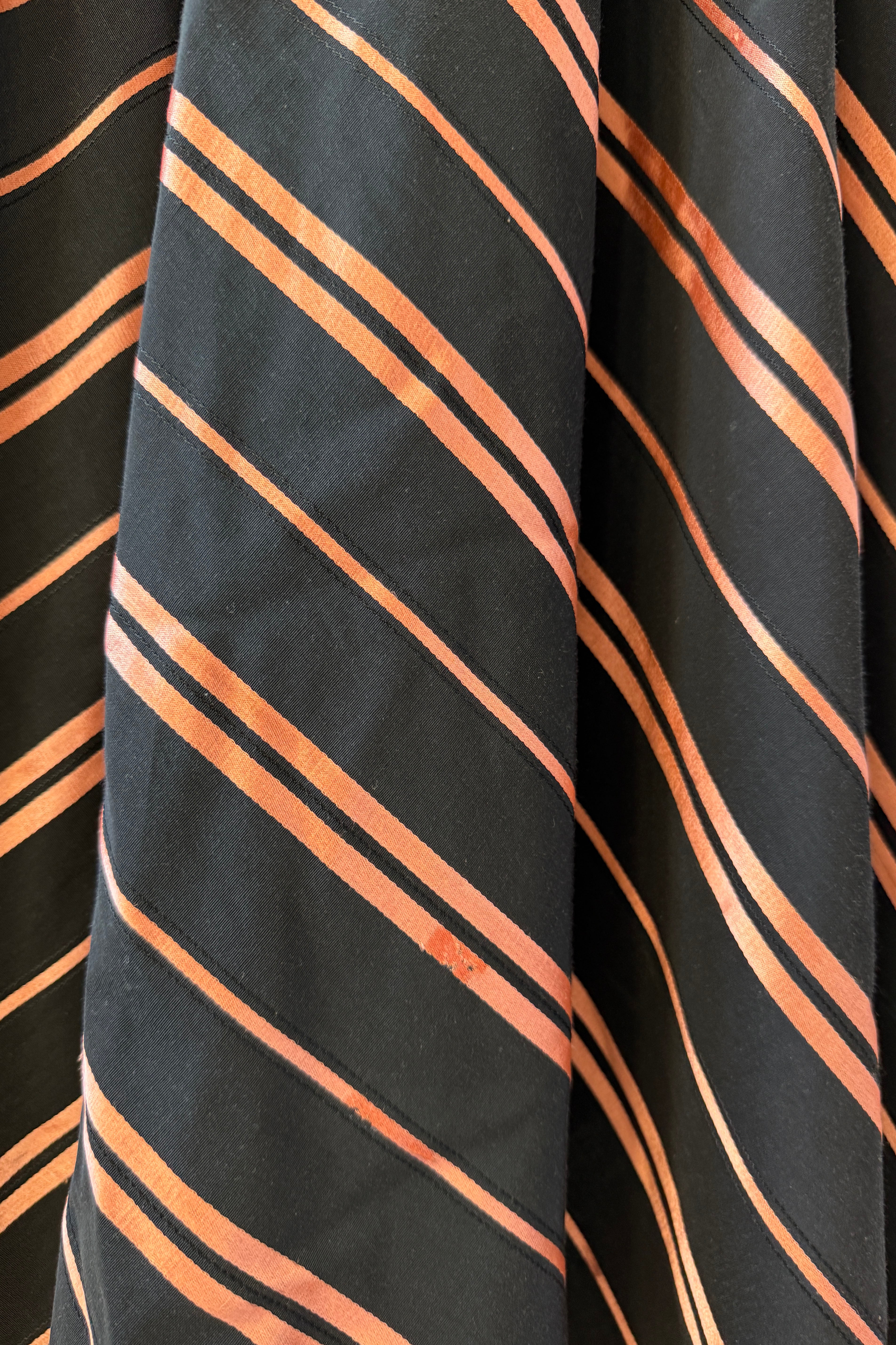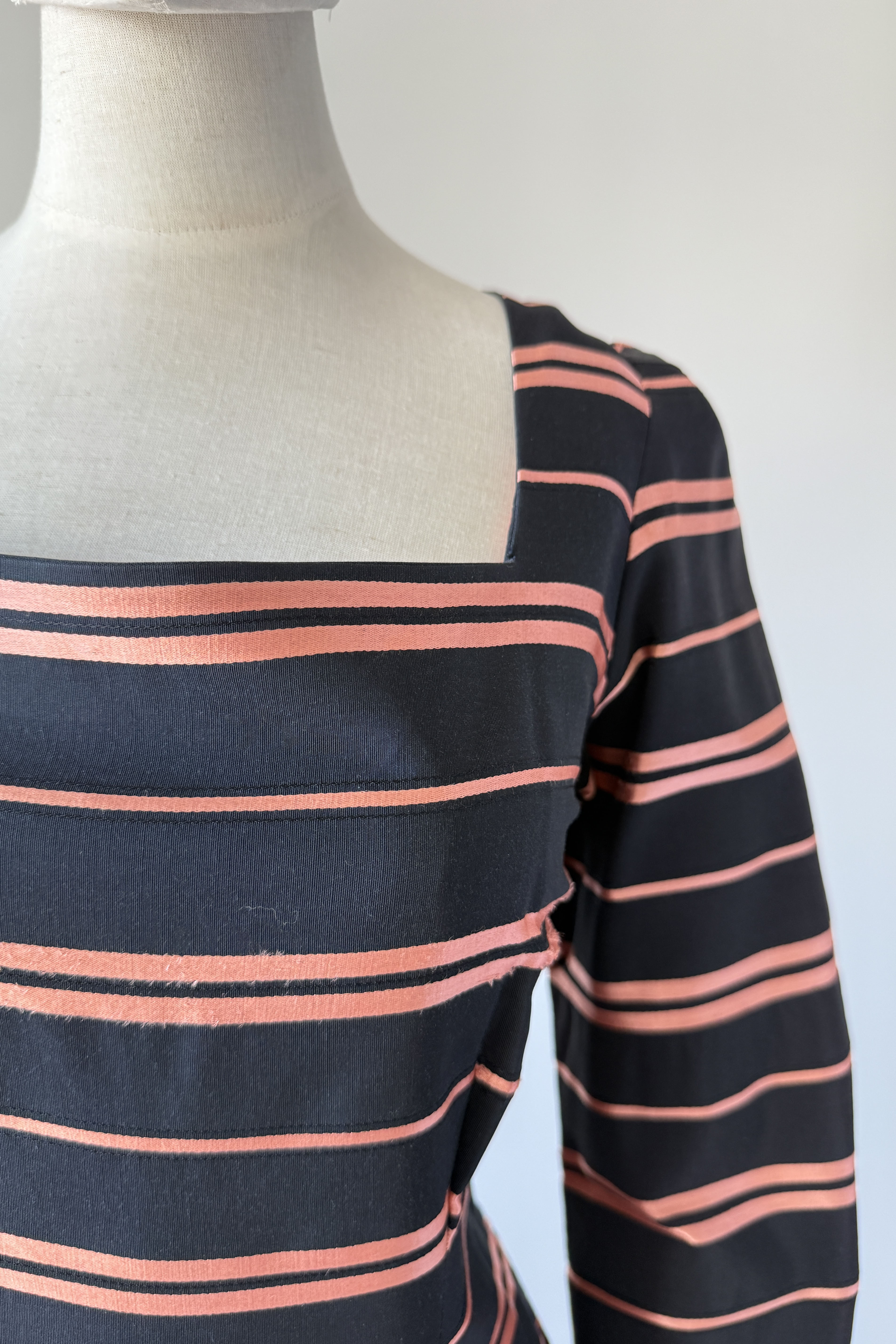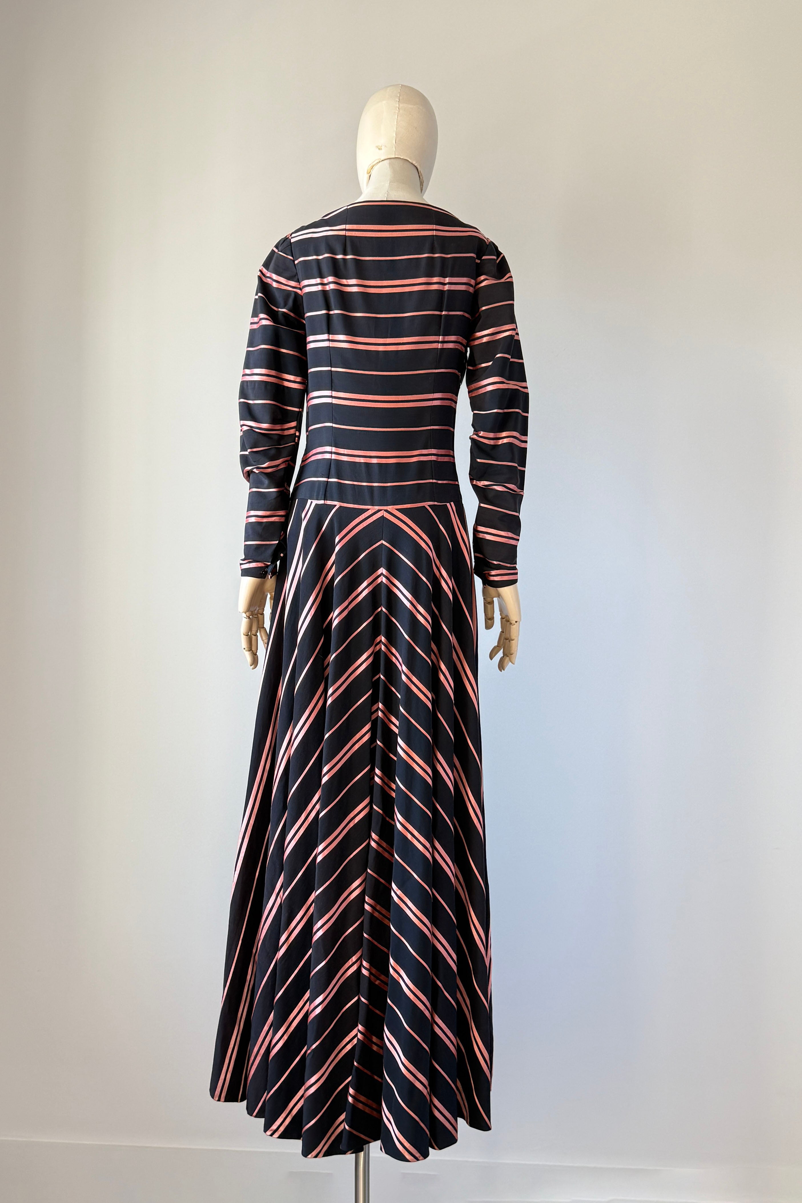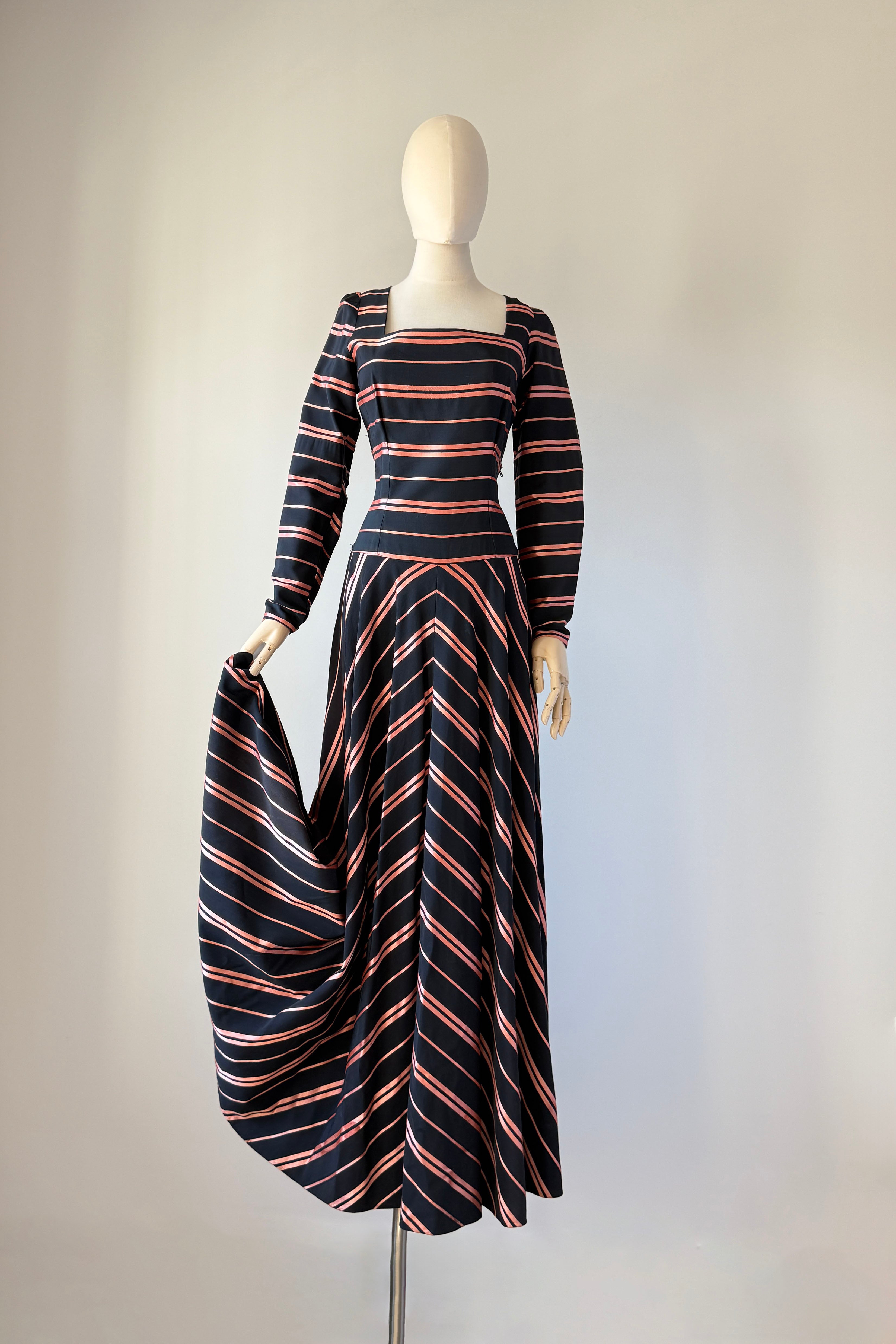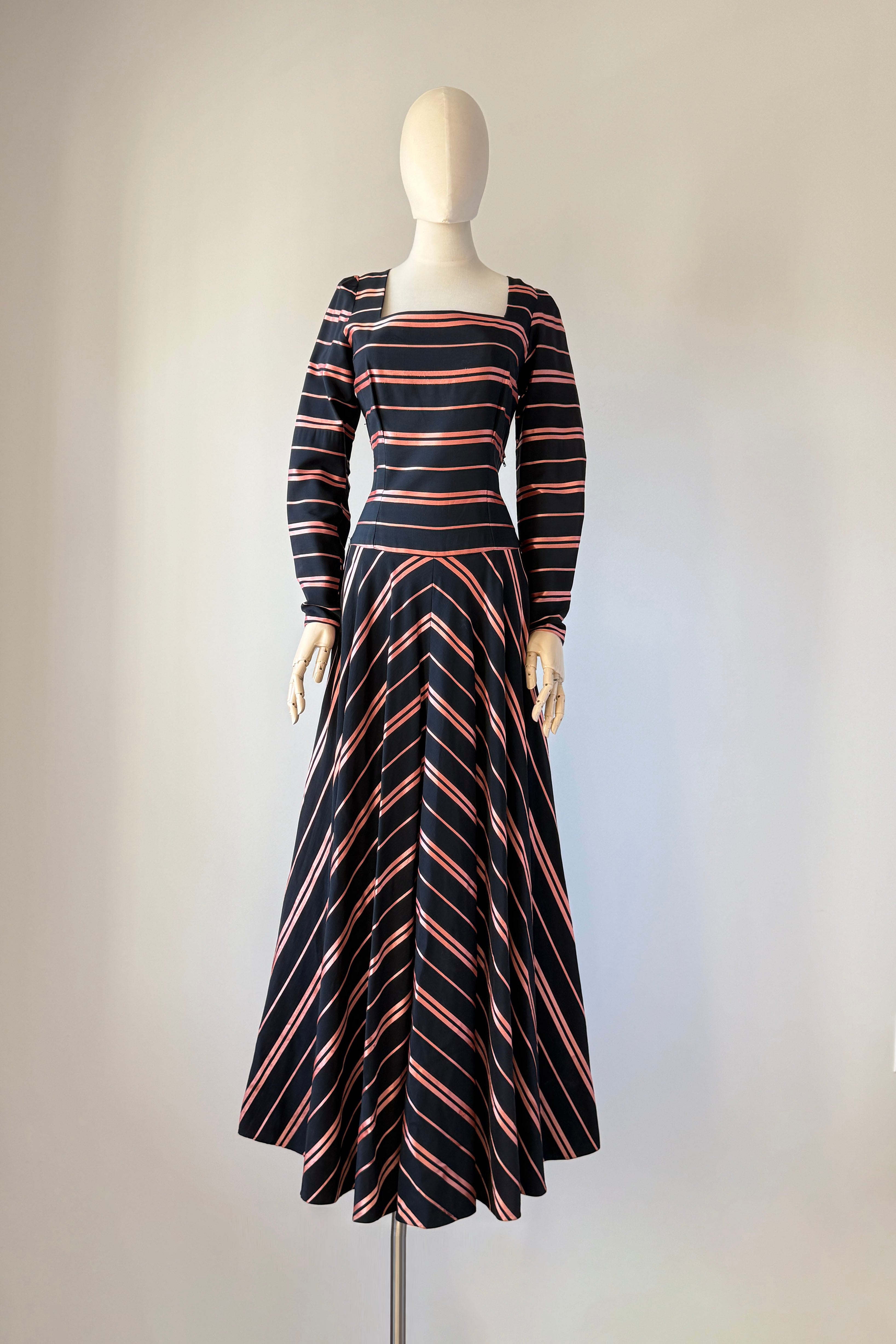 VINTAGE DRESSVintage 1940s black cotton faille dress. Features long sleeves with snaps, metal side zipper, full sweep skirt, long sleeves, square neckline, satin ribbon in striped pattern. Good condition. Satin ribbon is shattering in some places. Ghost stitching at right bodice where an alteration has been let out.Fits like xs/s.Length 57 Bodice 16Bust 36Waist 28Shoulder 15Sleeve 24As with all vintage, please expect wear consistent with age. All sales are final. No order cancellations.6576 | 2606