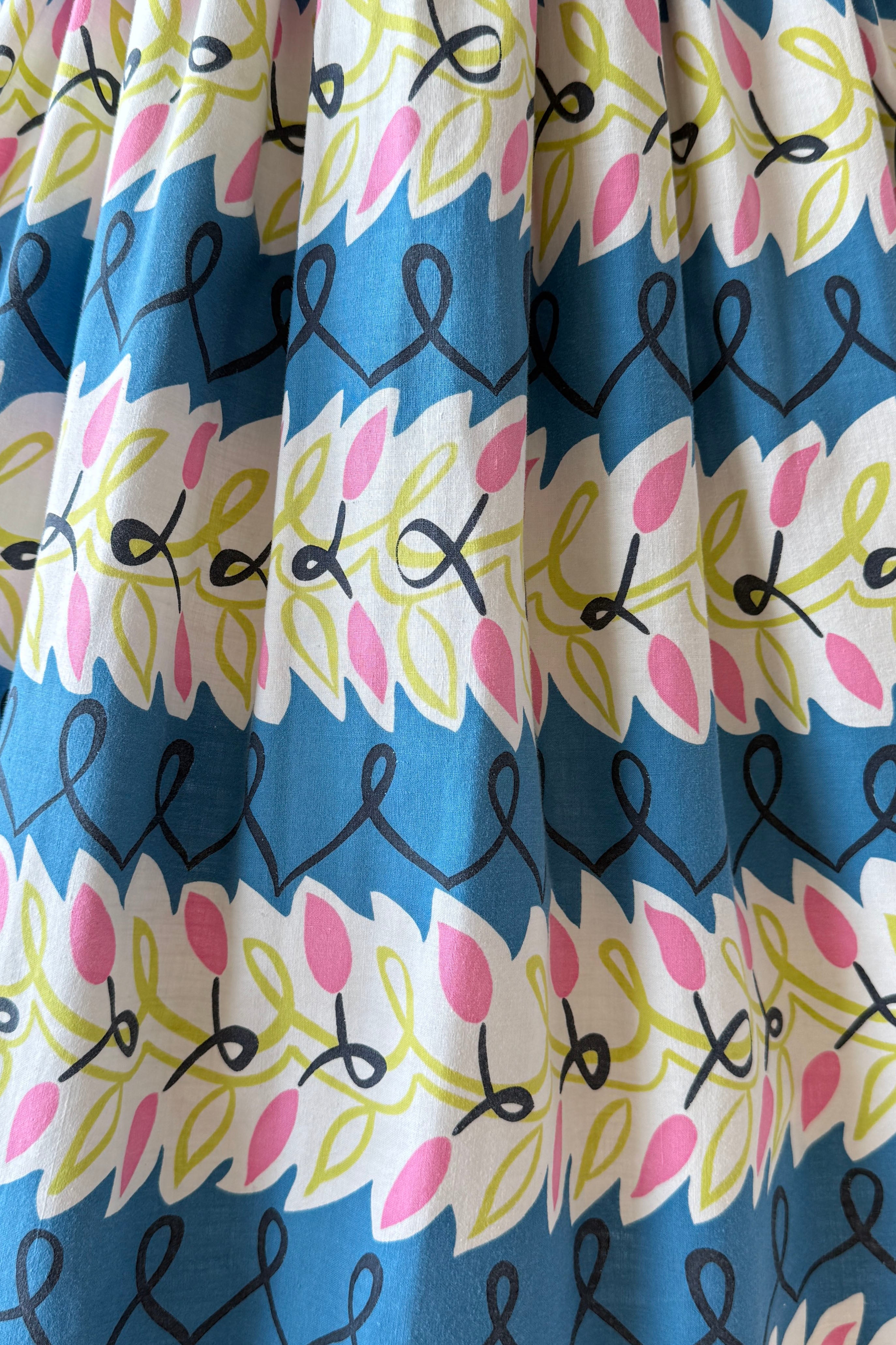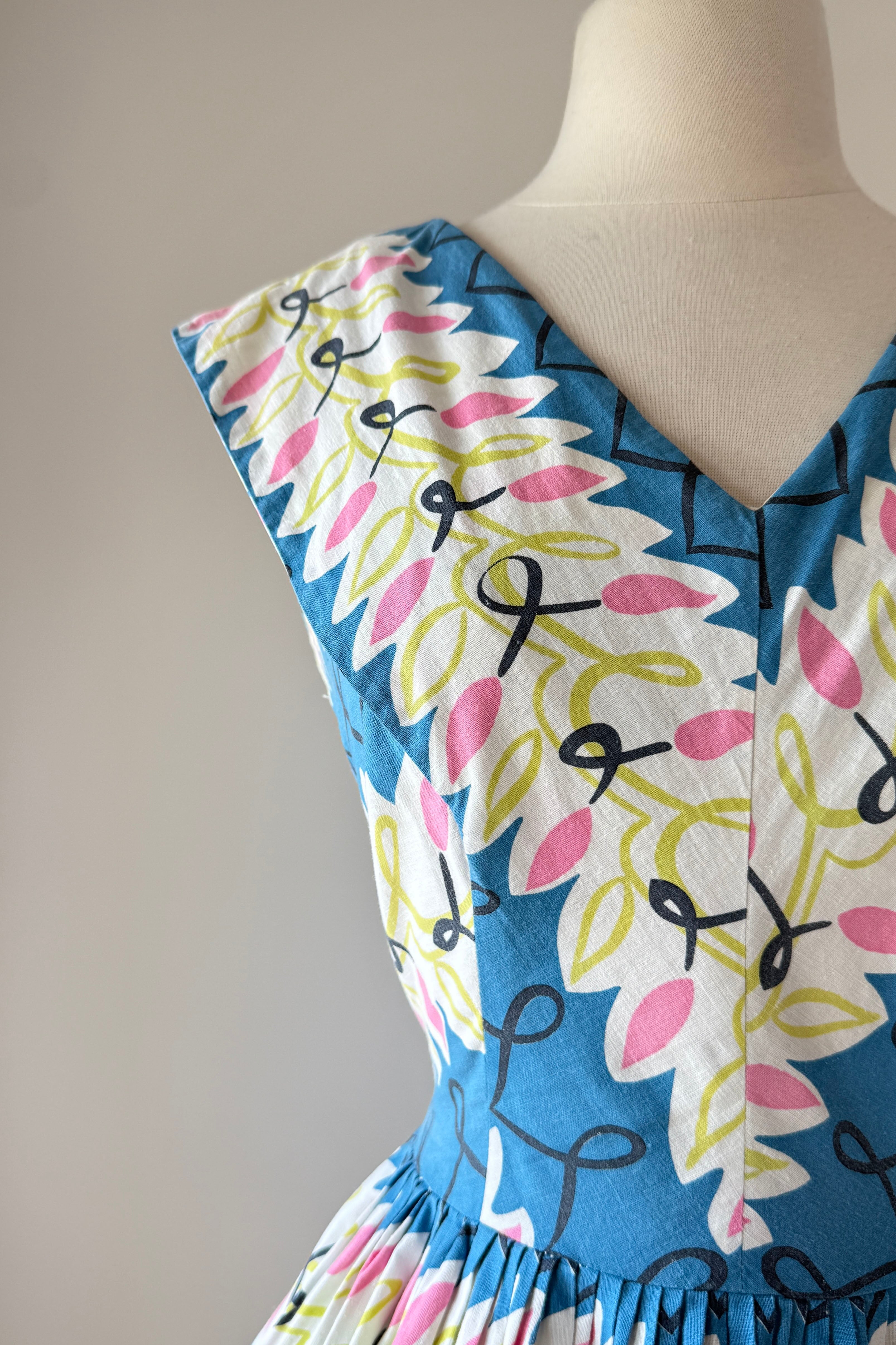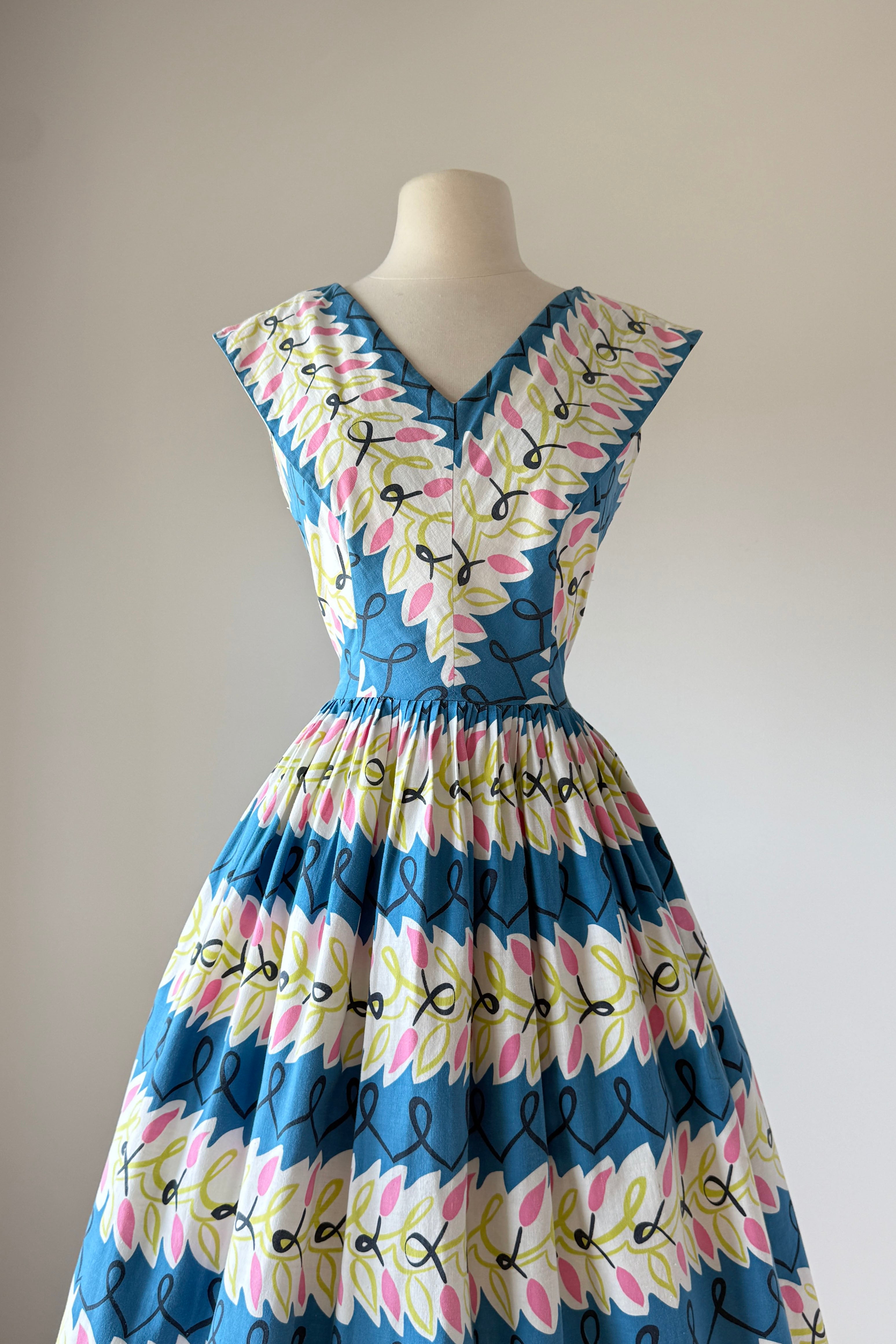 Vintage 1950s dress. Features bright blue background with whimsical pink rosebud print, metal side zipper closure. Cotton. By Reybro Model