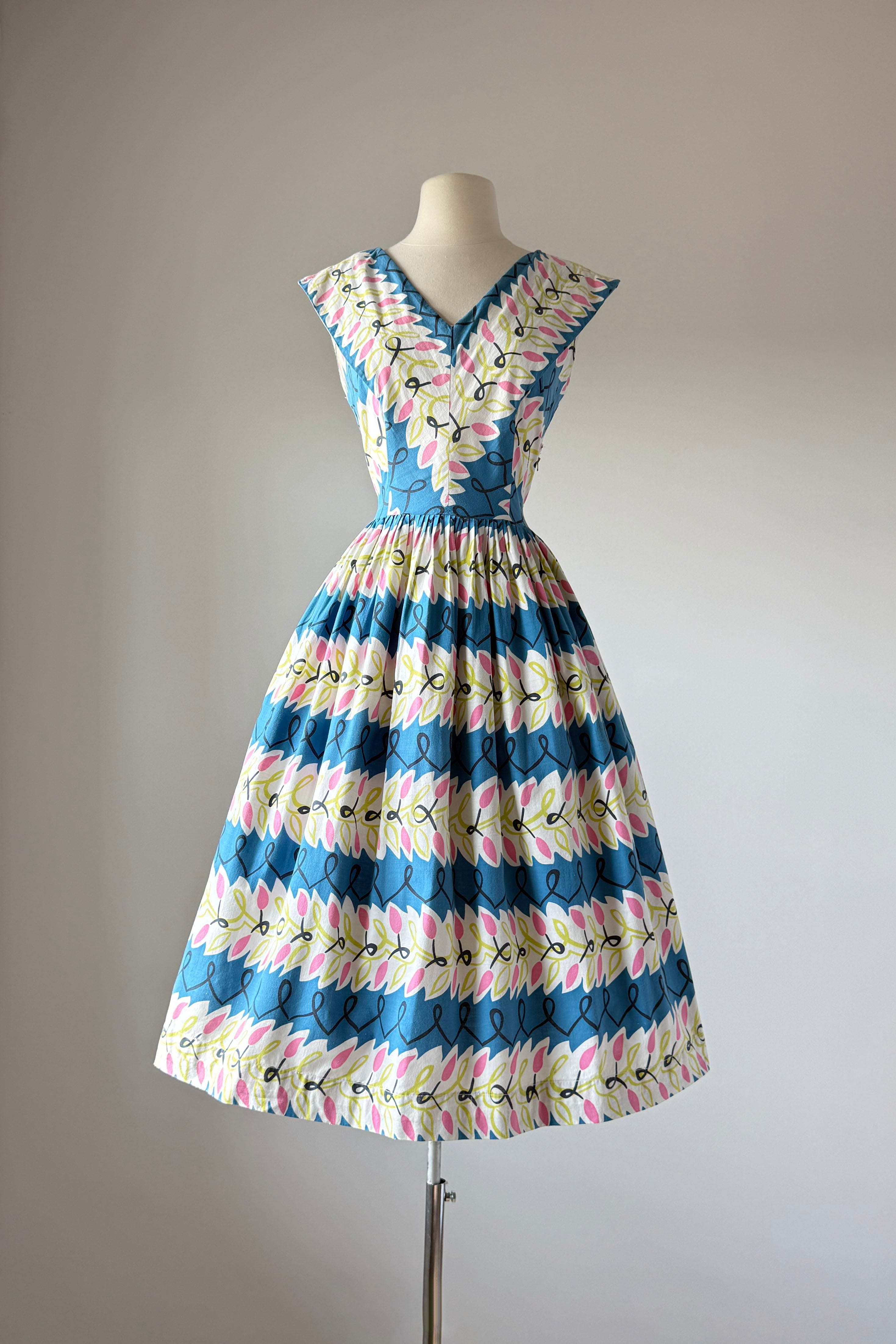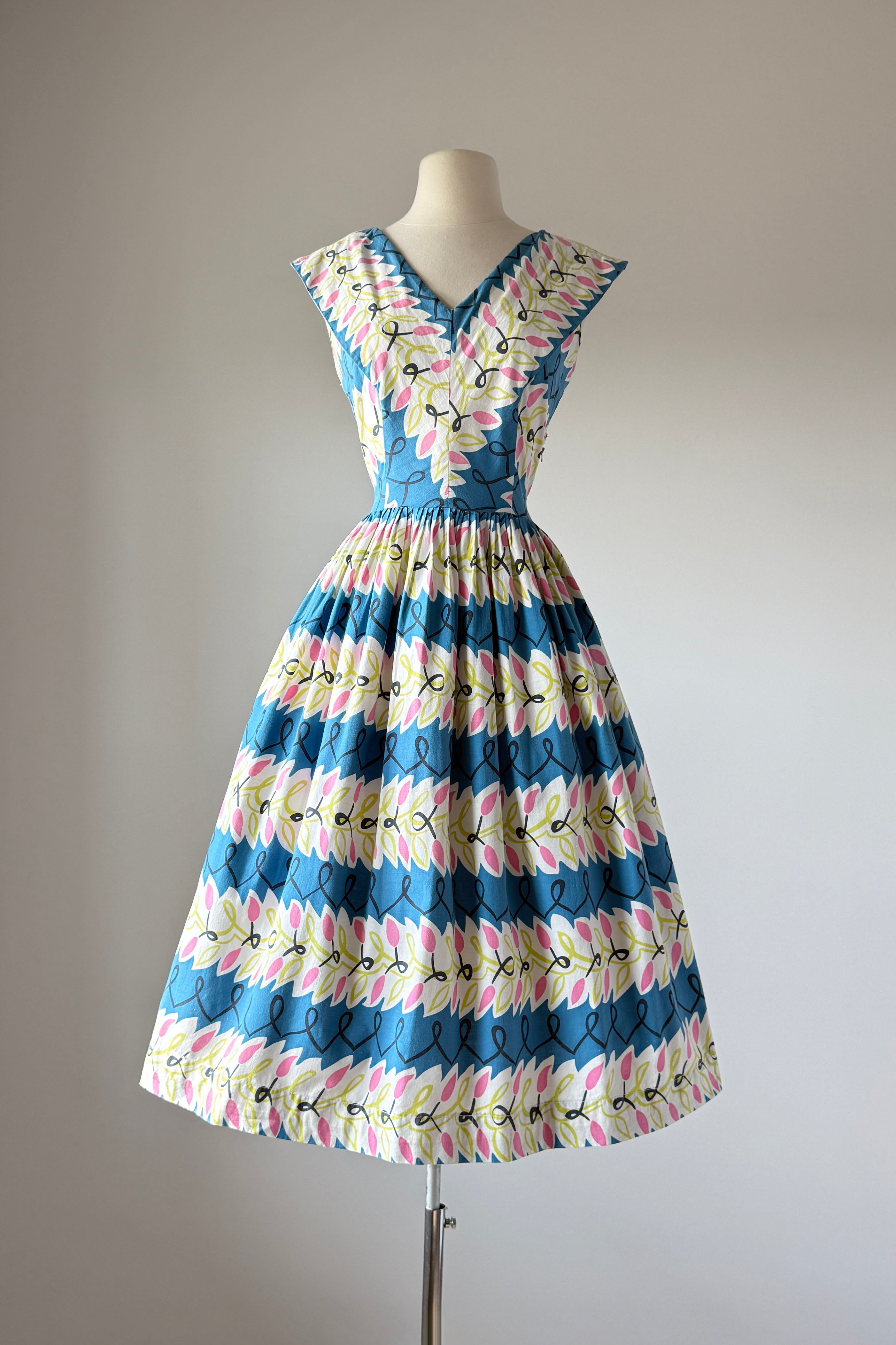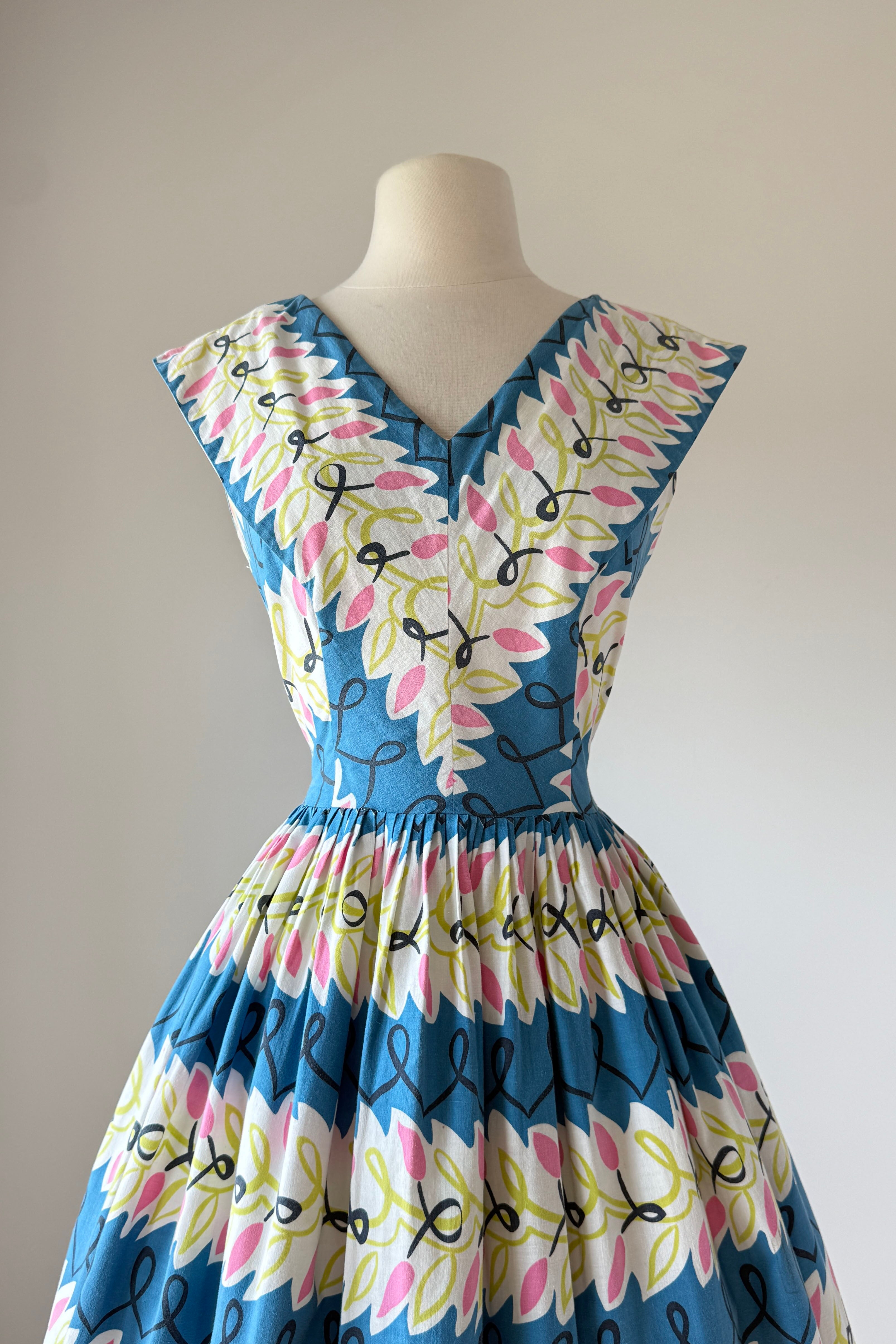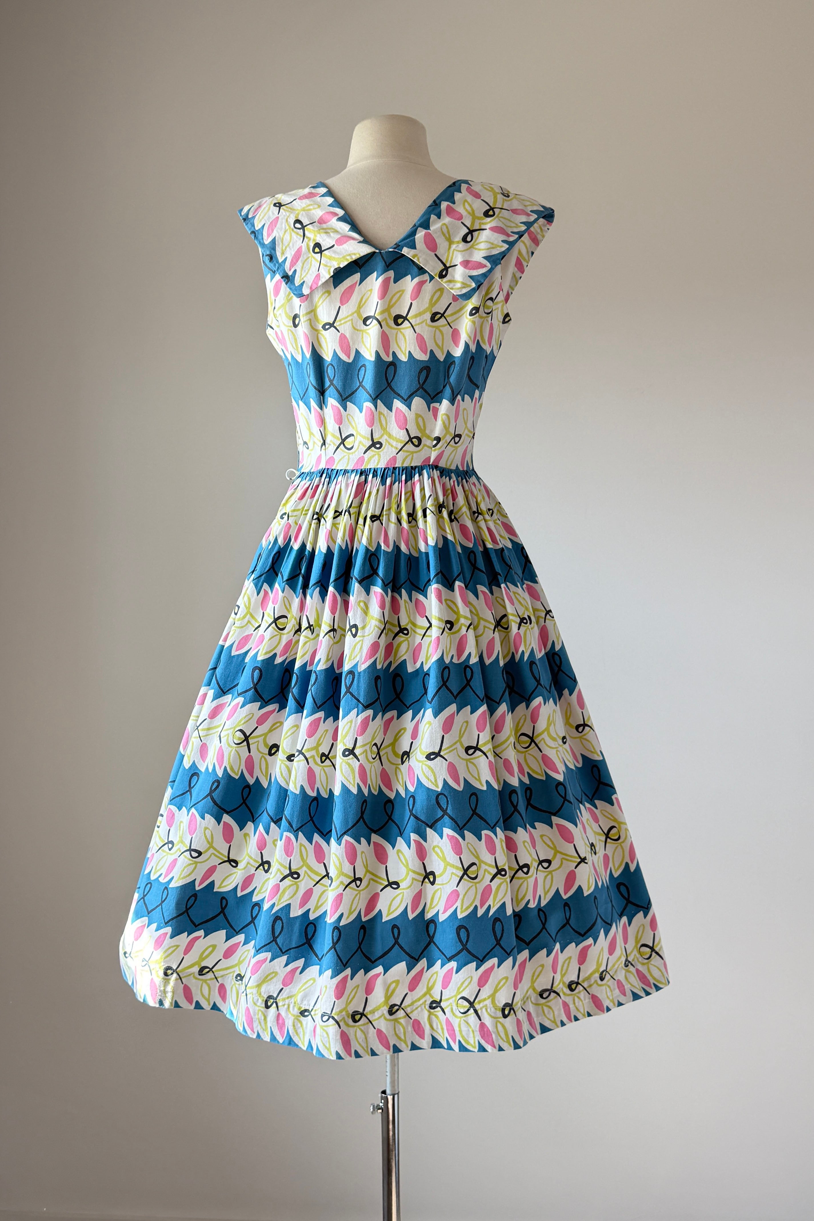 Vintage 1950s dress. Features bright blue background with whimsical pink rosebud print, metal side zipper closure. Cotton. By Reybro Model