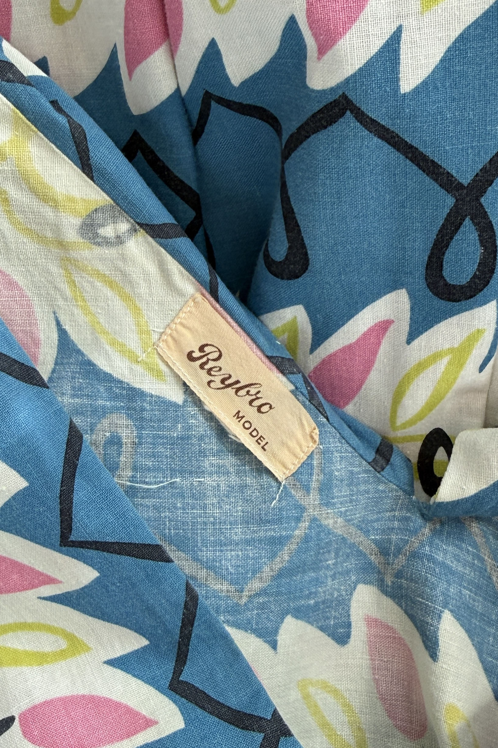 Vintage 1950s Blue Pink Rosebud Print Dress by Reybro Model | S/M
