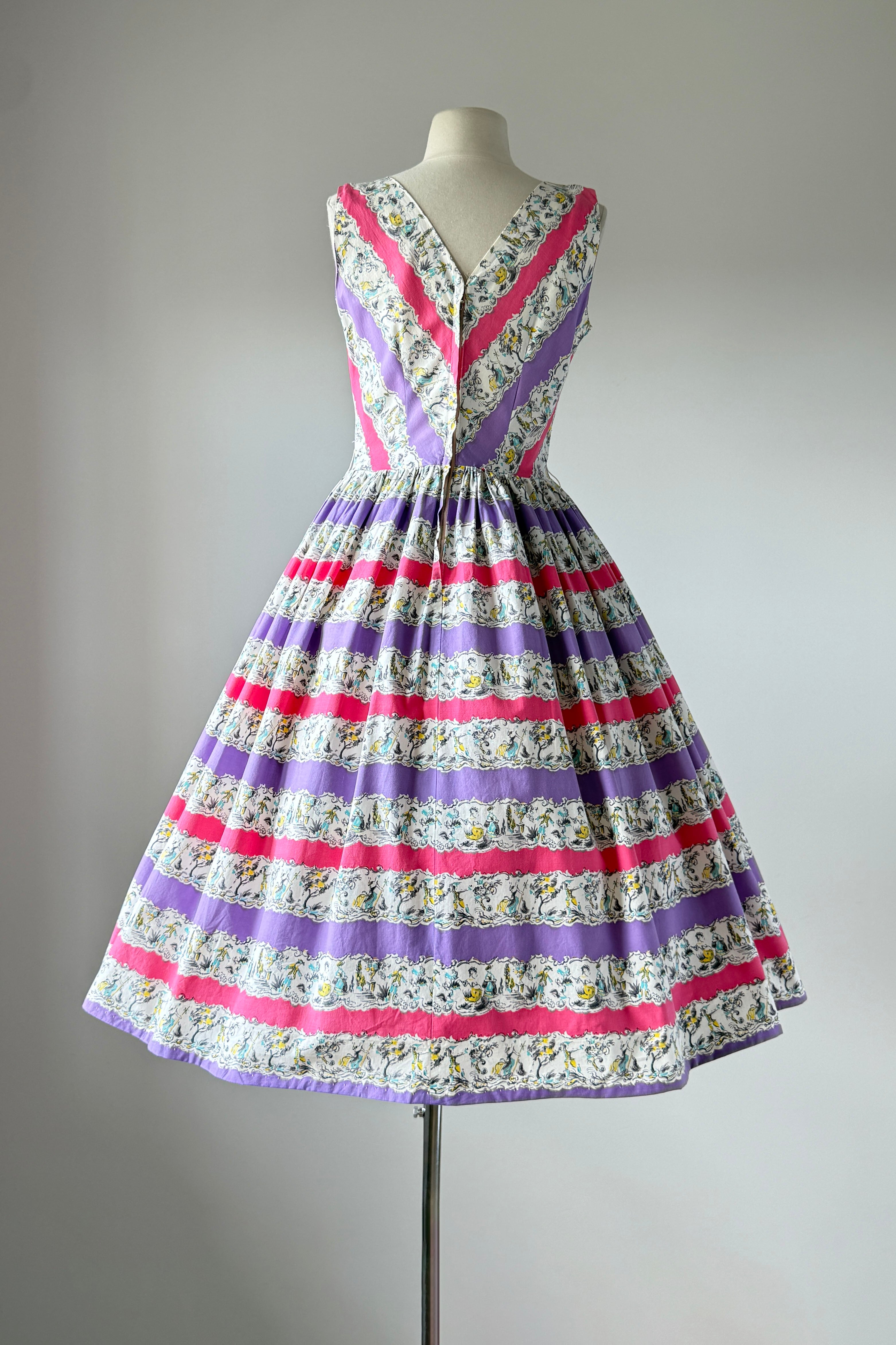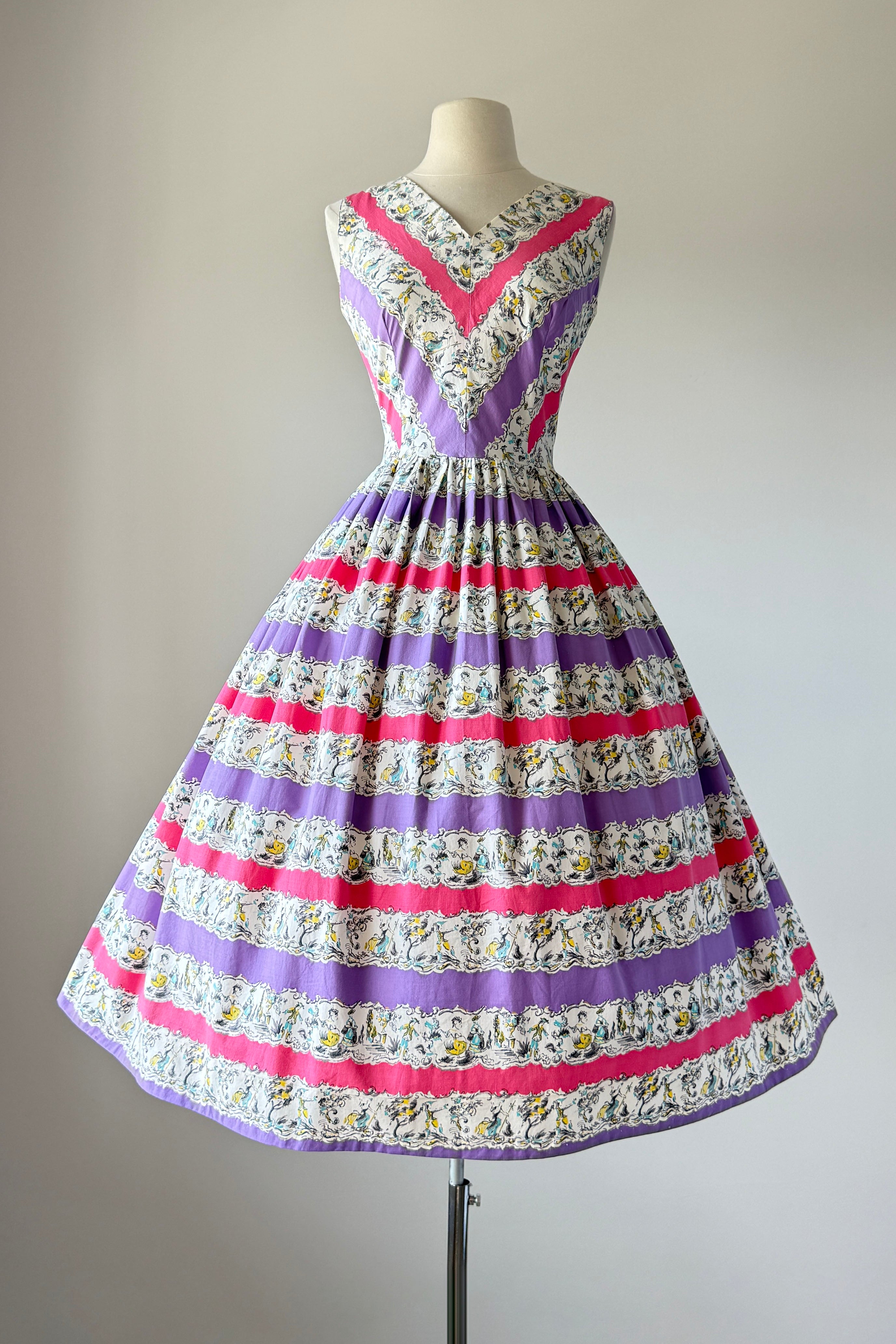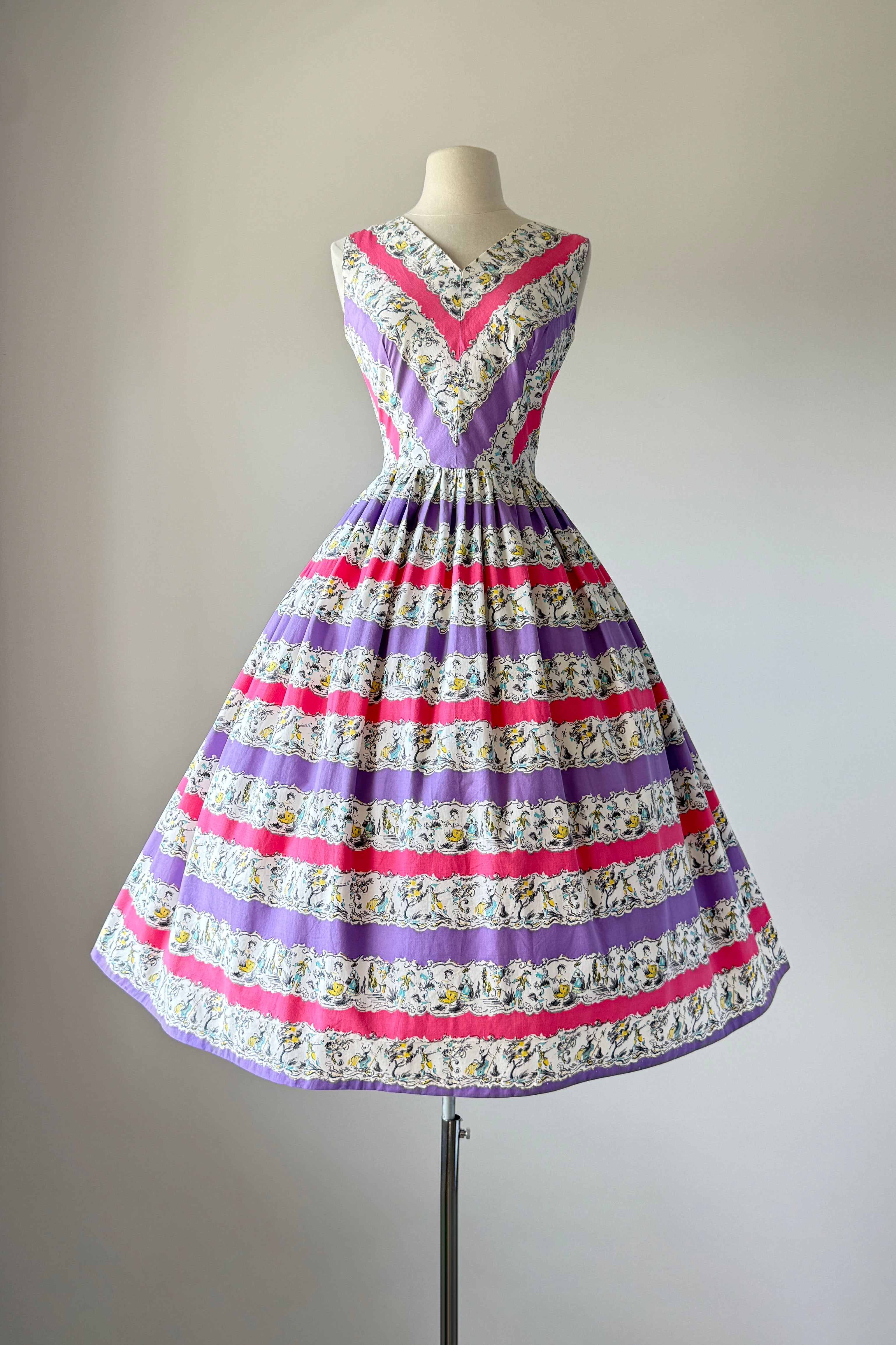 Vintage 1950s dress. Features alternating horizontal repeat pattern of garden party dancing scene. Metal back zipper. Cotton.