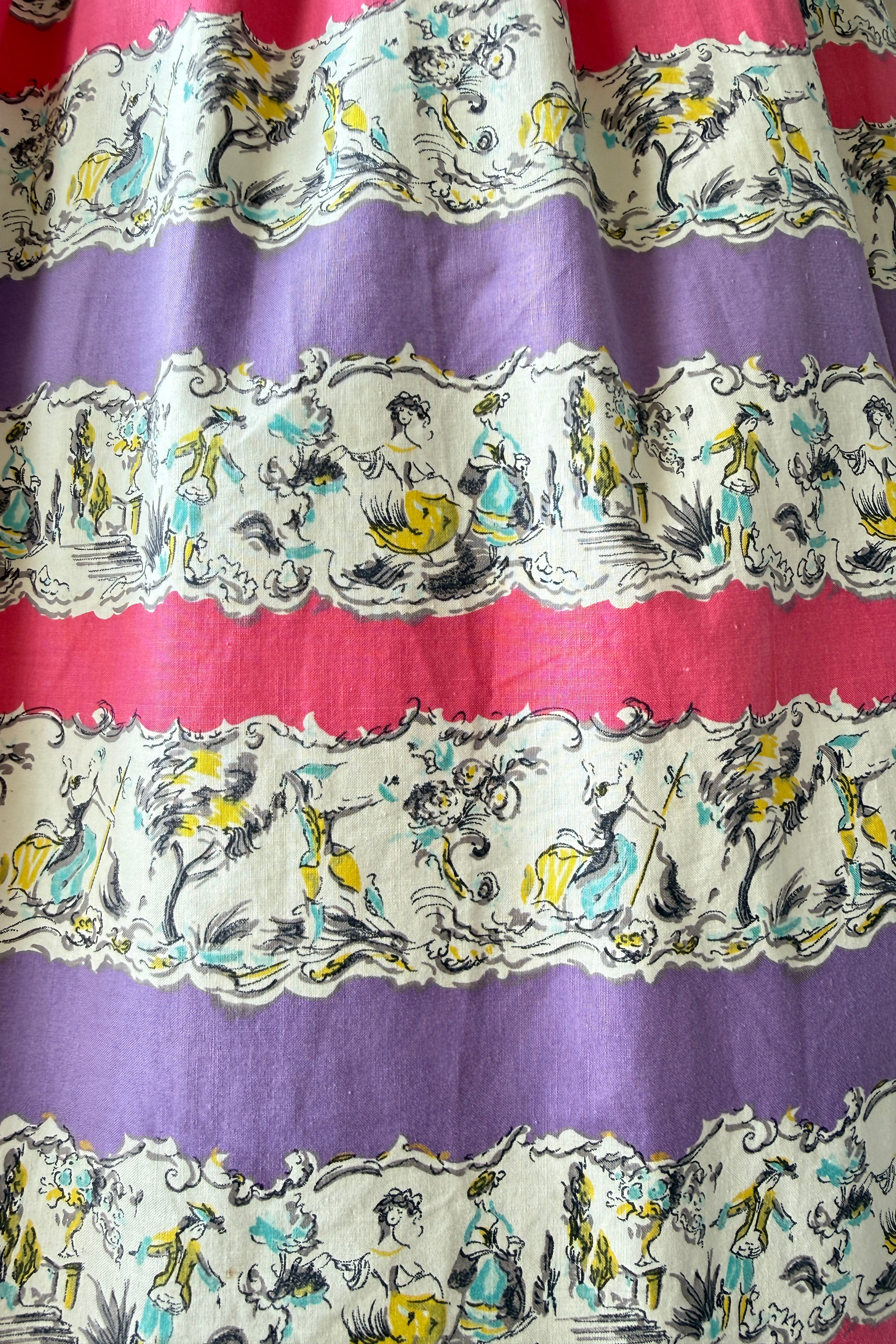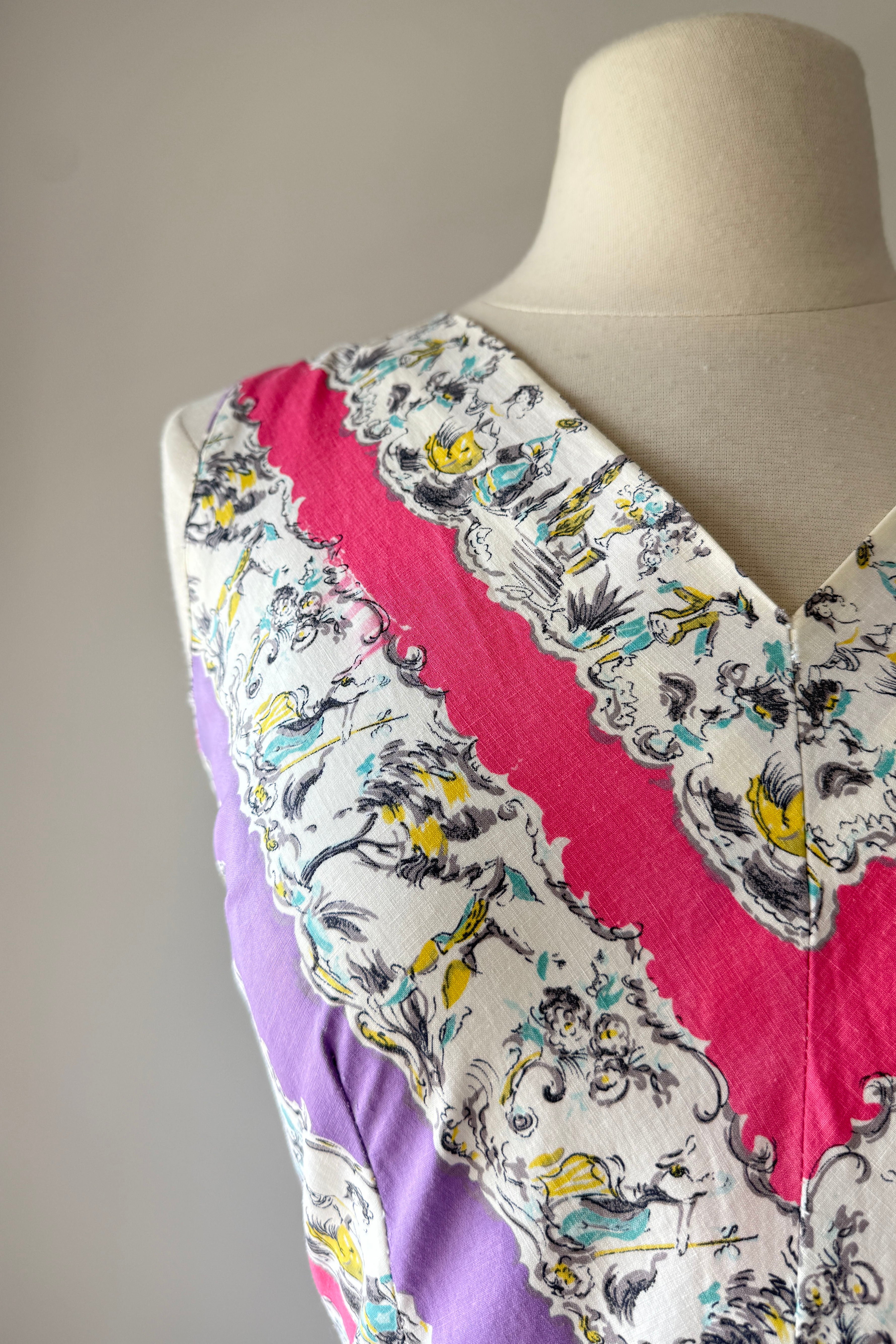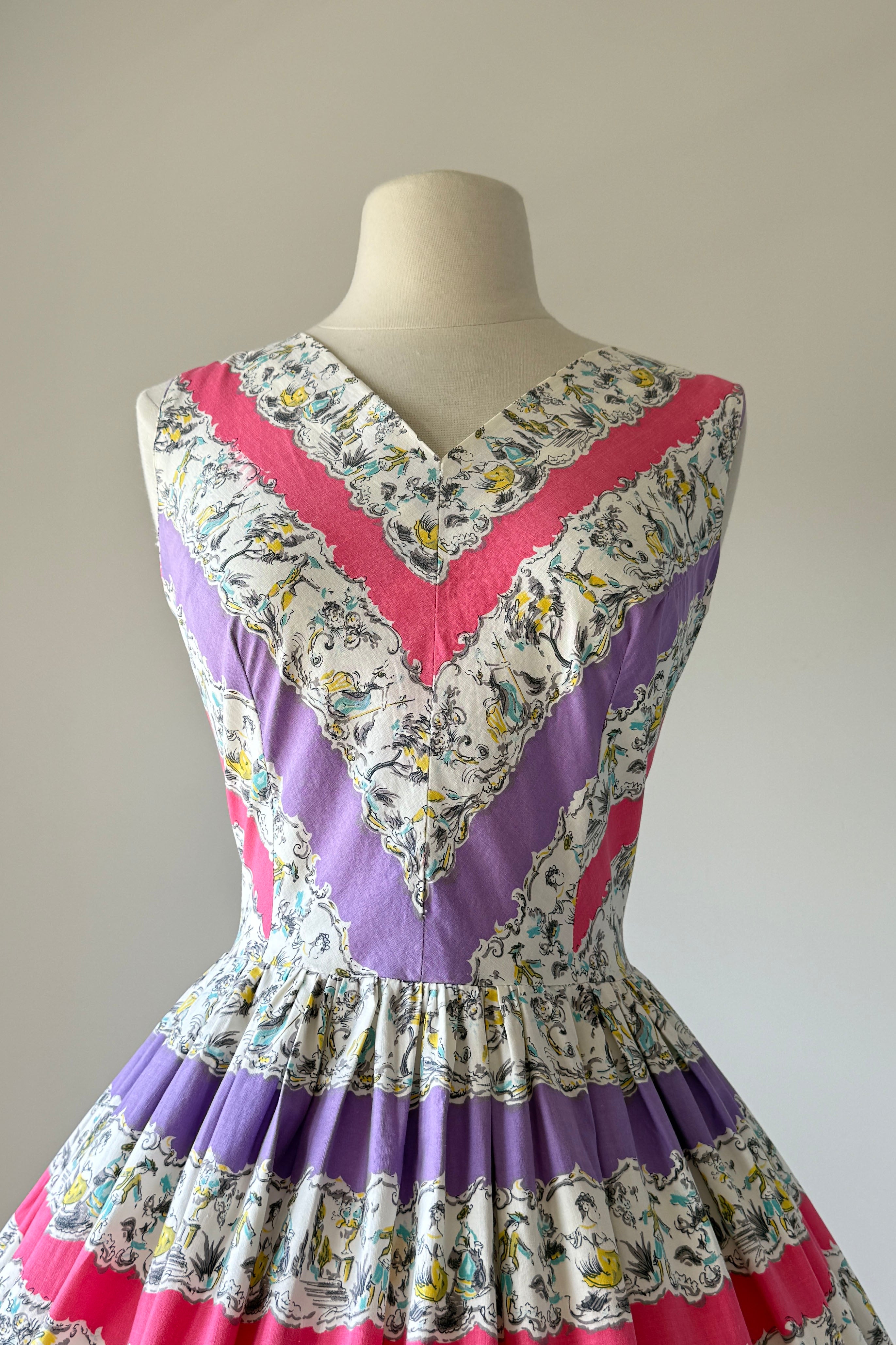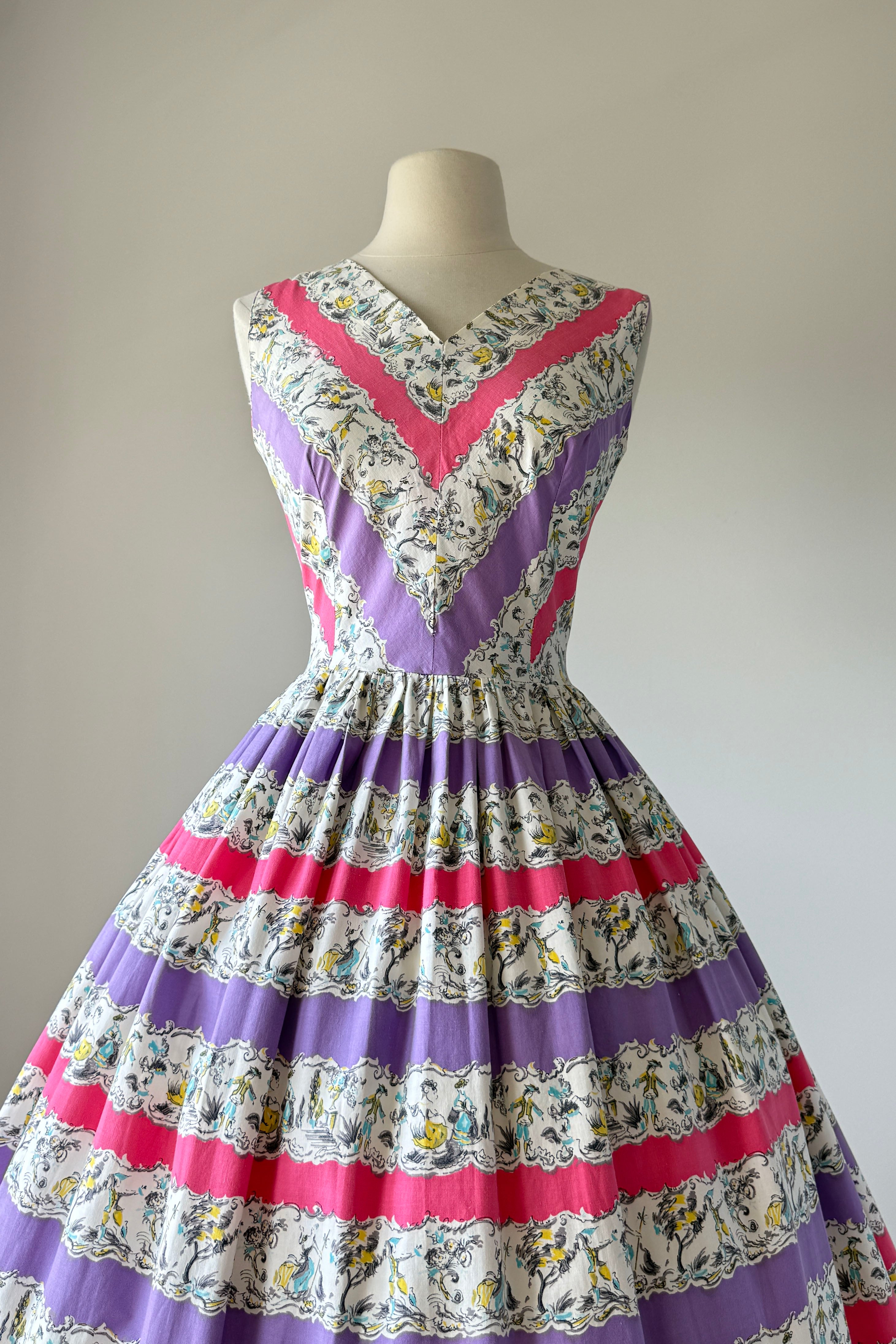 Vintage 1950s dress. Features alternating horizontal repeat pattern of garden party dancing scene. Metal back zipper. Cotton.