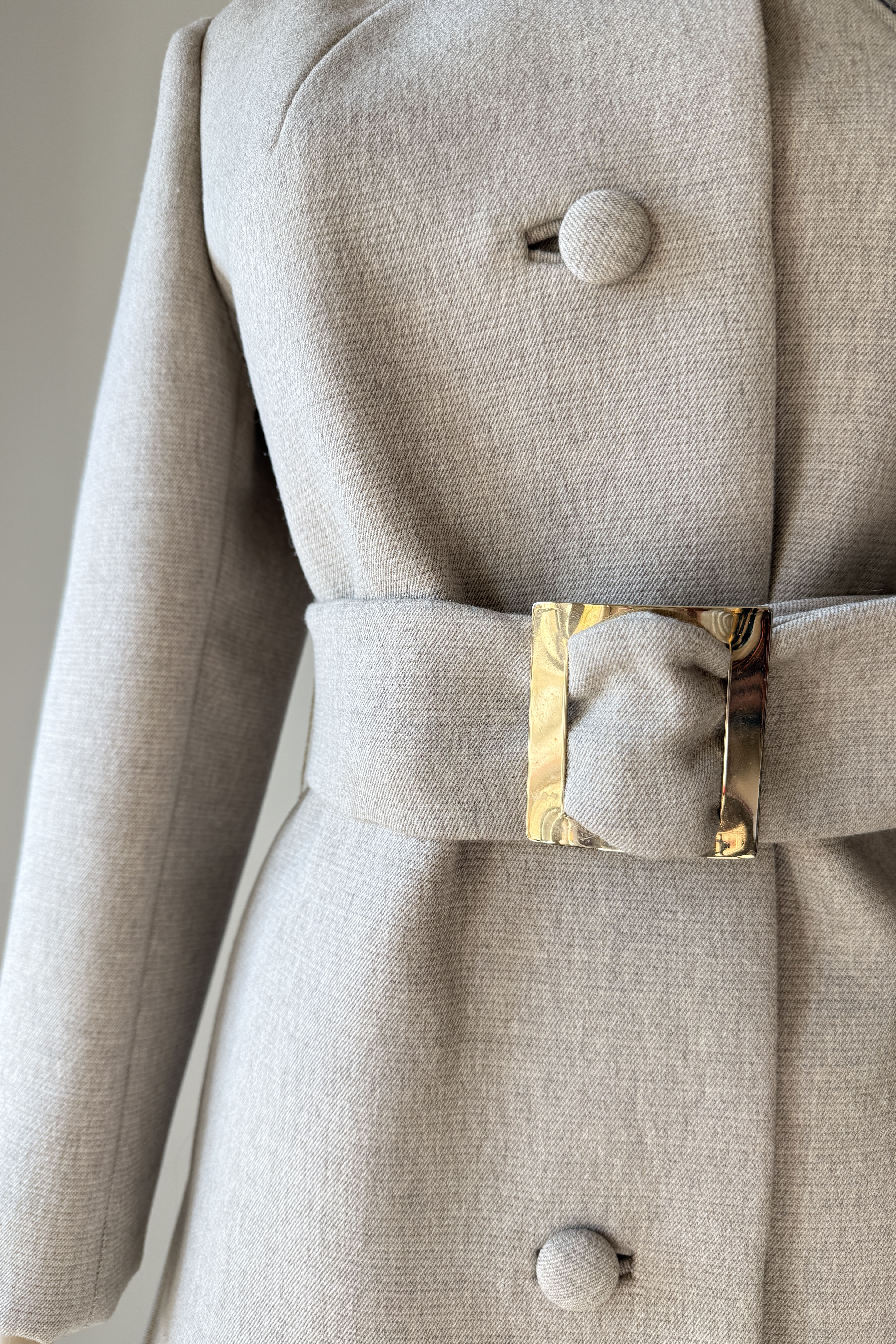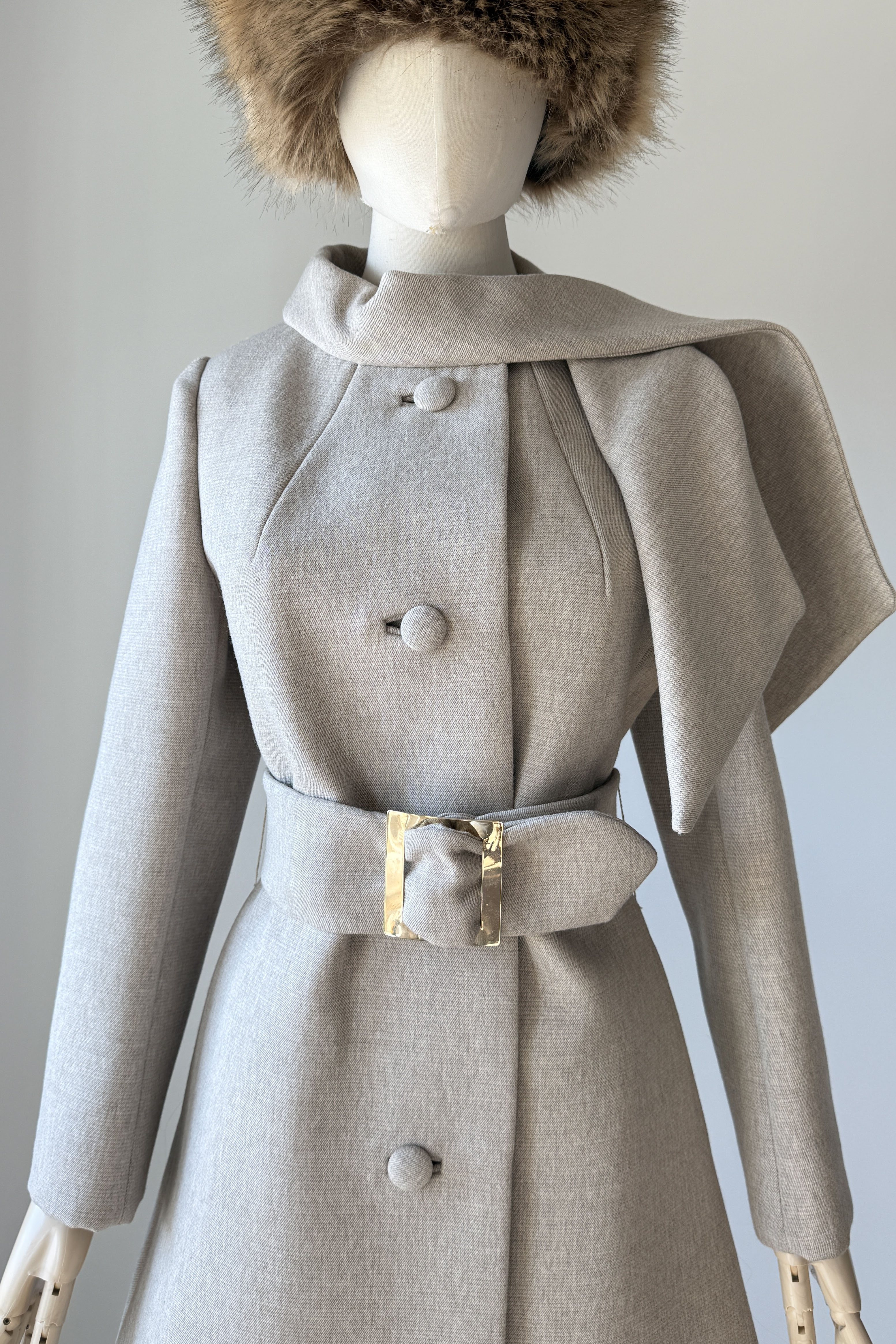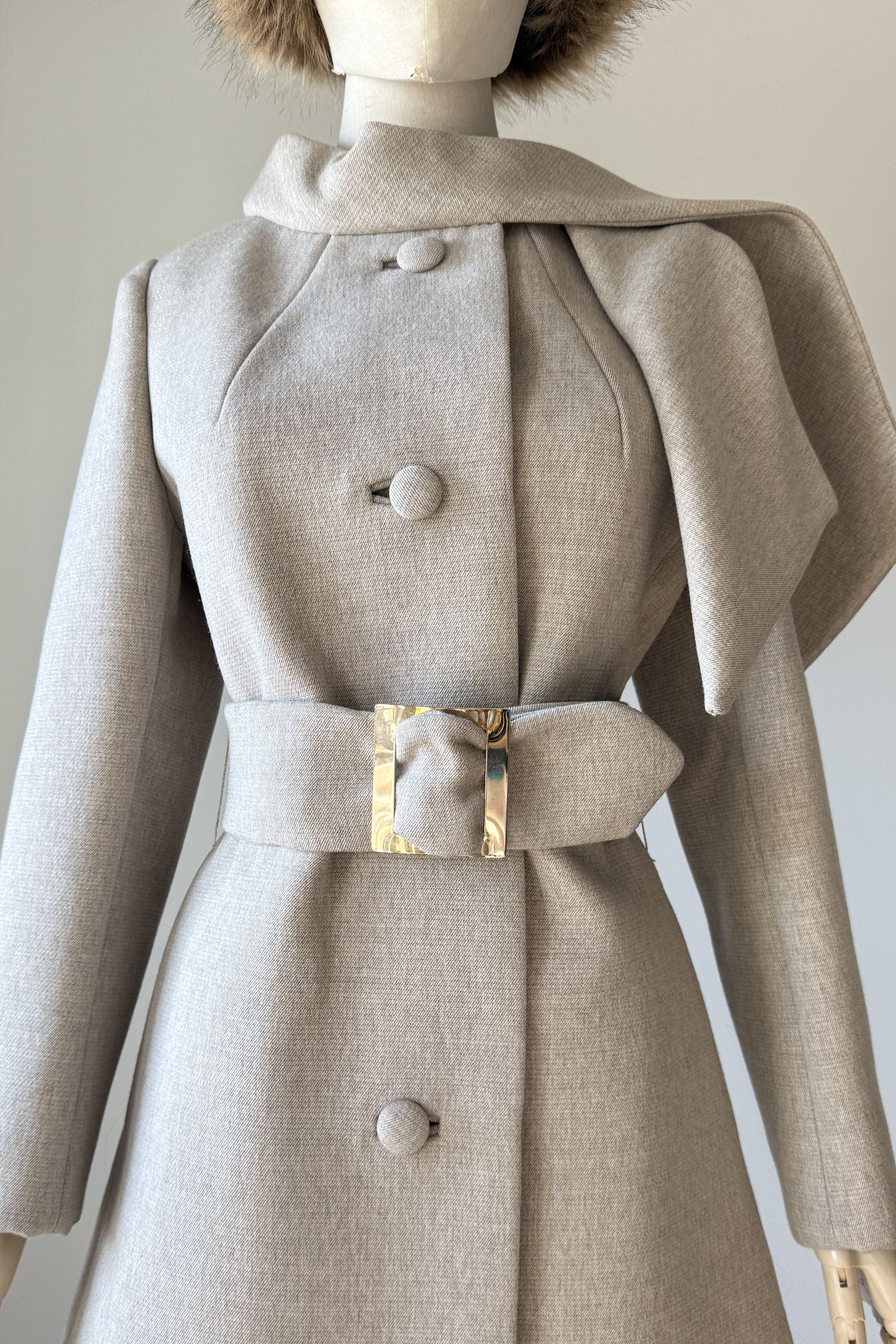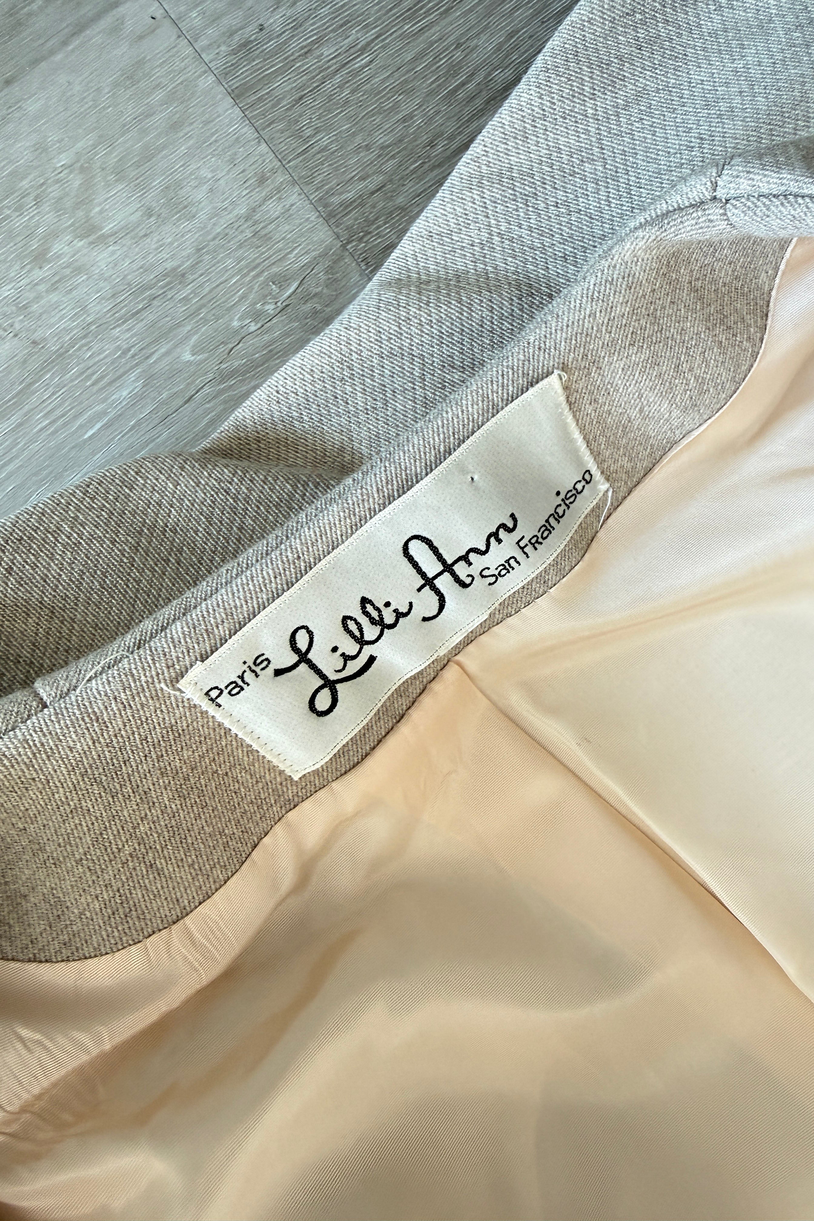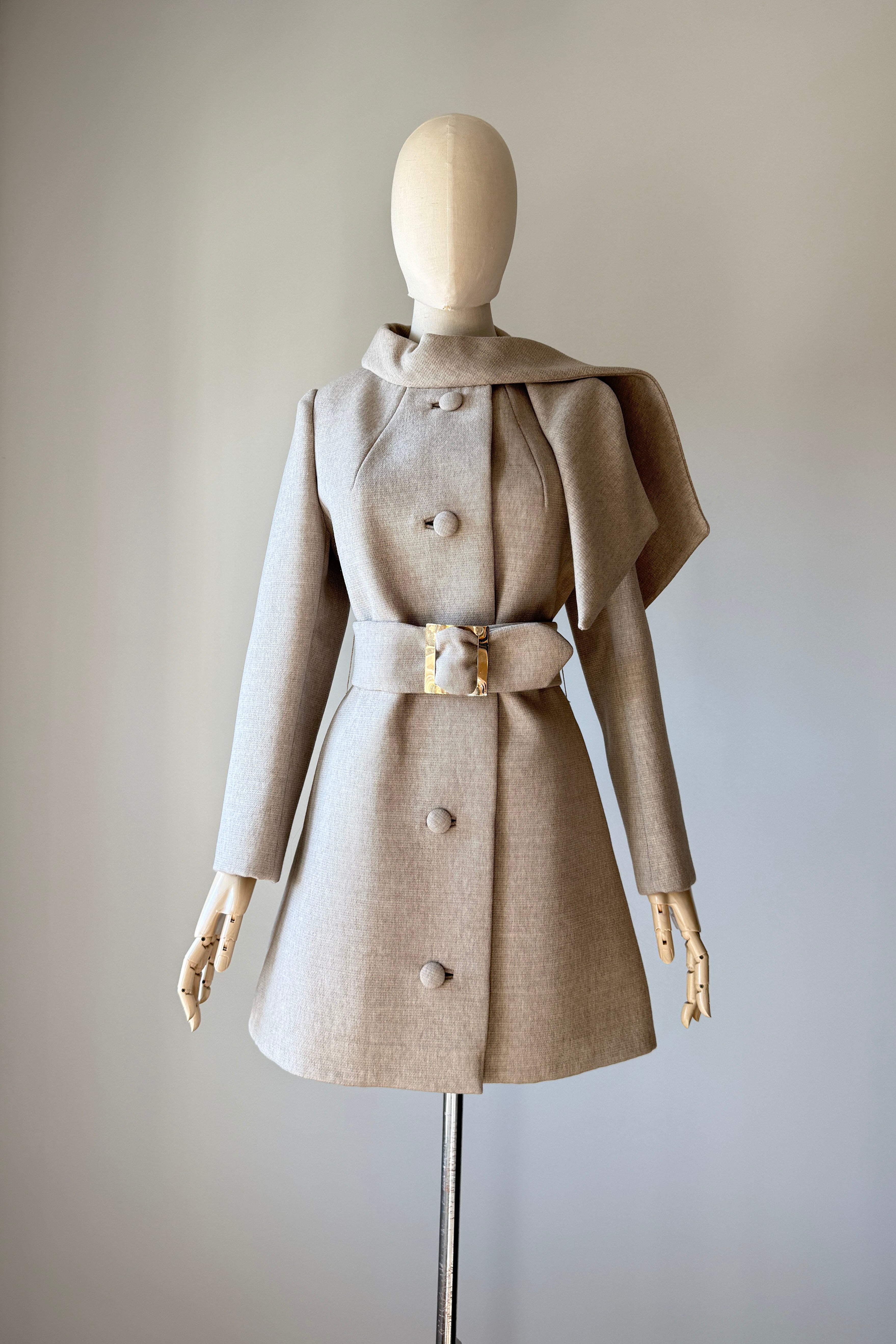 Vintage 1960s coat by Lilli Ann. Features taupe wool, covered buttons, besom pockets, scarf collar with snap closure, acetate lining, adjustable wide belt.