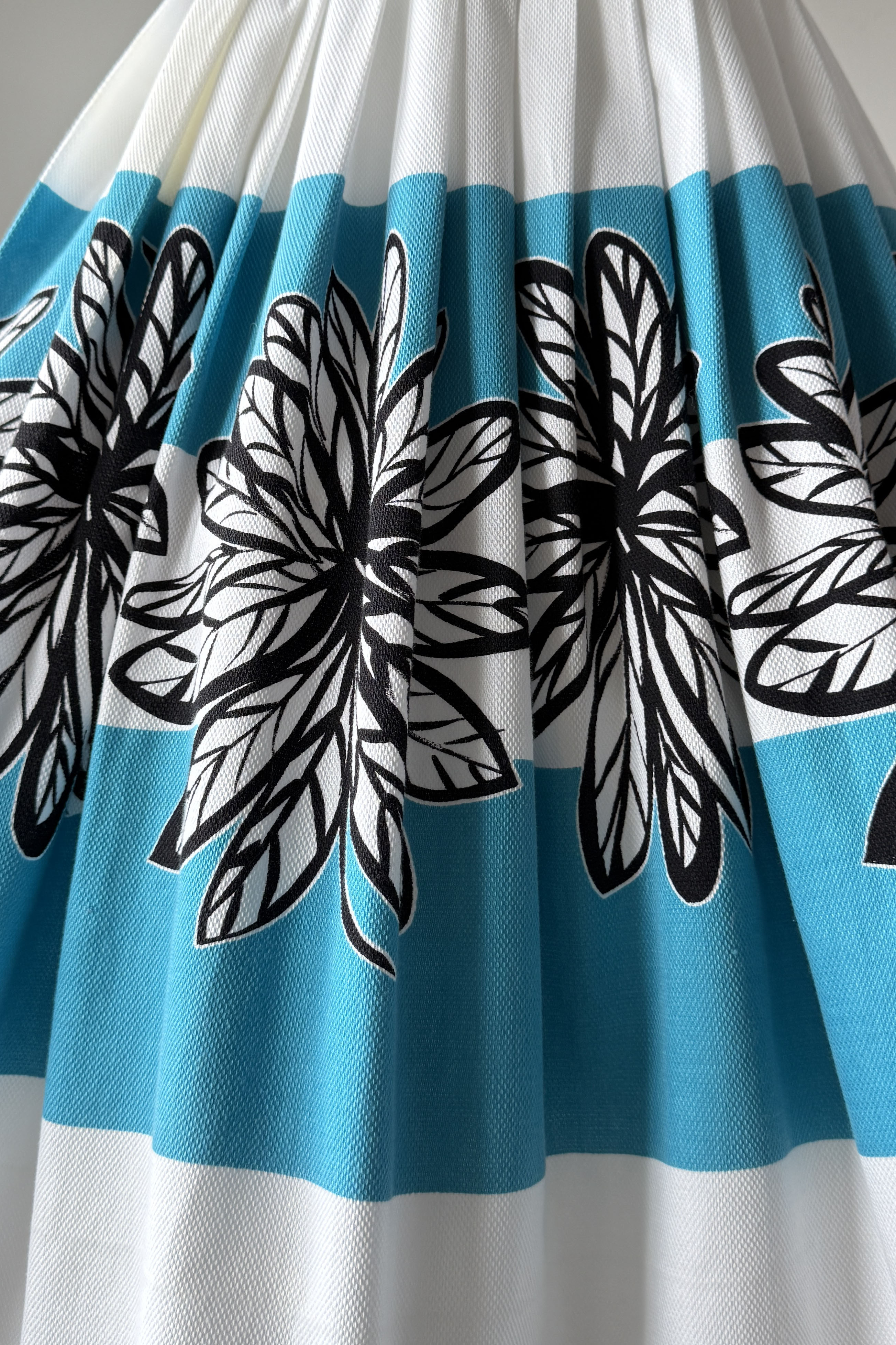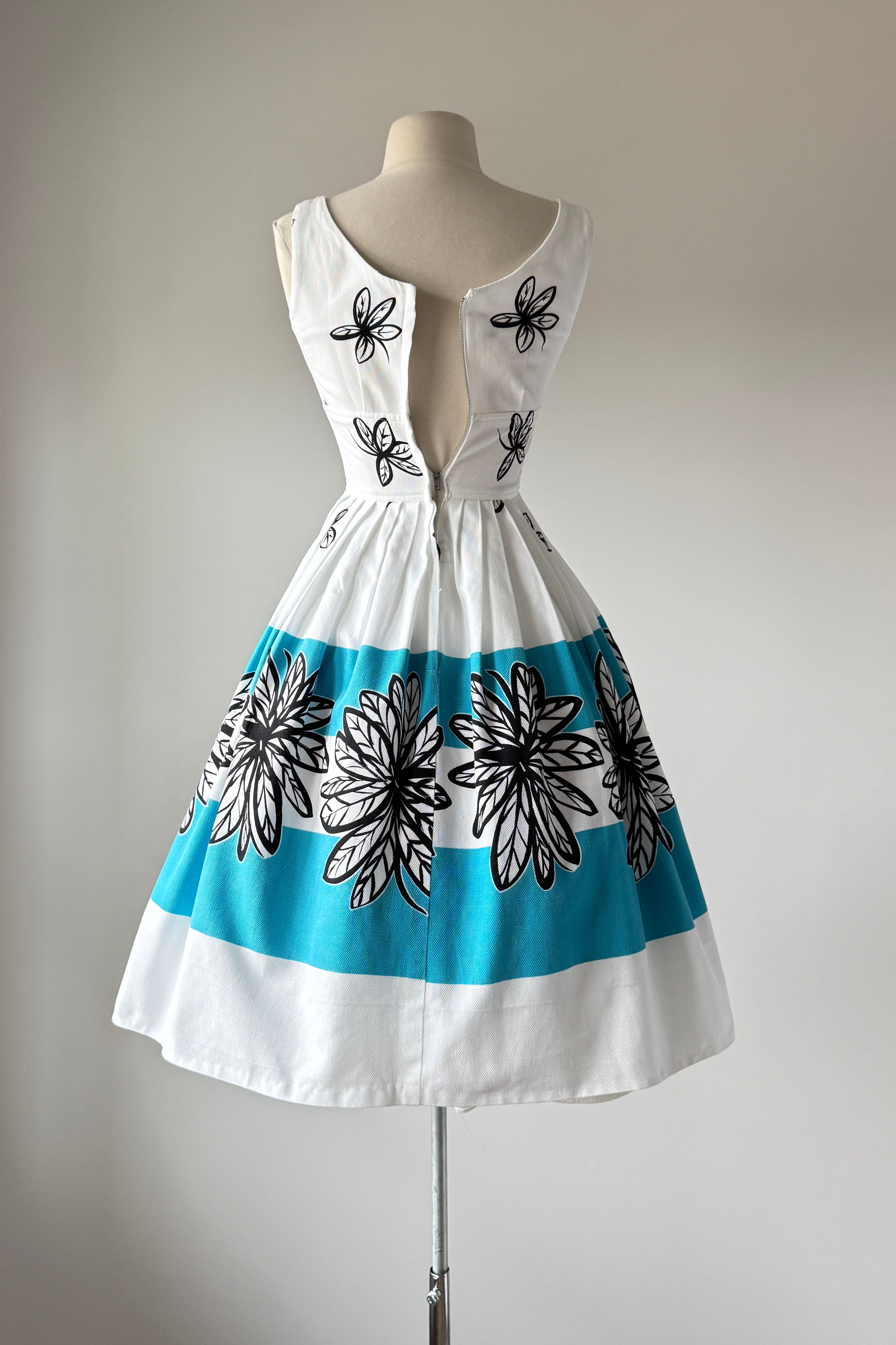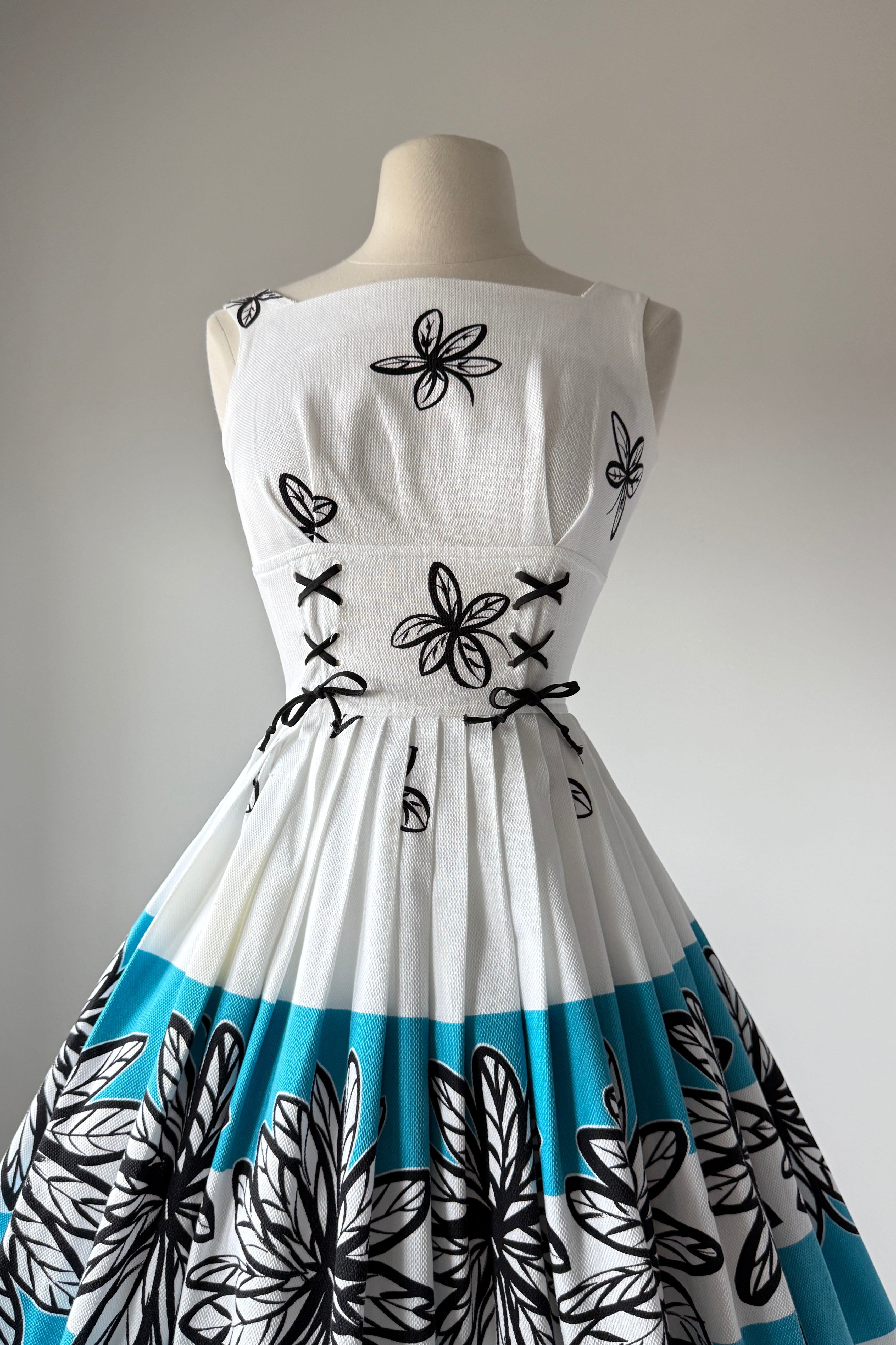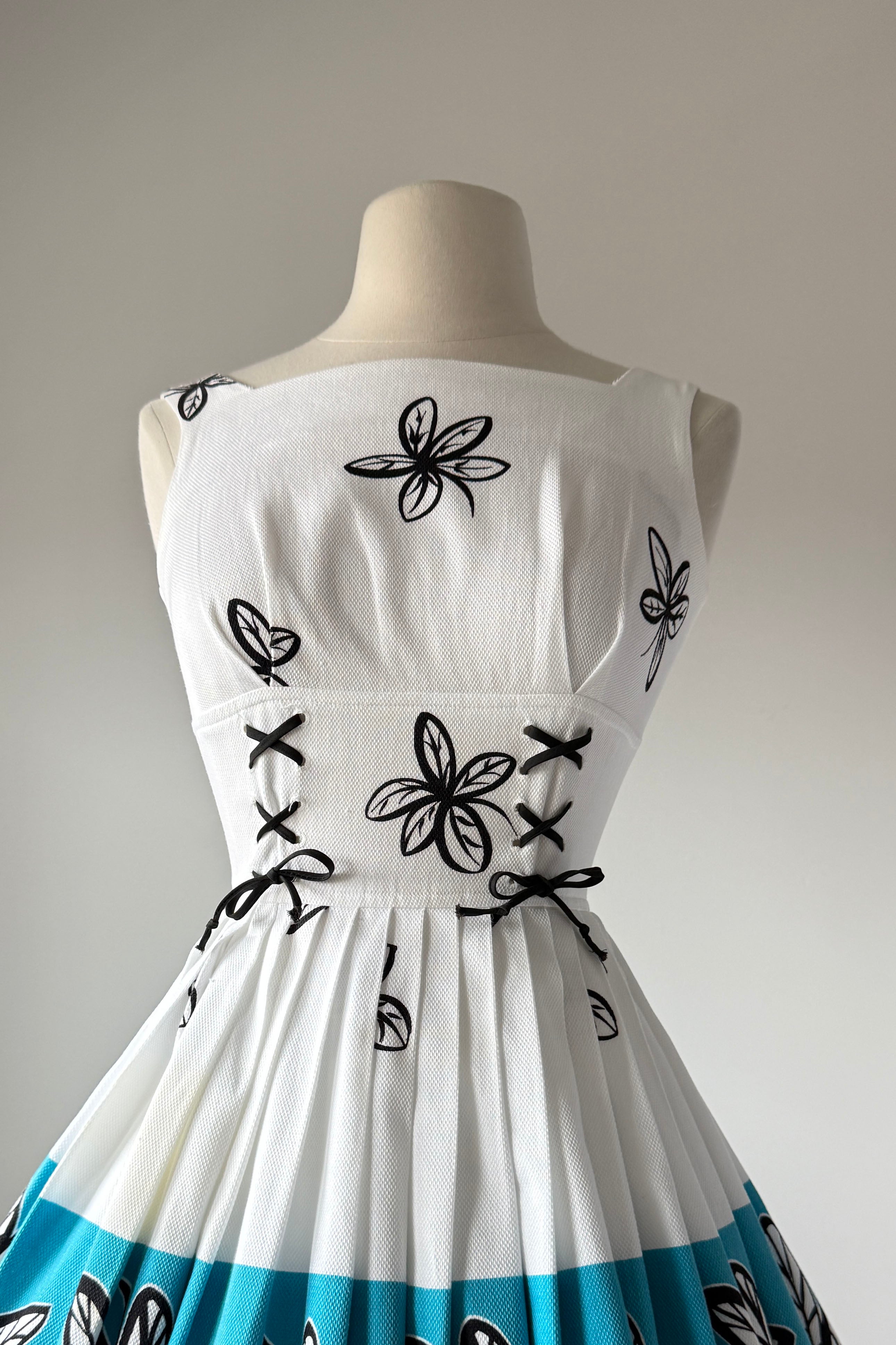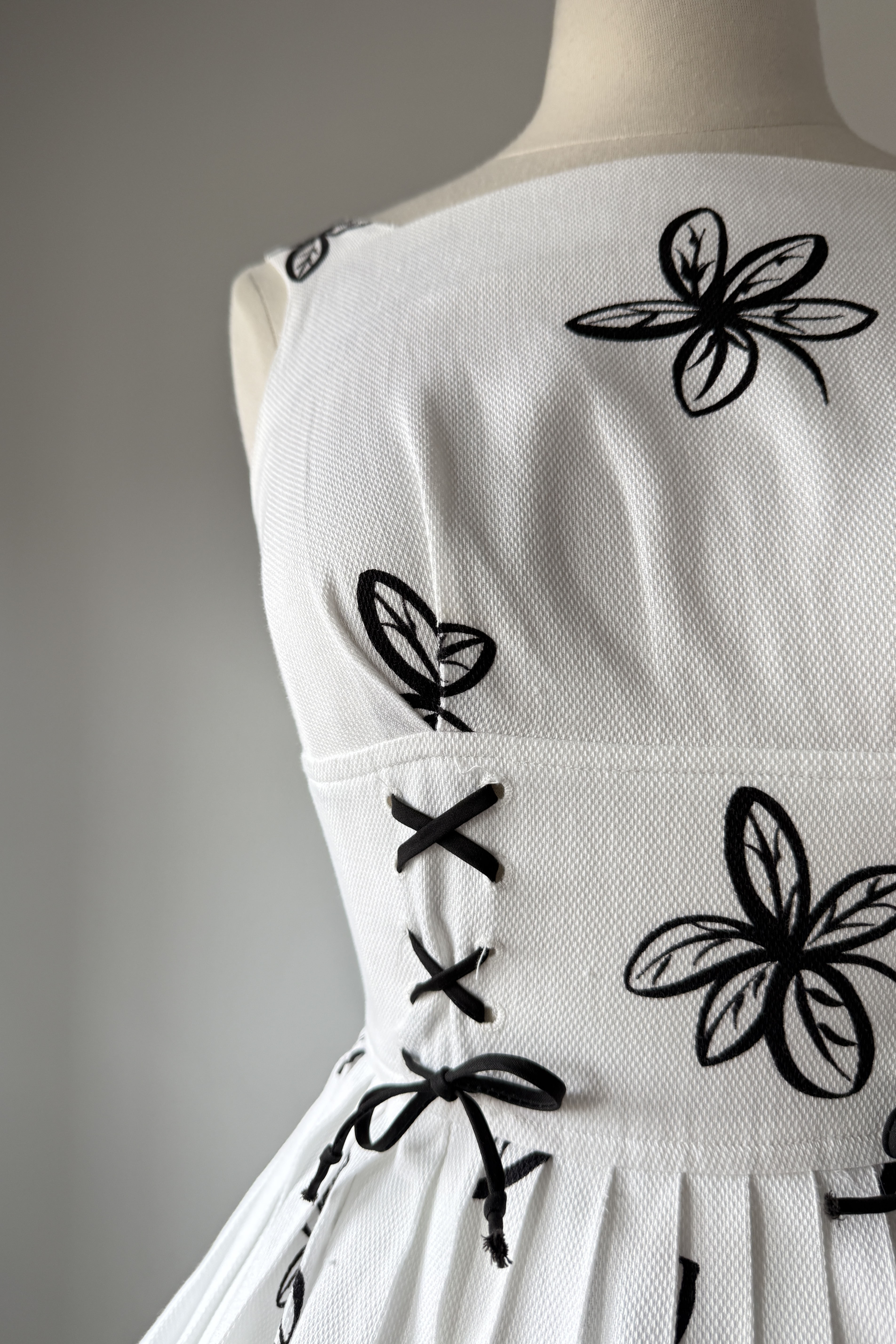 VINTAGE DRESSVintage 1960s dress. Features white cotton pique with wide blue stripe and black whimsical floral pattern, black laced ties at waist, metal back zipper. By Vicky Vaughn.Excellent condition. Faint crease at them where it's been let out to original length.XS. Length 40.5Bodice 15Bust 32Waist 23-24As with all vintage, please expect wear consistent with age. All sales are final. No order cancellations.0862 | 2607