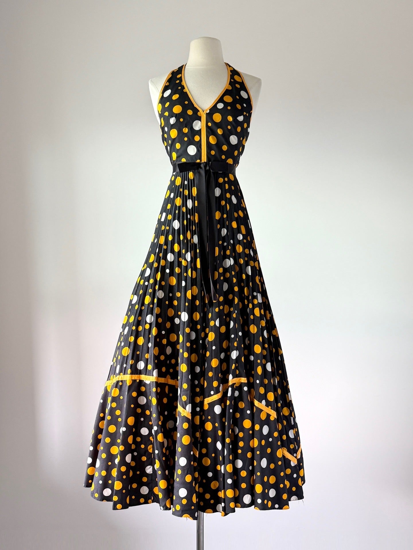 VINTAGE DRESSVintage 1970s dress. Features polka dot print, pleated skirt, yellow ribbon trim, halter neck. Back zipper. Cotton with acetate lining. By Frank Usher. Excellent condition. Fits like XS. Length 57Bodice 16Bust 32Waist 24As with all vintage, please expect wear consistent with age. All sales are final. No order cancellations.0917 | 2612