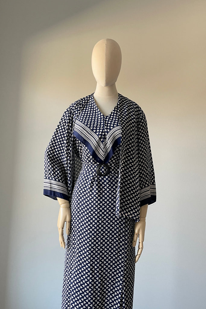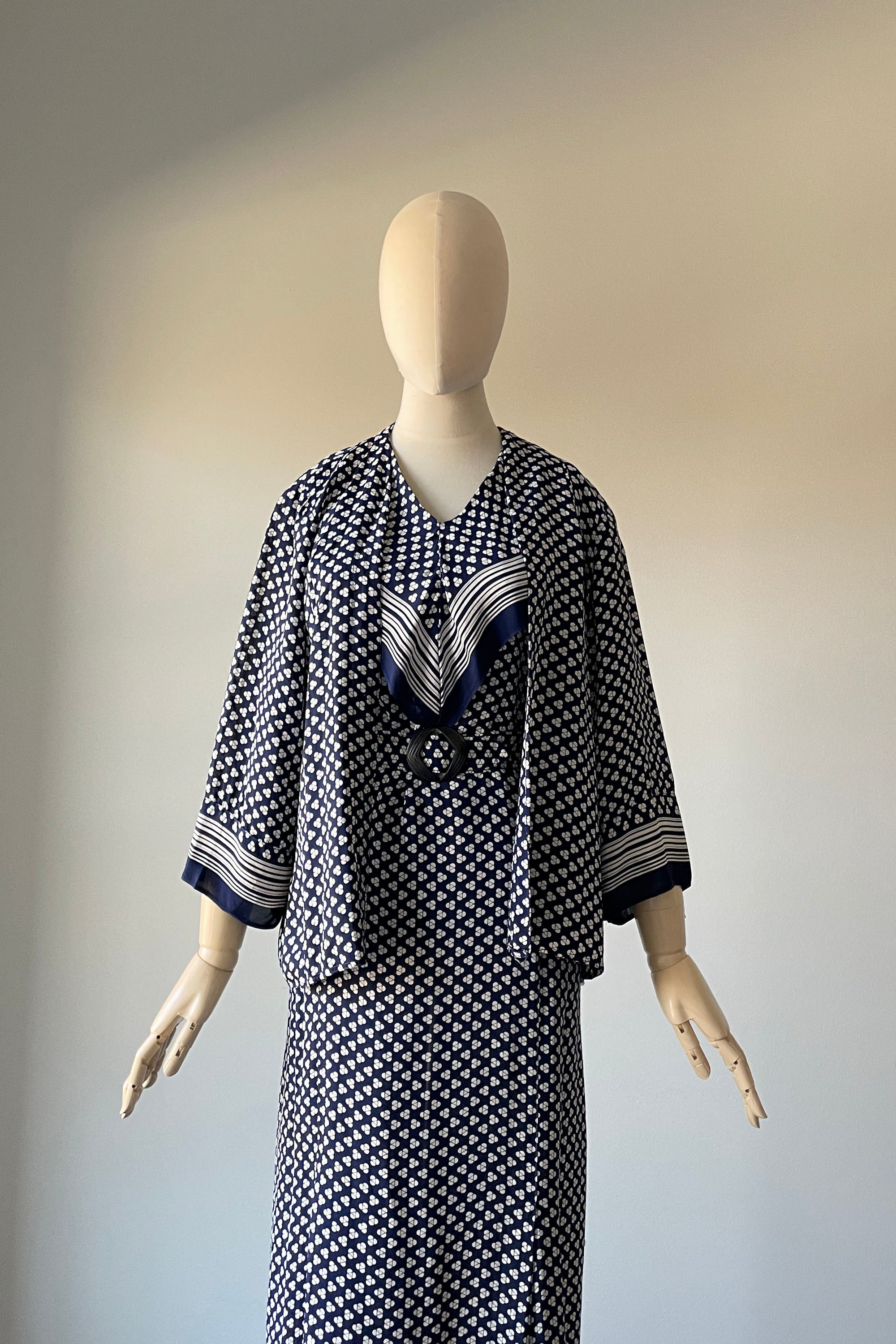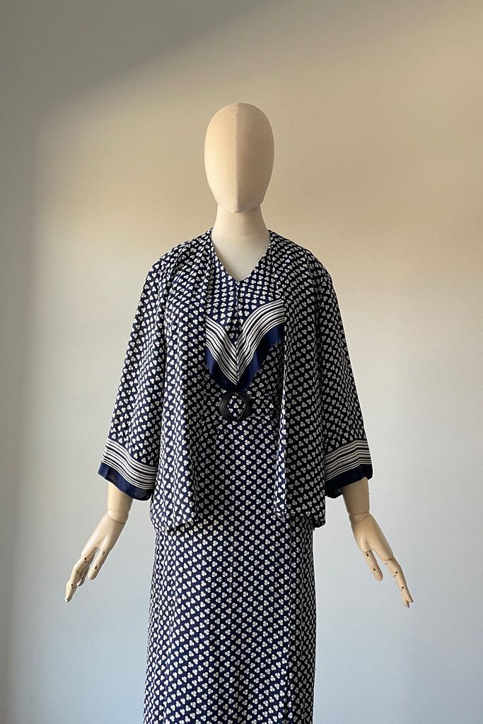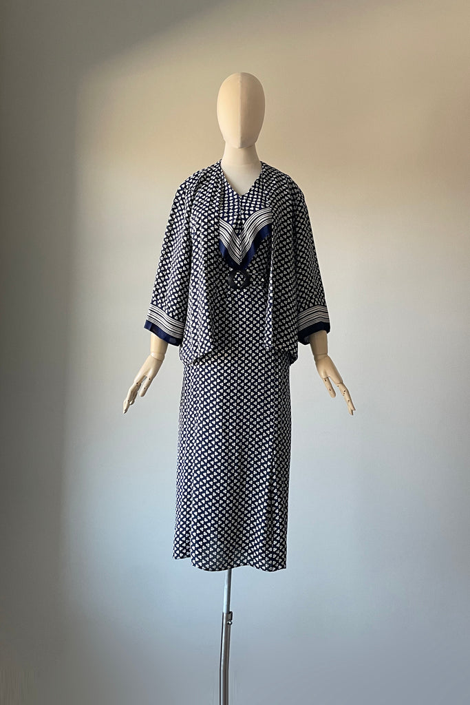 d e t a i l s : beautiful cold rayon art deco print 3-pc set. darling dress with matching jacket and original belt