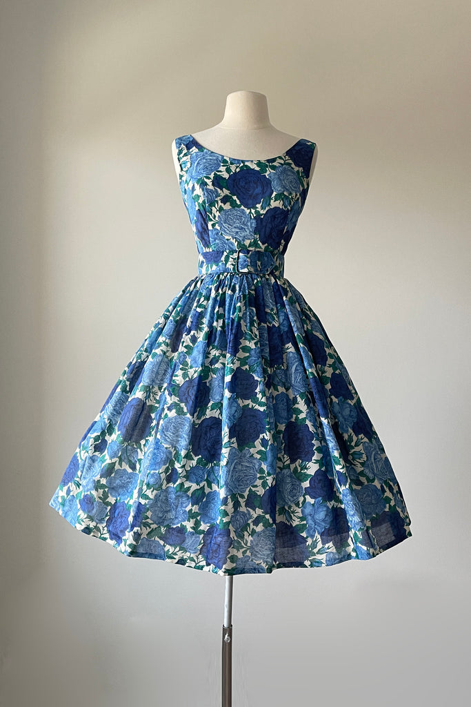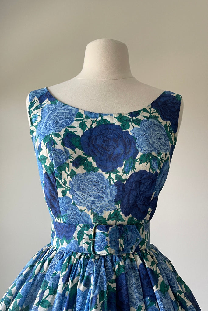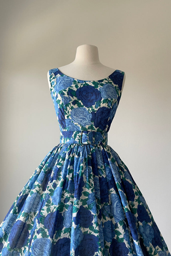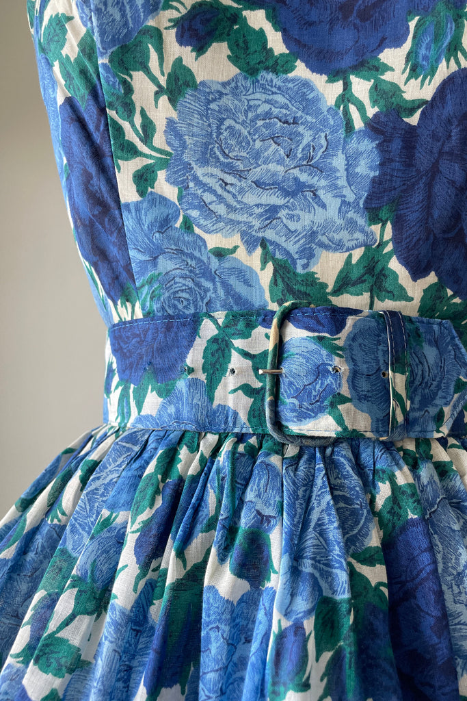 d e t a i l s : gorgeous rose print woven cotton, skirt backed in tulle, entire dress lined in muslin, original wide belt