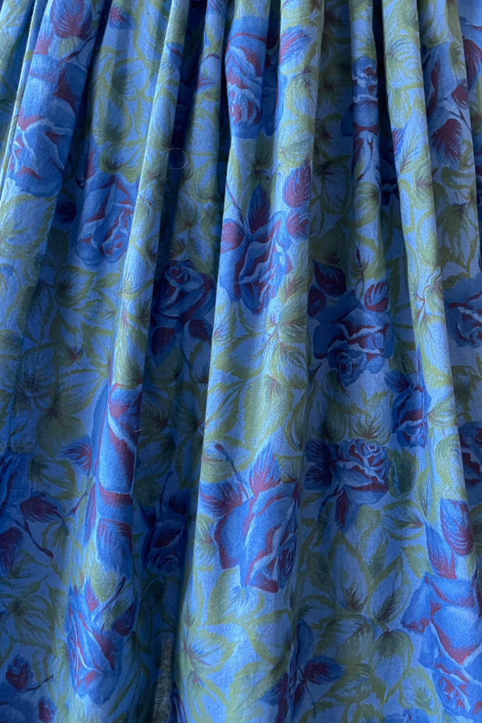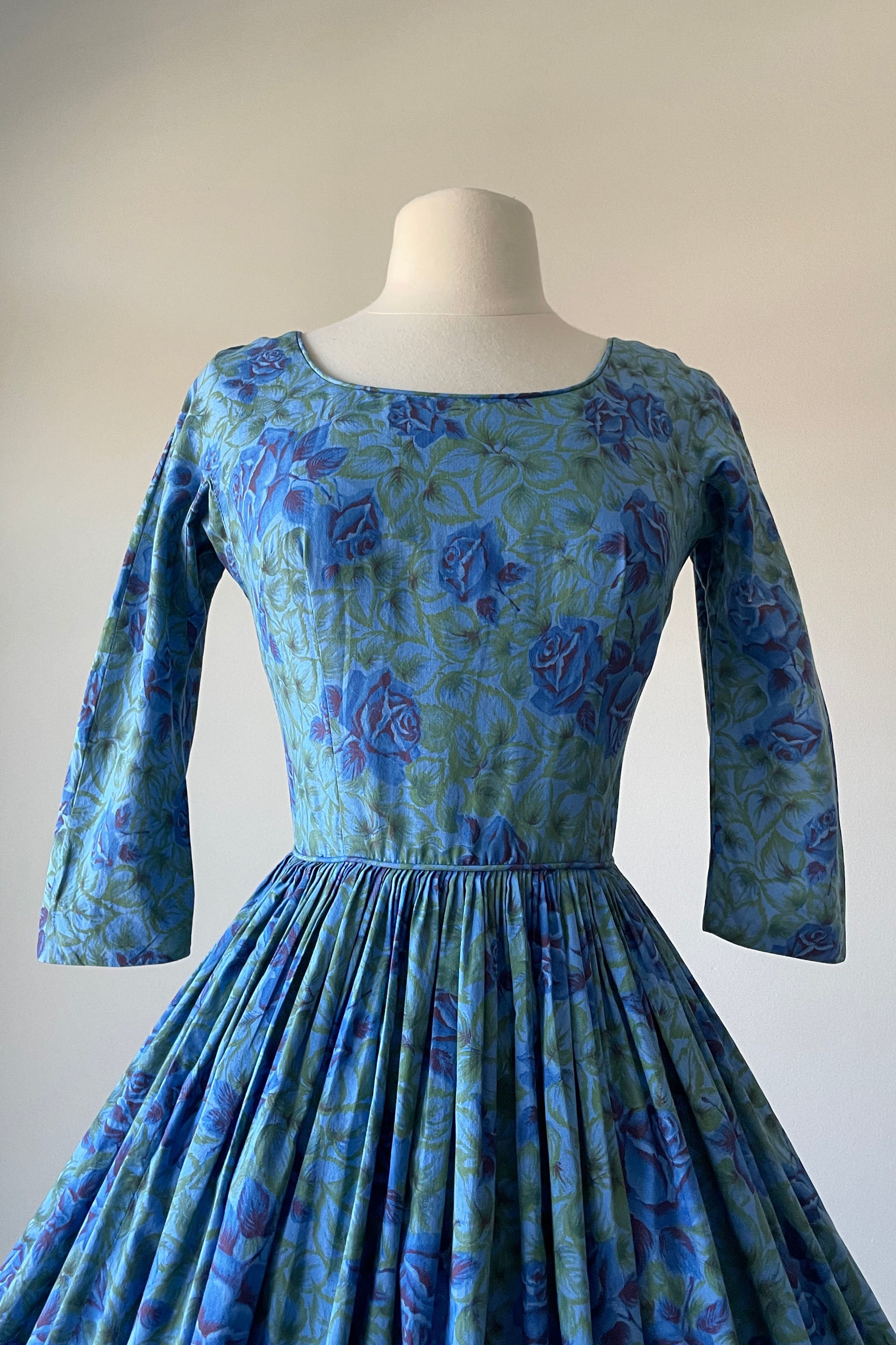 d e t a i l s : beautiful blue rose print, cropped sleeves, pleated skirt