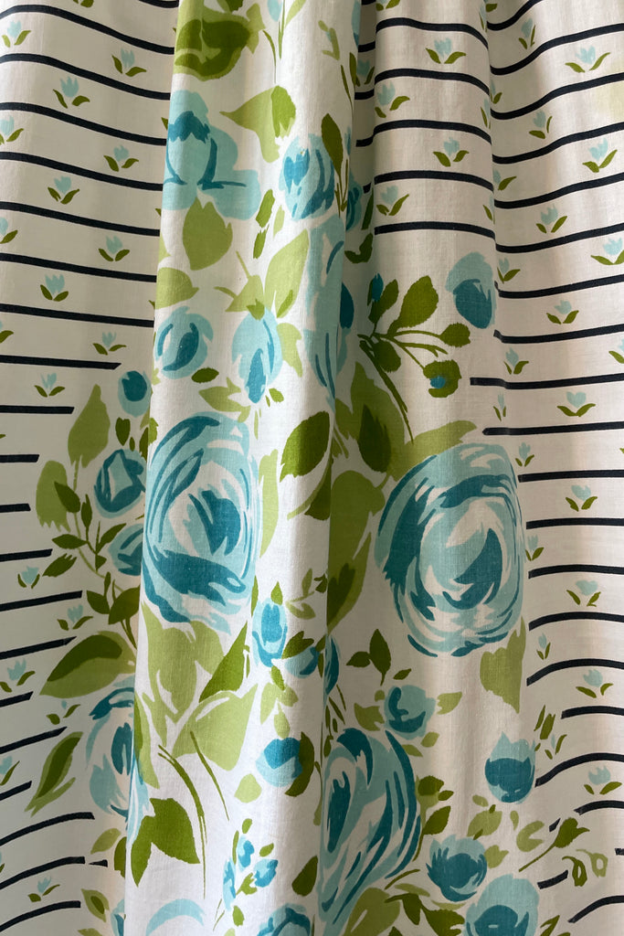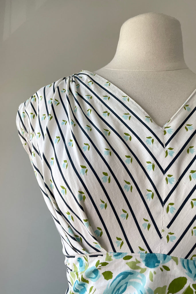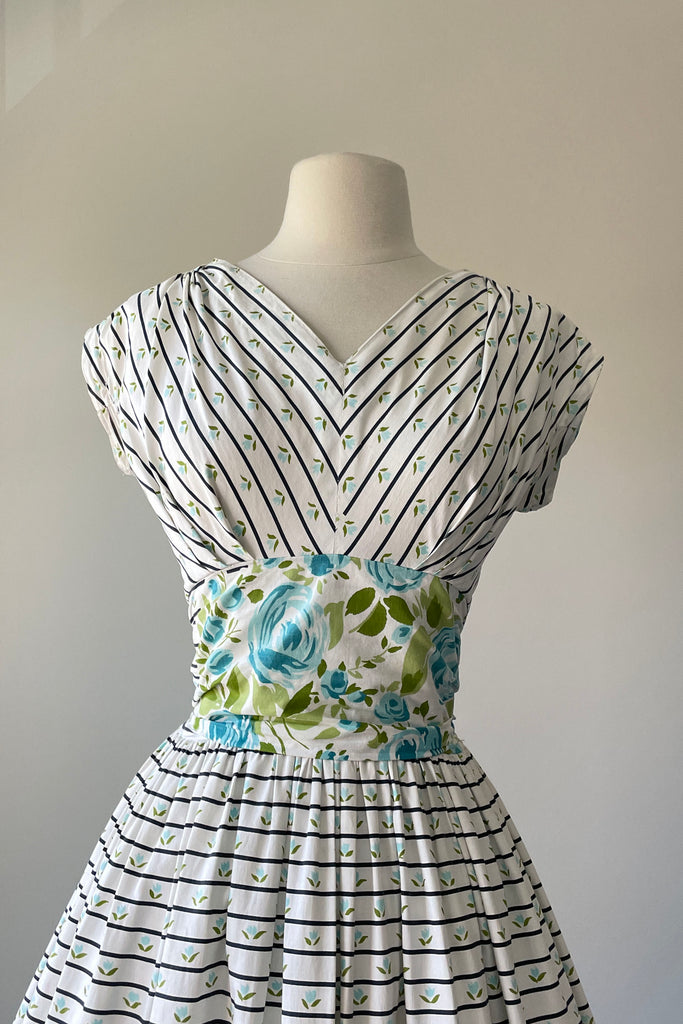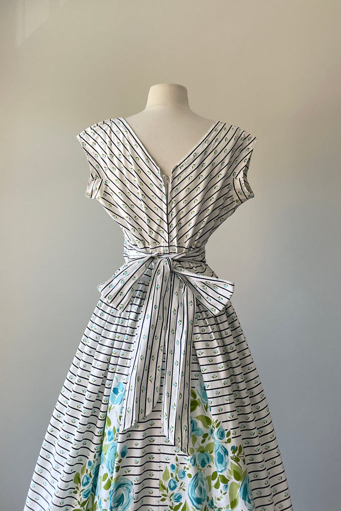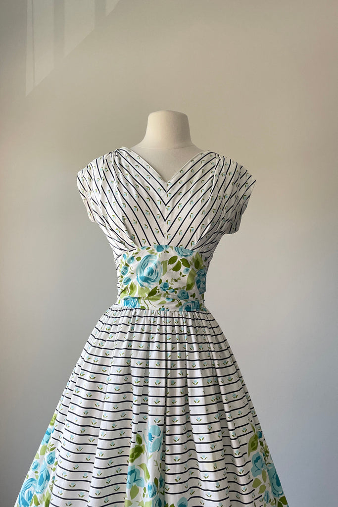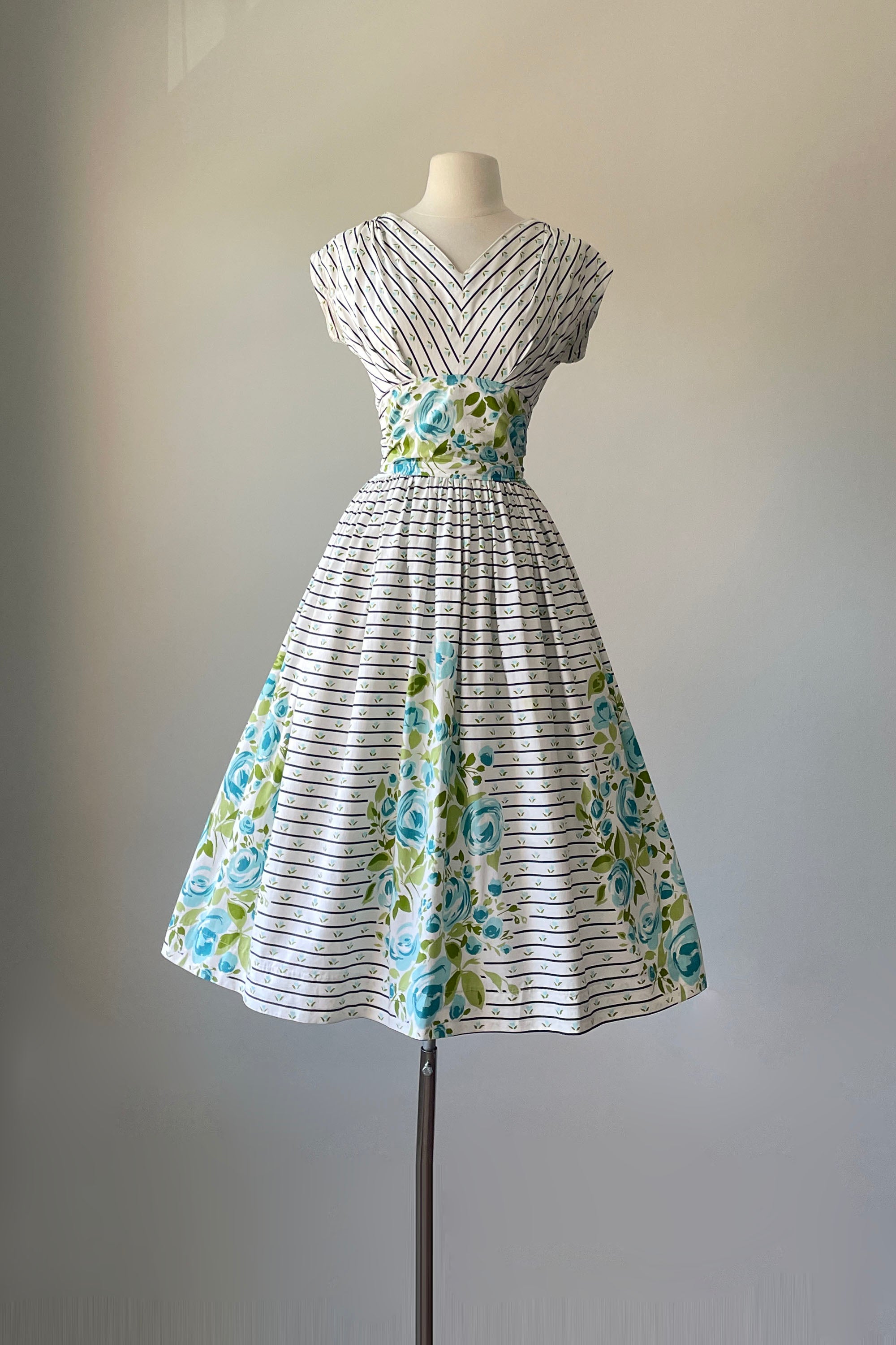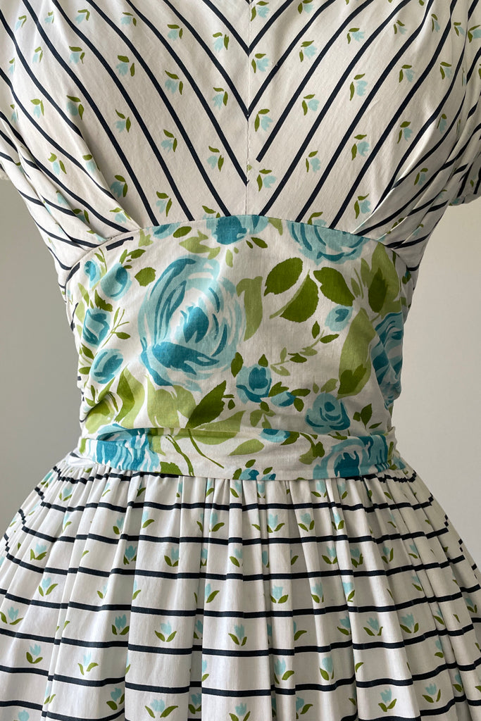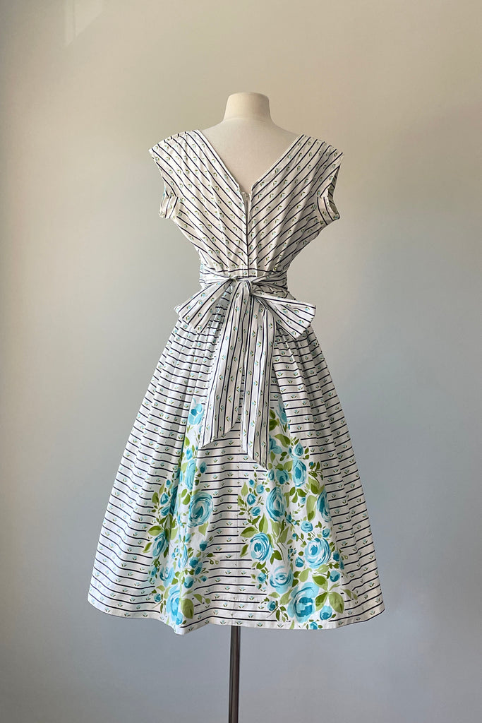 1950s Blue Rose Print Tie Back Dress | LARGE
