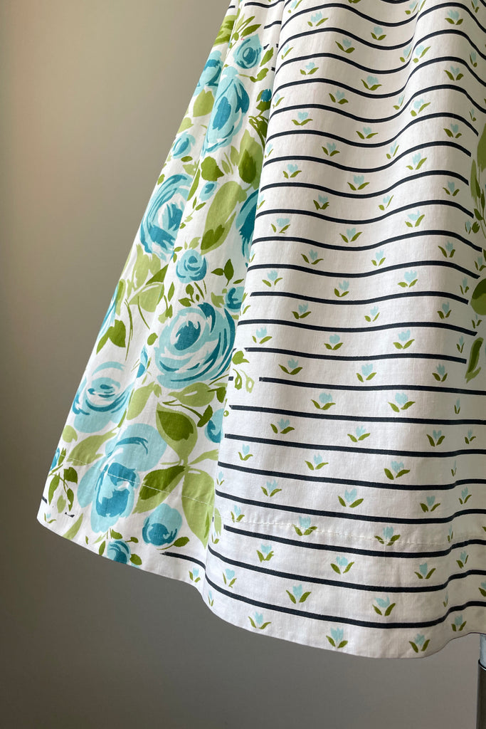 d e t a i l s : beautiful white cotton with blue rose print, pleated at shoulders, gathered waist with long sash ties in back