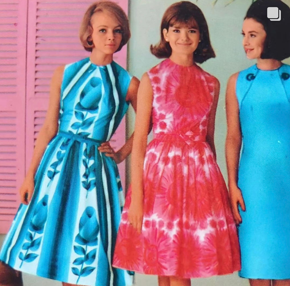 d e t a i l s : Here's the original description from the UK "Littlewoods" catalogue of spring and summer 1964. "Beautiful schreinered cotton dress with cerise coloured marguerites on a white ground. The generously-full skirt has unpressed pleats and is topped by a figure-moulding shaped bodice. The belt has a novel trimming. Neatly finished with long back-zip".