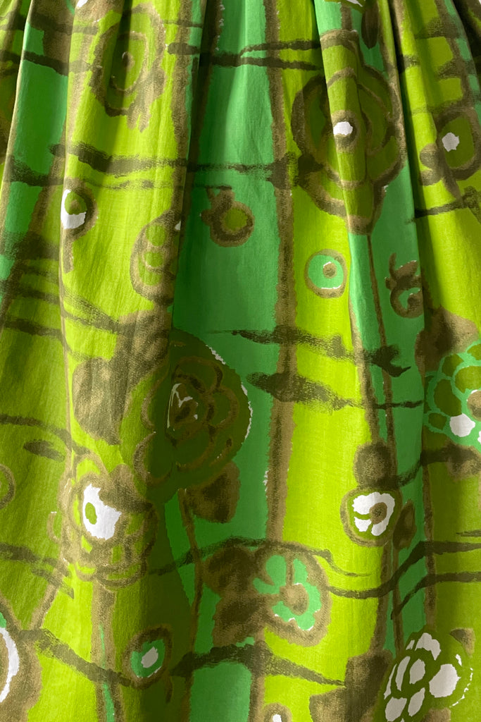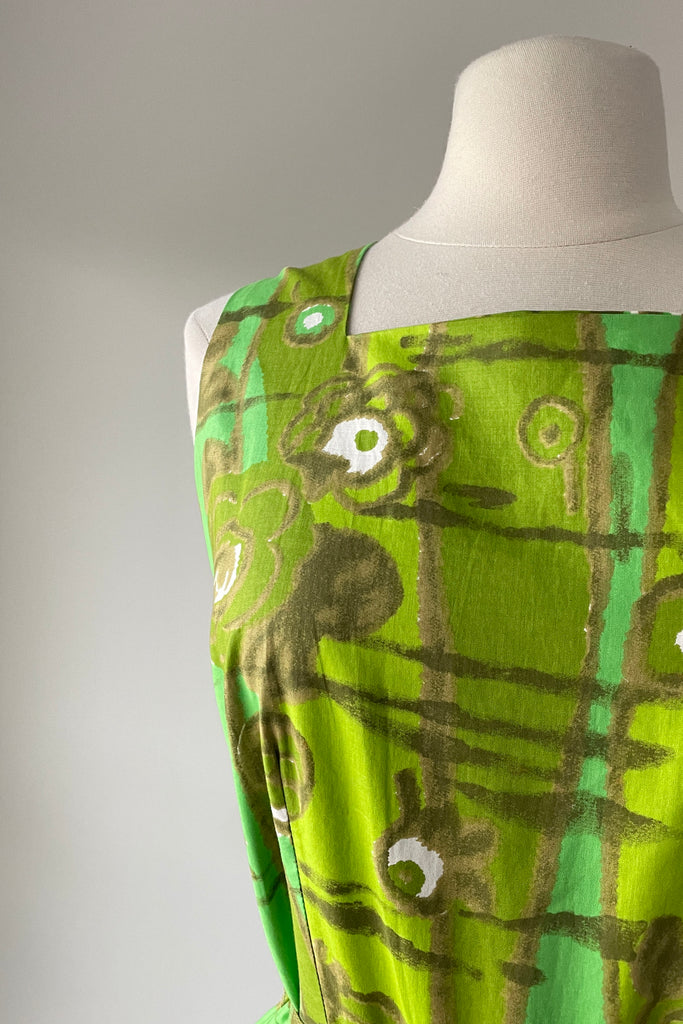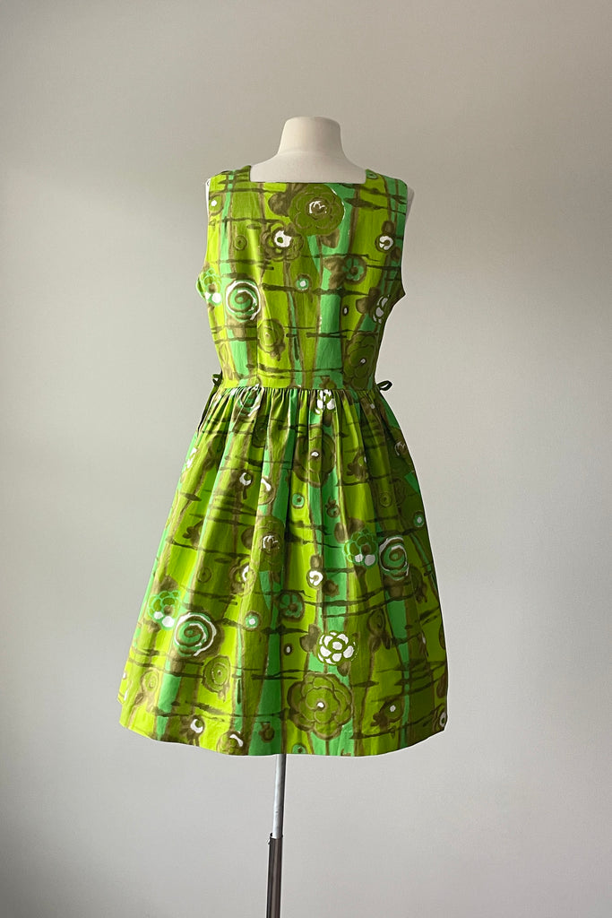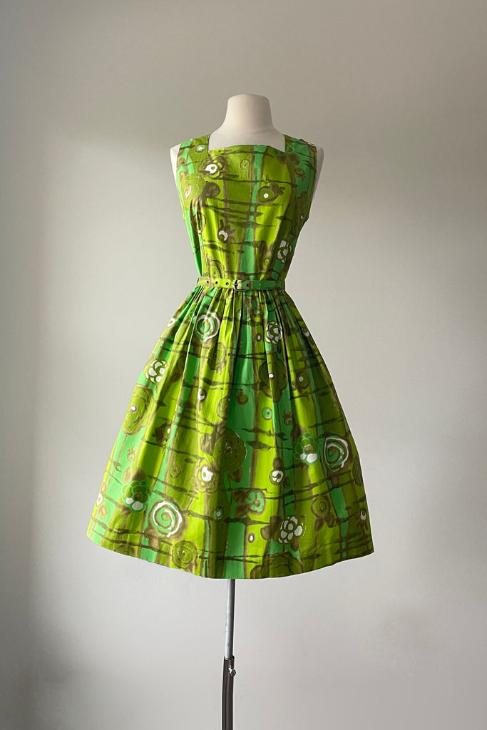 1950s Chartreuse Green Floral Print Dress | M/L
