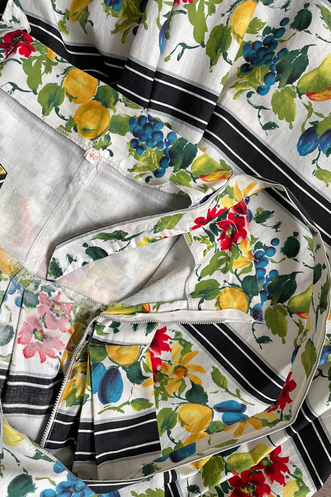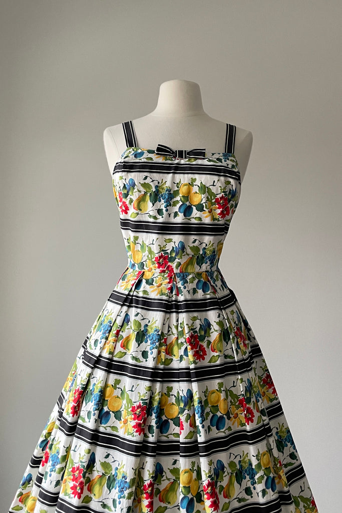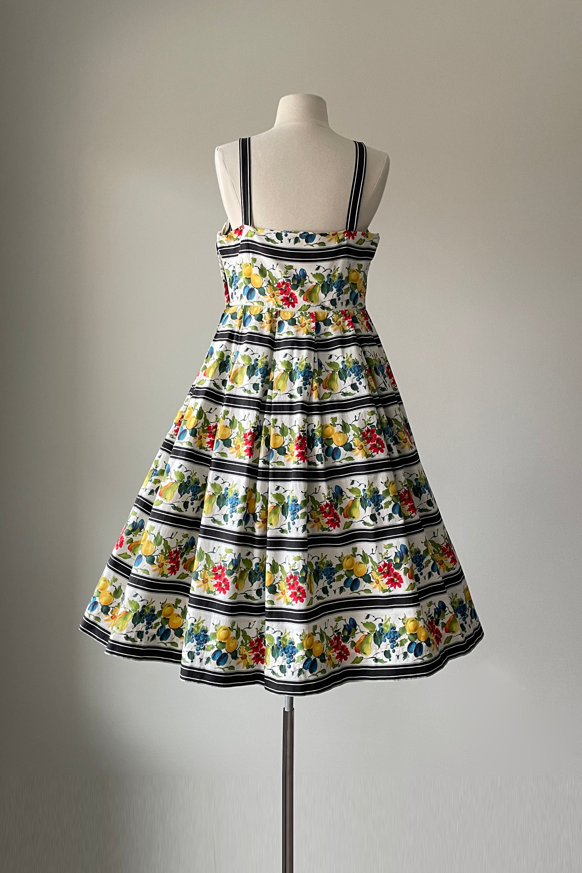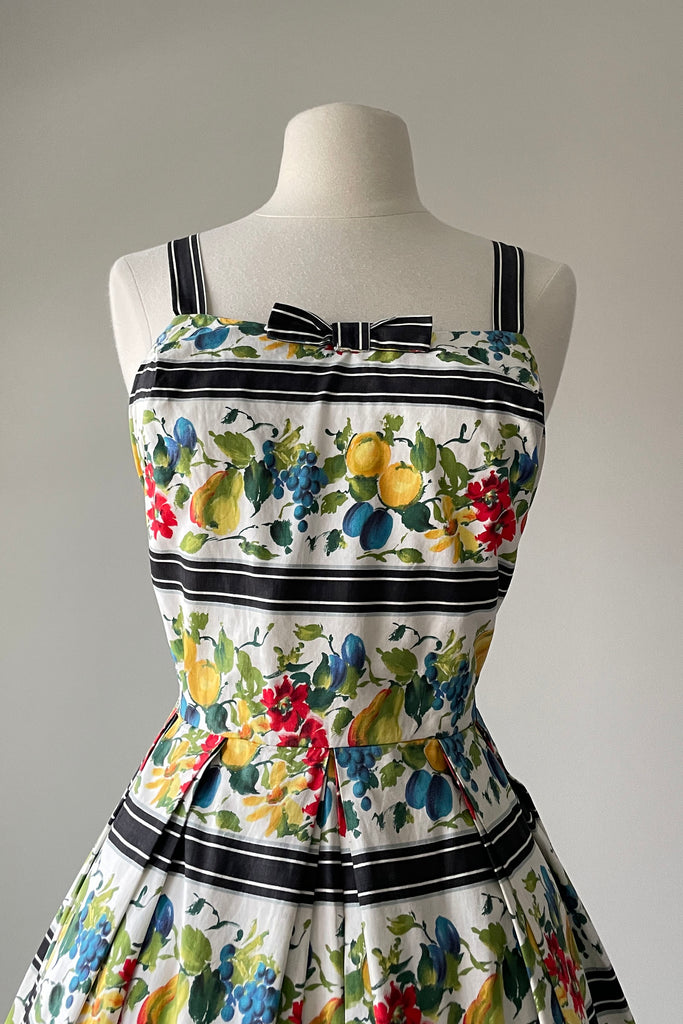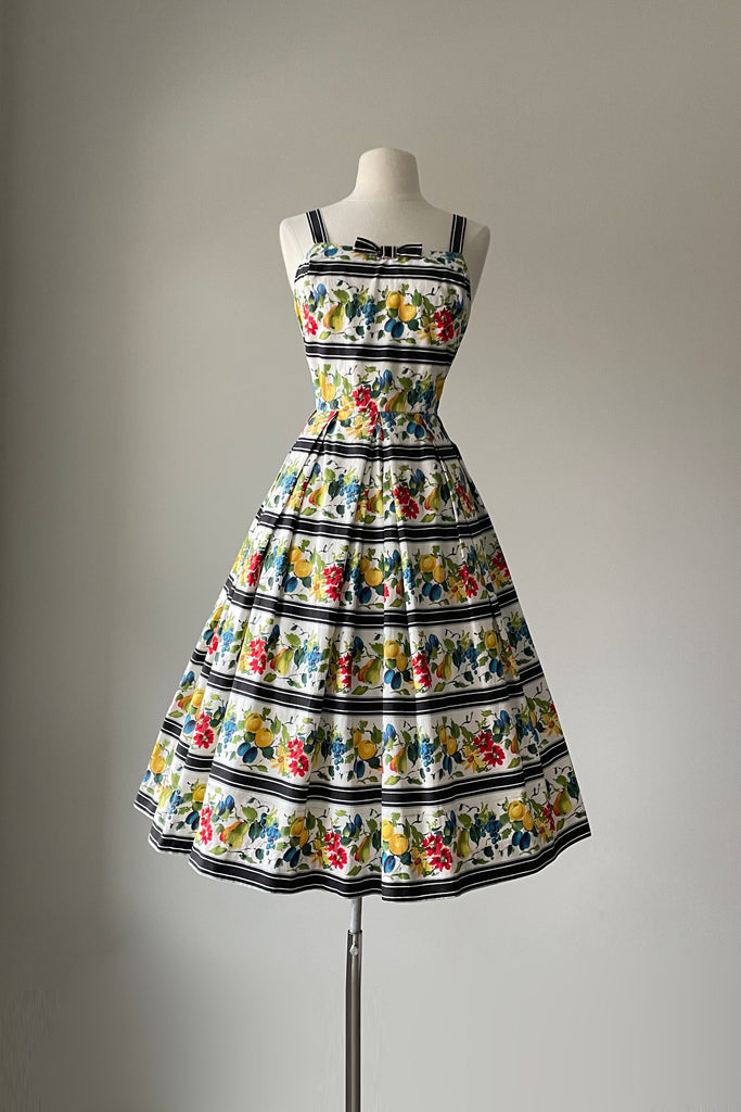 d e t a i l s : darling watercolor fruit print accented in wide black stripes, fitted bodice, pleated skirt, cotton lined bodice
