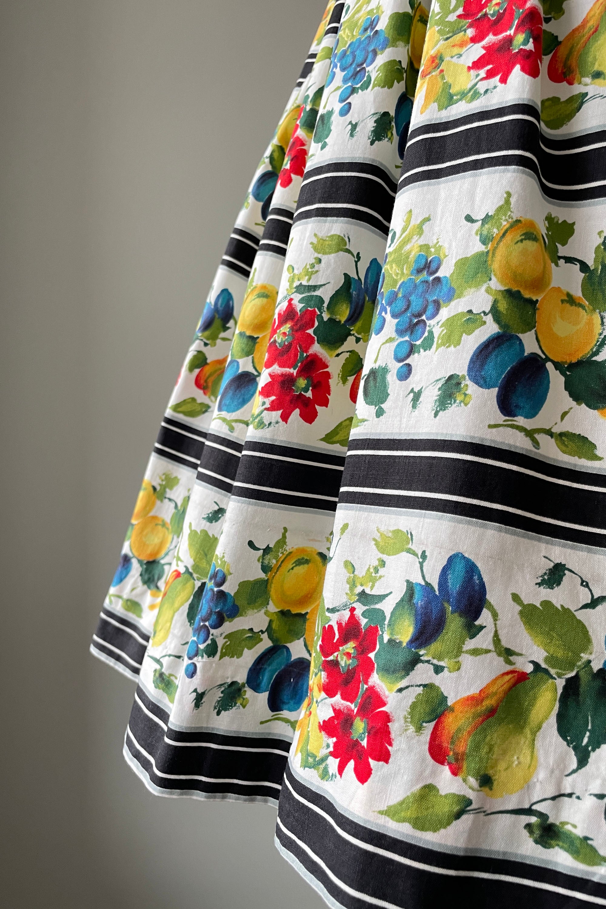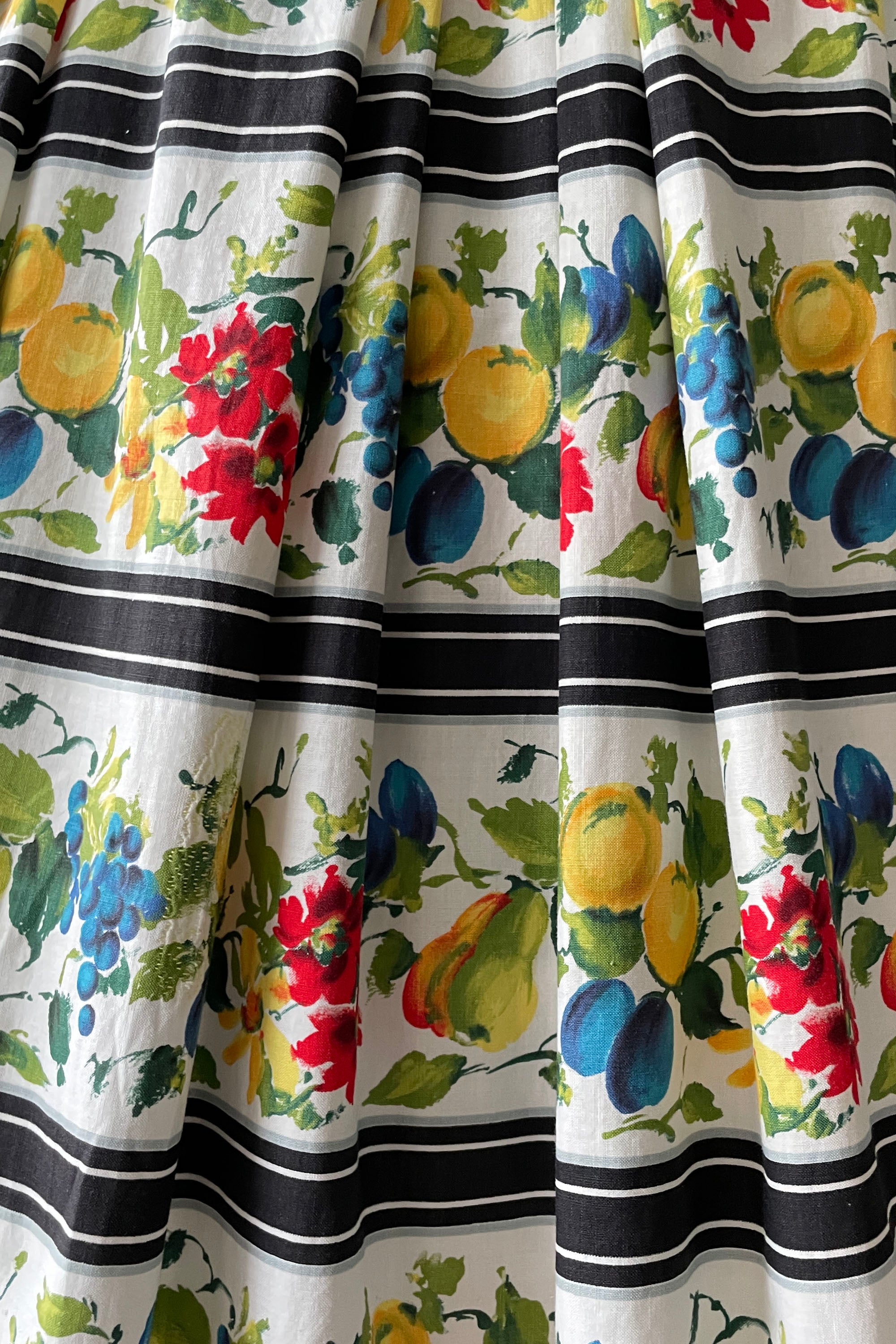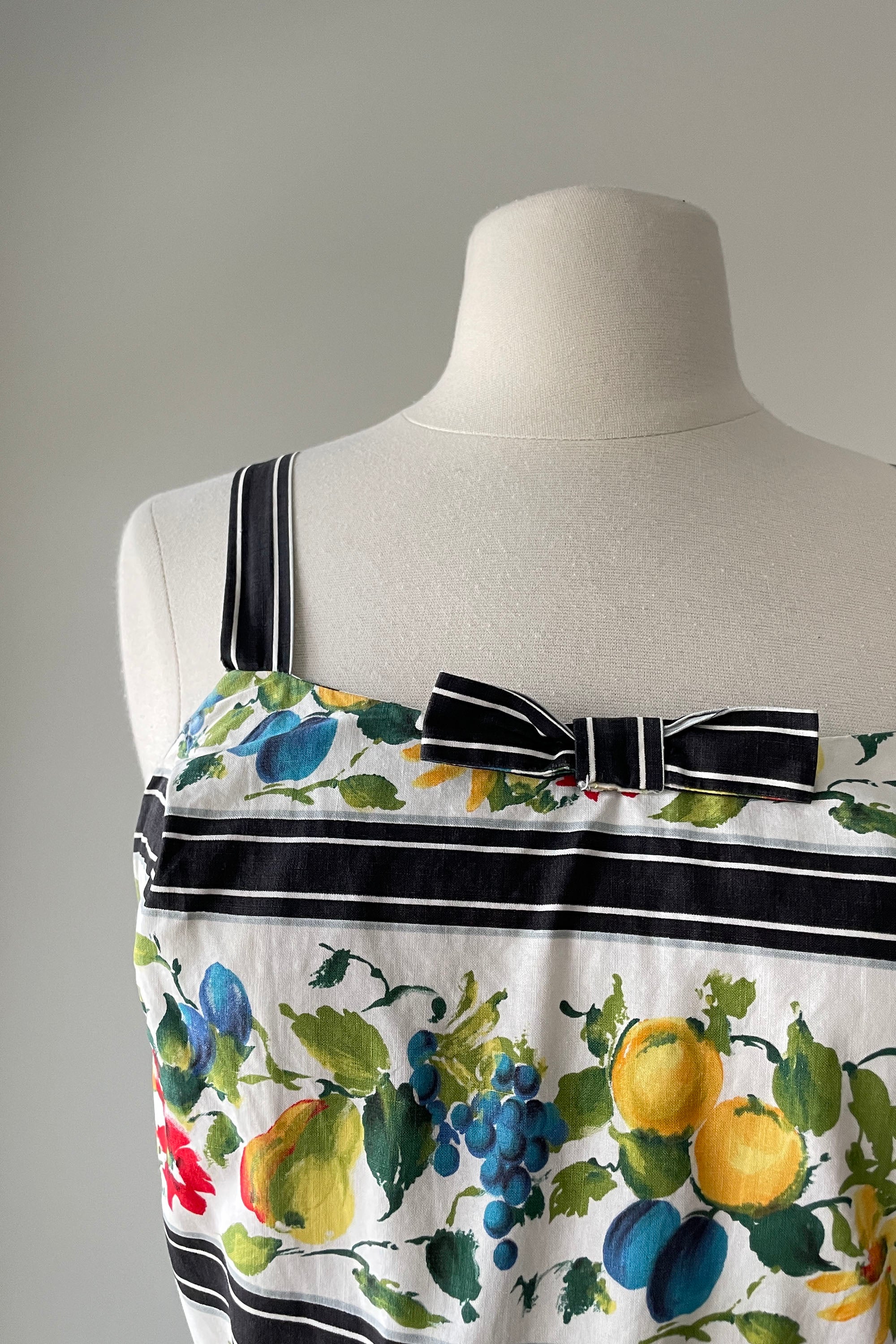 d e t a i l s : darling watercolor fruit print accented in wide black stripes, fitted bodice, pleated skirt, cotton lined bodice