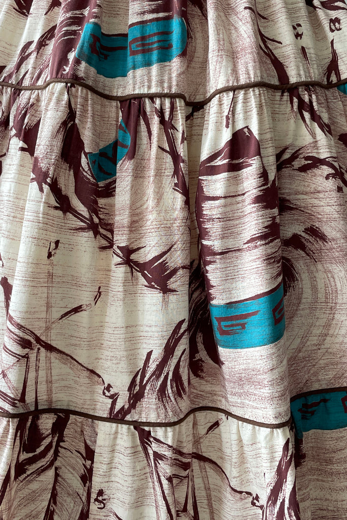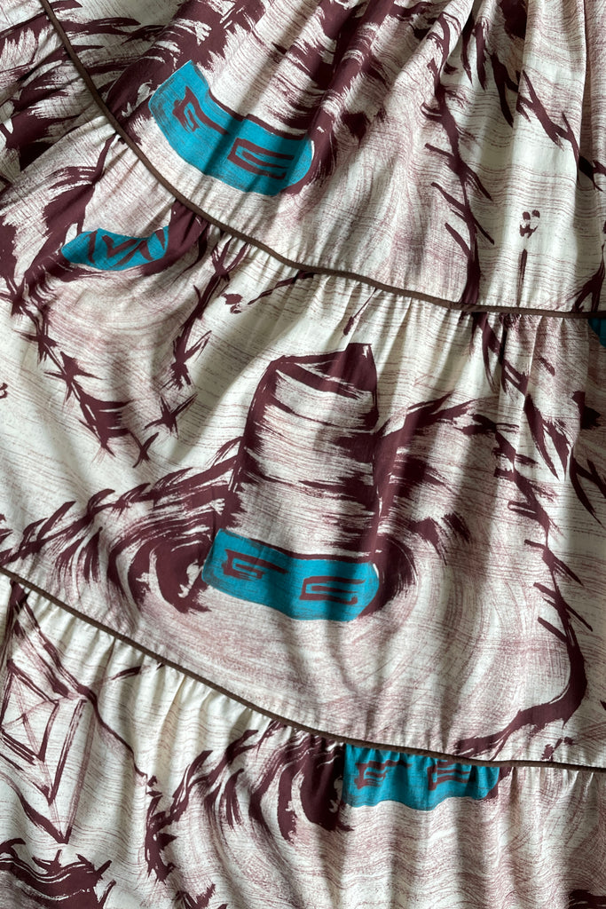 d e t a i l s : gorgeous God's eye and sombrero print, tiered skirt, ruched sleeves