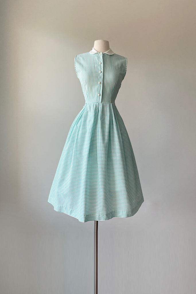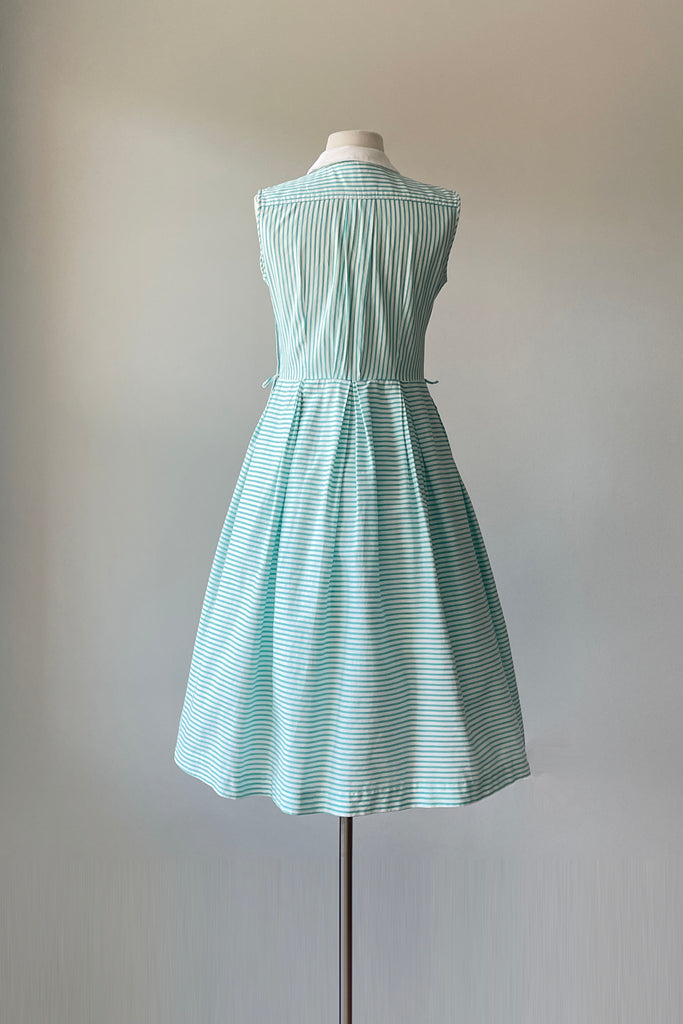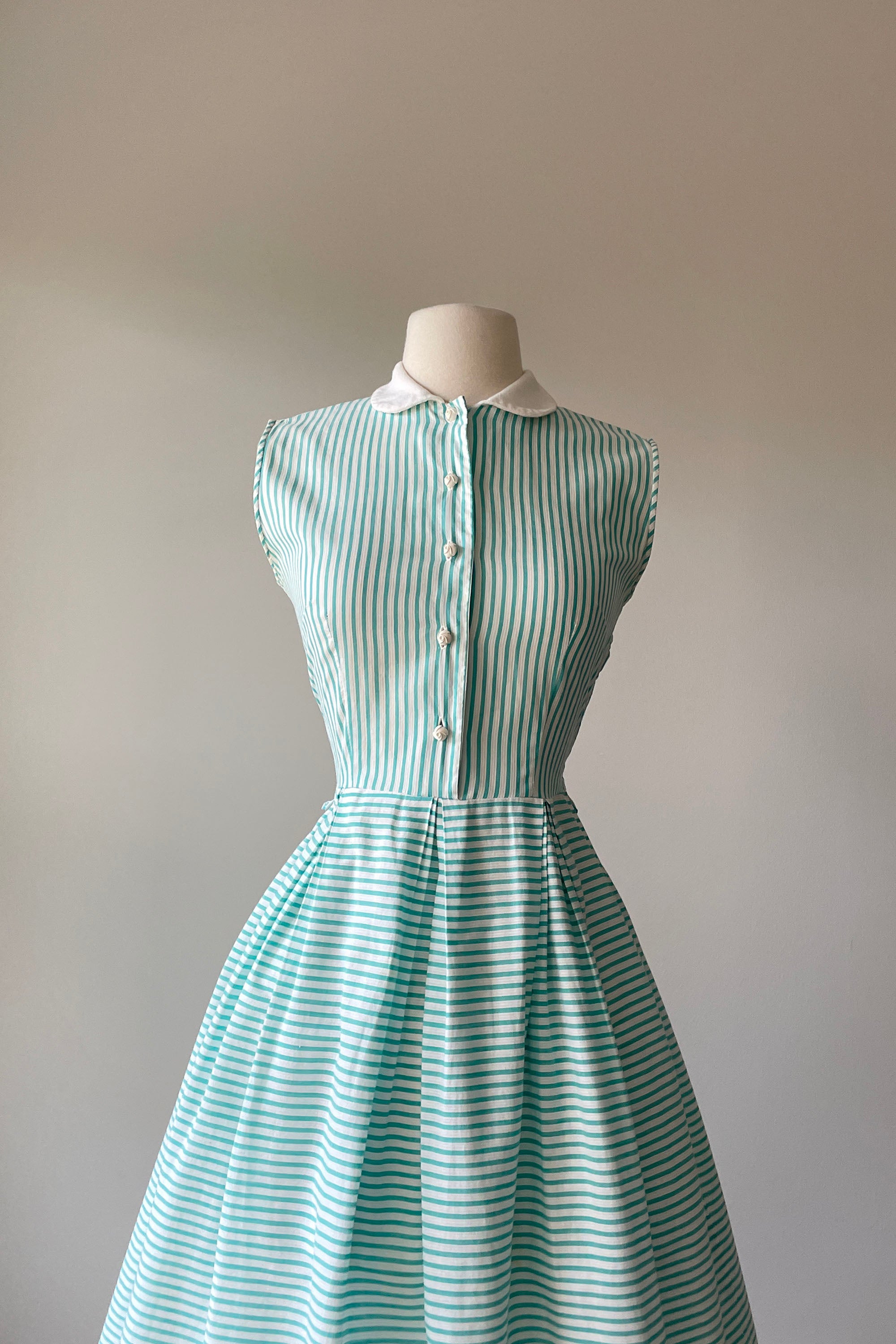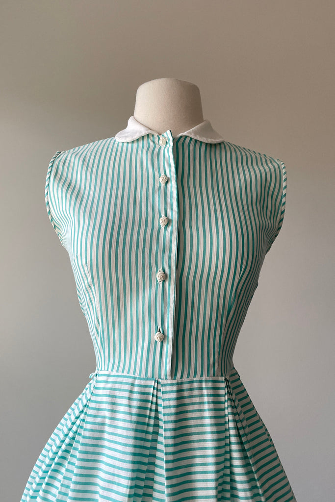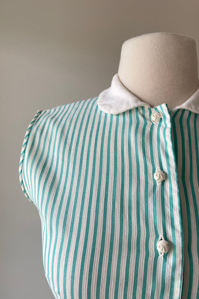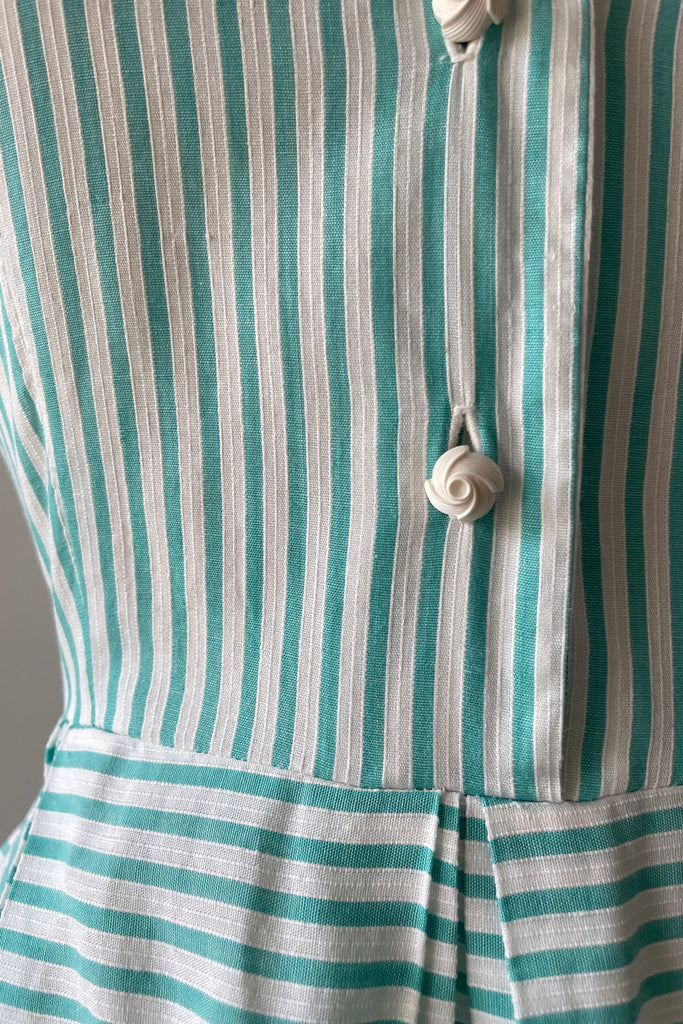 1950s Mint Green Stripe Rosebud Buttons Dress | MEDIUM