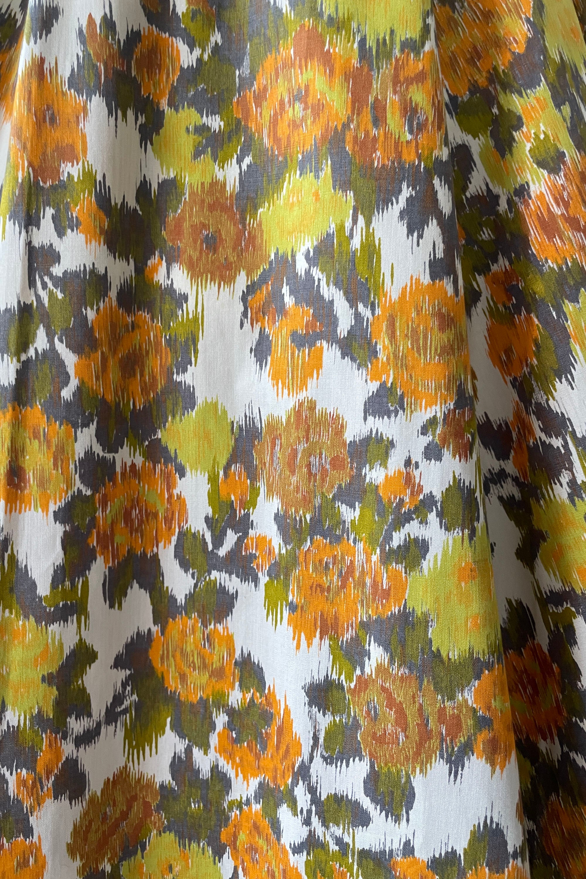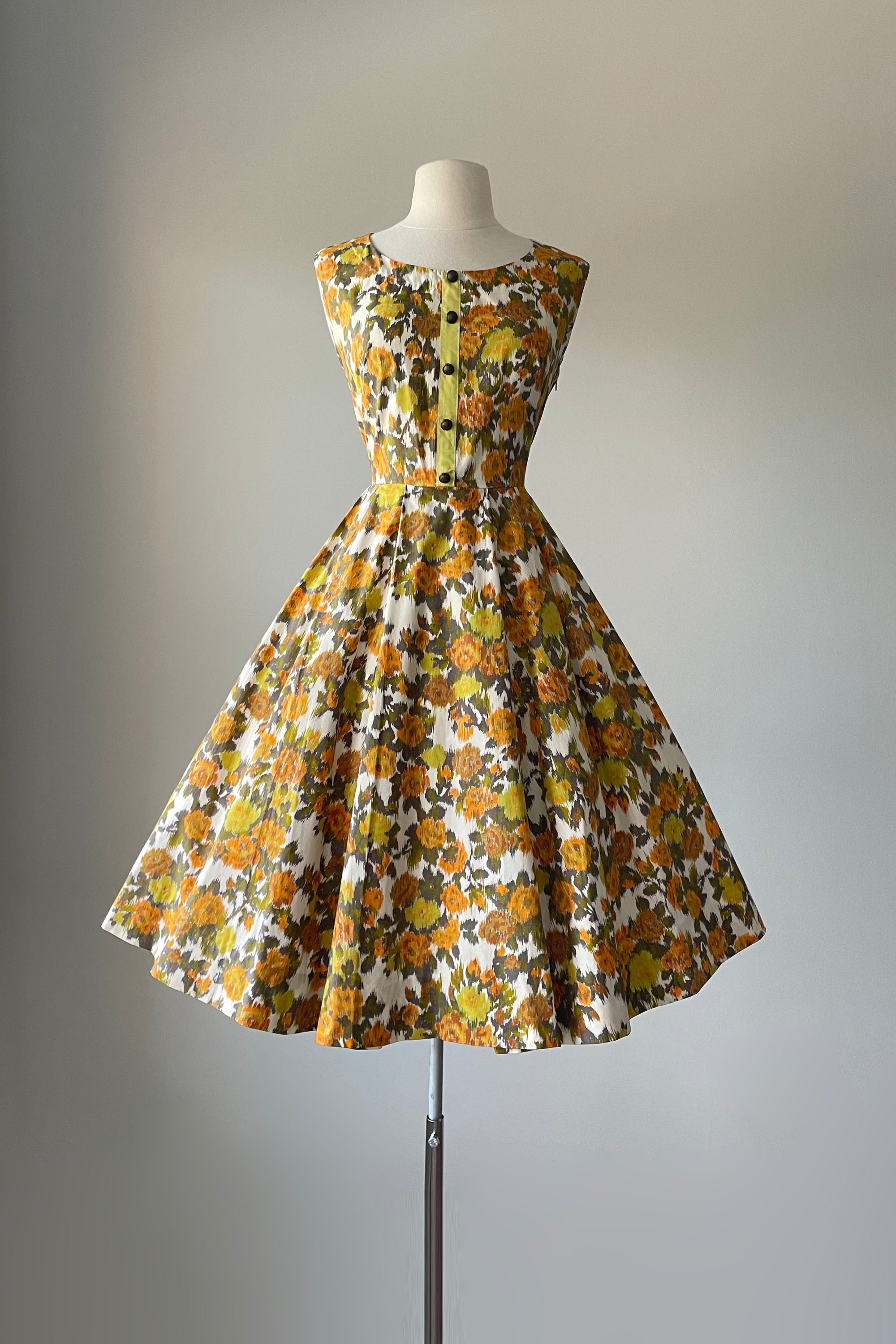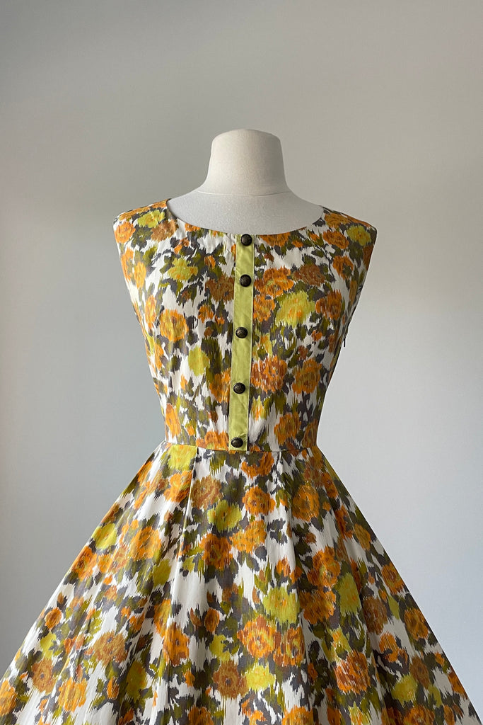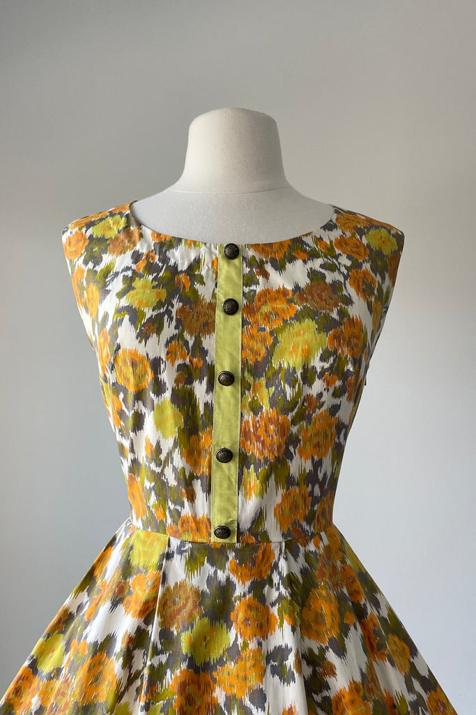 d e t a i l s : gorgeous orange rose print, gross-grain ribbon button placket up front bodice, full skirt