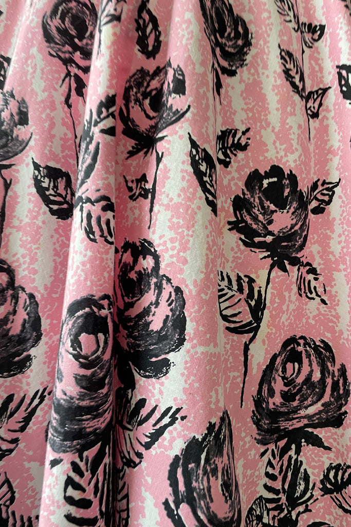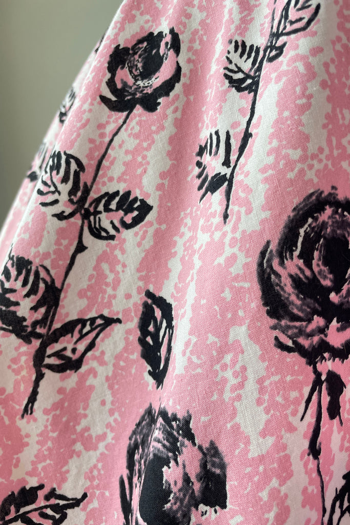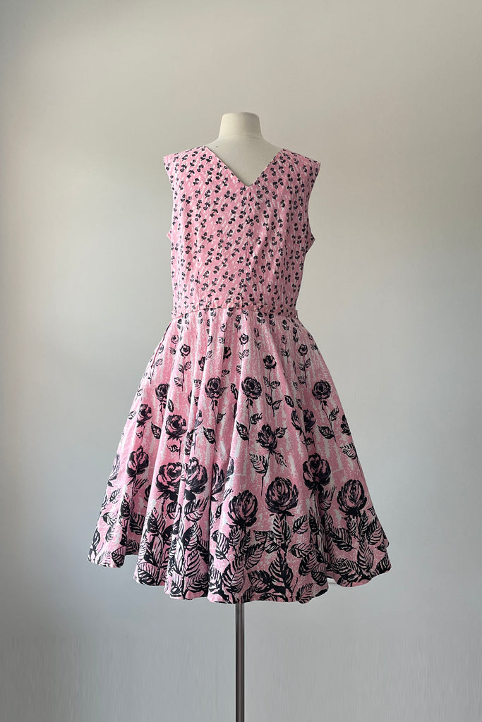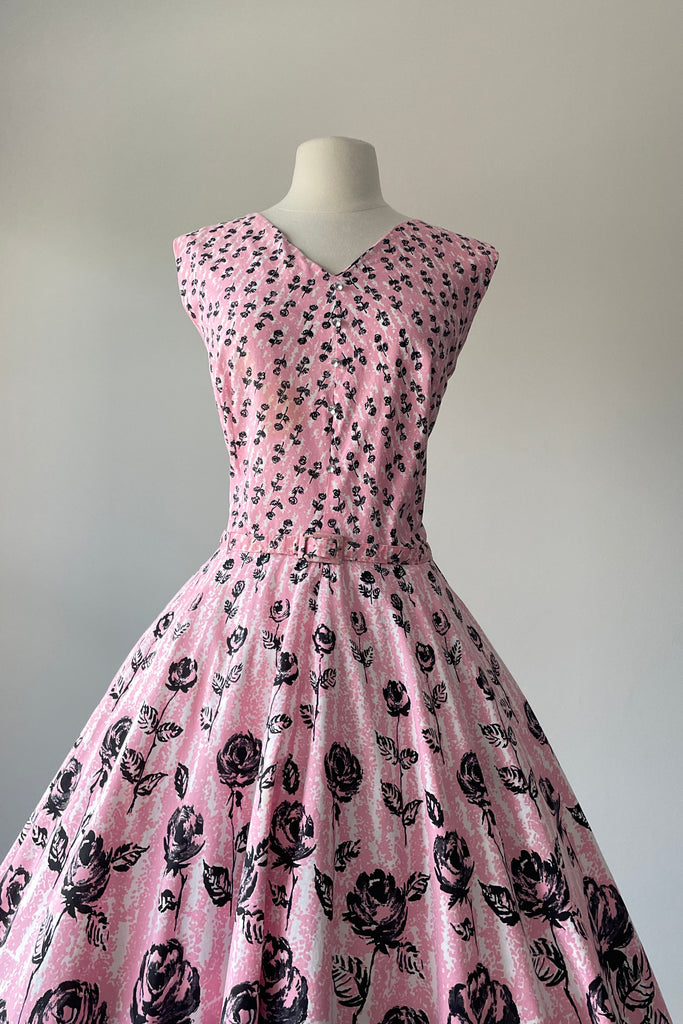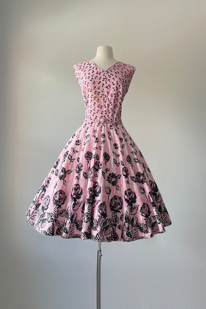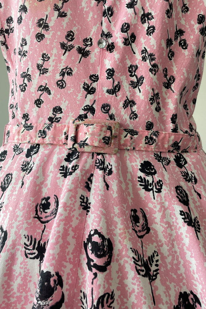 1950s Pink Black Rose Print Belted Dress | XL/XXL