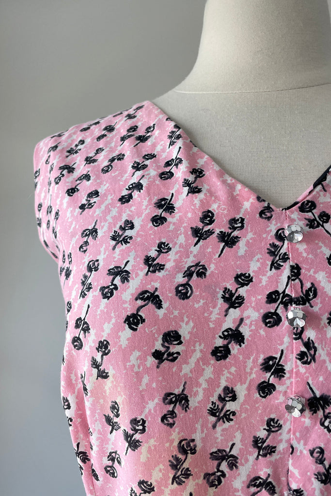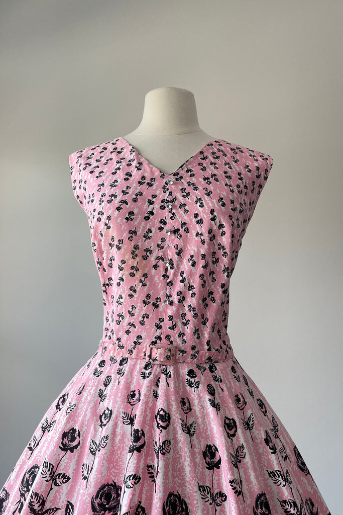 d e t a i l s : beautiful black rose print on white + pink background, rhinestone buttons, original belt, right skirt pocket