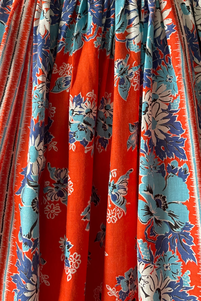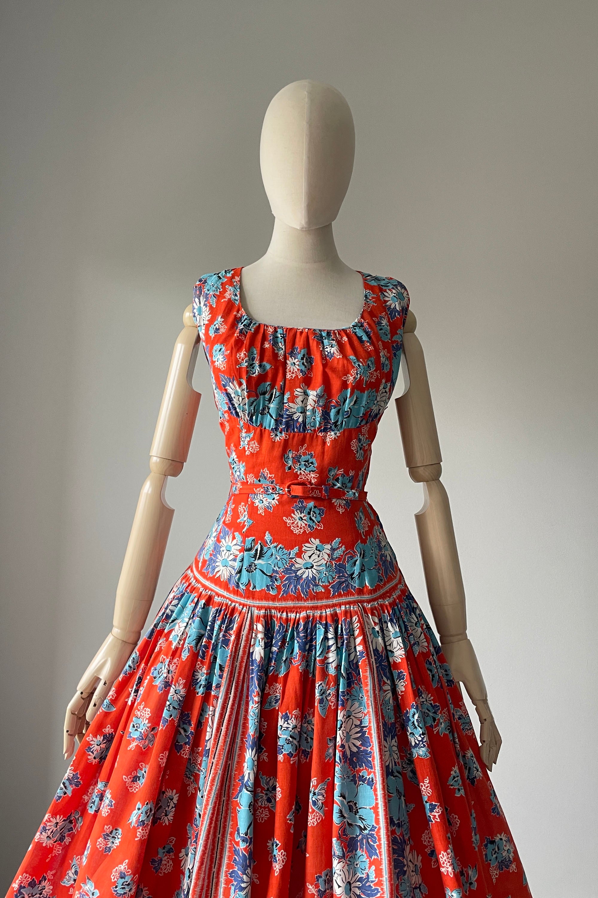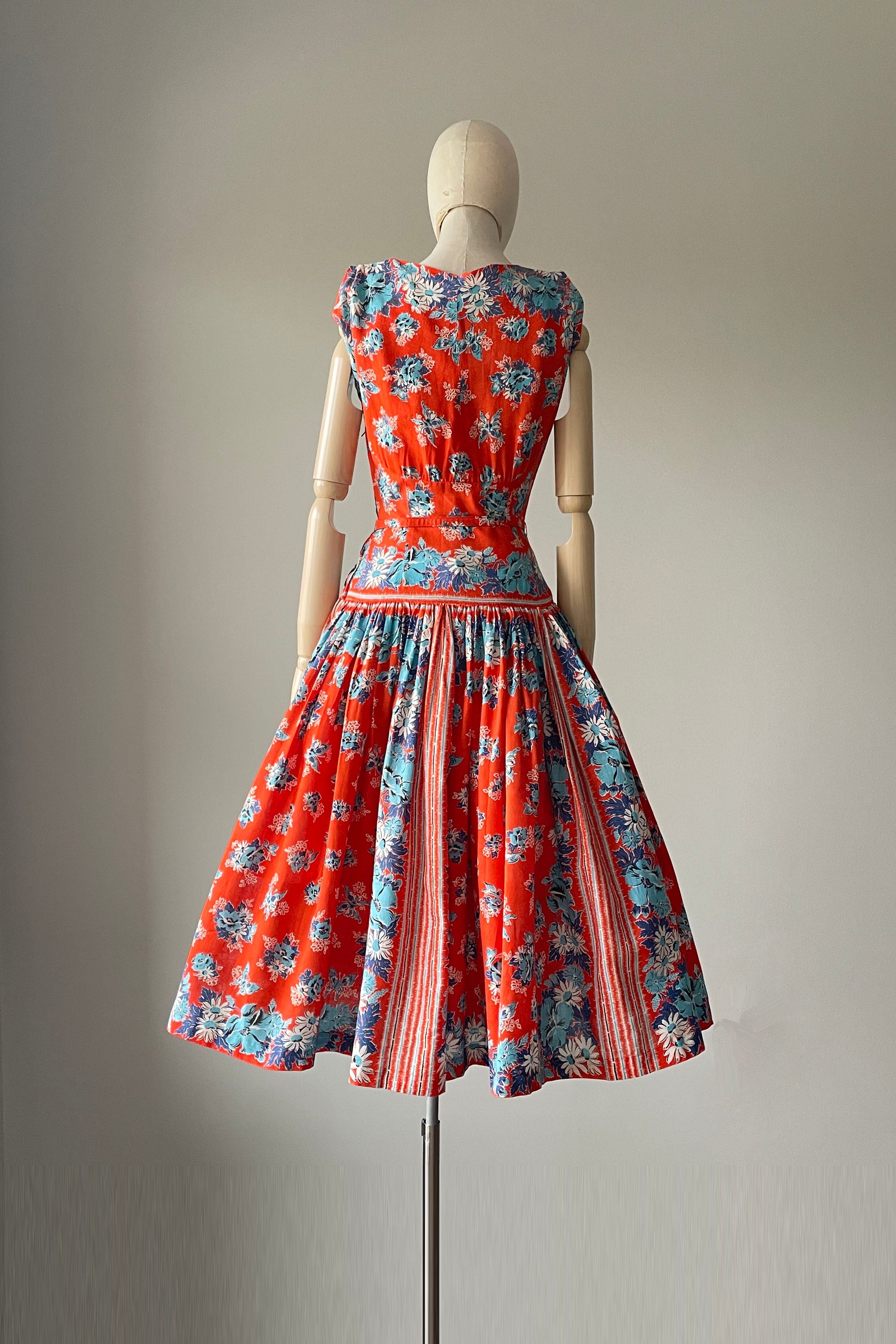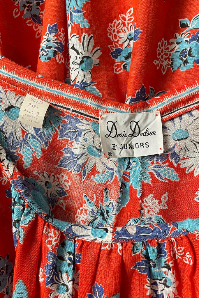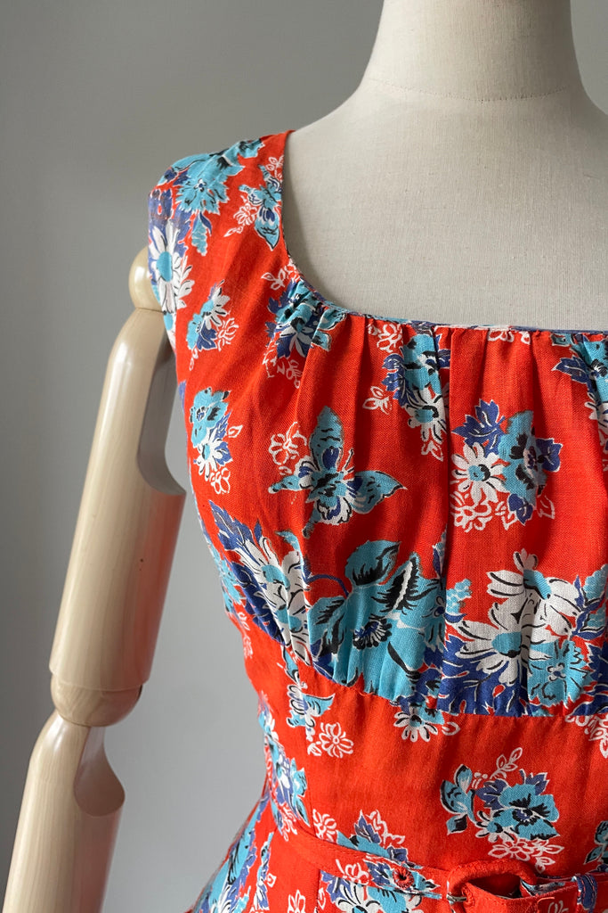 d e t a i l s : beautifully floral print in red + blue, slight drop waist with original belt, crisp and appears to be dead stock never worn