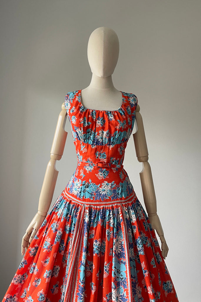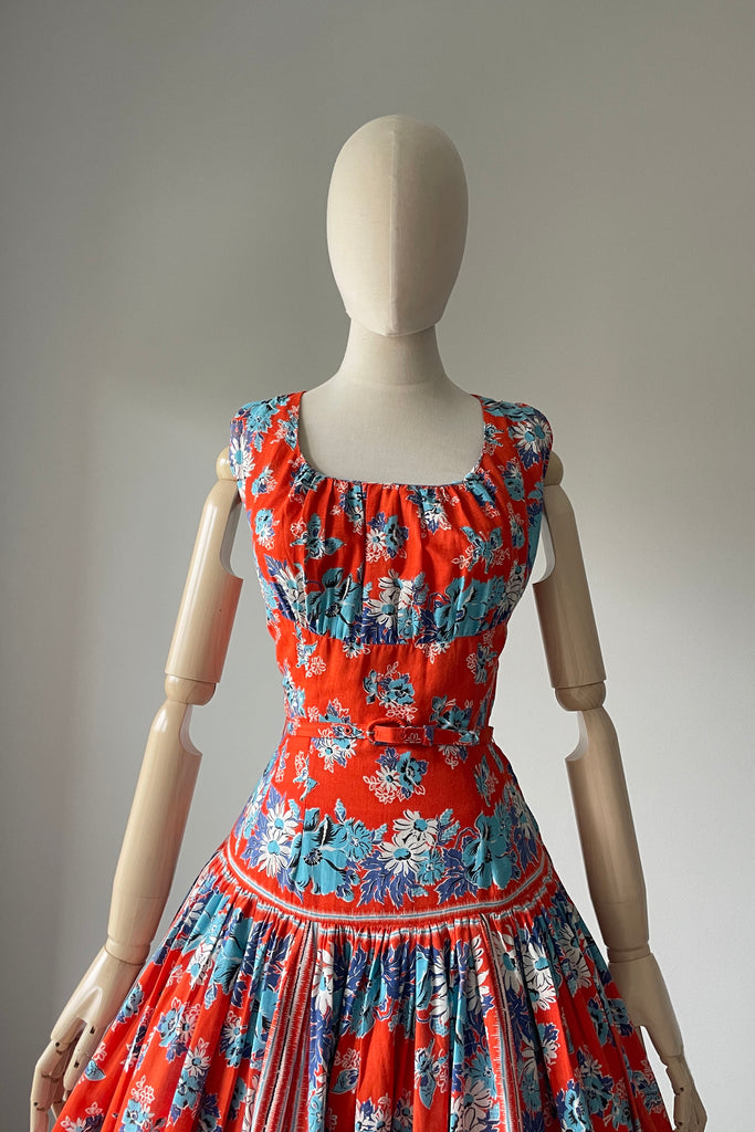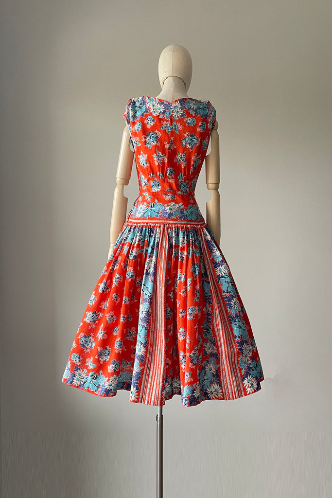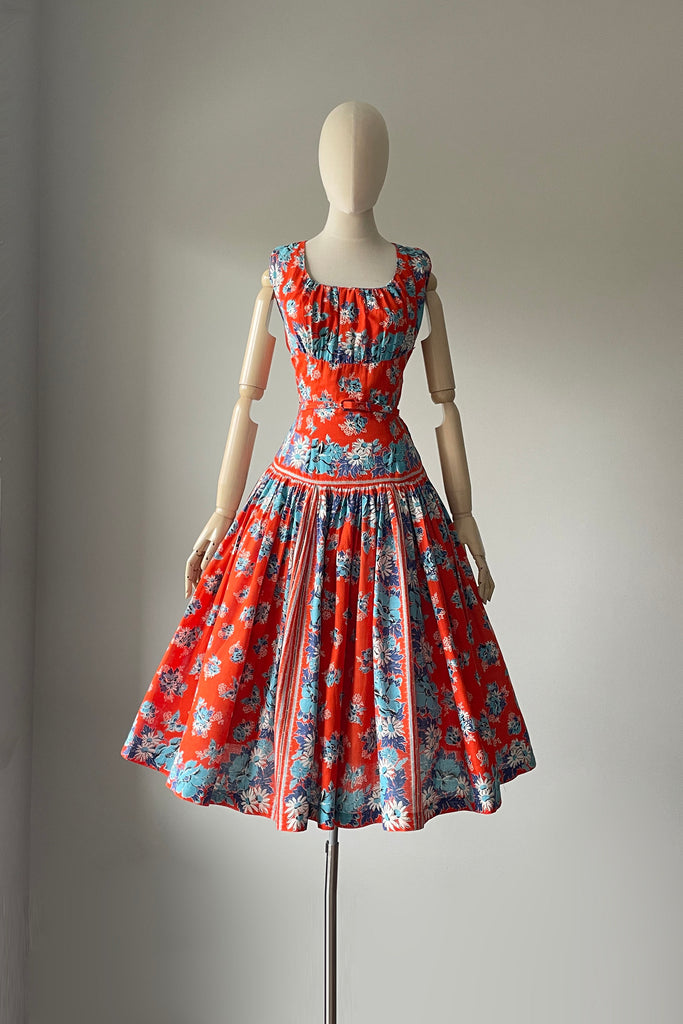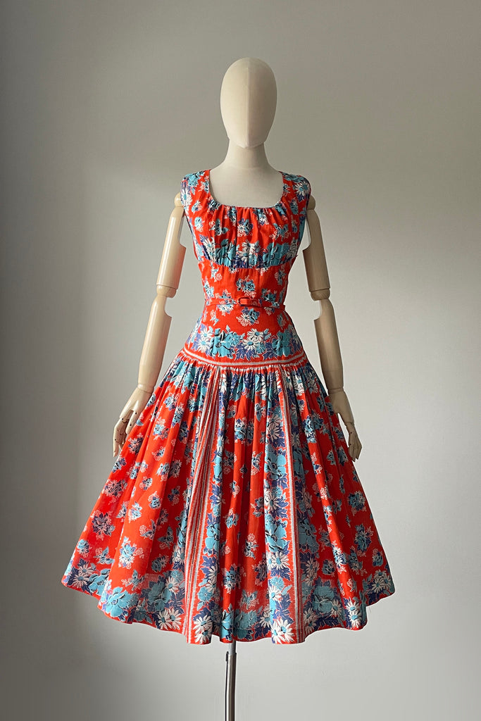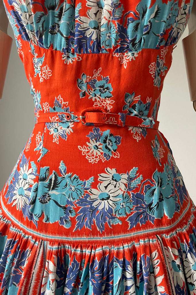 1950s Red Blue Floral Print Dress by Doris Dodson | XS