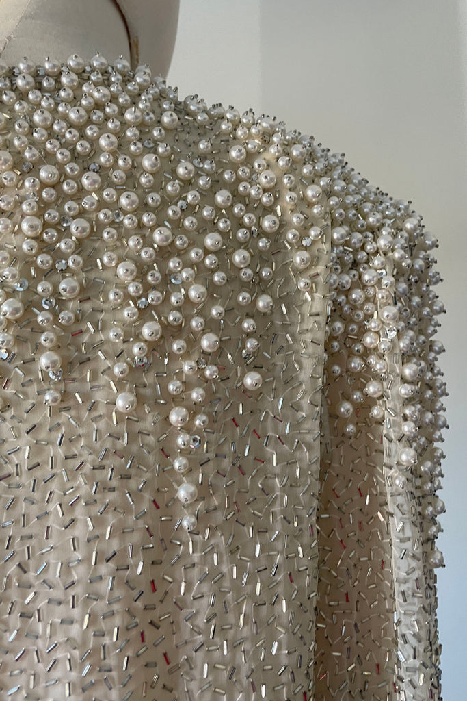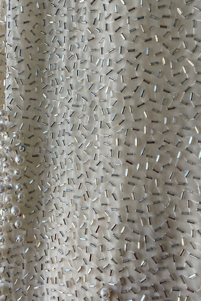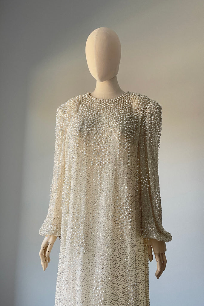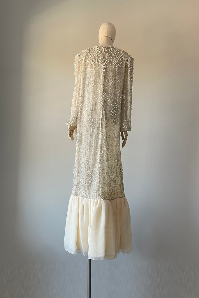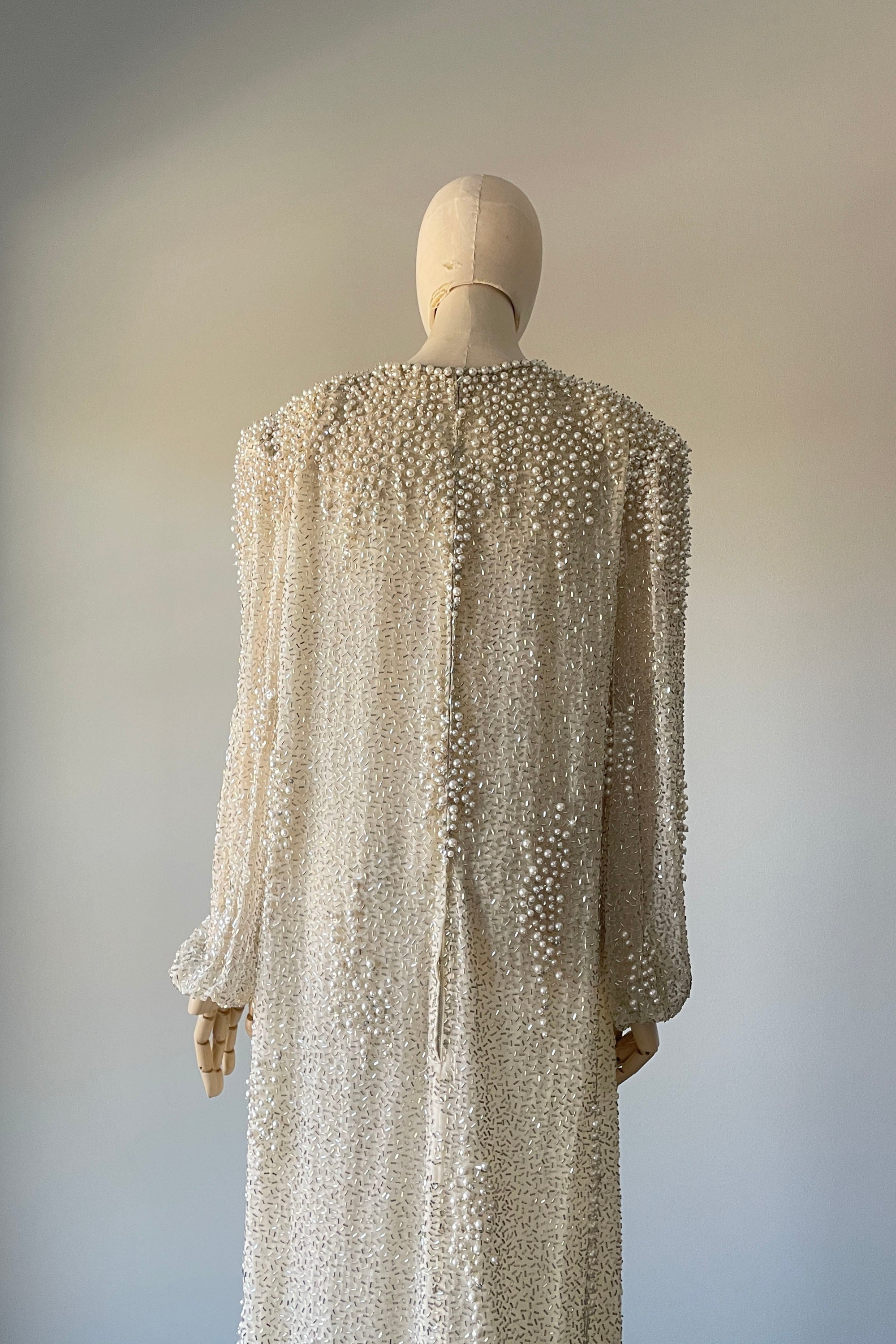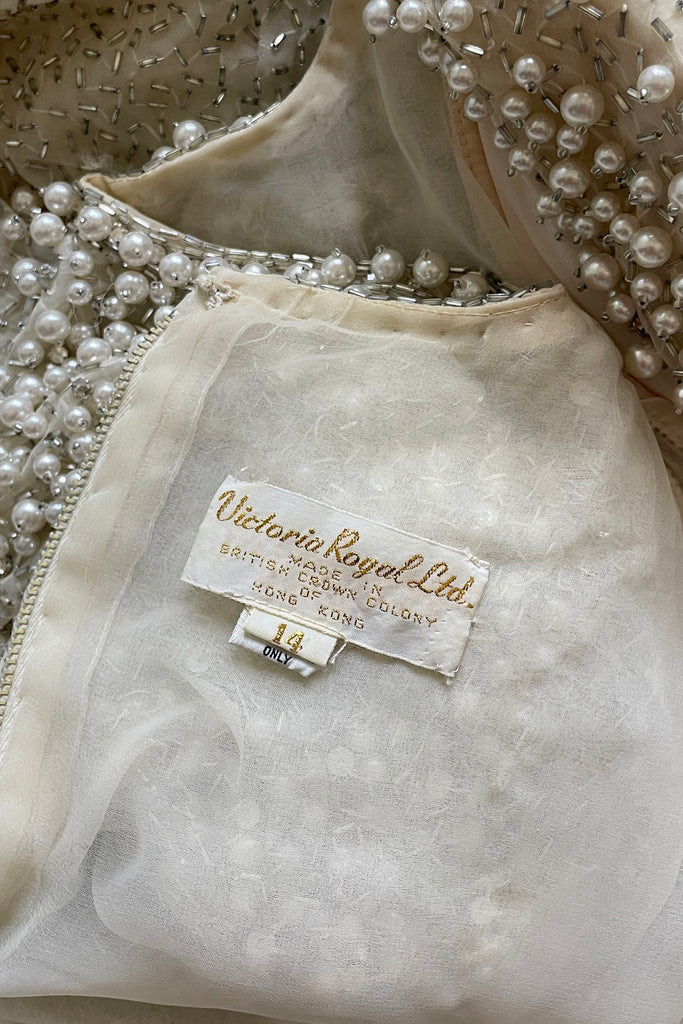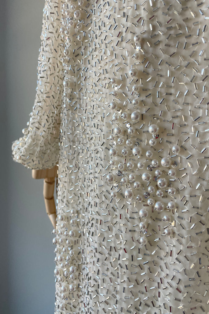 1980s Ivory Beaded Rhinestone Silk Dress by Victoria Royal Ltd | LARGE