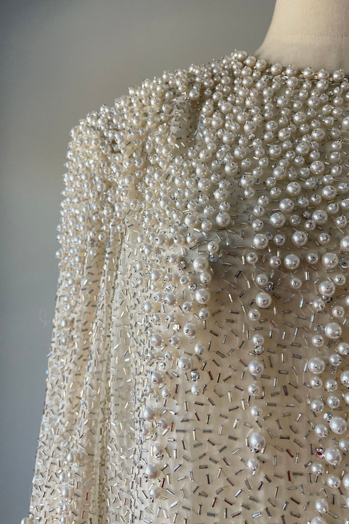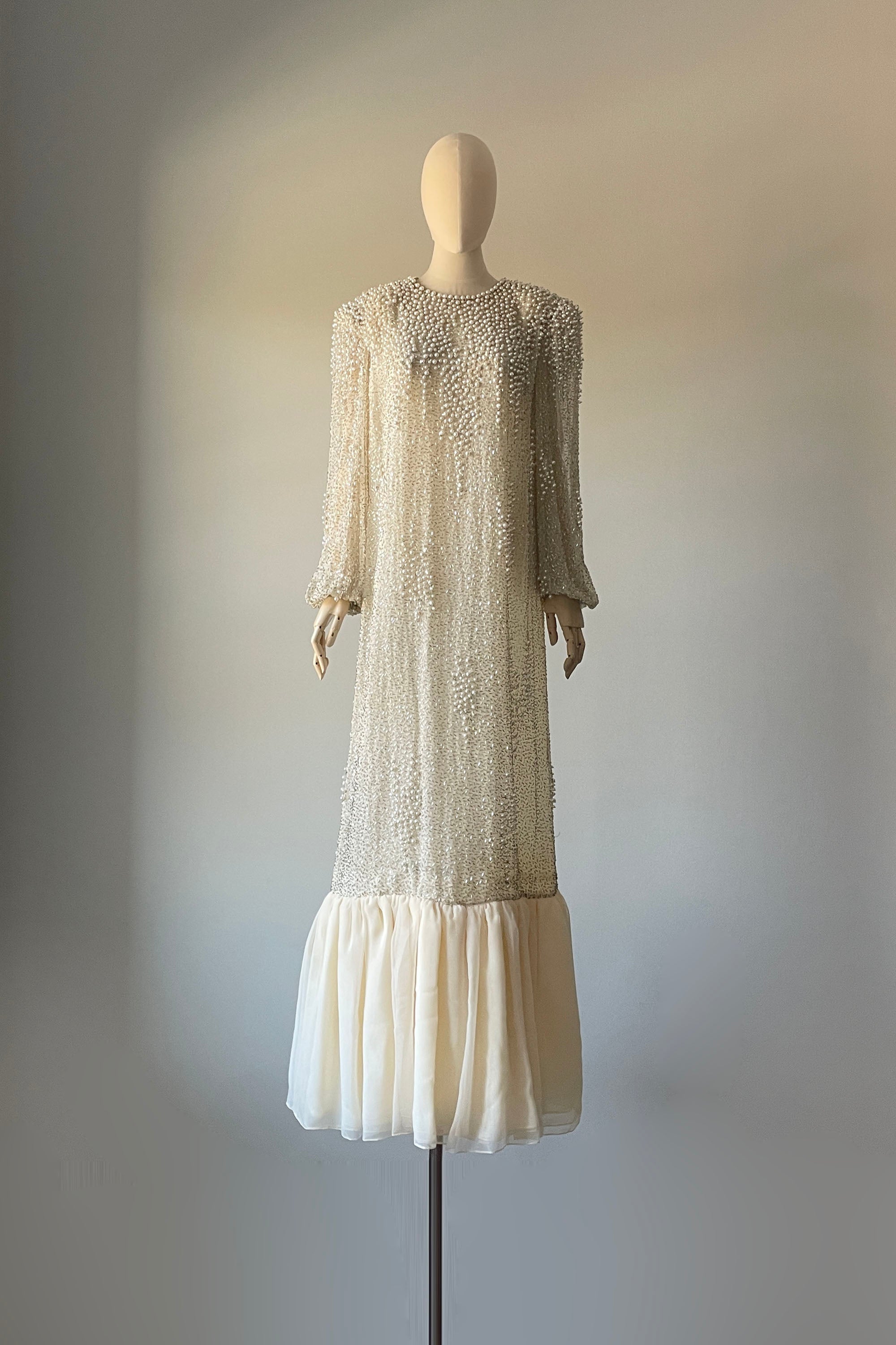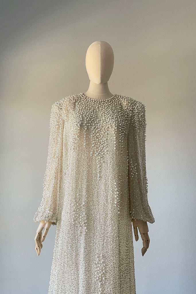 d e t a i l s : Gorgeous vintage 1980s dress by Victoria Royal. Silk crepe fully encrusted with shimmery beads, rhinestones and pearls. Sheer sleeves, strong shoulders and chiffon panel at hem. Dress is exceptionally well made and heavy with adornment.