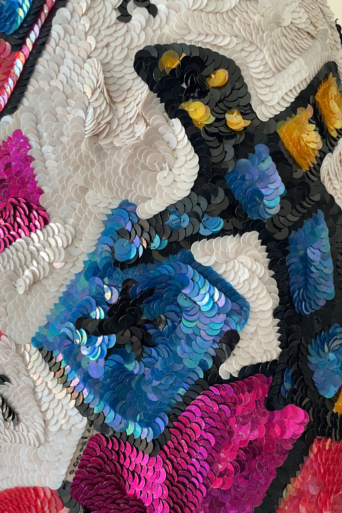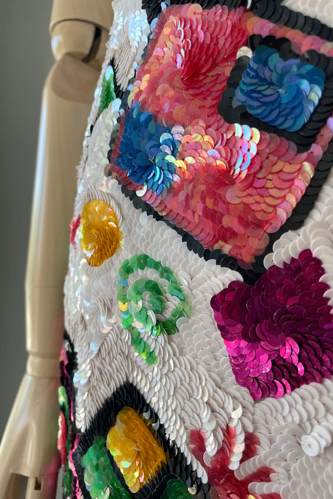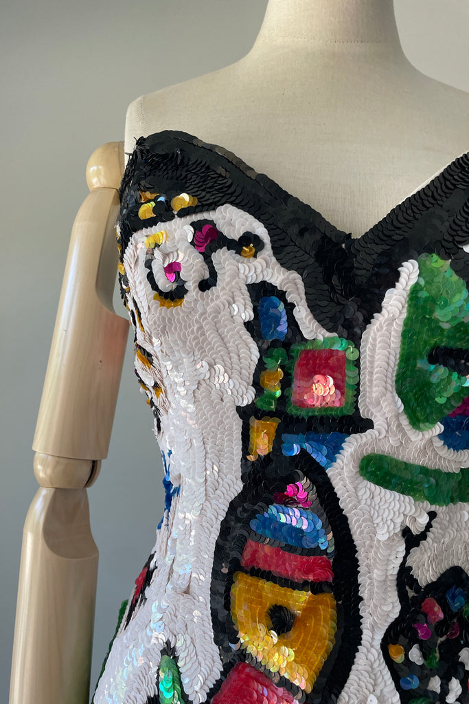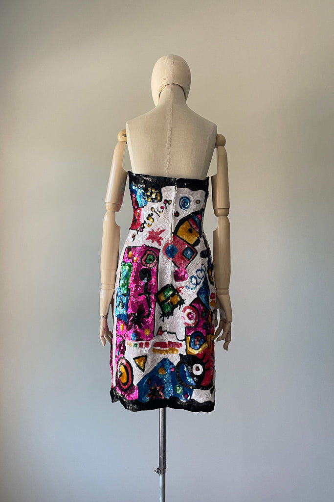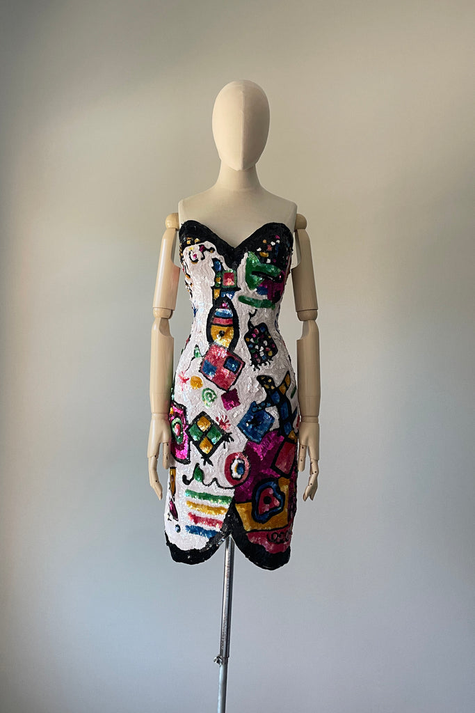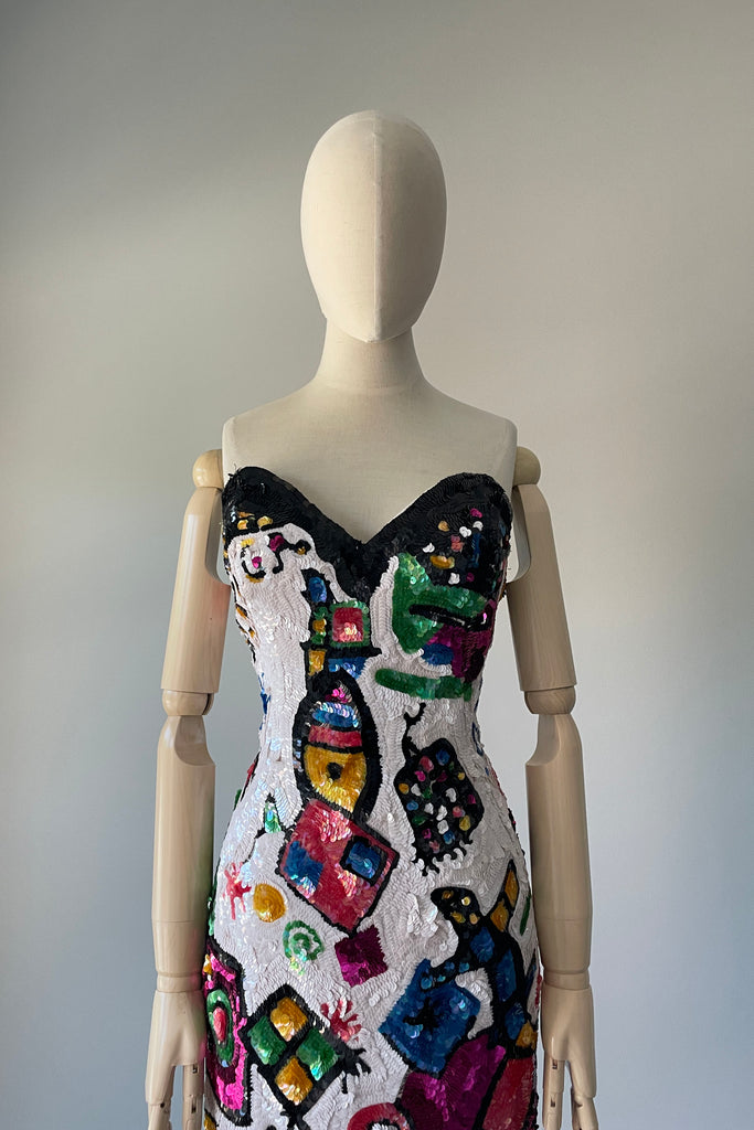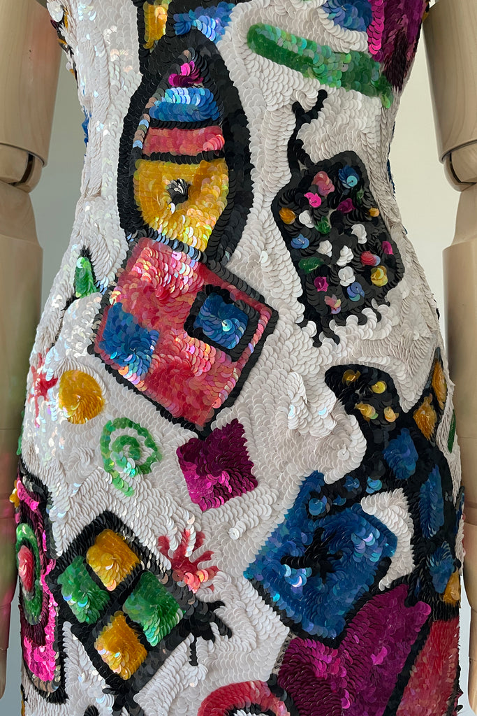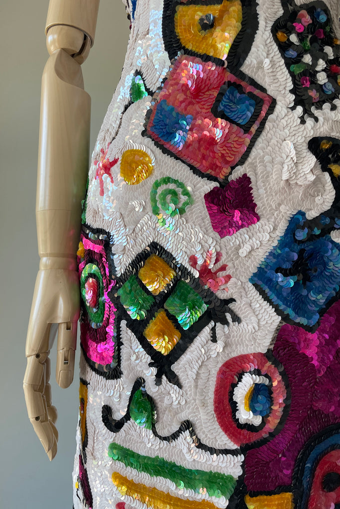 d e t a i l s : gorgeous strapless silk dress fully encrusted in shiny sequins, primary color abstract print on a rare white background, boned at bodice for structure, heavy and fabulous!