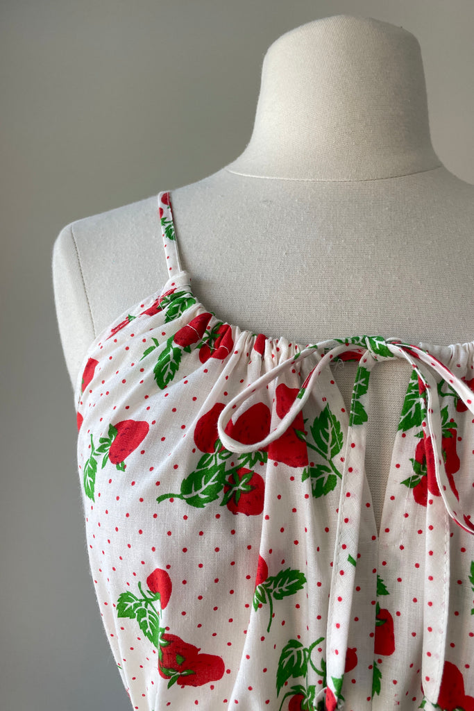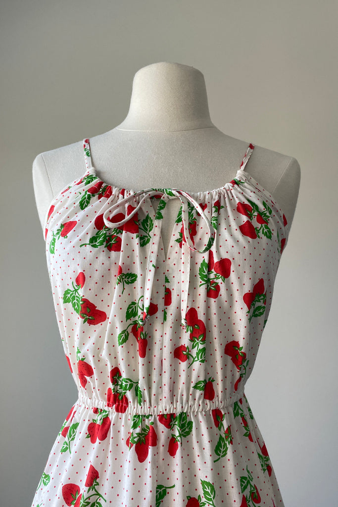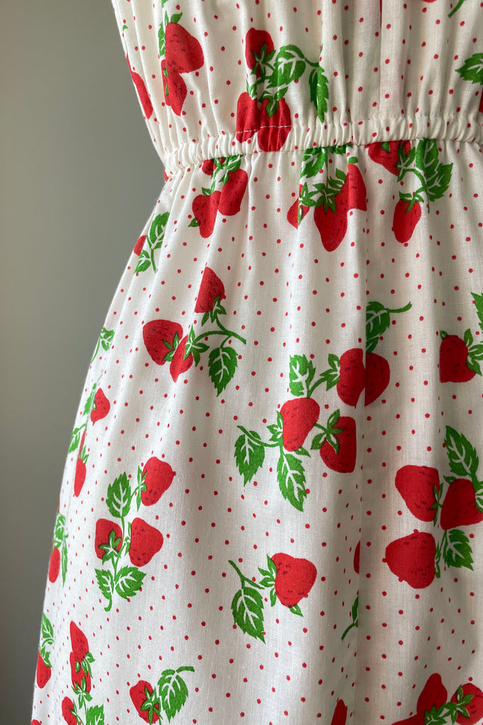 d e t a i l s : darling strawberry print, elastic waist, adjustable drawstring bodice, skirt pockets